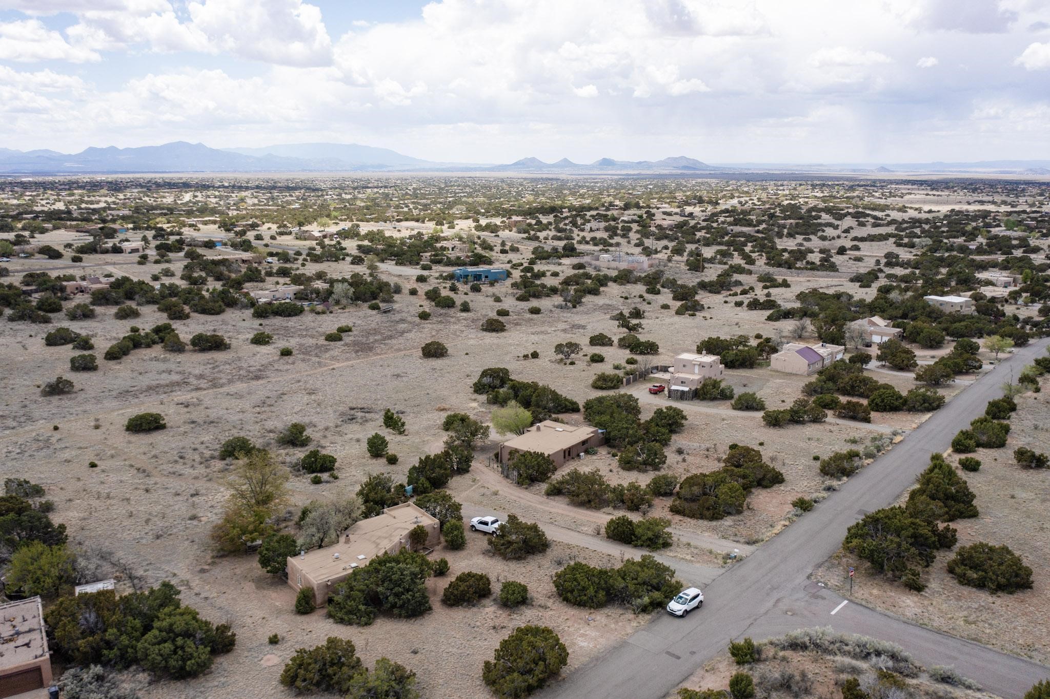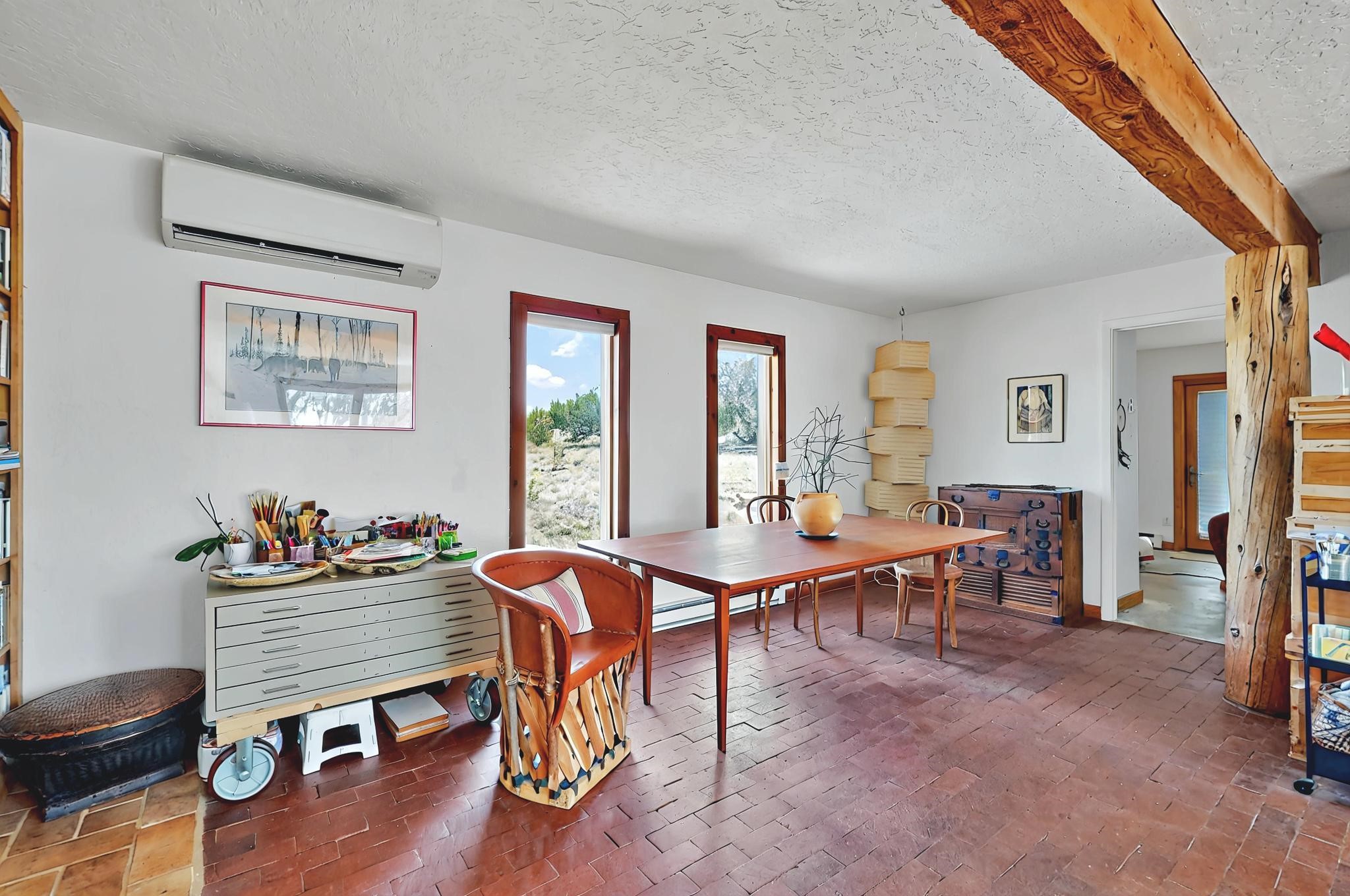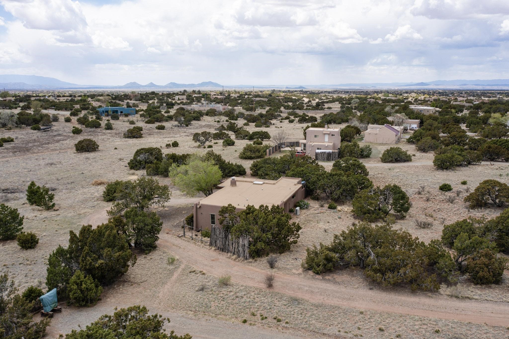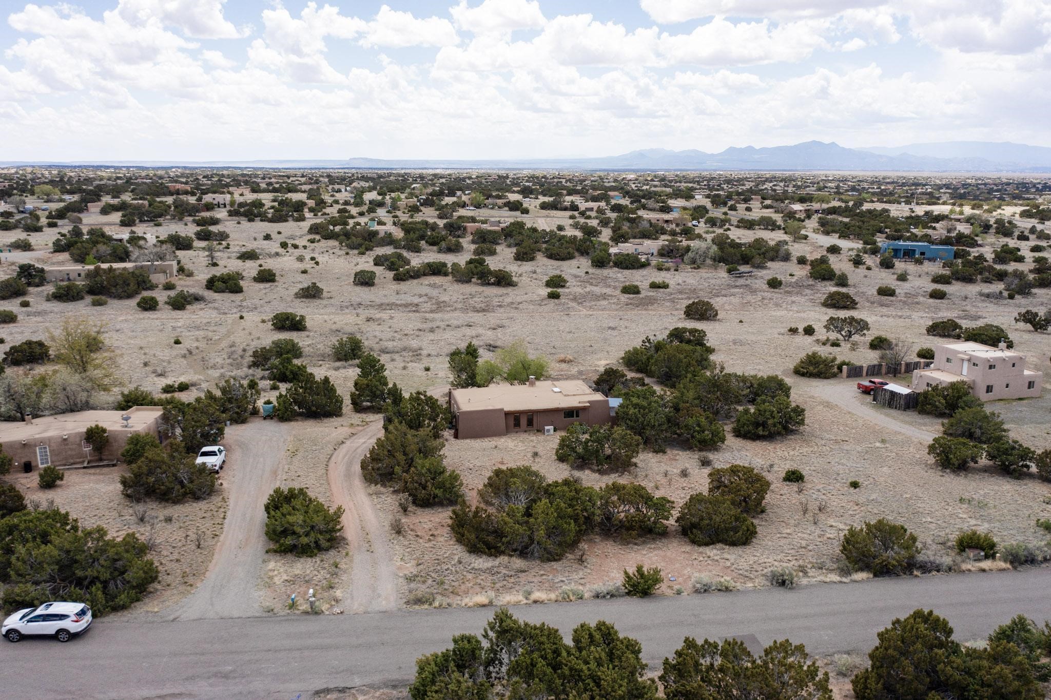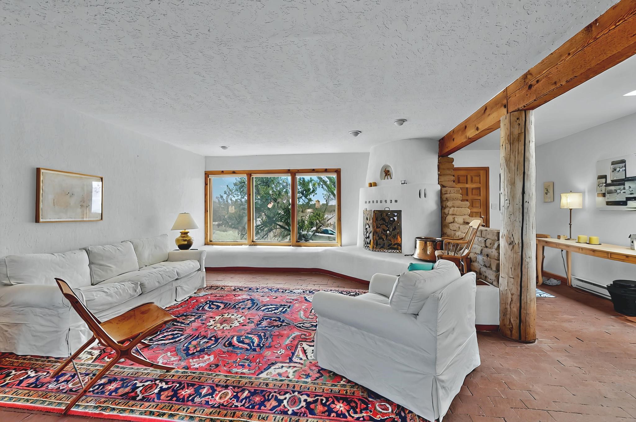 VIEWS VIEWS VIEWS from every room. Mountains, green belt and trees in a very private location. Traditional banco and kiva fireplace in living area, brick floors, and adobe wall at entry. Totally renovated kitchen with granite counters and totally renovated modern bathroom. Two bedrooms either side of updated bathroom have unfinished cement floors due to owner's allergies. Plantings on drip. 2 1/2 year old heat pump with electric baseboard backup; refrigerator 2020; dishwasher 2019; washing machine 2018; newer stucco with remaining 5 year warranty; roof refresh 2024 with 2 year warranty; water heater 2025. No VOC paints.