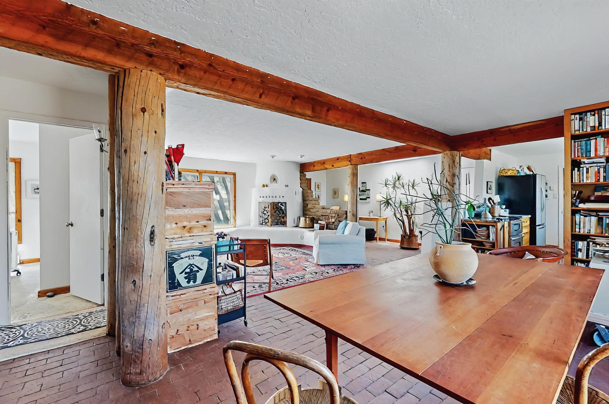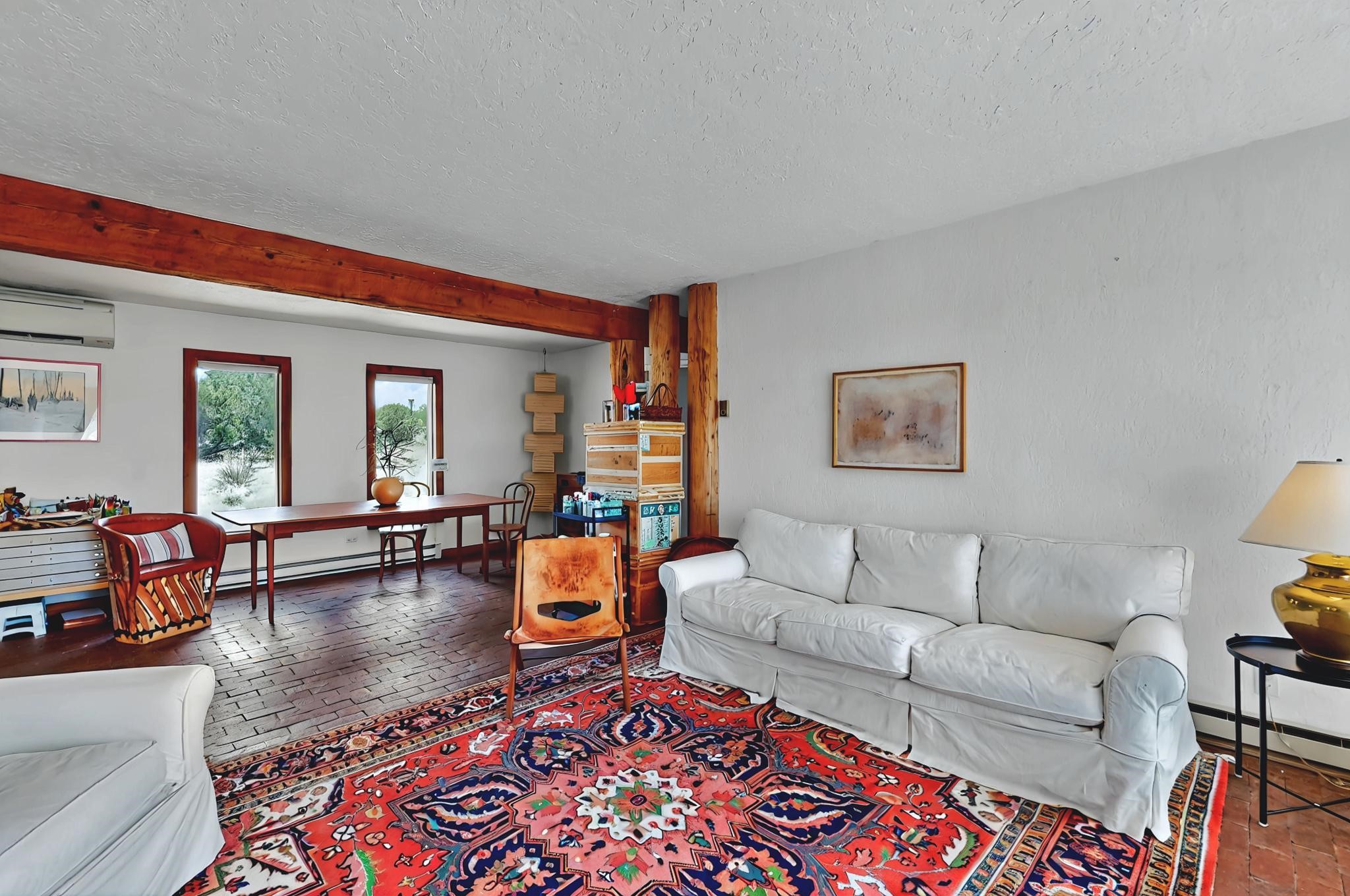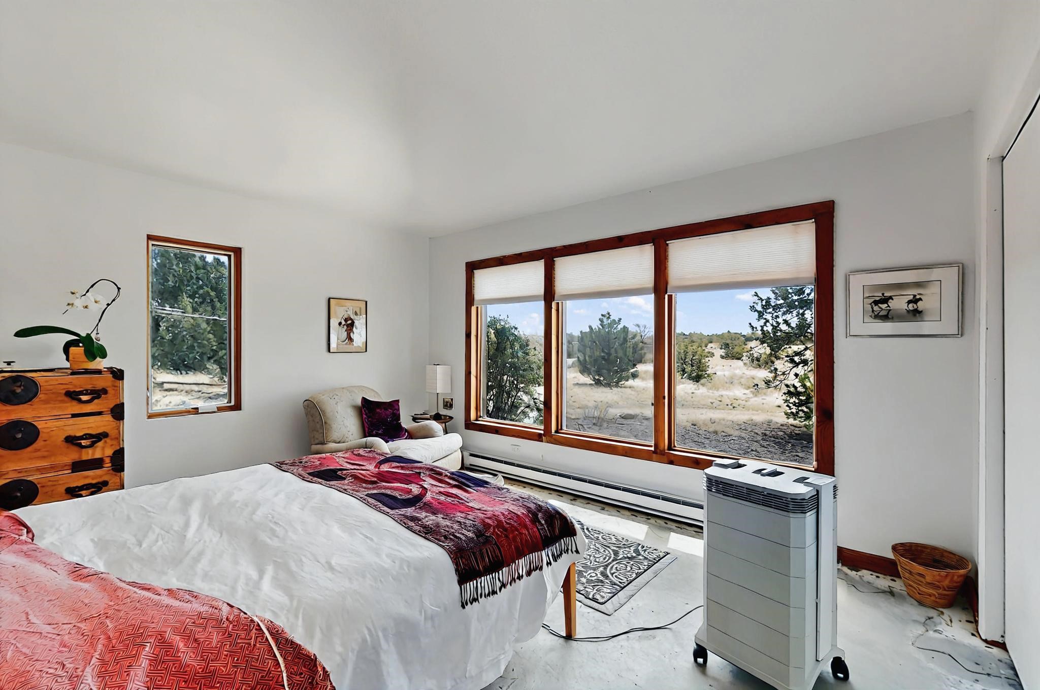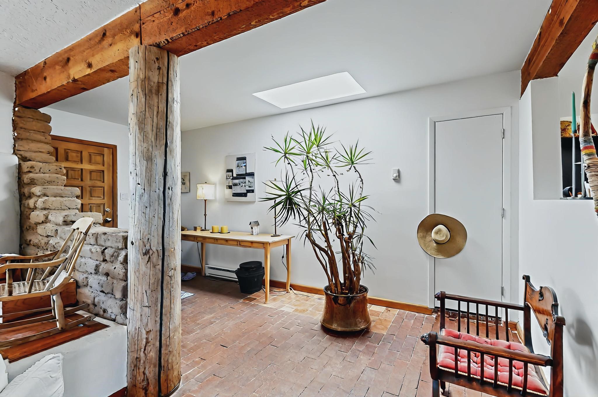 VIEWS VIEWS VIEWS from every room. Mountains, green belt and trees in a very private location. Traditional banco and kiva fireplace in living area, brick floors, and adobe wall at entry. Totally renovated kitchen with granite counters and totally renovated modern bathroom. Two bedrooms either side of updated bathroom have unfinished cement floors due to owner's allergies. Plantings on drip. 2 1/2 year old heat pump with electric baseboard backup; refrigerator 2020; dishwasher 2019; washing machine 2018; newer stucco with remaining 5 year warranty; roof refresh 2024 with 2 year warranty; water heater 2025. No VOC paints.