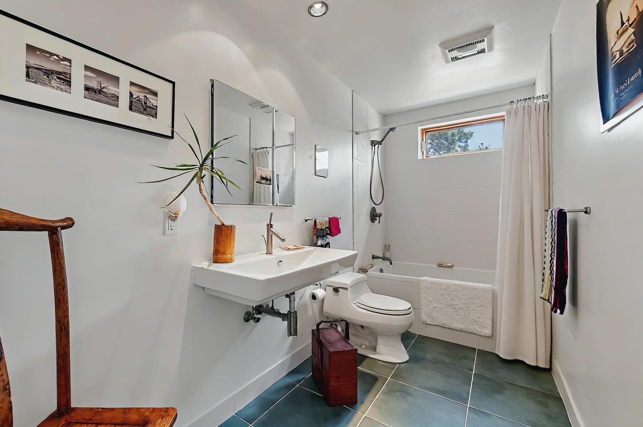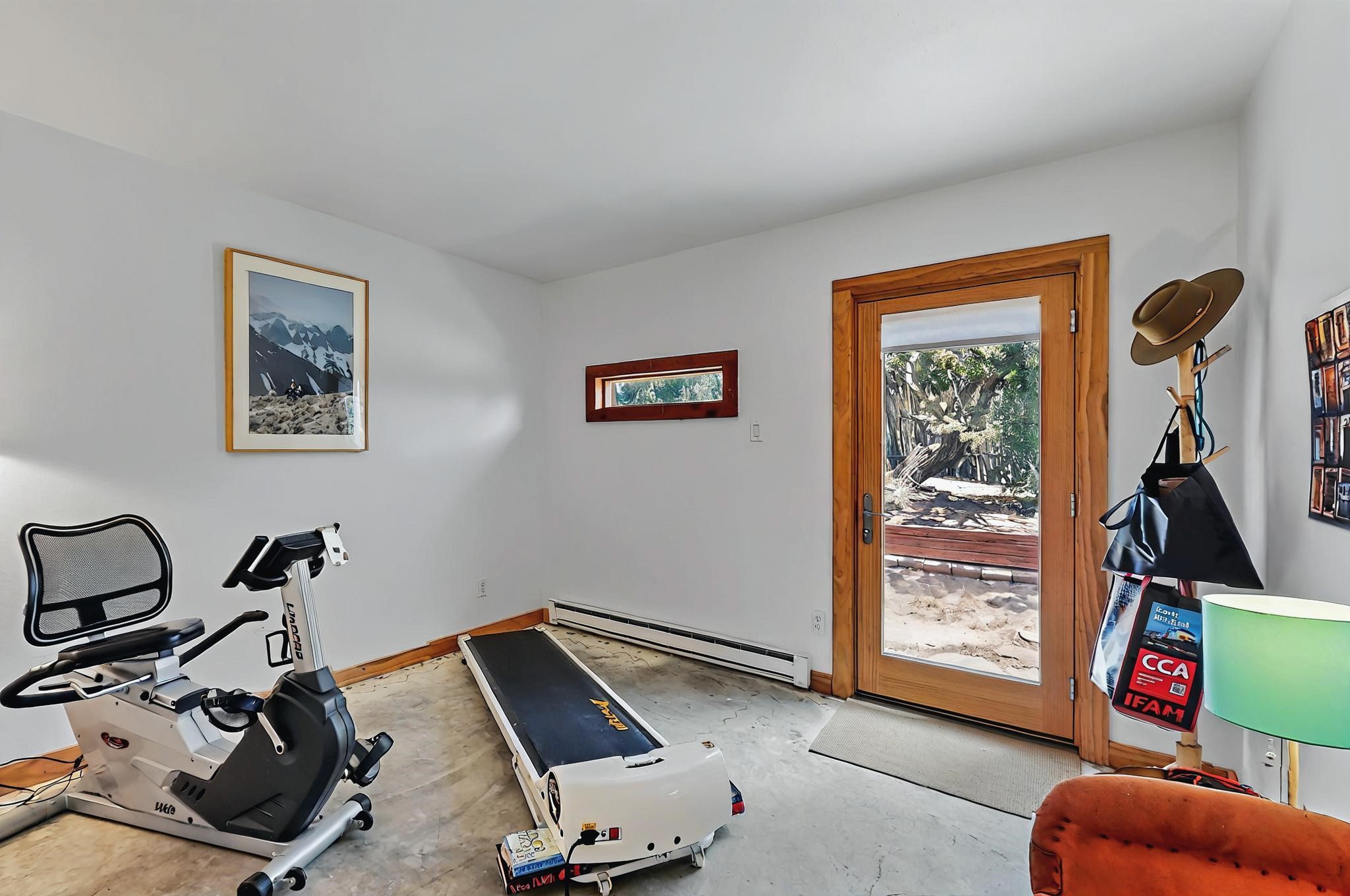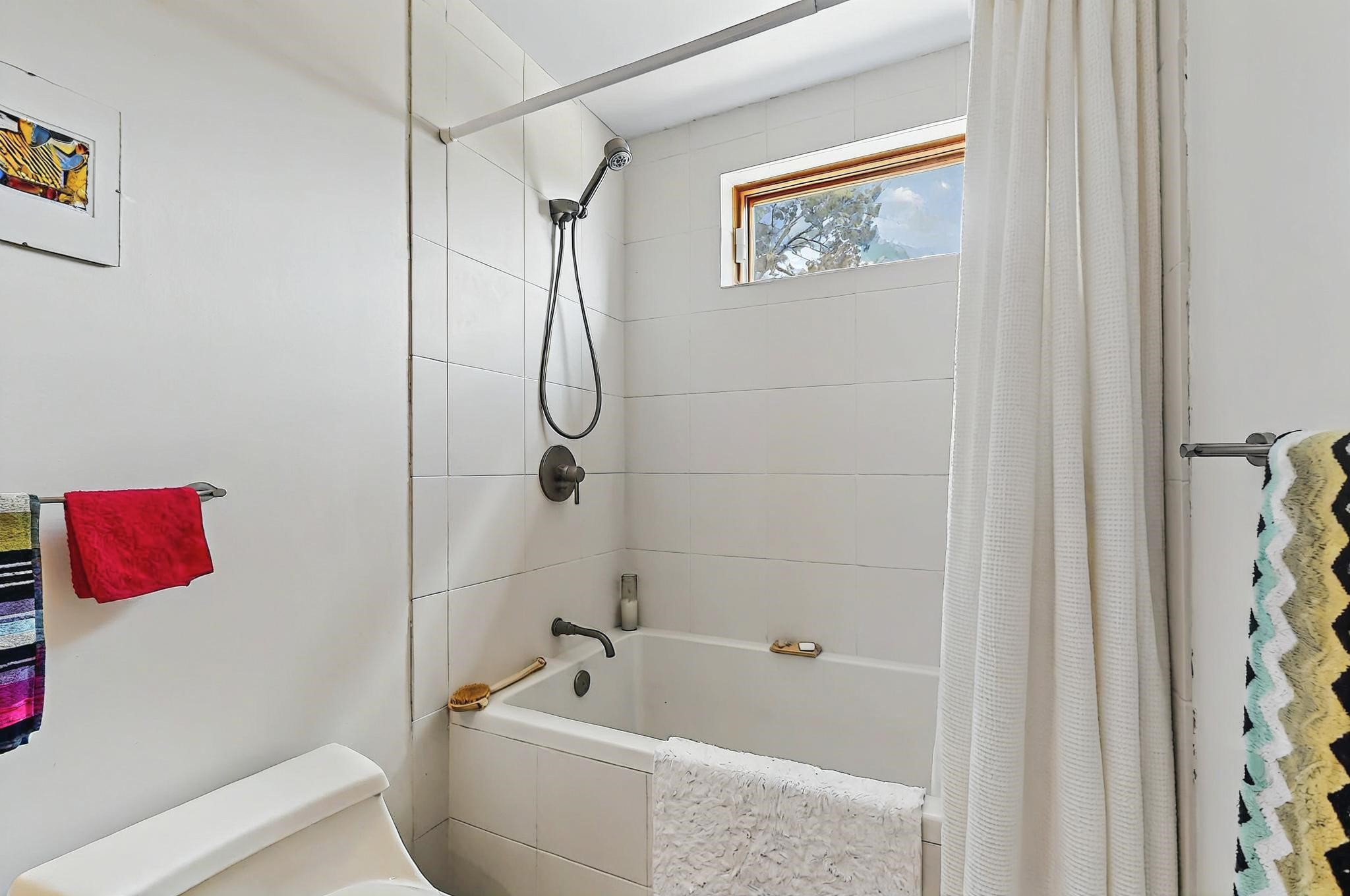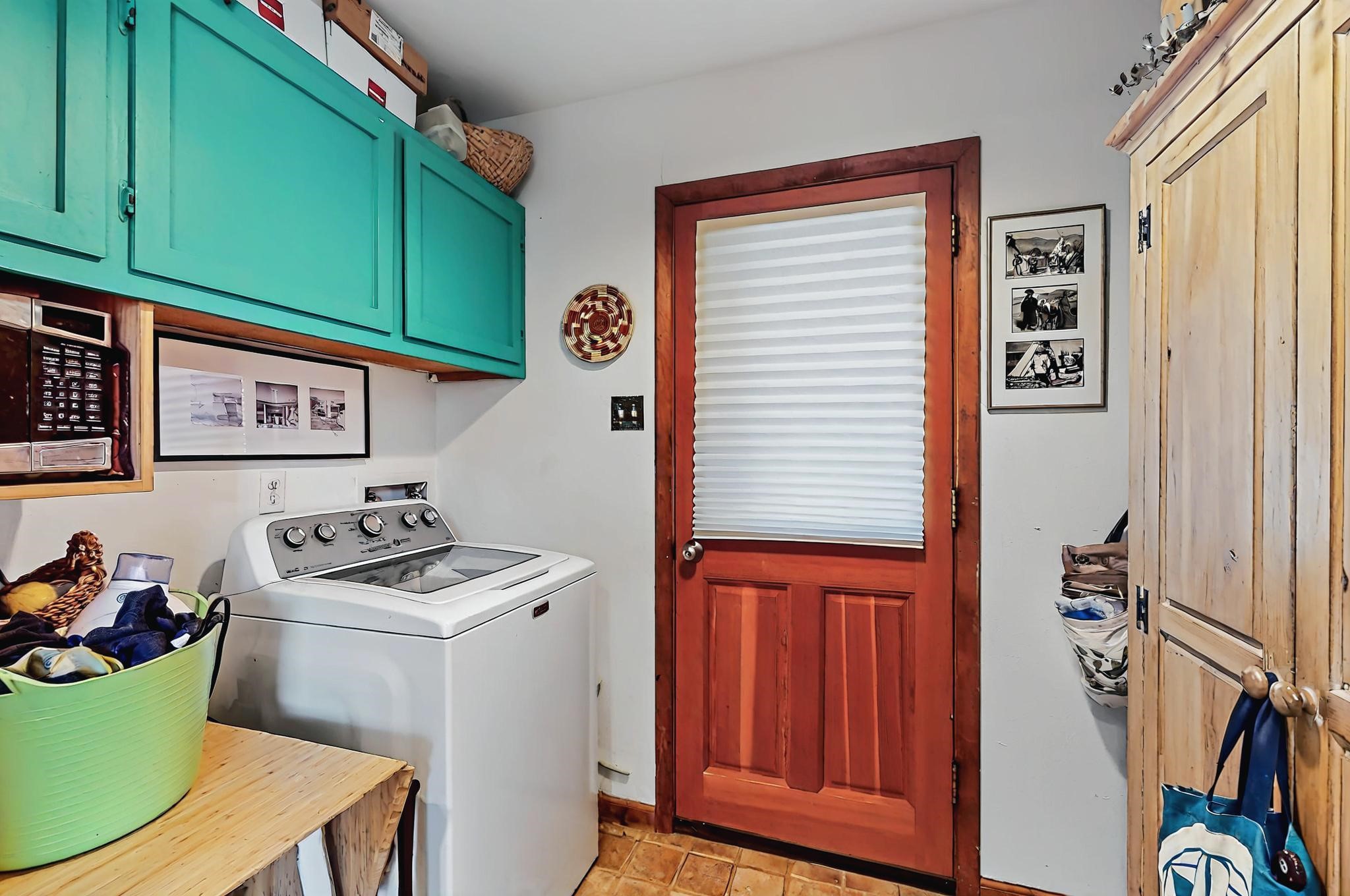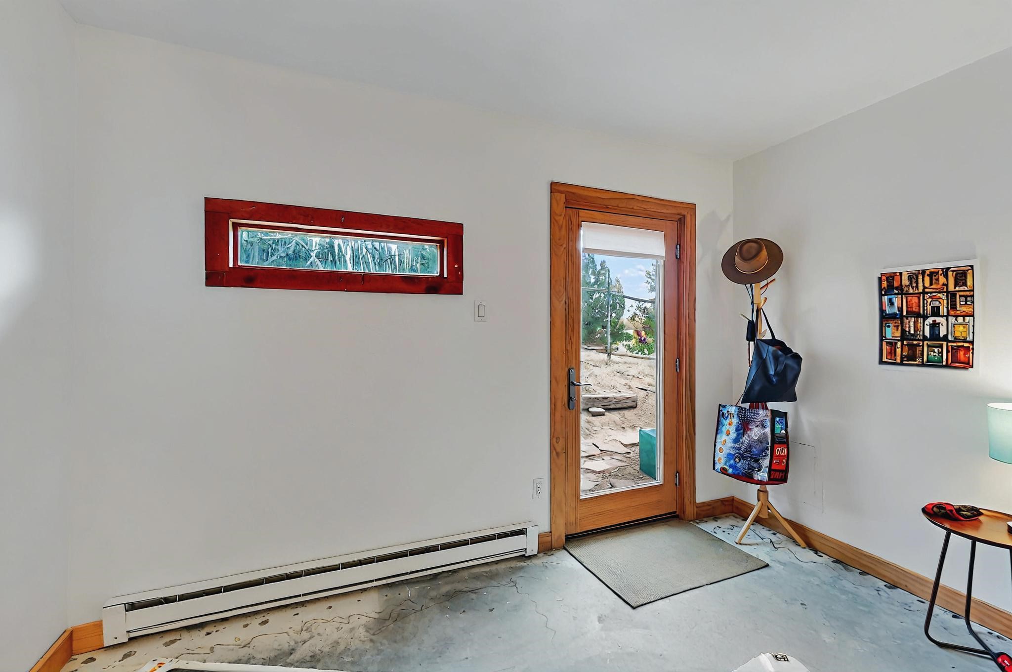 VIEWS VIEWS VIEWS from every room. Mountains, green belt and trees in a very private location. Traditional banco and kiva fireplace in living area, brick floors, and adobe wall at entry. Totally renovated kitchen with granite counters and totally renovated modern bathroom. Two bedrooms either side of updated bathroom have unfinished cement floors due to owner's allergies. Plantings on drip. 2 1/2 year old heat pump with electric baseboard backup; refrigerator 2020; dishwasher 2019; washing machine 2018; newer stucco with remaining 5 year warranty; roof refresh 2024 with 2 year warranty; water heater 2025. No VOC paints.