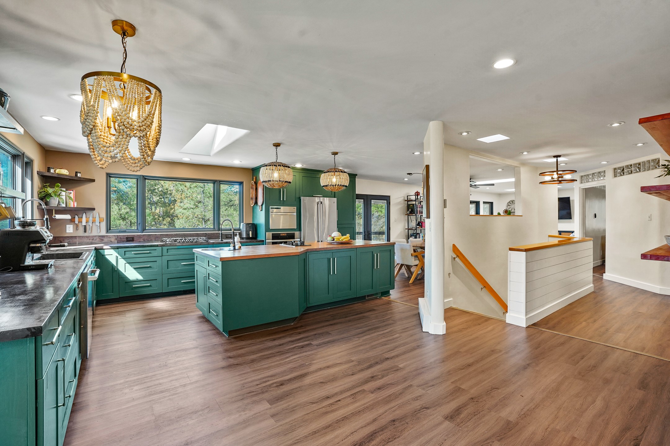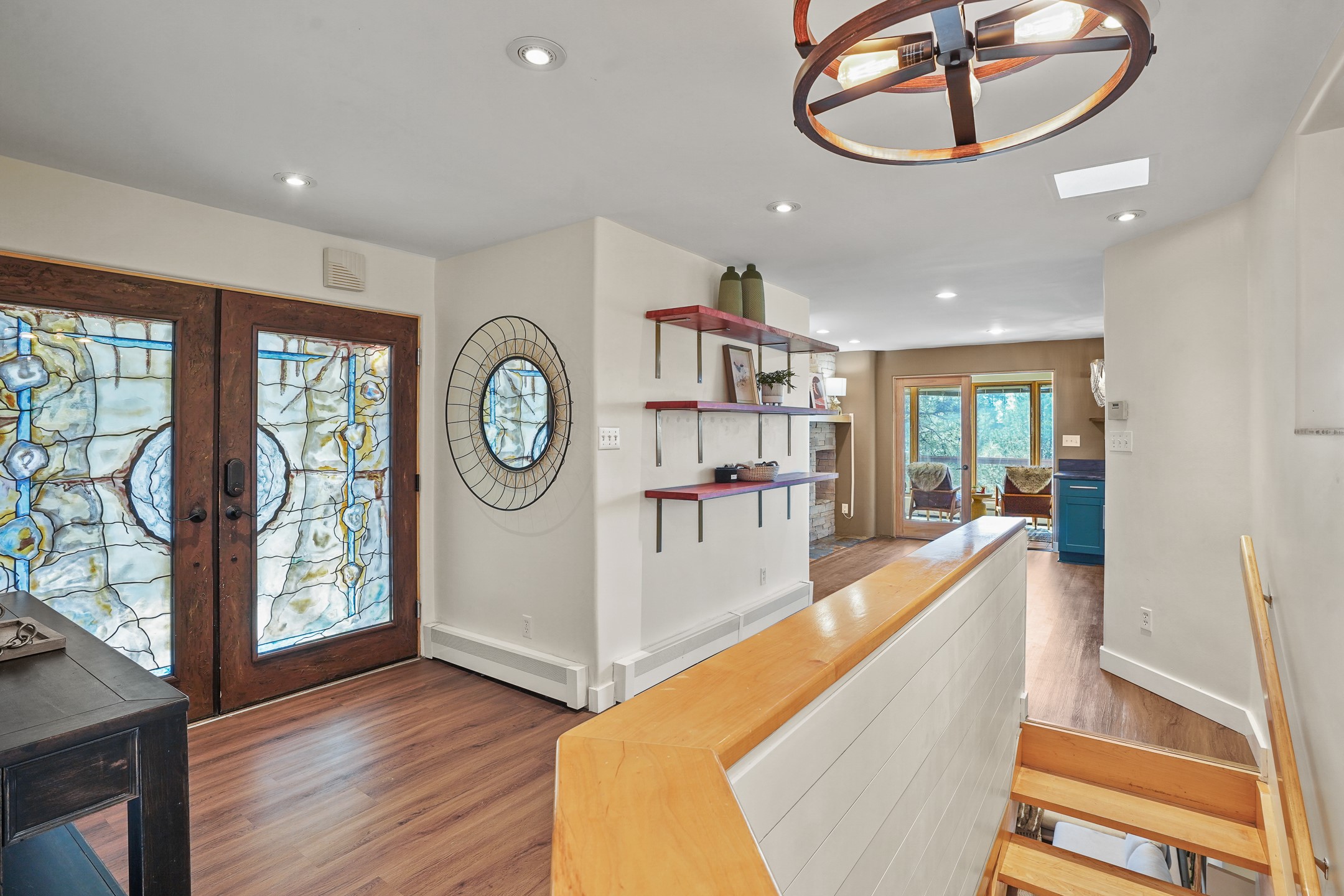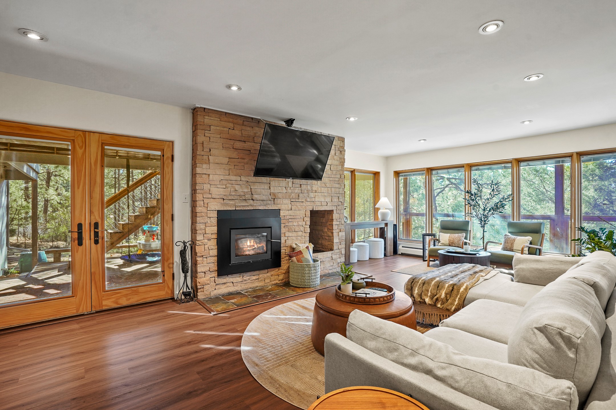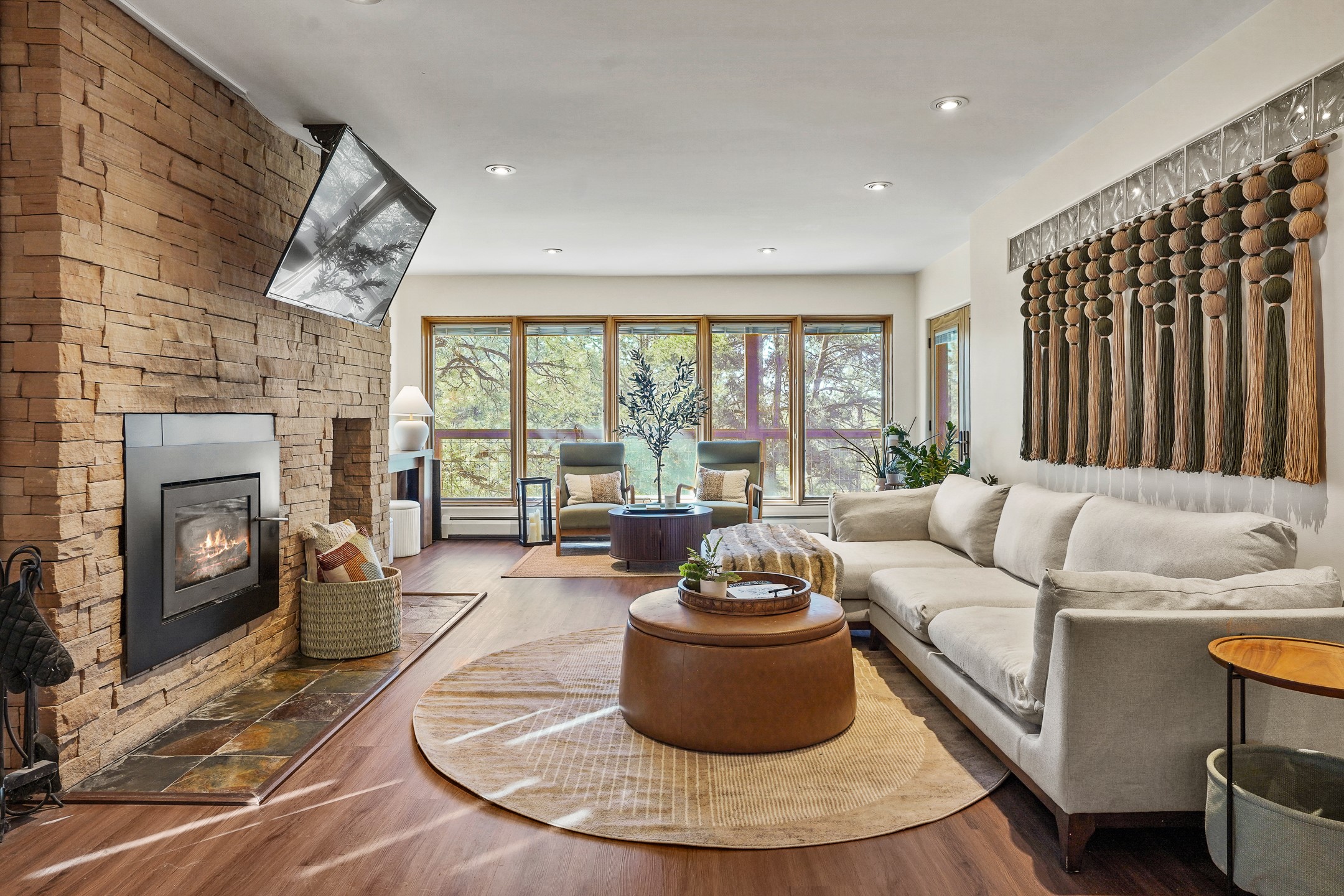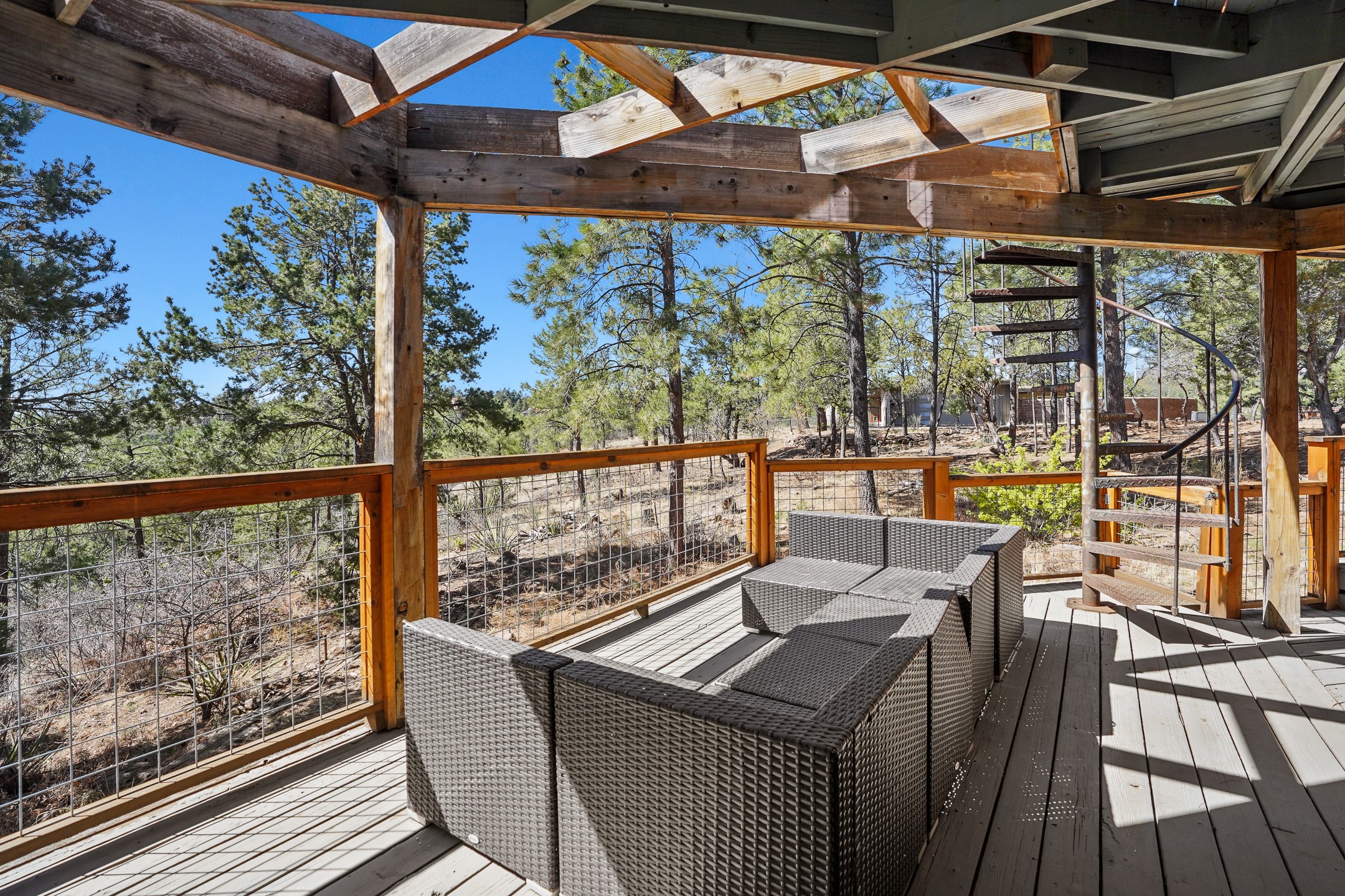 Finally, a luxe and updated home in Los Alamos...Is this the best property to hit the market in a long time?? We sure think so!! Properties of this location, size and quality are extremely rare in Los Alamos. Modern Southwest style blends seamlessly with classic 50's design in this turnkey home! In a premium location on Barranca Mesa, you'll feel as though you're in a world of your own, while only being a short drive to LANL. Easily throw off the work day as you walk in through the gated courtyard and are greeted by the bubbling fountain and the colorful hand-hewn front doors. This 4-bedroom, 3-bathroom home is thoughtfully laid out over two levels, with gathering spaces and an open floorplan on the main level, bathed in beautiful natural light and surrounded by views of the canyon. A chef's kitchen with an oversized island, prep sink, and newer high-end appliances will have you entertaining family and friends with your culinary delights. There are so many spaces for quiet conversation in the sunroom, or little moments to be had in the flex spaces throughout the home. Downstairs, you will find the bedroom suites and a den with a cozy fireplace for curling up with a good book or your favorite Netflix series. With plenty of additional rooms, you can easily create an office, a dream closet, or a kids' playroom! Outside you'll find space to relax or grill out on the sundeck, room for gardening, and the scent of many pine trees that surround you and keep you cool in summer. Additional bonuses are an attached studio space downstairs that is currently employed as a gym/man cave, and a 2-car garage for all of your storage and vehicle needs. This home is the complete package! Move-in ready just for you, don't miss this once-in-a-lifetime opportunity!