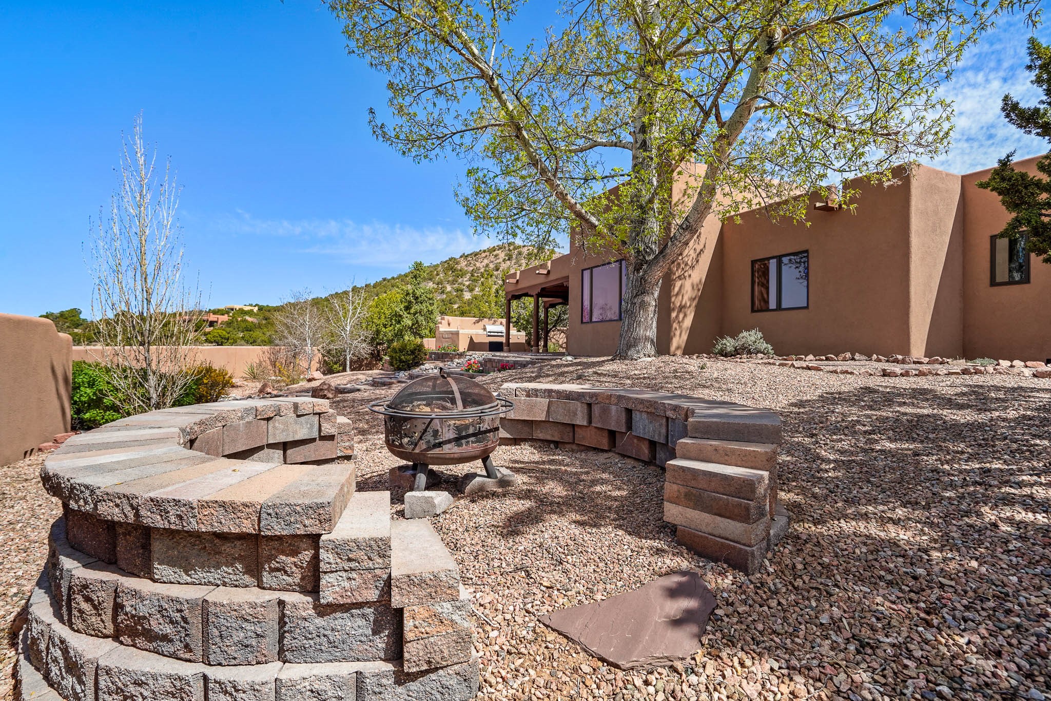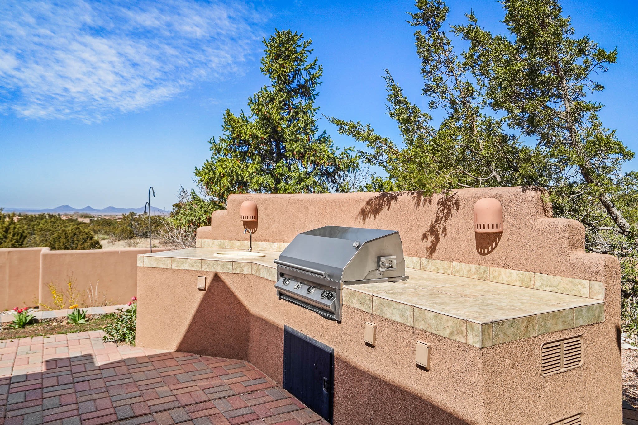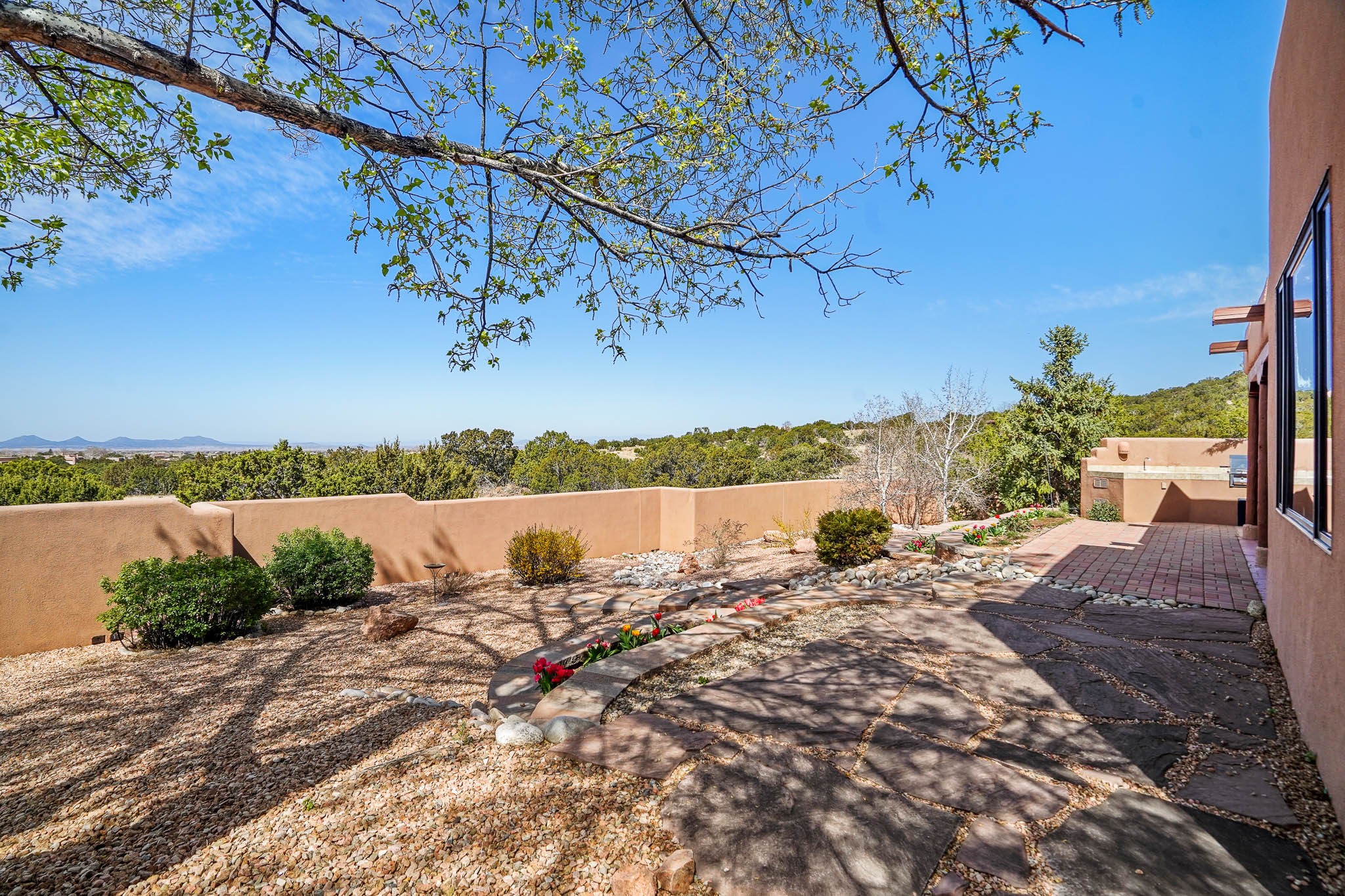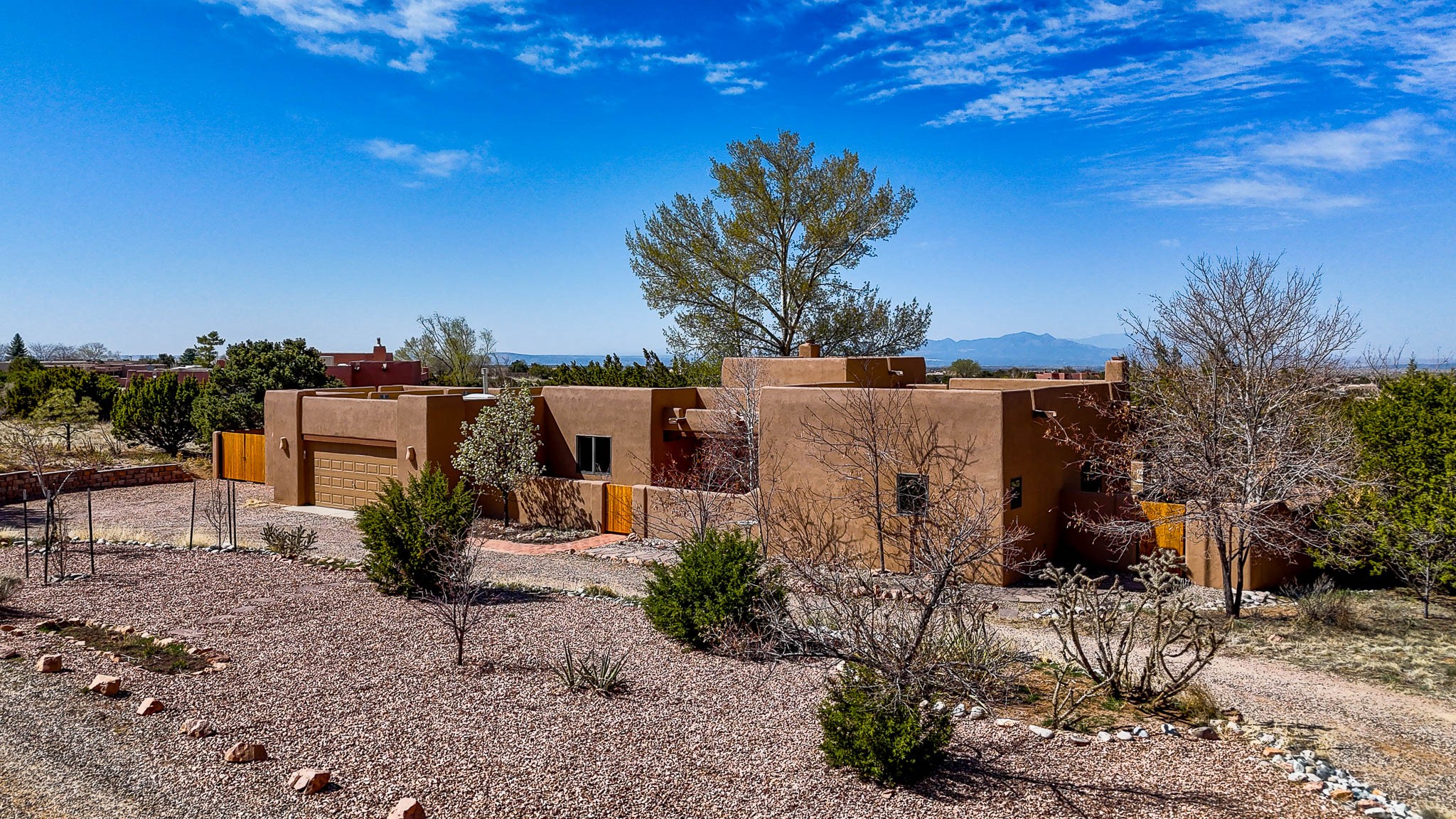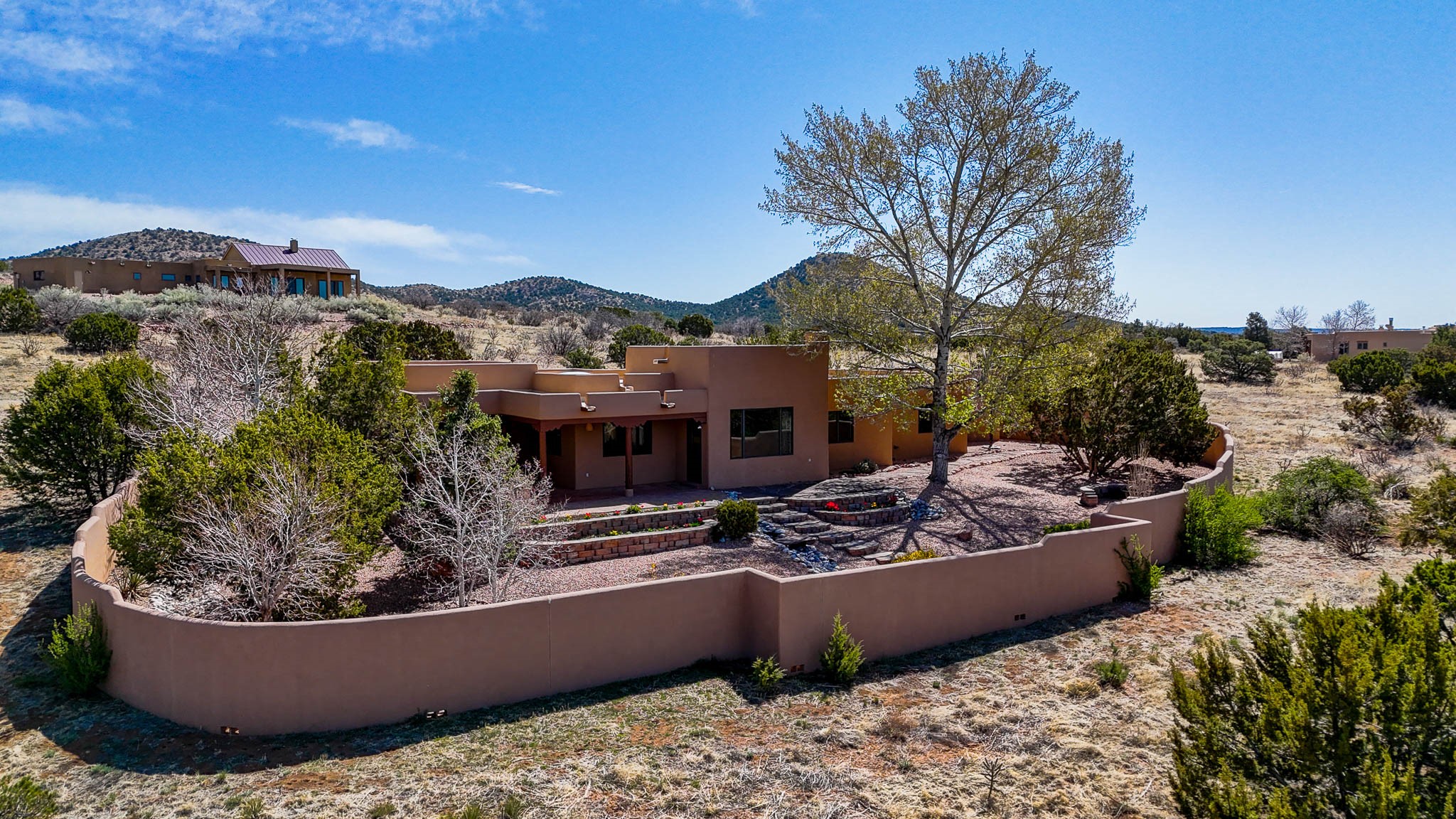 Enjoy breathtaking southwestern mountain views of the Ortiz, Sandia, and the Cerrillos Hills, plus valley views with fabulous sunsets from this classic Santa Fe home on 2.77 acres. The light-filled living area boasts high viga ceilings and a kiva fireplace. Featuring Saltillo tile throughout and radiant heat for cozy comfort. Offering bedroom separation plus a versatile fourth bedroom/office option. Relax in the master suite; featuring another kiva fireplace and a full bath with soaking tub. French doors lead to a generous walled yard with multiple block wall flower terraces, a seasonal outdoor kitchen, and low-maintenance landscaping. Benefit from recirculating hot water, a newer hot water heater, a new roof, and new stucco in 2019. A 3-car garage includes a 220V outlet in the 3rd bay. Enjoy the convenience of nearby local amenities including a grocery store, library, senior center, coffee shop, brew pub, trail system, and elementary school. Abundant wildlife adds to the peaceful setting. Call to schedule your showing today!