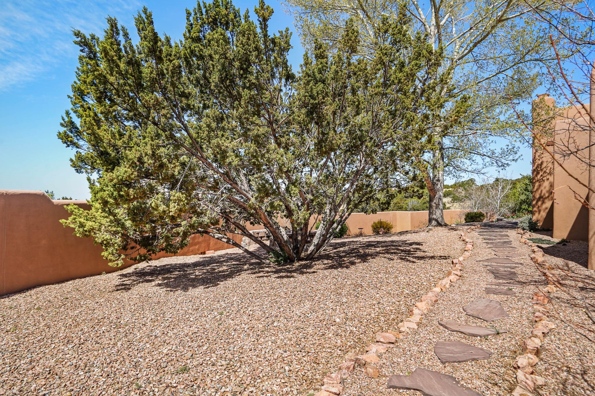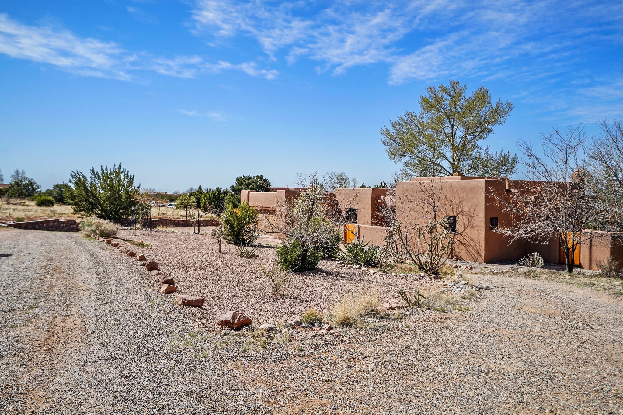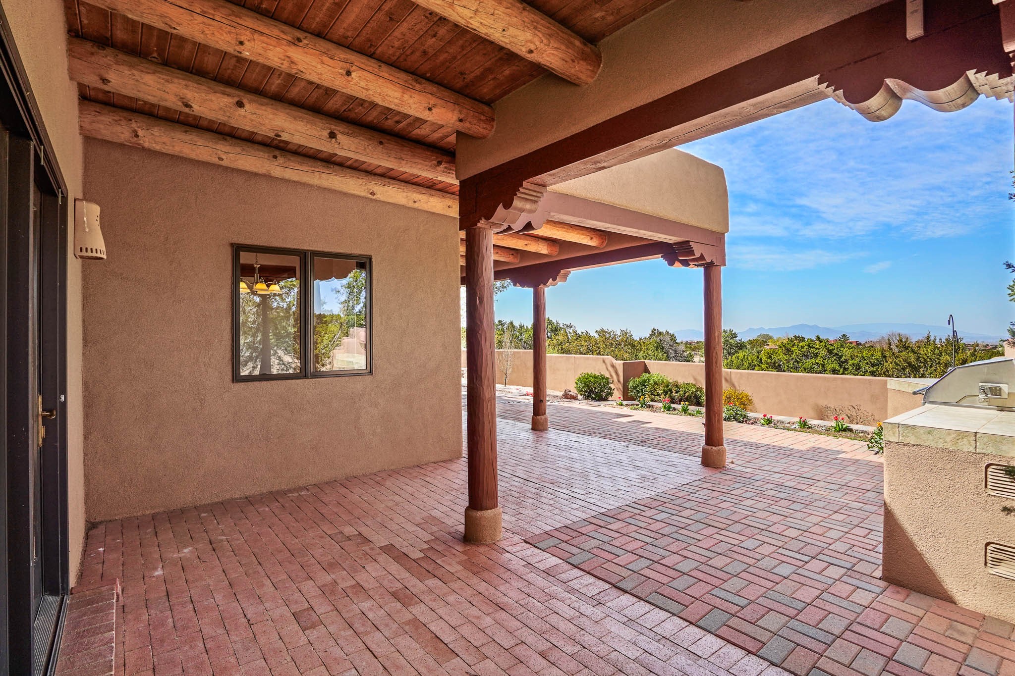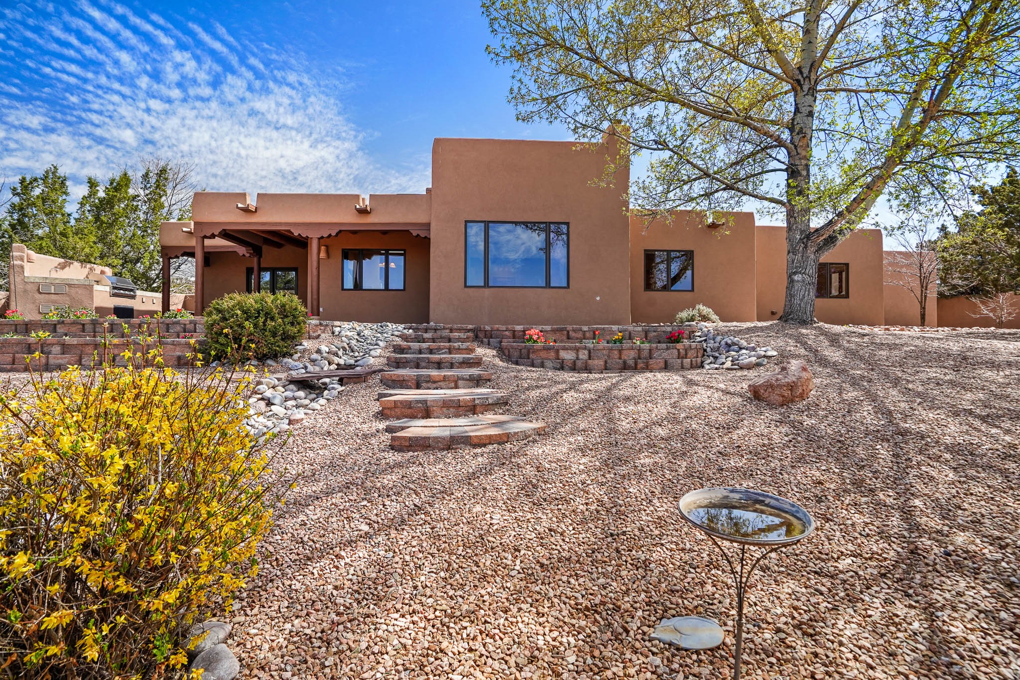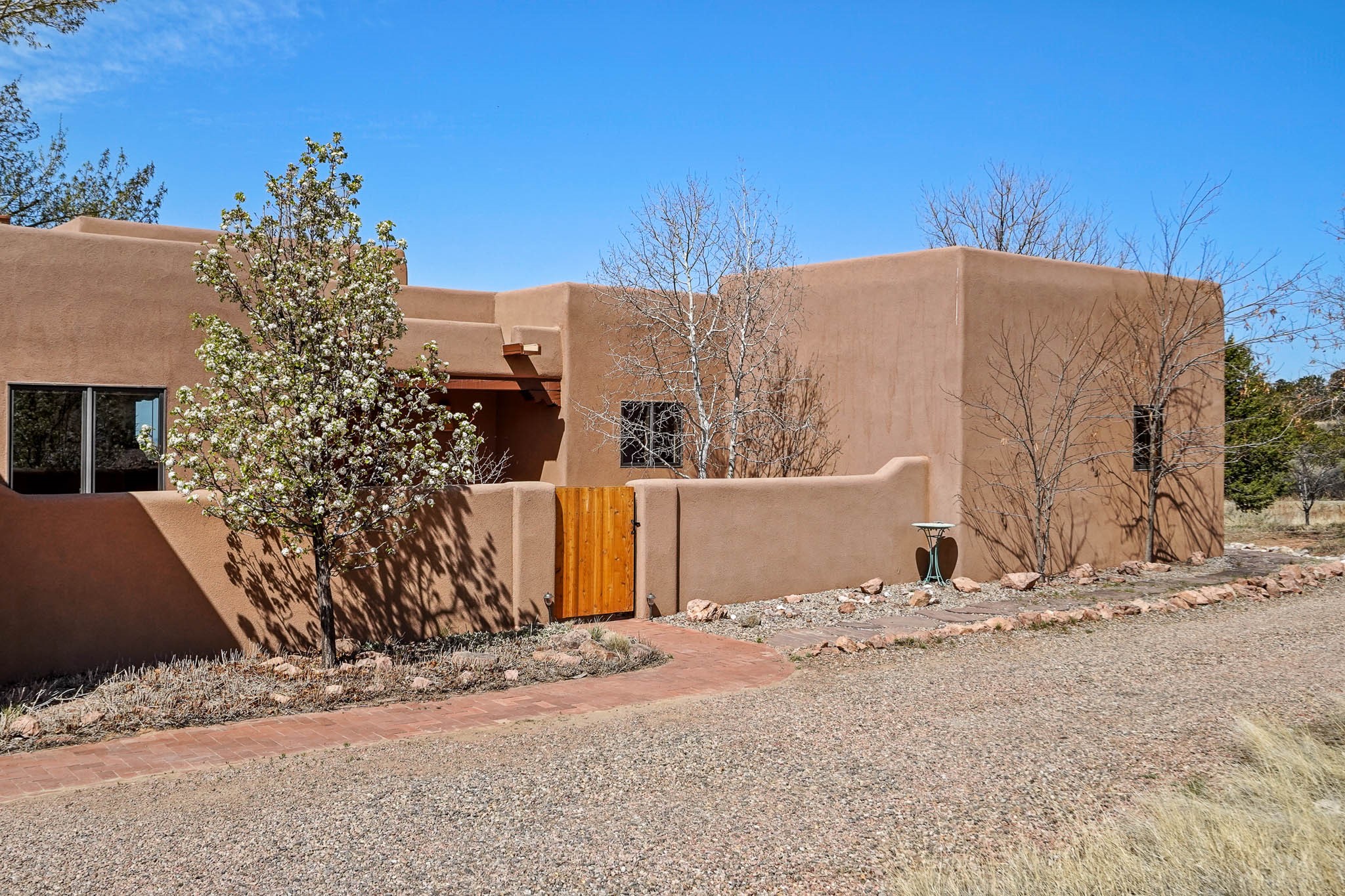 Enjoy breathtaking southwestern mountain views of the Ortiz, Sandia, and the Cerrillos Hills, plus valley views with fabulous sunsets from this classic Santa Fe home on 2.77 acres. The light-filled living area boasts high viga ceilings and a kiva fireplace. Featuring Saltillo tile throughout and radiant heat for cozy comfort. Offering bedroom separation plus a versatile fourth bedroom/office option. Relax in the master suite; featuring another kiva fireplace and a full bath with soaking tub. French doors lead to a generous walled yard with multiple block wall flower terraces, a seasonal outdoor kitchen, and low-maintenance landscaping. Benefit from recirculating hot water, a newer hot water heater, a new roof, and new stucco in 2019. A 3-car garage includes a 220V outlet in the 3rd bay. Enjoy the convenience of nearby local amenities including a grocery store, library, senior center, coffee shop, brew pub, trail system, and elementary school. Abundant wildlife adds to the peaceful setting. Call to schedule your showing today!