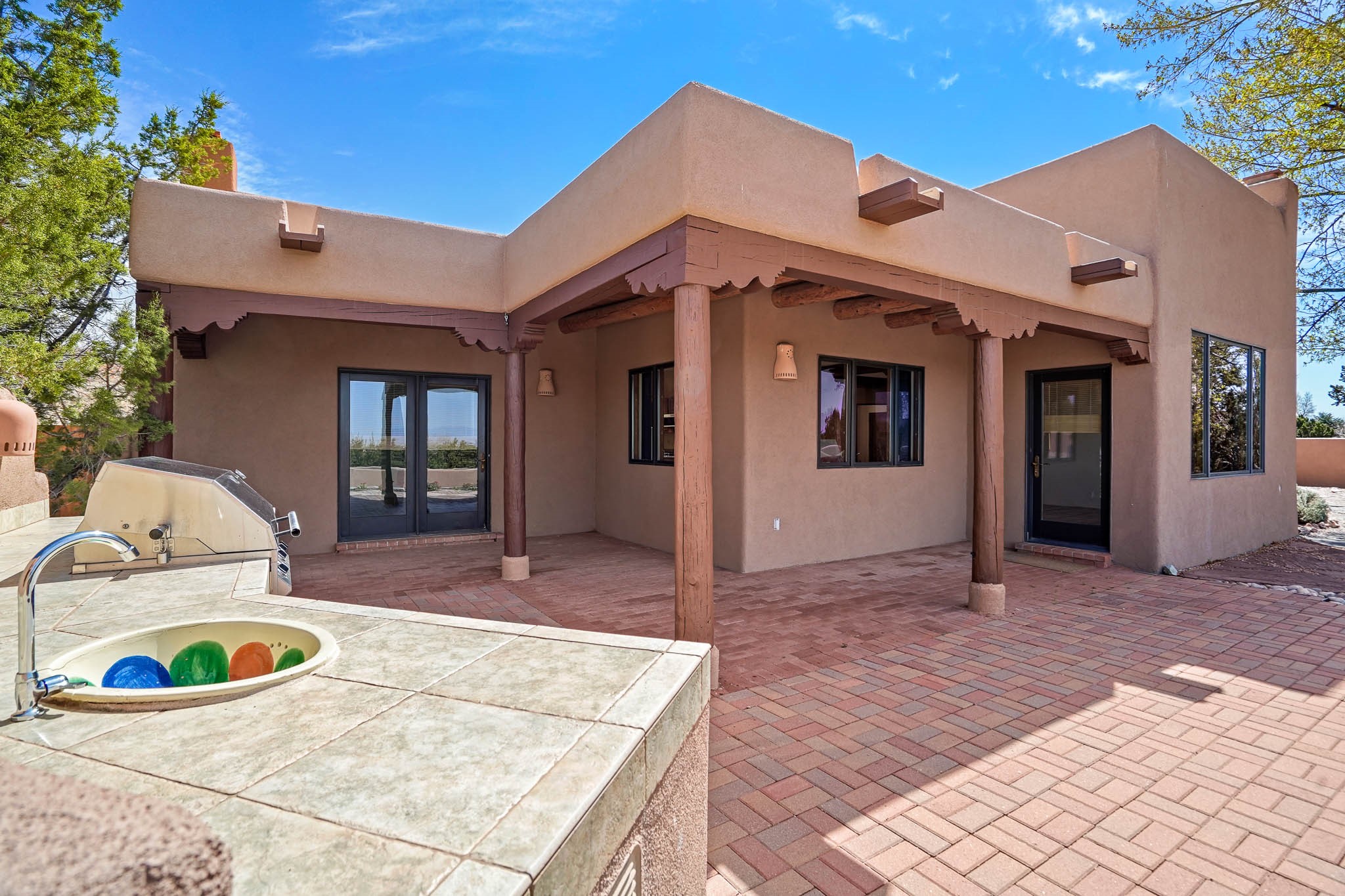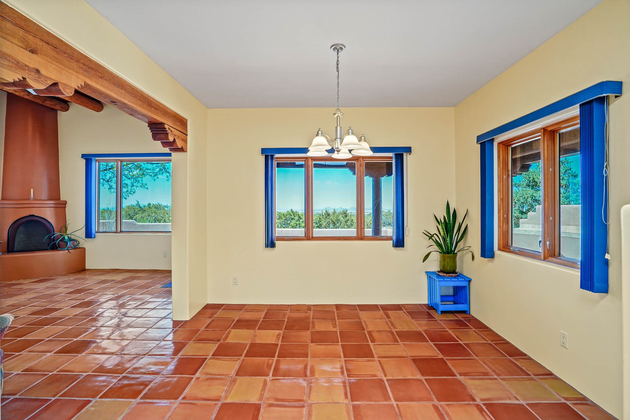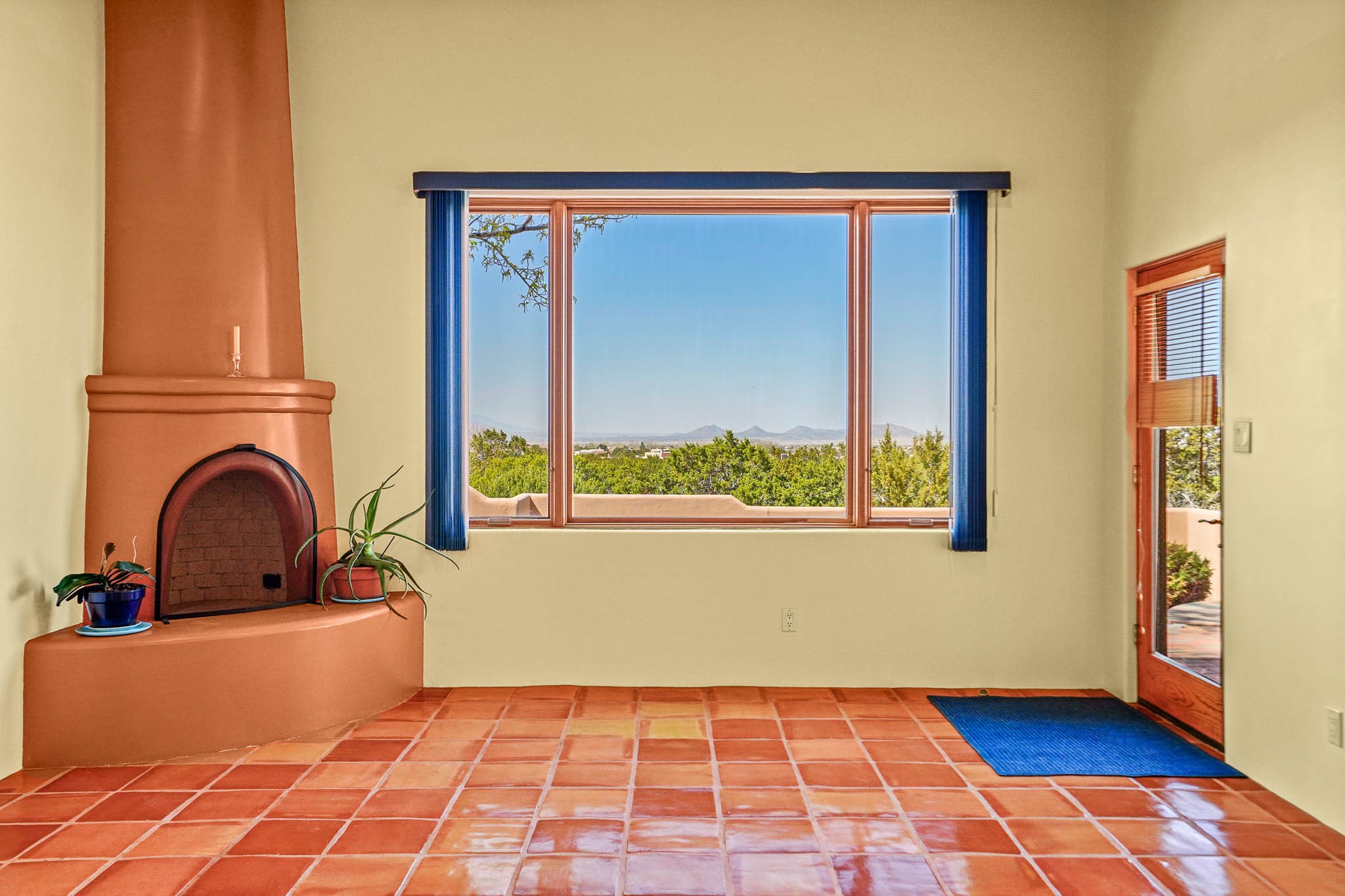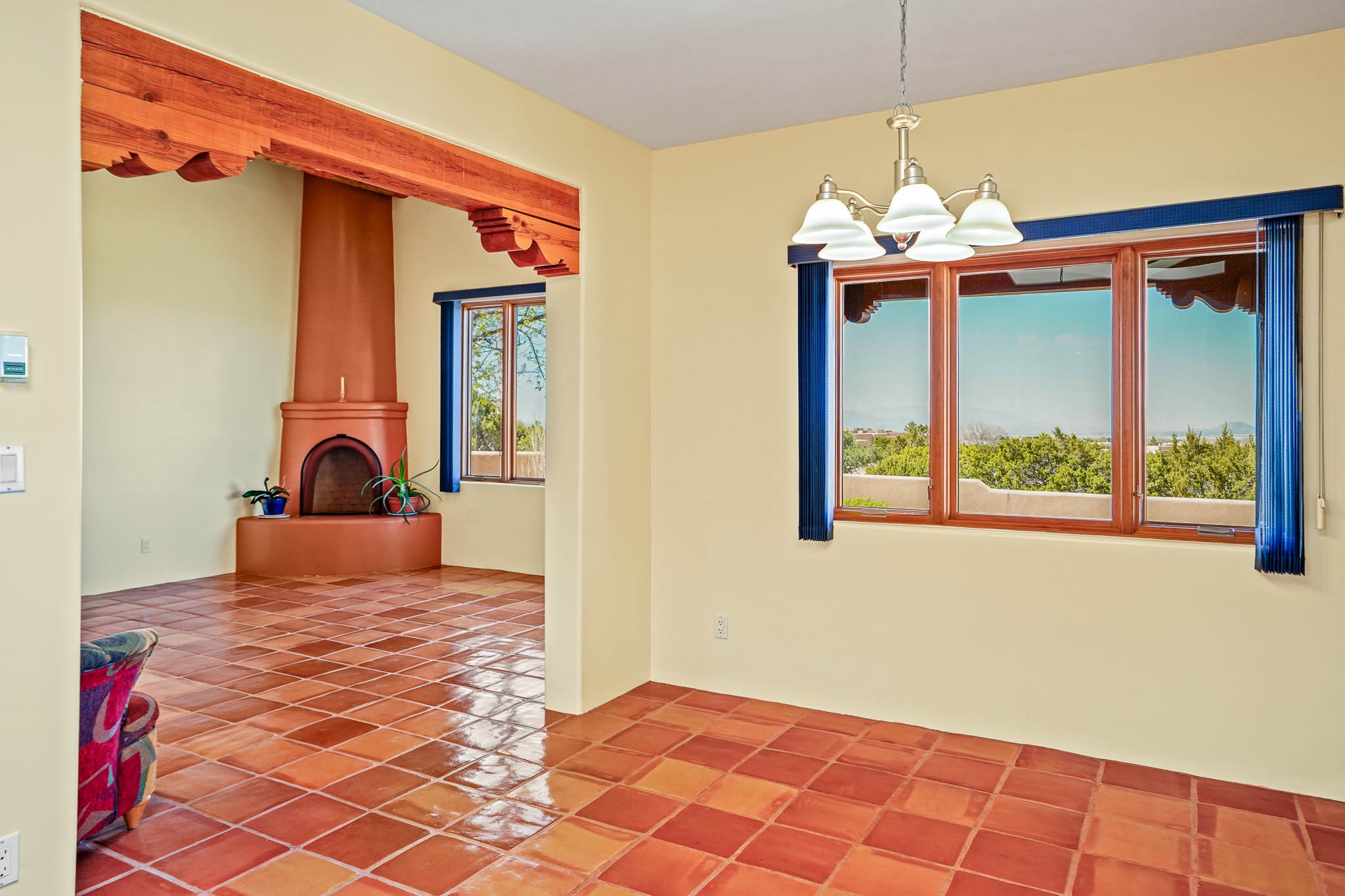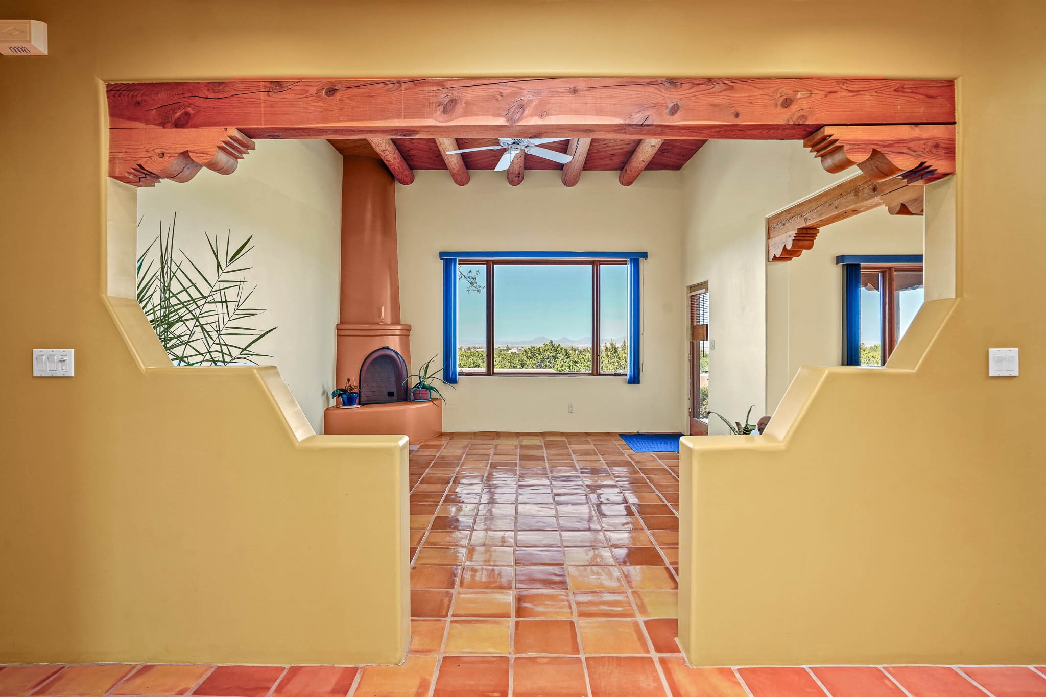 Enjoy breathtaking southwestern mountain views of the Ortiz, Sandia, and the Cerrillos Hills, plus valley views with fabulous sunsets from this classic Santa Fe home on 2.77 acres. The light-filled living area boasts high viga ceilings and a kiva fireplace. Featuring Saltillo tile throughout and radiant heat for cozy comfort. Offering bedroom separation plus a versatile fourth bedroom/office option. Relax in the master suite; featuring another kiva fireplace and a full bath with soaking tub. French doors lead to a generous walled yard with multiple block wall flower terraces, a seasonal outdoor kitchen, and low-maintenance landscaping. Benefit from recirculating hot water, a newer hot water heater, a new roof, and new stucco in 2019. A 3-car garage includes a 220V outlet in the 3rd bay. Enjoy the convenience of nearby local amenities including a grocery store, library, senior center, coffee shop, brew pub, trail system, and elementary school. Abundant wildlife adds to the peaceful setting. Call to schedule your showing today!