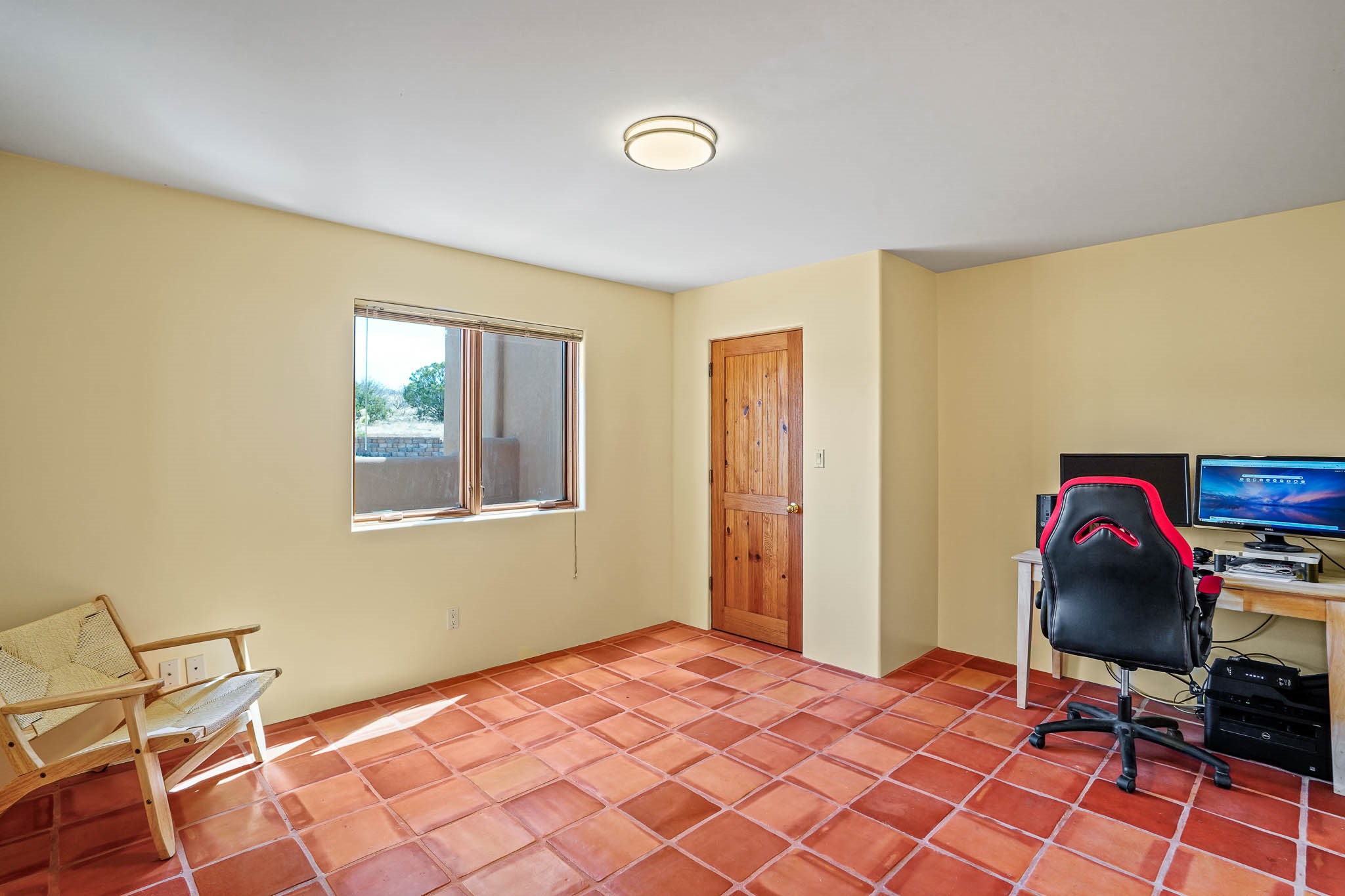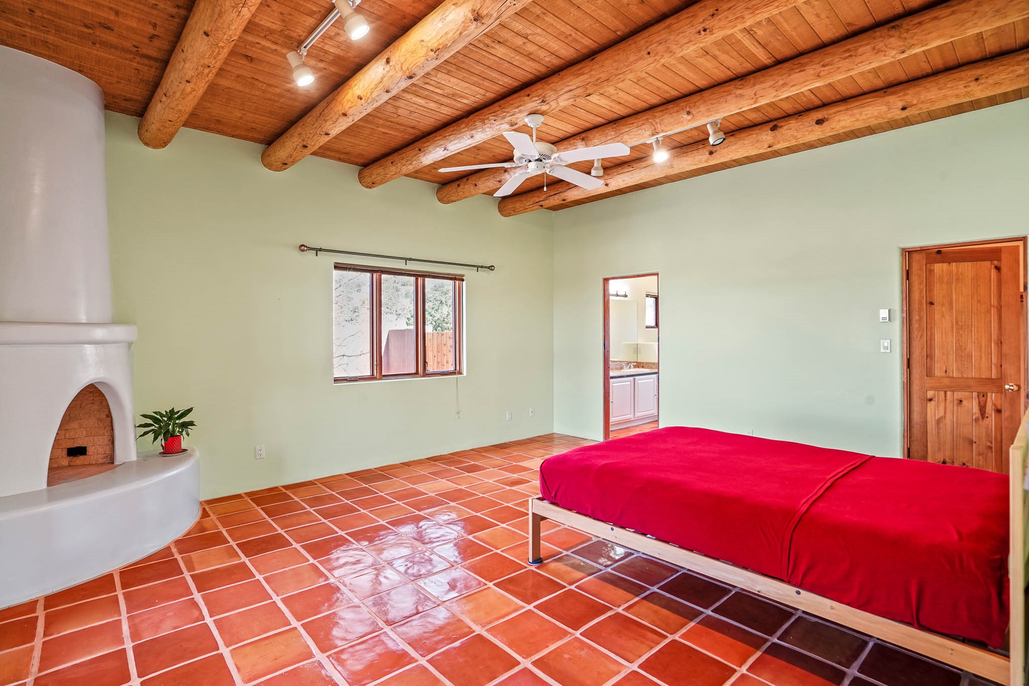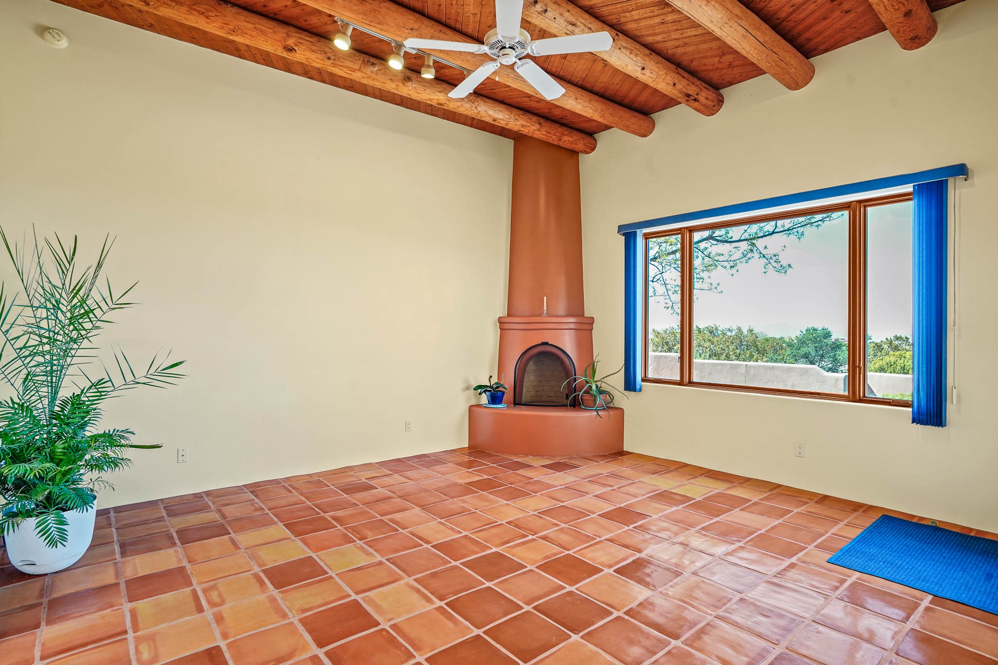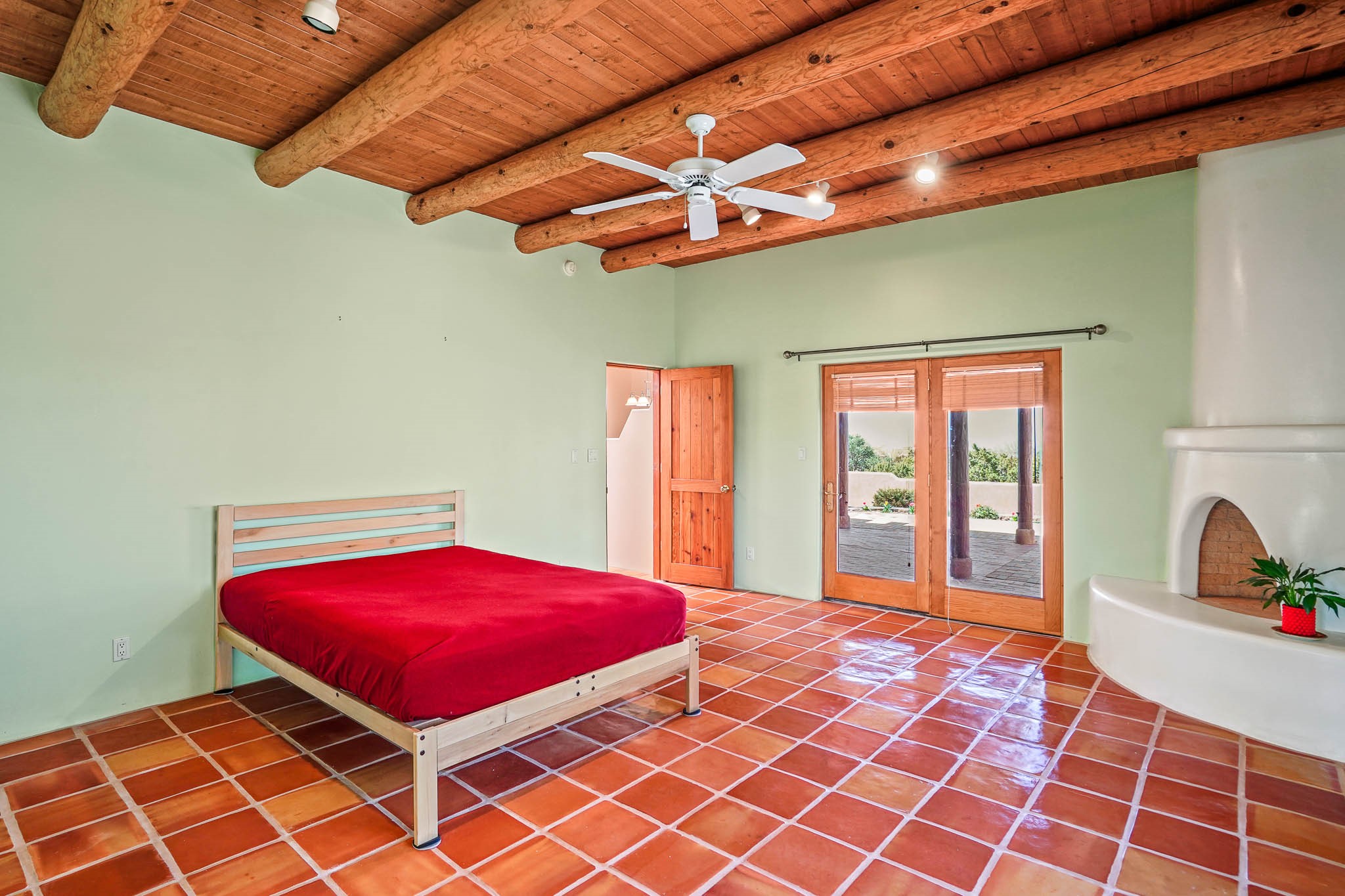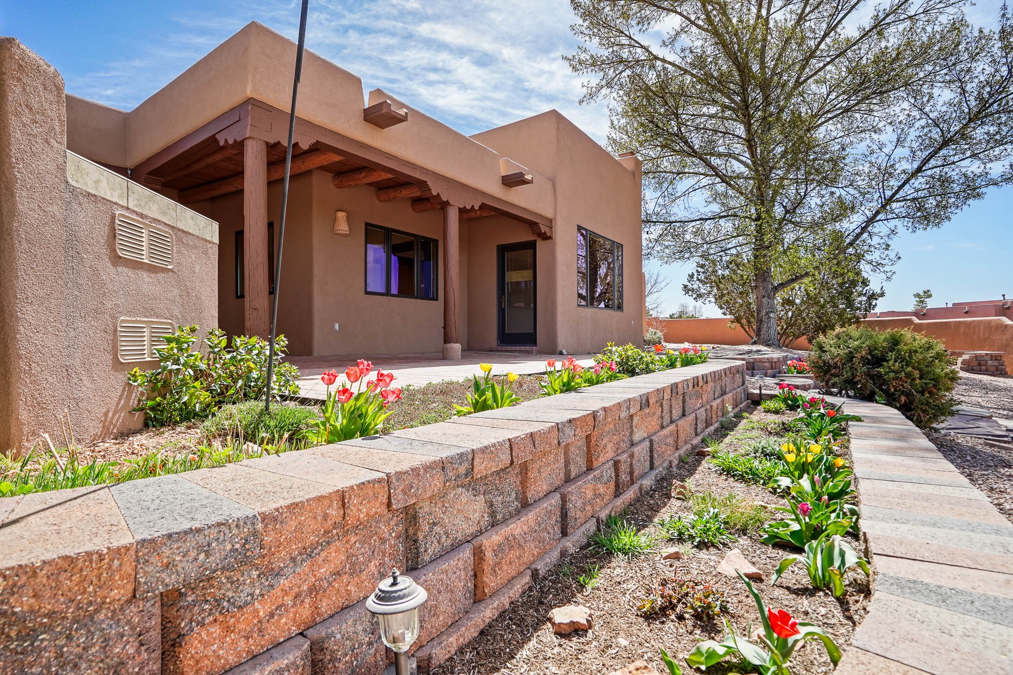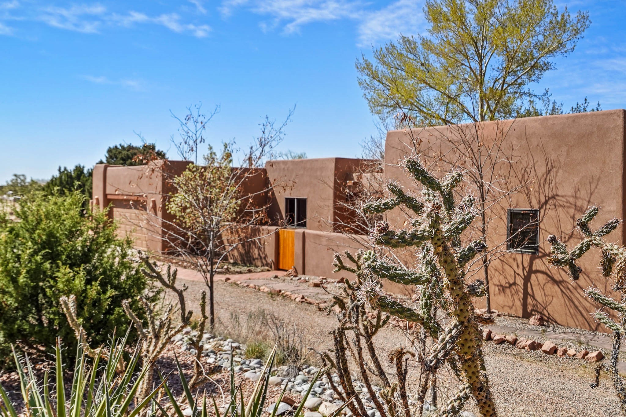 Enjoy breathtaking southwestern mountain views of the Ortiz, Sandia, and the Cerrillos Hills, plus valley views with fabulous sunsets from this classic Santa Fe home on 2.77 acres. The light-filled living area boasts high viga ceilings and a kiva fireplace. Featuring Saltillo tile throughout and radiant heat for cozy comfort. Offering bedroom separation plus a versatile fourth bedroom/office option. Relax in the master suite; featuring another kiva fireplace and a full bath with soaking tub. French doors lead to a generous walled yard with multiple block wall flower terraces, a seasonal outdoor kitchen, and low-maintenance landscaping. Benefit from recirculating hot water, a newer hot water heater, a new roof, and new stucco in 2019. A 3-car garage includes a 220V outlet in the 3rd bay. Enjoy the convenience of nearby local amenities including a grocery store, library, senior center, coffee shop, brew pub, trail system, and elementary school. Abundant wildlife adds to the peaceful setting. Call to schedule your showing today!