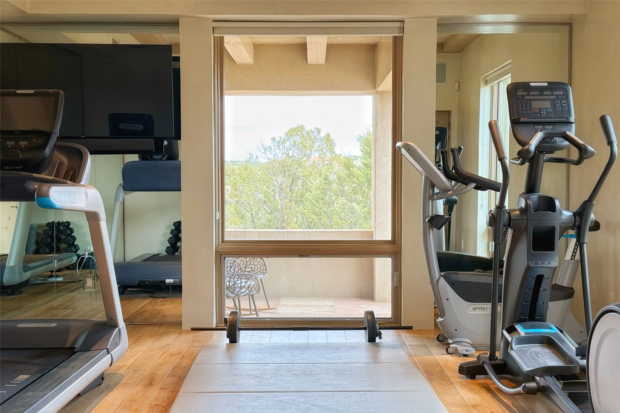 Prestigious Las Campanas Estate. Sophisticated Soft Contemporary on a Double Lot- over 3 acres for privacy.Welcome to an extraordinary estate built by Kim Dressel. Featuring a circular front drive, enclosed zen-like courtyard, and large separate motor court. With sweeping Sangre de Cristo views, this masterpiece blends elegance with tranquility and superb attention to detail. The entire residence is filled with natural light and augmented with custom lighting to showcase the art lover's collection.Interiors are graced with vigas and Desert Indian Sandstone floors. A total of 9 fireplaces (indoor and outdoor) provide warmth and charm. A generous entry hall, framed with alabaster sculptural lighting opens to the Great Room, anchored with a center fireplace and inspired by a bank of floor to ceiling windows that showcase the Sangre de Cristos. This space flaunts soaring ceilings and clerestory windows that flood the space with light. A gourmet kitchen features a large center island with Taj Mahal countertops, Sub-Zero/Wolf appliances, and opens to adjoining formal dining area and a cozy family room. A lavish primary suite offers a fireplace and an east facingportal complete with hot tub, fireplace and mountain views. Primary bath includes dual vanities, steam shower, soaking tub, dry sauna and custom closet. Adjacent home gym for convenience. Transition to the second wing through an impressive Gallery Hall designed for private art collections, exhibits and concert entertaining. A dedicated wine tasting space and sculpture garden complete the gallery.The secondary residence area includes large media room,office, two ensuite bedrooms with fireplaces and patios.Multiple outdoor spaces for indoor/outdoor living and entertaining including a deep covered portal with skylights, water feature, built-in grill and banco seating.Sparing no expense, this architectural gem delivers high-end fit and finishes throughout. The ultimate in style and serene luxury.