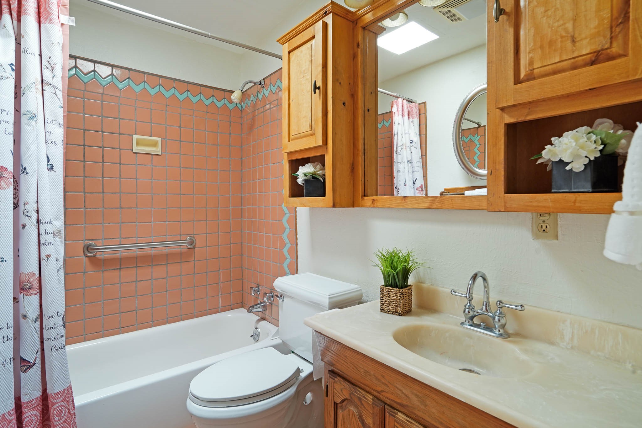 This residence is an exceptionally good value for the ever popular Casa Solana area. New roof 2025!! Additions over the years include a great room with fireplace insert, dining room, master bedroom and bath, additional bathroom and utility room. The back portal was enclosed and features coved ceilings, windows, heating and access to the back yard. This diverse space makes a wonderful summer room, kids space or additional space for guests. The original wood flooring is featured in the original part of the home and the front living area has the corner kiva fireplace these homes are known for. The front and back yards are walled for privacy and both have water features. Sunrises and good views of the Sangre de Cristo Mountains can be enjoyed from the back yard. Aside from the one car garage, the property features 3 distinct areas for storage, two being larger and perfect for sports and yard equipment and seasonal storage.
