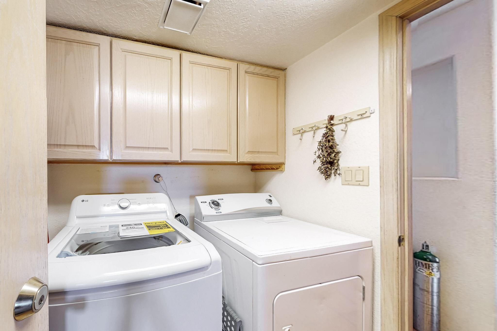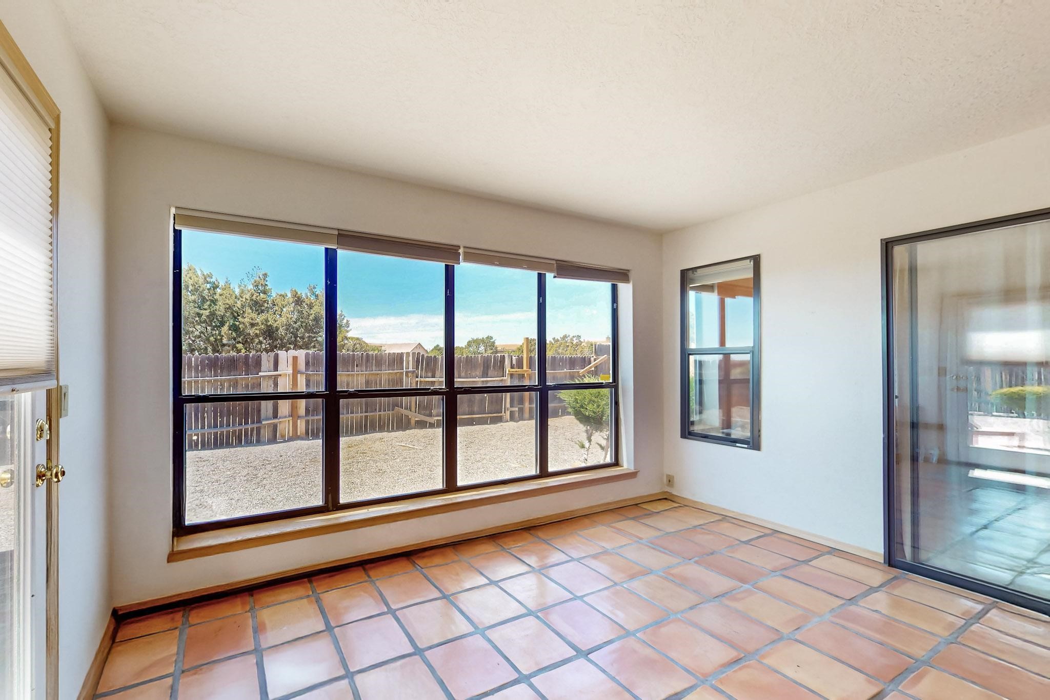 Lovely light classic contemporary pueblo, open plan design with a large extra sunroom. Natural gas forced air with a swamp cooler hook up giving central air conditioning to give both winter heat and summer cool. A 2 way wood burning fireplace with a gas log starter sits between the living room and main bedroom. A private front courtyard, Saltillo floors, viga beams and corbels add a touch of SF character. Ceiling fans in all rooms, one year old hot water heater and a brand new septic tank installed 2024. There is a privately fenced back yard accessed from the sunroom and sunny dining area for entertaining or quiet relaxation. This home sits back on 1.6 acres accessed by paved roads within easy reach of Eldorado amenities, two local shopping centers, schools, parks, library and senior center, only minutes into Santa Fe.