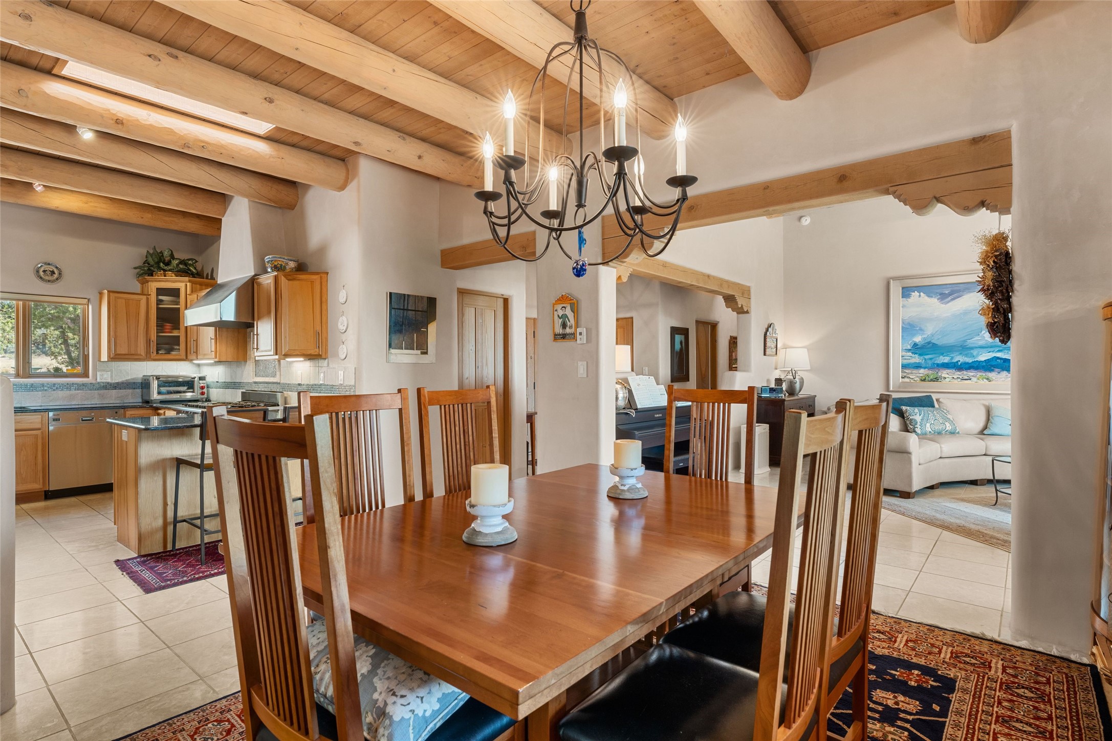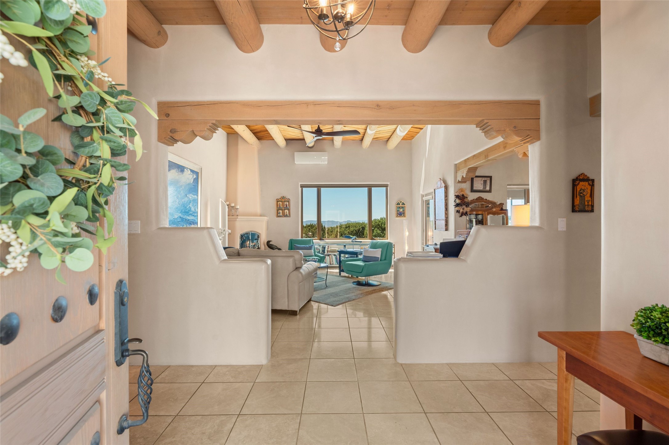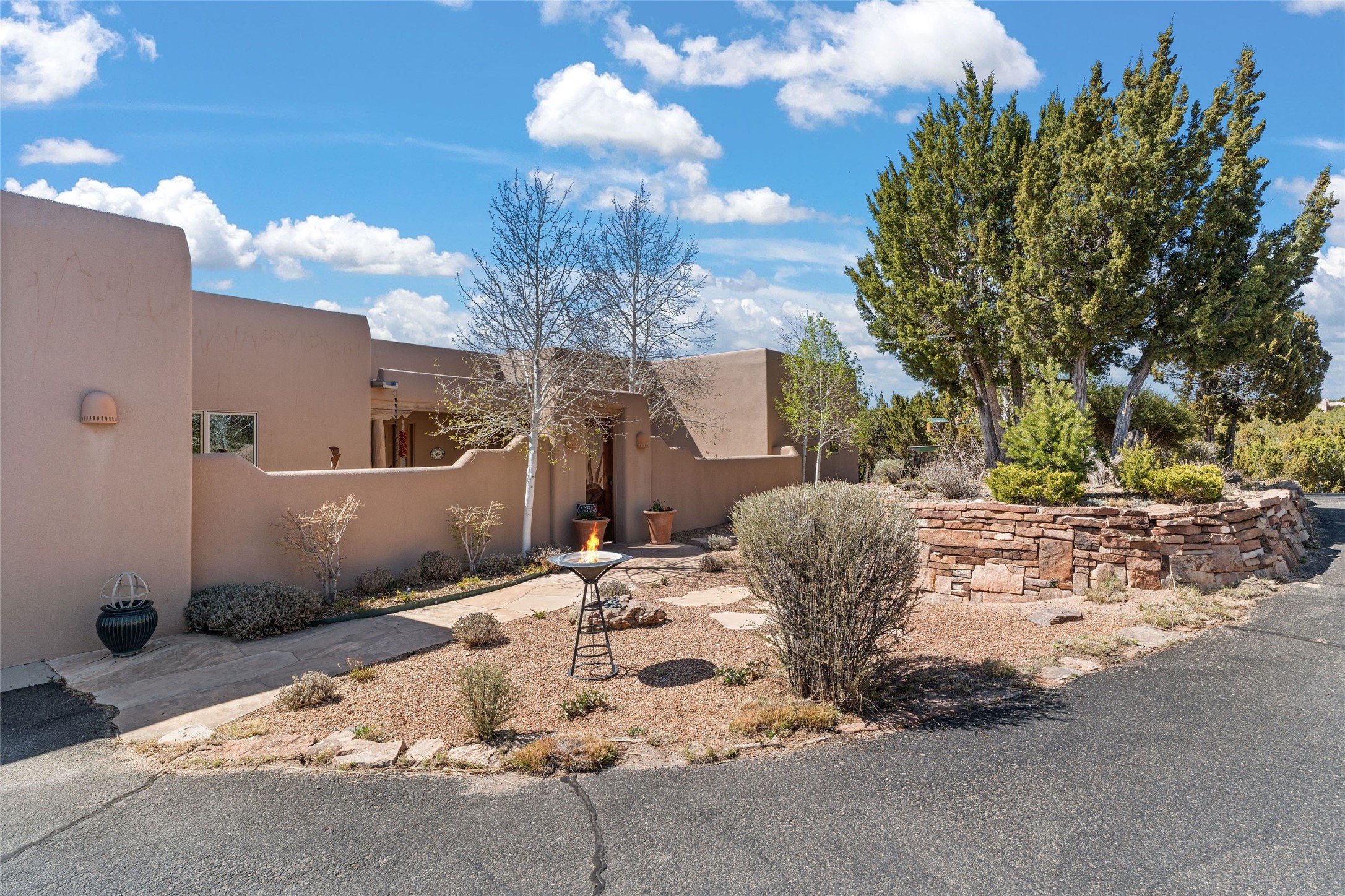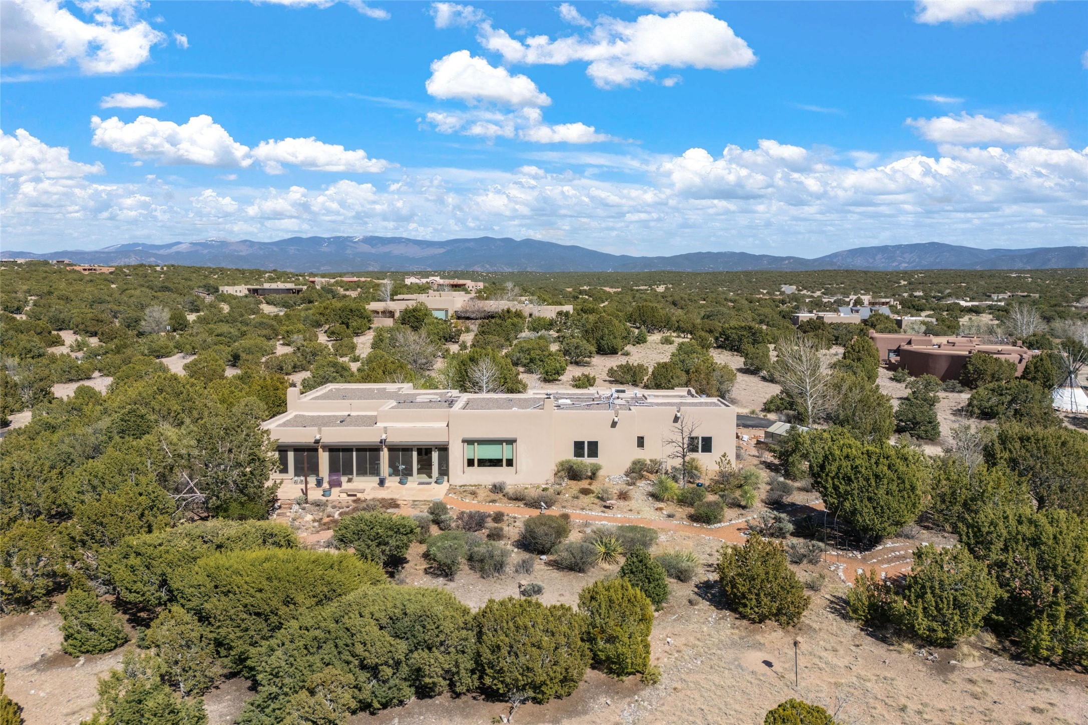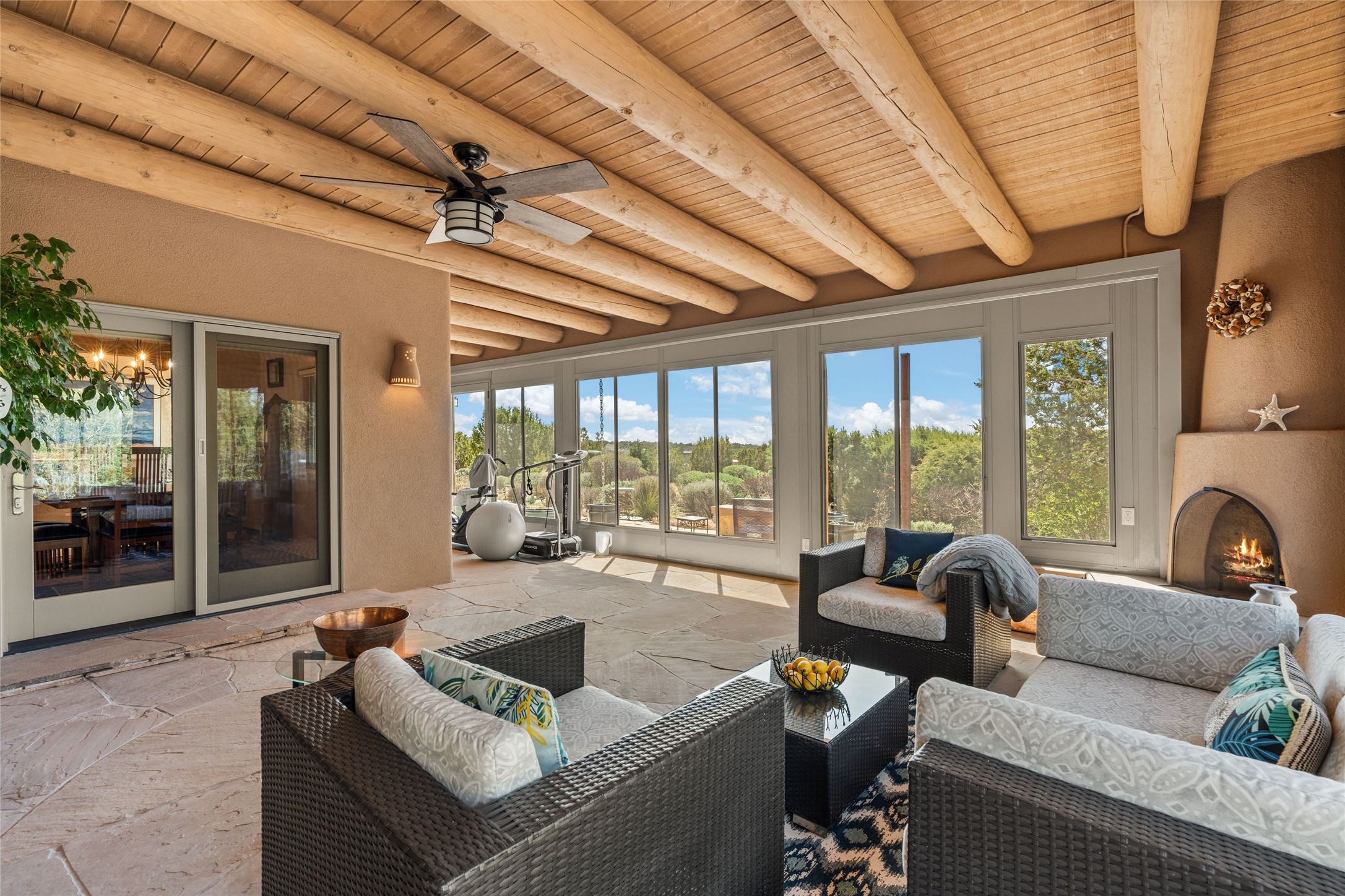 This stunning single-level home features four spacious bedrooms and two and a half baths, all designed without any interior steps for seamless accessibility. The home showcases elegant plastered walls and traditional vigas throughout, creating a warm and inviting atmosphere perfect for entertaining. A gated entry leads you to a welcoming courtyard, while the enclosed sunroom, complete with a wood-burning fireplace, offers a perfect space for relaxation. The gourmet kitchen is a chef's dream, featuring a center island, breakfast bar, Wolf range, and Miele dishwasher, all set on luxurious travertine floors that flow effortlessly throughout the home. The primary suite not only includes a deep jacuzzi tub and fireplace but also grants access to the sunroom, enhancing the living experience. Guests will appreciate the custom Murphy bed in one of the bedrooms, which can easily transform into an office or studio space as needed. Custom Santa Fe awning covers for the skylights modulate climate control during summer months. Enjoy breathtaking sunsets and picturesque views of the Jemez Mountains right from your backyard. Outdoor enthusiasts will appreciate the proximity to La Tierra's extensive walking and hiking trail systems, making it easy to explore the natural beauty of the area. Additionally, this prime location is just a quick drive away from the vibrant downtown plaza, the renowned Canyon Road, and the Santa Fe Opera.