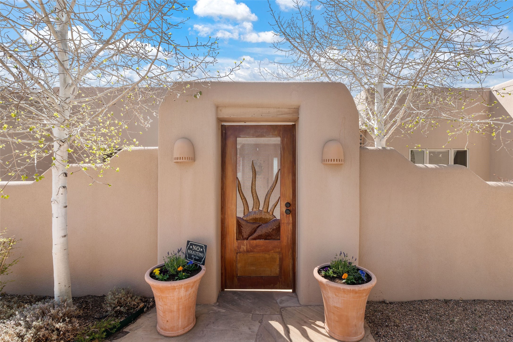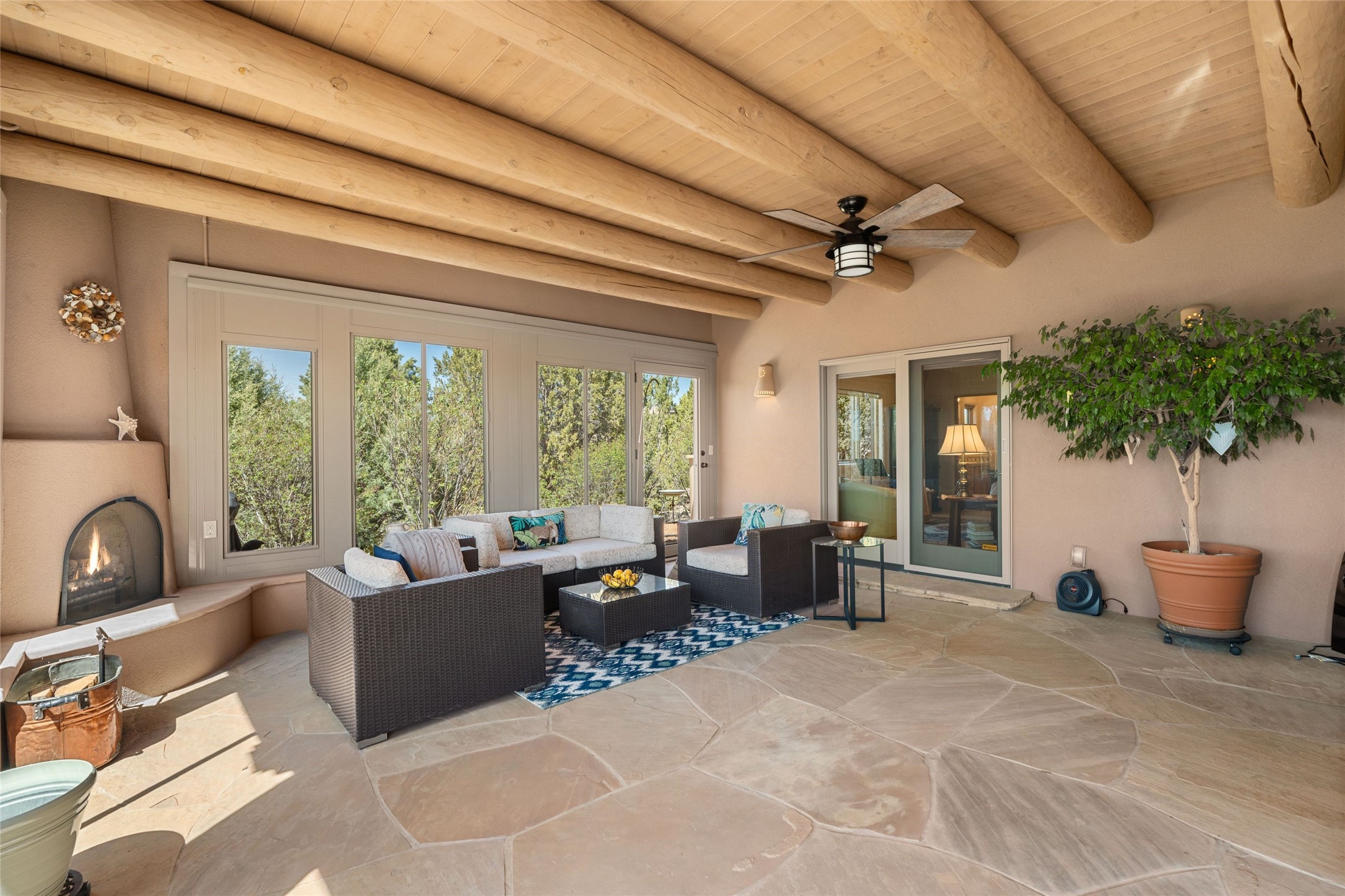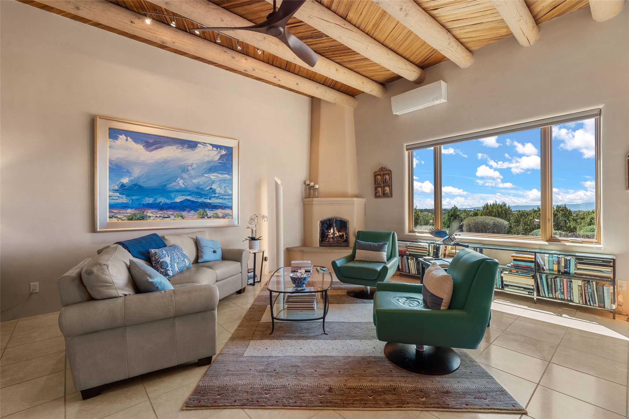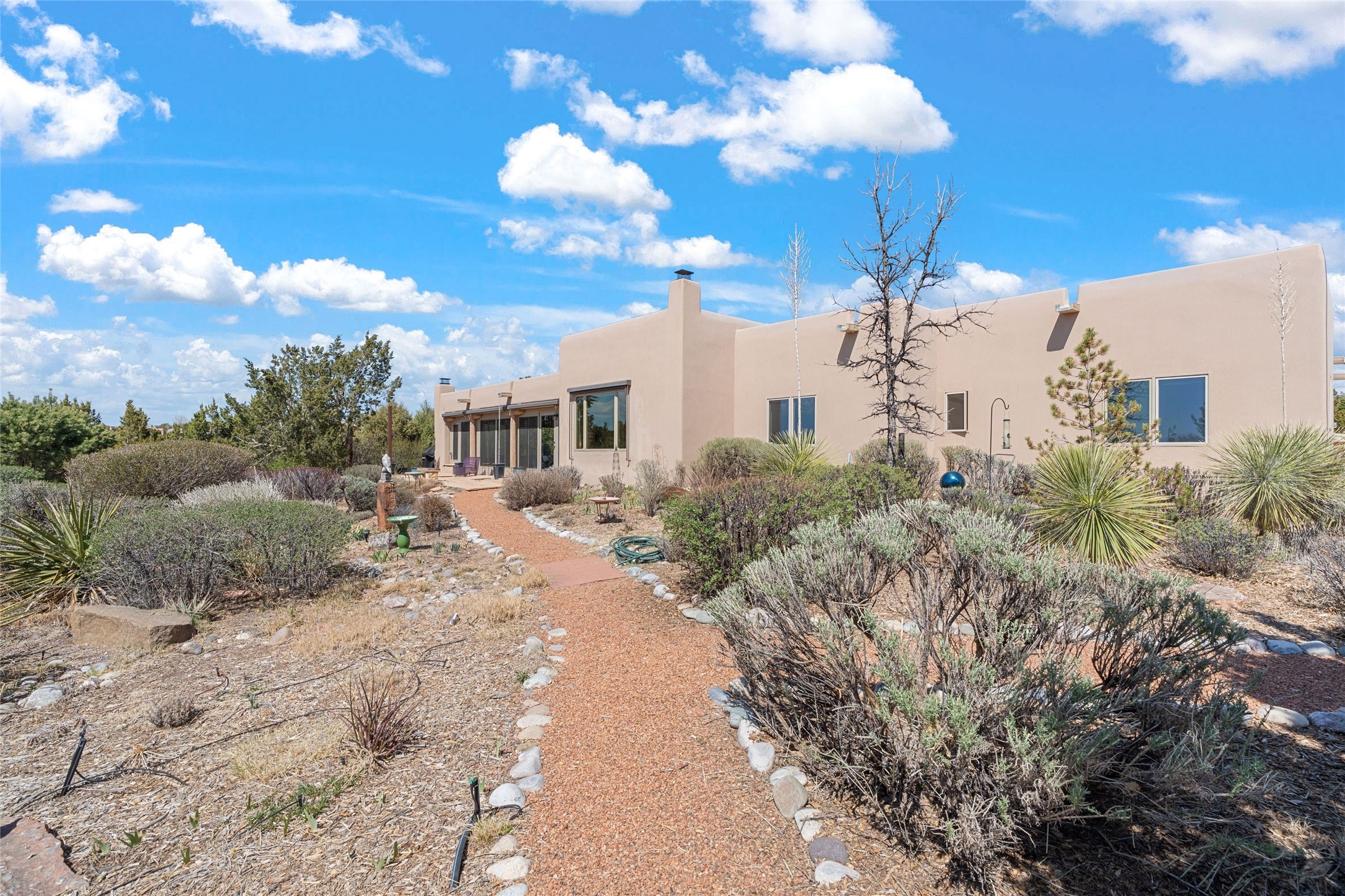 This stunning single-level home features four spacious bedrooms and two and a half baths, all designed without any interior steps for seamless accessibility. The home showcases elegant plastered walls and traditional vigas throughout, creating a warm and inviting atmosphere perfect for entertaining. A gated entry leads you to a welcoming courtyard, while the enclosed sunroom, complete with a wood-burning fireplace, offers a perfect space for relaxation. The gourmet kitchen is a chef's dream, featuring a center island, breakfast bar, Wolf range, and Miele dishwasher, all set on luxurious travertine floors that flow effortlessly throughout the home. The primary suite not only includes a deep jacuzzi tub and fireplace but also grants access to the sunroom, enhancing the living experience. Guests will appreciate the custom Murphy bed in one of the bedrooms, which can easily transform into an office or studio space as needed. Custom Santa Fe awning covers for the skylights modulate climate control during summer months. Enjoy breathtaking sunsets and picturesque views of the Jemez Mountains right from your backyard. Outdoor enthusiasts will appreciate the proximity to La Tierra's extensive walking and hiking trail systems, making it easy to explore the natural beauty of the area. Additionally, this prime location is just a quick drive away from the vibrant downtown plaza, the renowned Canyon Road, and the Santa Fe Opera.