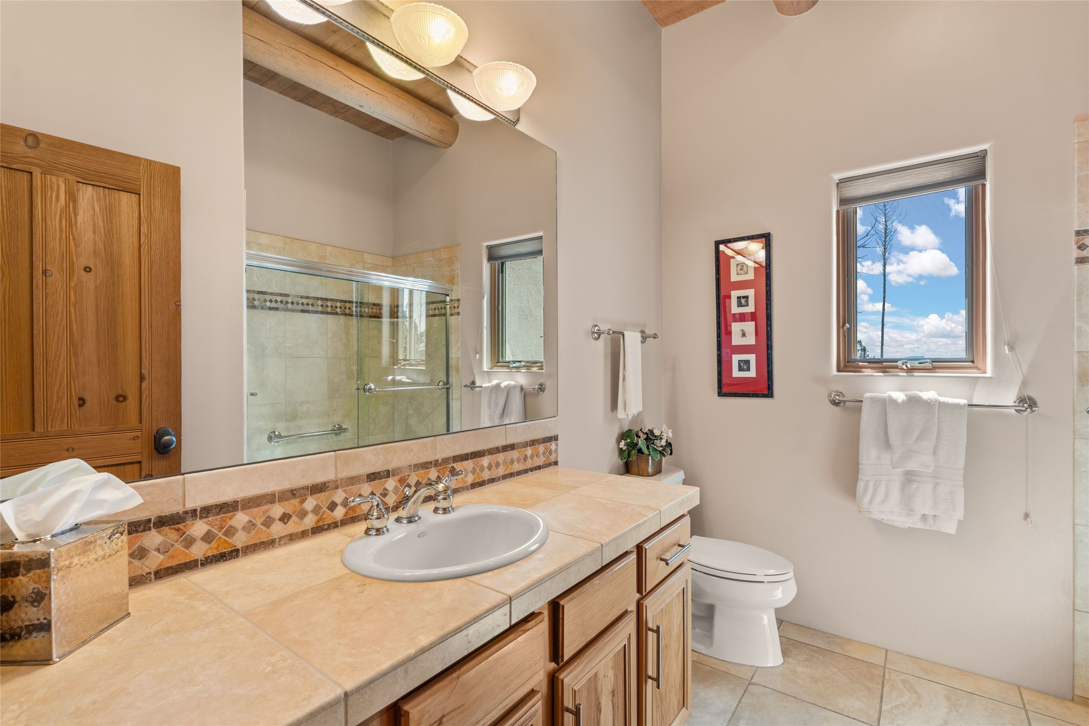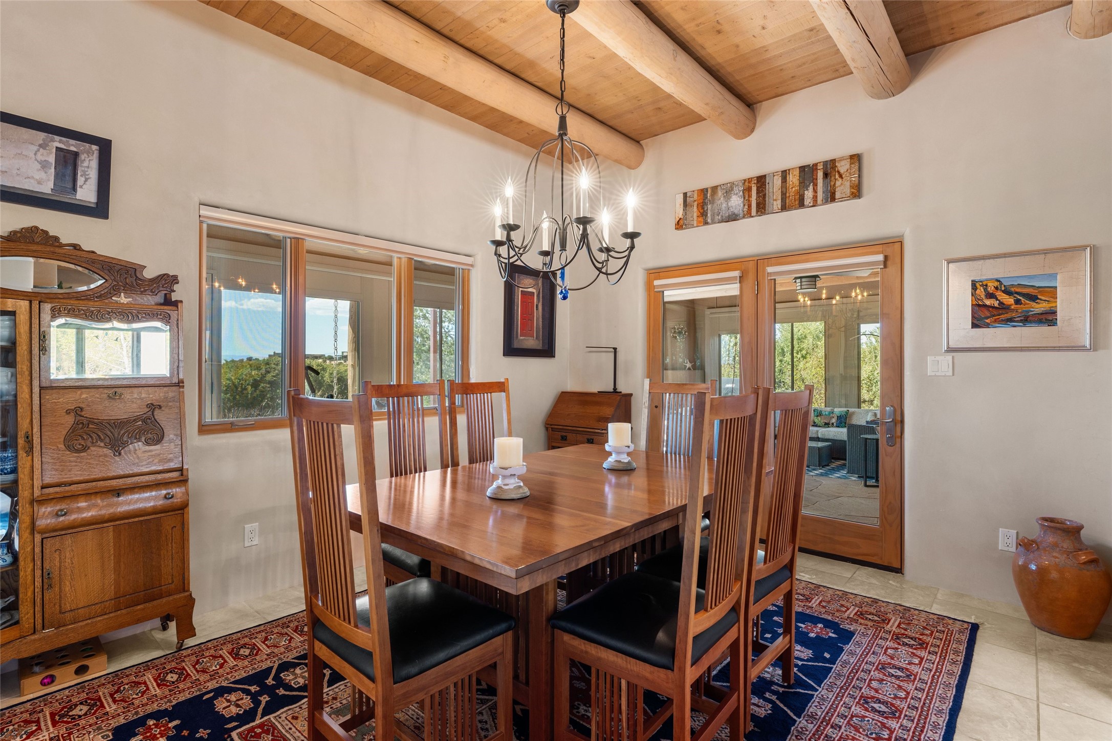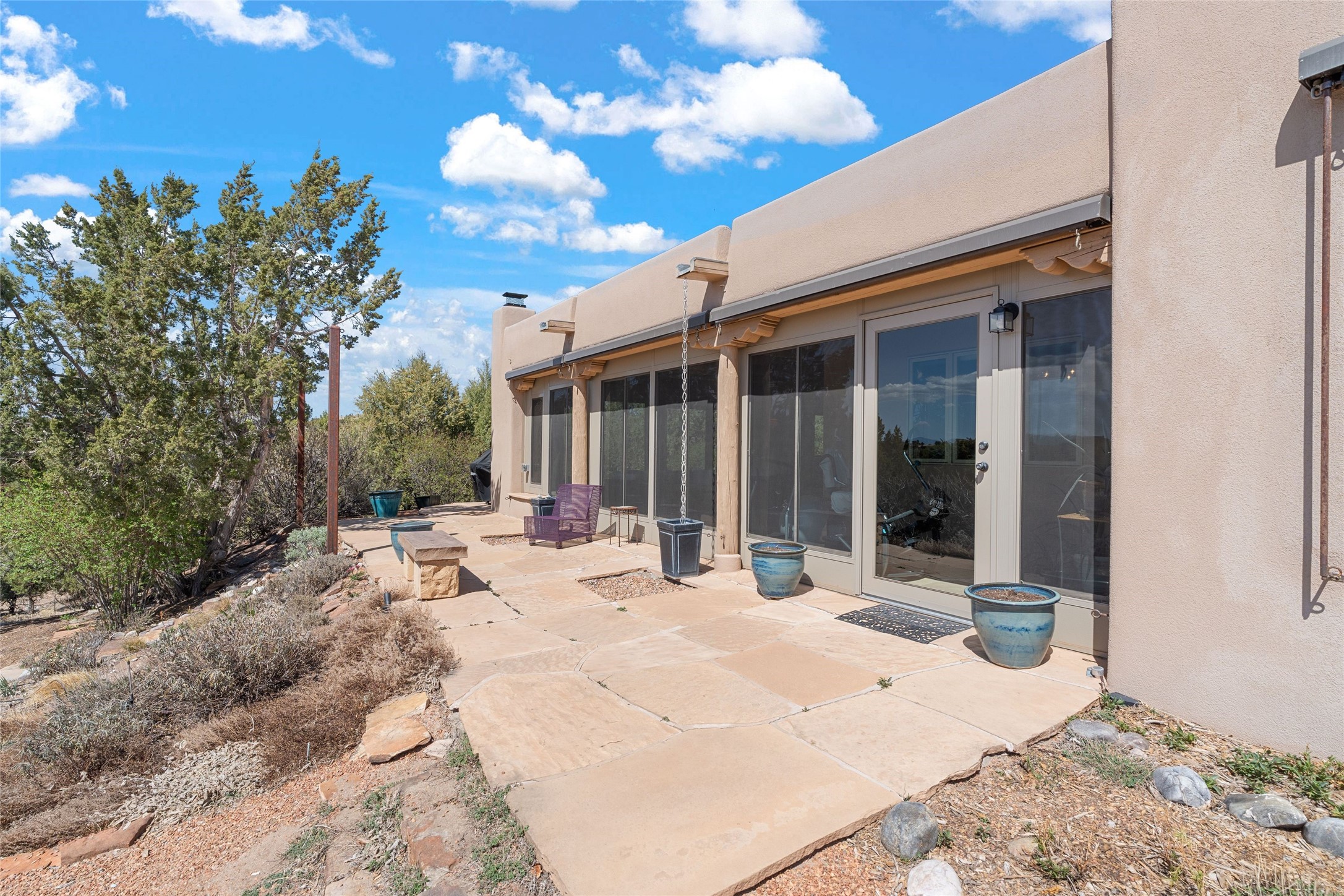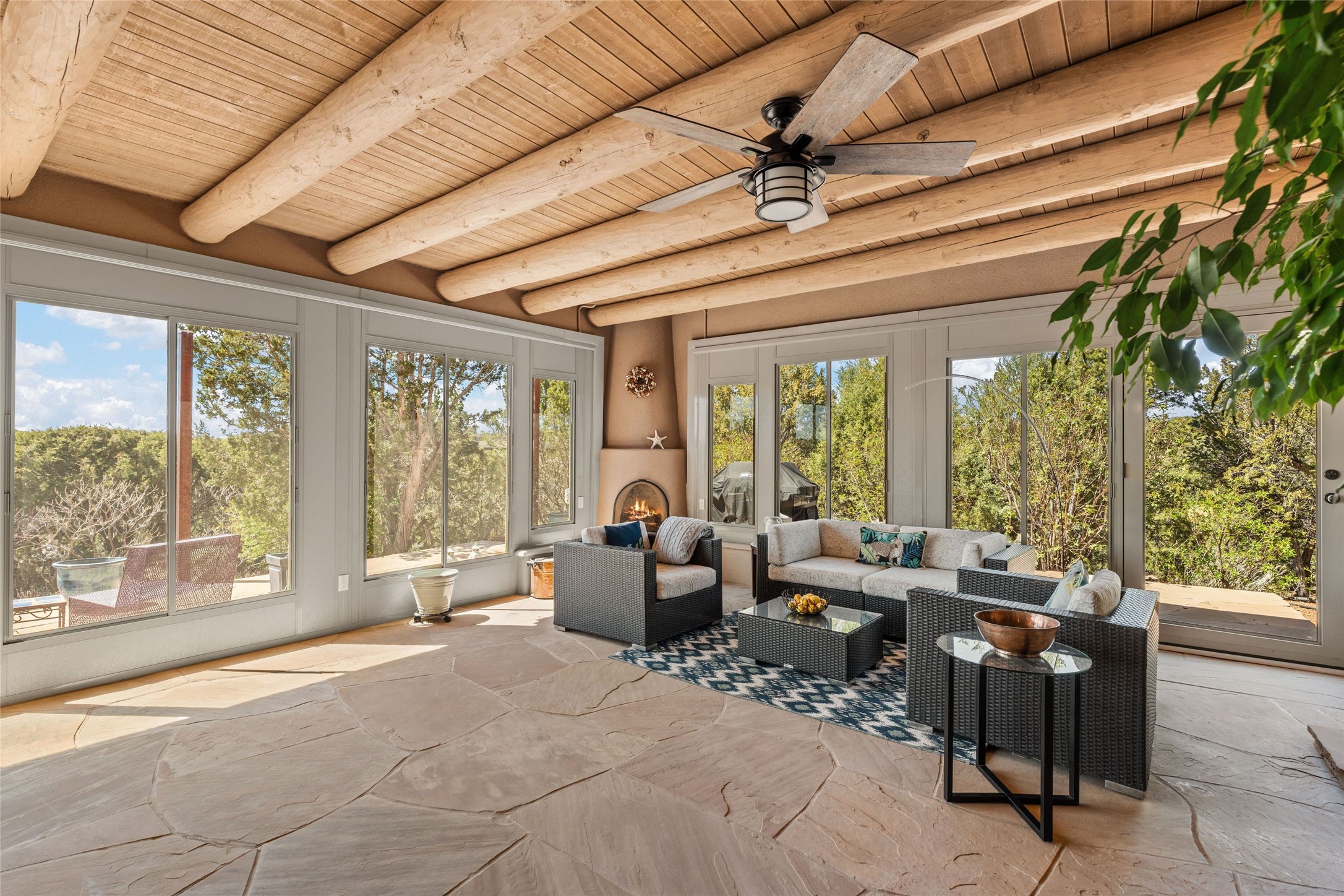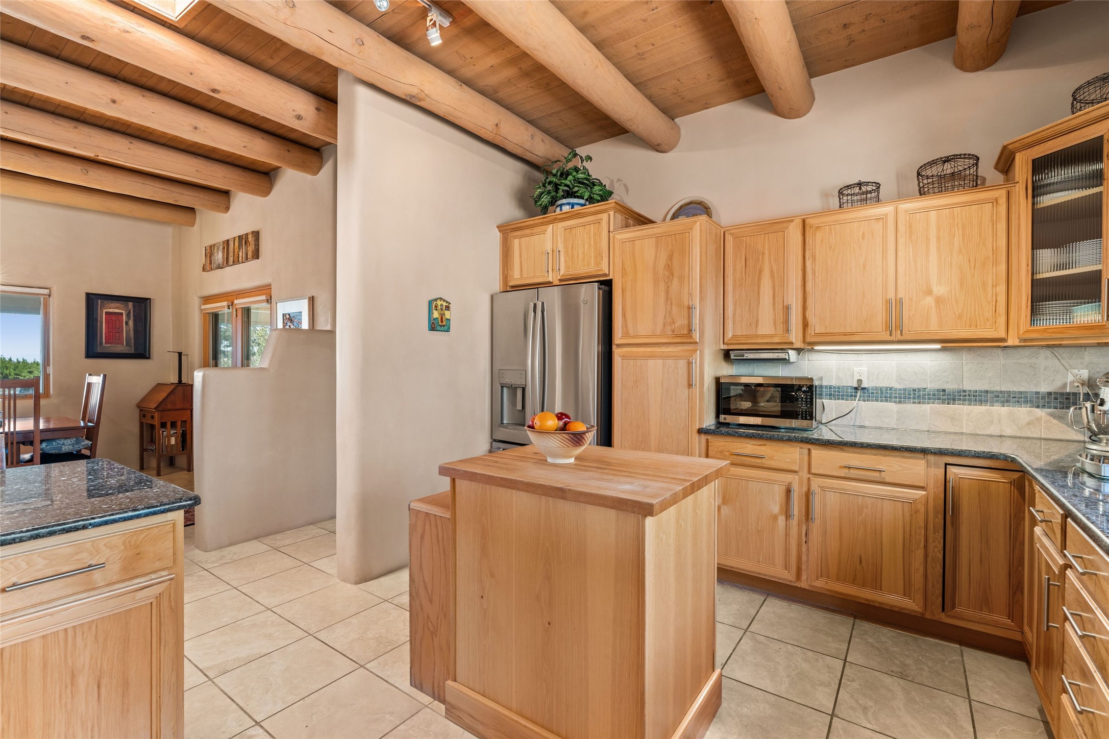 This stunning single-level home features four spacious bedrooms and two and a half baths, all designed without any interior steps for seamless accessibility. The home showcases elegant plastered walls and traditional vigas throughout, creating a warm and inviting atmosphere perfect for entertaining. A gated entry leads you to a welcoming courtyard, while the enclosed sunroom, complete with a wood-burning fireplace, offers a perfect space for relaxation. The gourmet kitchen is a chef's dream, featuring a center island, breakfast bar, Wolf range, and Miele dishwasher, all set on luxurious travertine floors that flow effortlessly throughout the home. The primary suite not only includes a deep jacuzzi tub and fireplace but also grants access to the sunroom, enhancing the living experience. Guests will appreciate the custom Murphy bed in one of the bedrooms, which can easily transform into an office or studio space as needed. Custom Santa Fe awning covers for the skylights modulate climate control during summer months. Enjoy breathtaking sunsets and picturesque views of the Jemez Mountains right from your backyard. Outdoor enthusiasts will appreciate the proximity to La Tierra's extensive walking and hiking trail systems, making it easy to explore the natural beauty of the area. Additionally, this prime location is just a quick drive away from the vibrant downtown plaza, the renowned Canyon Road, and the Santa Fe Opera.