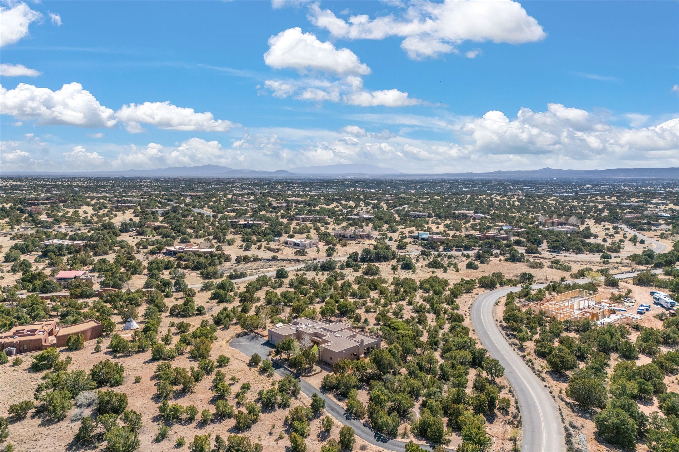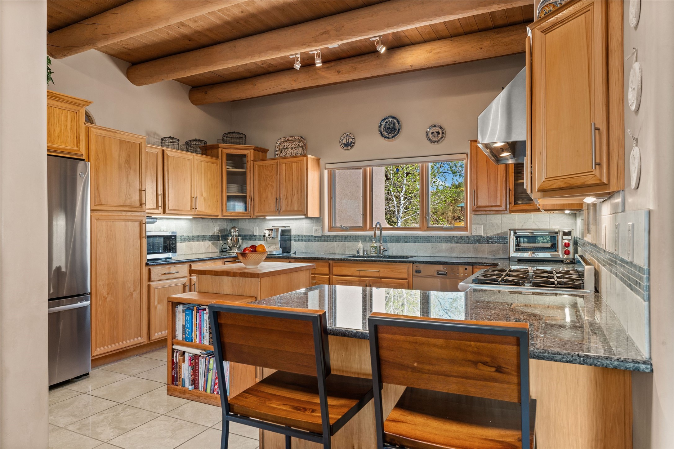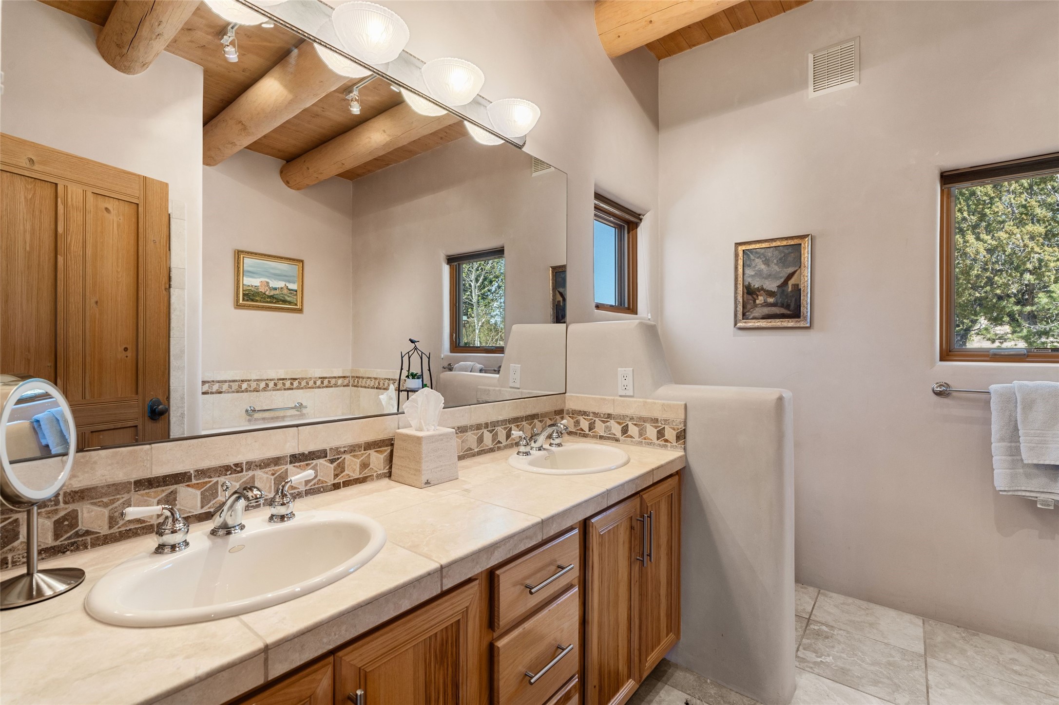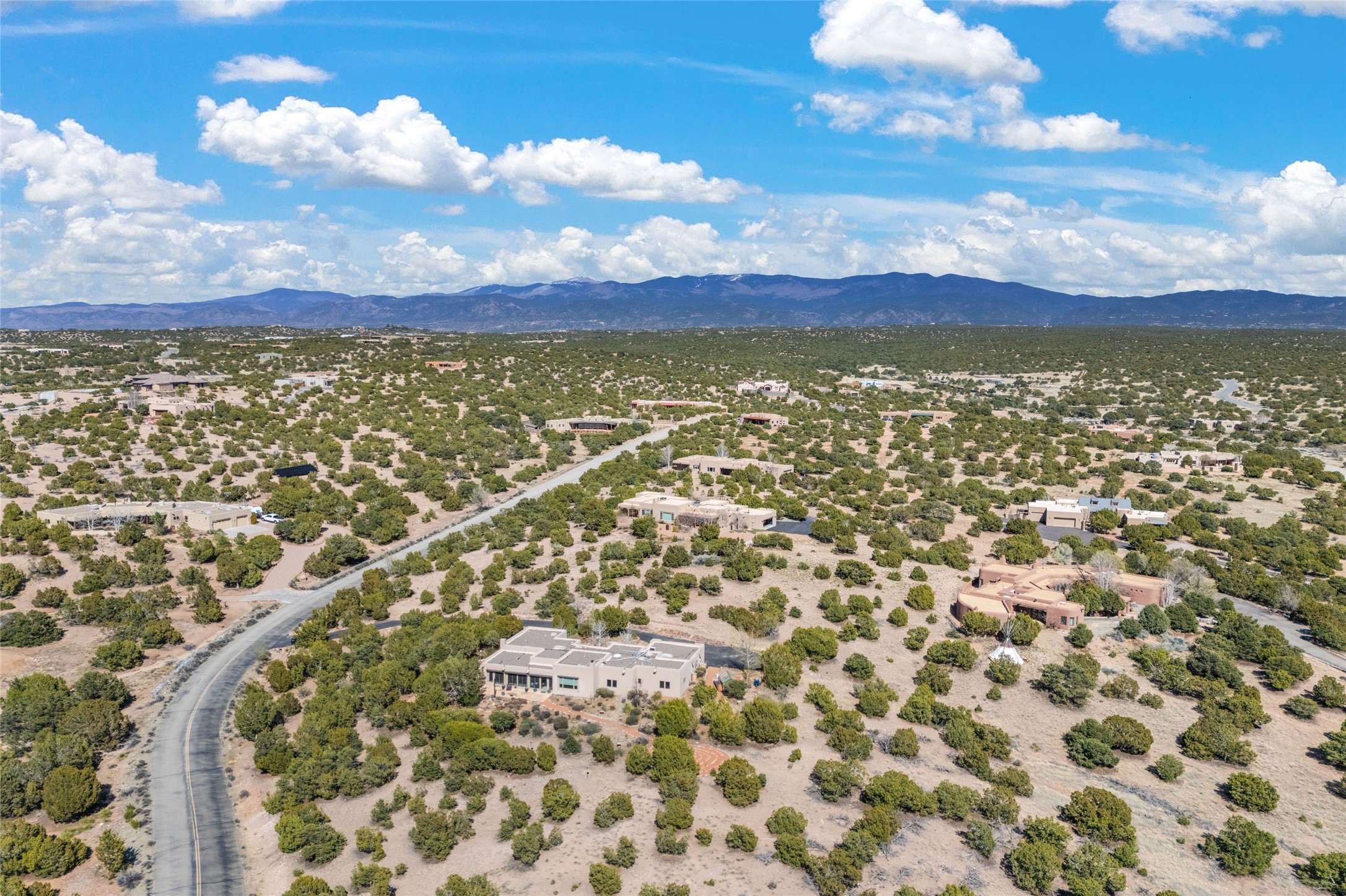 This stunning single-level home features four spacious bedrooms and two and a half baths, all designed without any interior steps for seamless accessibility. The home showcases elegant plastered walls and traditional vigas throughout, creating a warm and inviting atmosphere perfect for entertaining. A gated entry leads you to a welcoming courtyard, while the enclosed sunroom, complete with a wood-burning fireplace, offers a perfect space for relaxation. The gourmet kitchen is a chef's dream, featuring a center island, breakfast bar, Wolf range, and Miele dishwasher, all set on luxurious travertine floors that flow effortlessly throughout the home. The primary suite not only includes a deep jacuzzi tub and fireplace but also grants access to the sunroom, enhancing the living experience. Guests will appreciate the custom Murphy bed in one of the bedrooms, which can easily transform into an office or studio space as needed. Custom Santa Fe awning covers for the skylights modulate climate control during summer months. Enjoy breathtaking sunsets and picturesque views of the Jemez Mountains right from your backyard. Outdoor enthusiasts will appreciate the proximity to La Tierra's extensive walking and hiking trail systems, making it easy to explore the natural beauty of the area. Additionally, this prime location is just a quick drive away from the vibrant downtown plaza, the renowned Canyon Road, and the Santa Fe Opera.