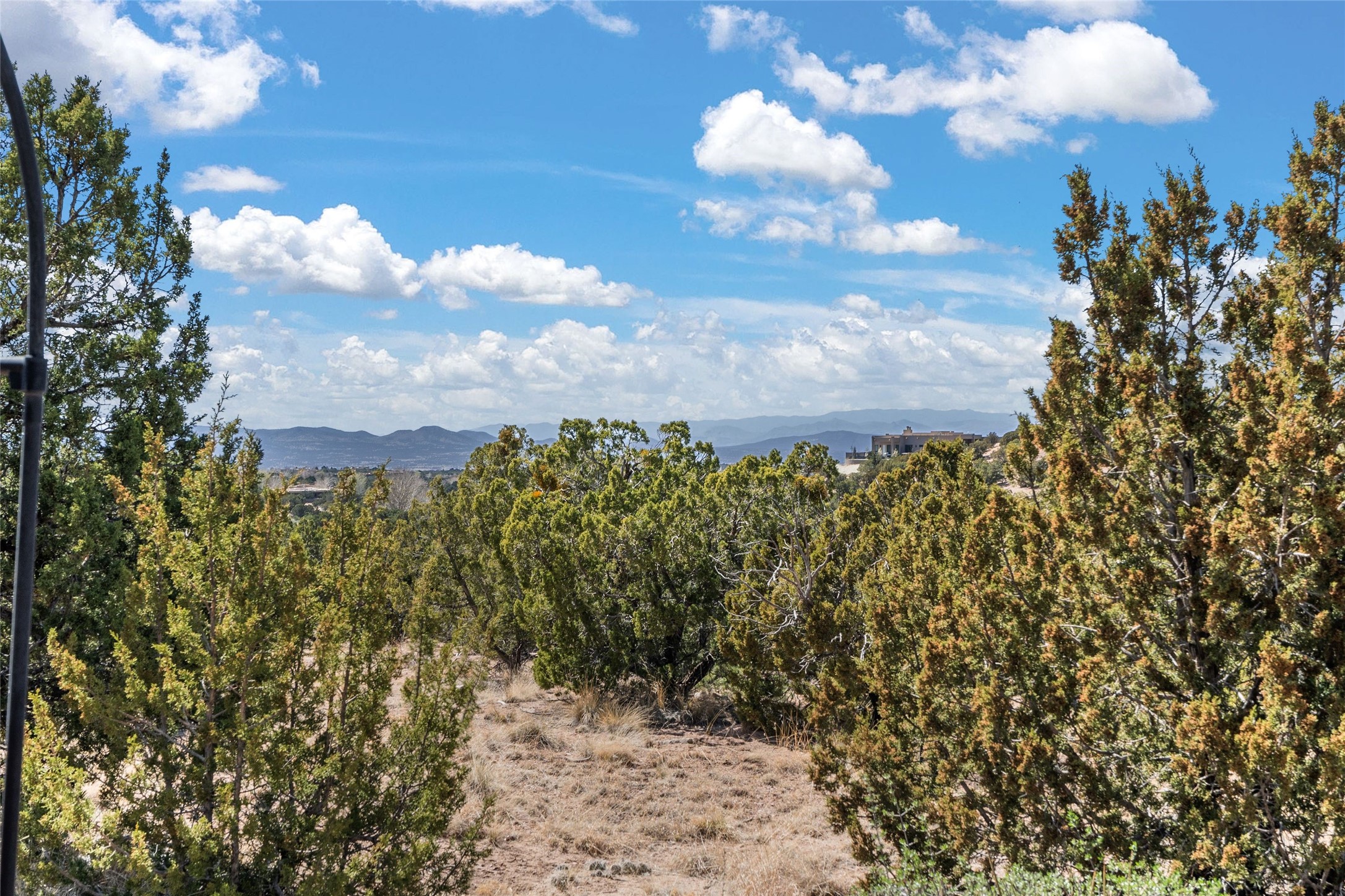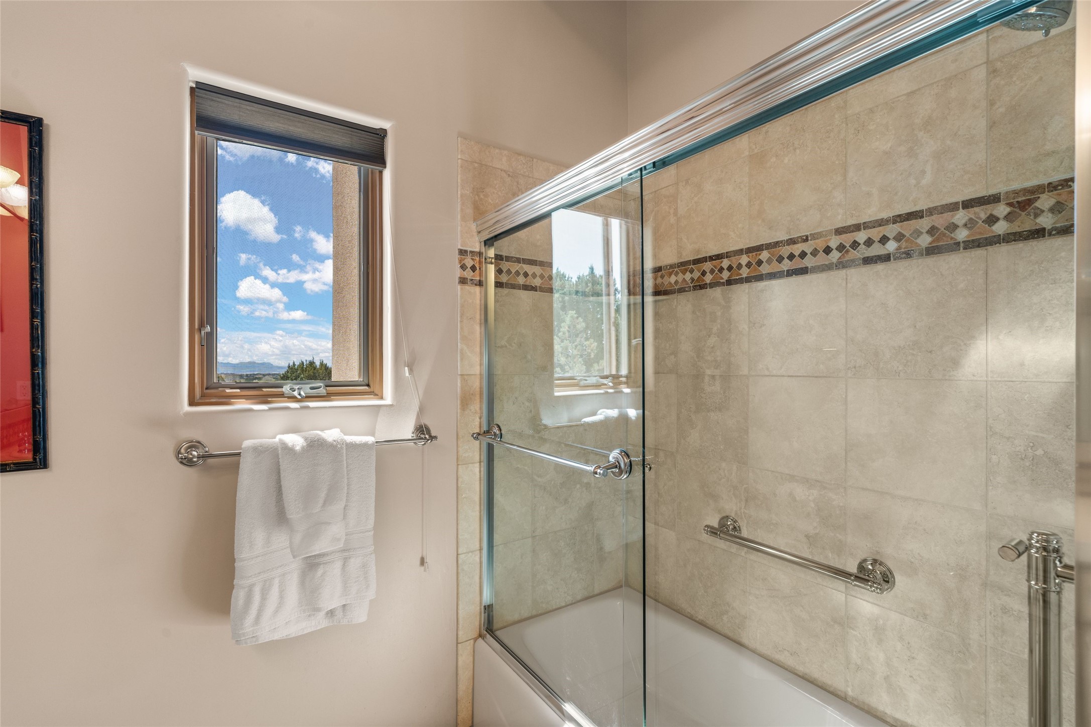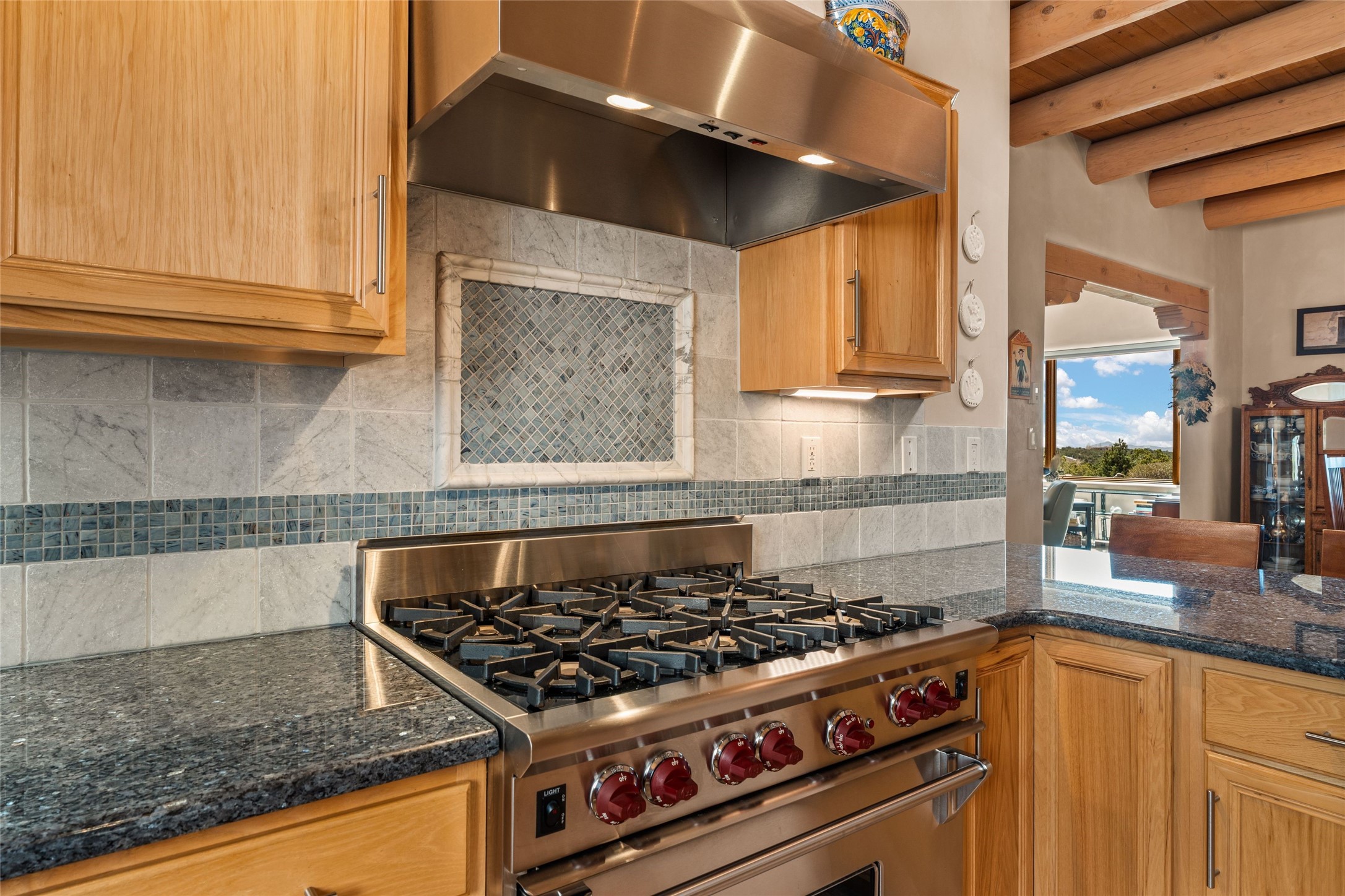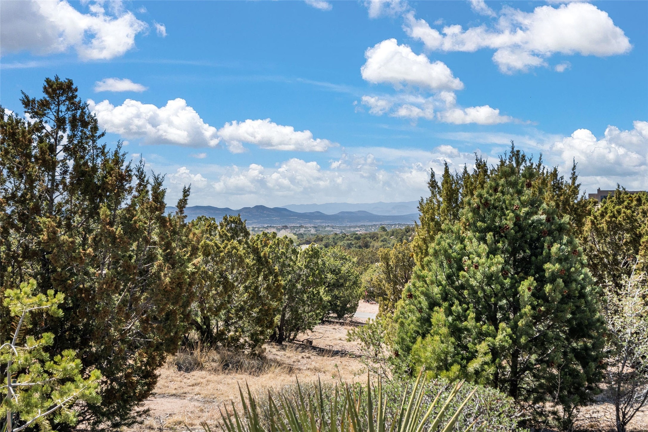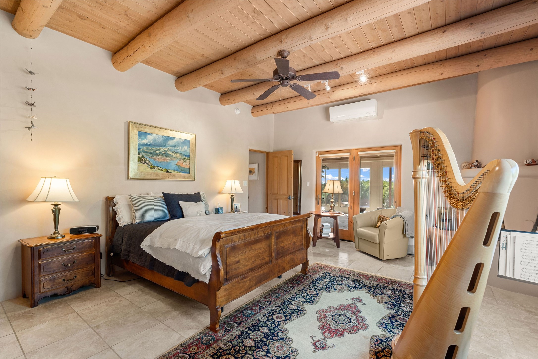 This stunning single-level home features four spacious bedrooms and two and a half baths, all designed without any interior steps for seamless accessibility. The home showcases elegant plastered walls and traditional vigas throughout, creating a warm and inviting atmosphere perfect for entertaining. A gated entry leads you to a welcoming courtyard, while the enclosed sunroom, complete with a wood-burning fireplace, offers a perfect space for relaxation. The gourmet kitchen is a chef's dream, featuring a center island, breakfast bar, Wolf range, and Miele dishwasher, all set on luxurious travertine floors that flow effortlessly throughout the home. The primary suite not only includes a deep jacuzzi tub and fireplace but also grants access to the sunroom, enhancing the living experience. Guests will appreciate the custom Murphy bed in one of the bedrooms, which can easily transform into an office or studio space as needed. Custom Santa Fe awning covers for the skylights modulate climate control during summer months. Enjoy breathtaking sunsets and picturesque views of the Jemez Mountains right from your backyard. Outdoor enthusiasts will appreciate the proximity to La Tierra's extensive walking and hiking trail systems, making it easy to explore the natural beauty of the area. Additionally, this prime location is just a quick drive away from the vibrant downtown plaza, the renowned Canyon Road, and the Santa Fe Opera.