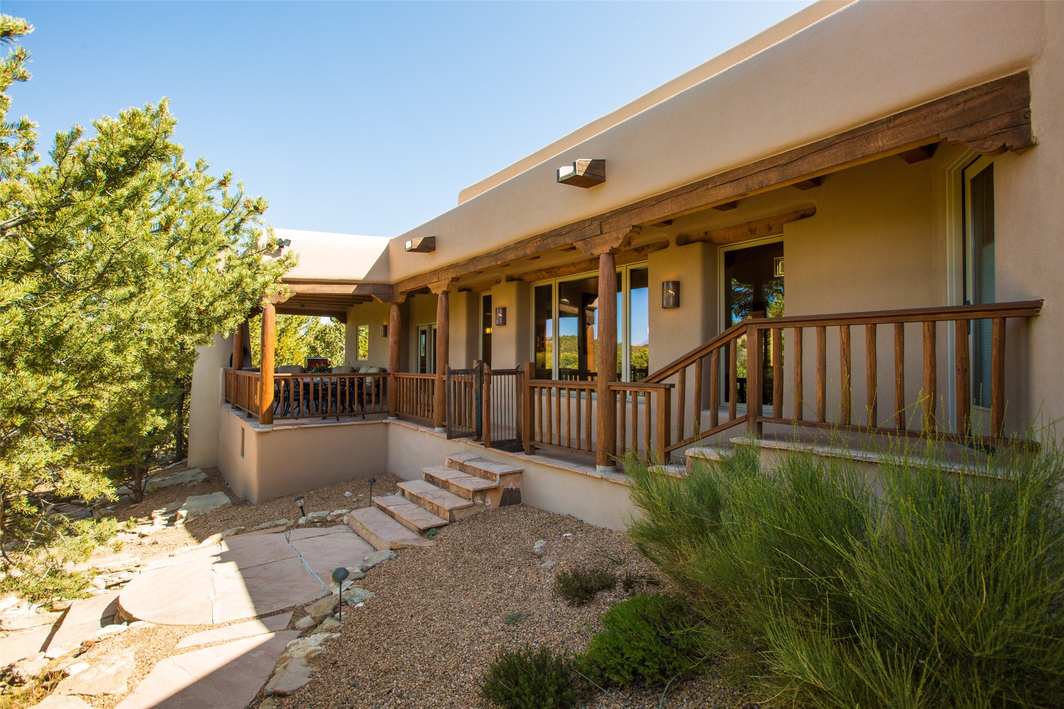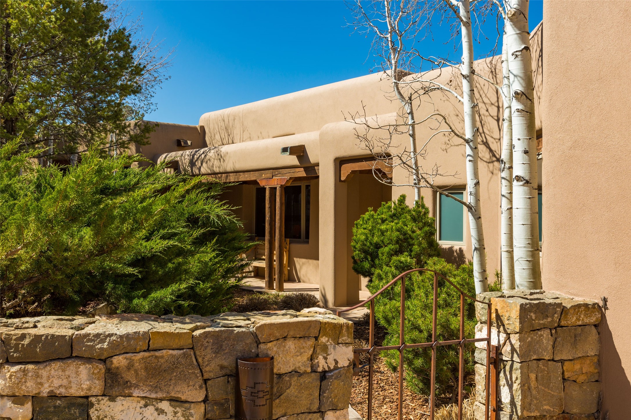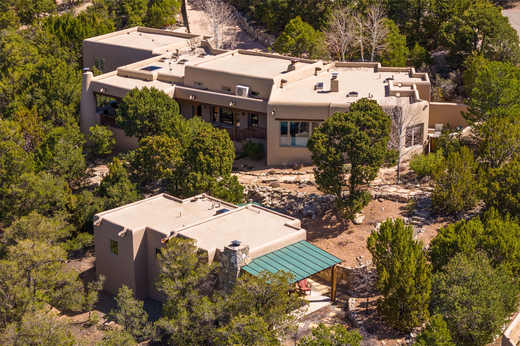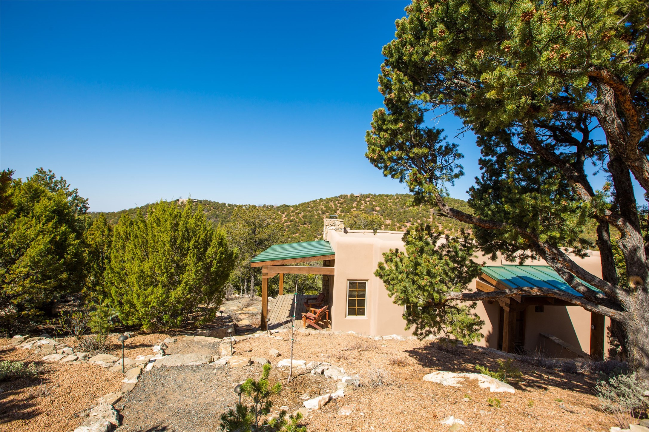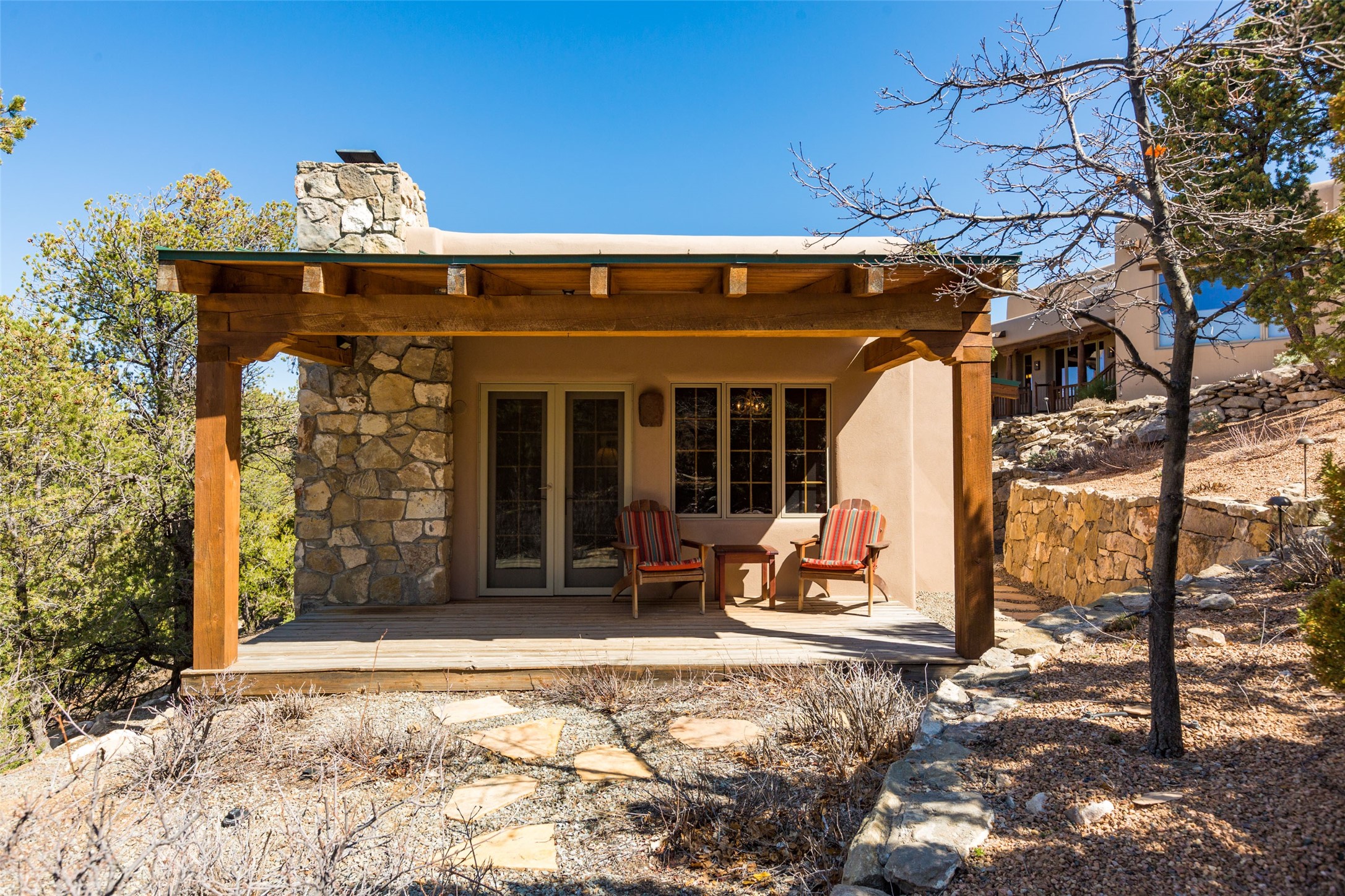 Exceptional Roger Hunter custom home with separate guest house nestled on an elevated, peaceful and picturesque .82-acre lot just five minutes from downtown Santa Fe. Located in the premier Los Cerros Colorados community, both homes are perfectly sited to provide privacy along with stunning mountain, sunset and city light views. The meticulously maintained three bedroom, four bath main house has a total of only five, low, wide, user-friendly steps designed to ensure easy, seamless movement throughout the space, leading from the open concept living area to the bedrooms and the private courtyard off of the primary suite. Just a few of the features include soaring ceilings, massive vigas, beautiful hardwood floors, custom cabinetry and doors, gorgeous plaster walls, radiant heat, ductless a/c, security system, oversized two car garage with lots of storage, and large windows and skylights to capture the light and views. The enchanting one-bedroom guest house is truly special! This property is just steps away from the extensive Dale Ball Trail system with over 20 miles of hiking, biking, running, cross country skiing and snowshoeing trails, along with its close proximity to the Santa Fe National Forest and Santa Fe Ski Basin, this property offers endless recreational opportunities! Extensive stonework throughout the property, mature landscaping, in addition to its fabulous portal with built-in grill and kiva fireplace, provide a serene, mountain retreat perfect for entertaining! All underground city and public utilities, 15 yr. transferable roof warranty and 7 yr. stucco warranty. Furnishings package available. Guest house sleeps 4.