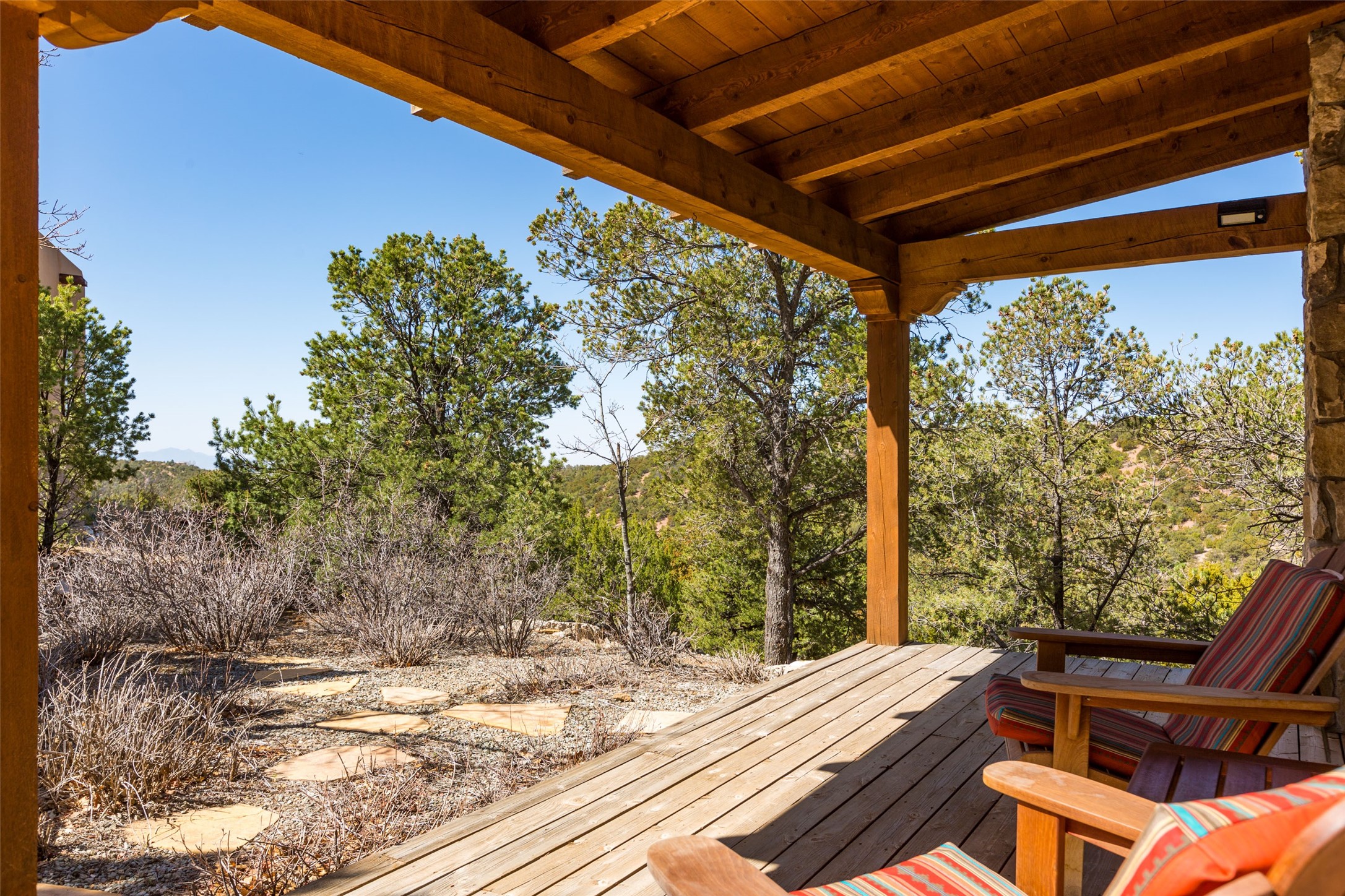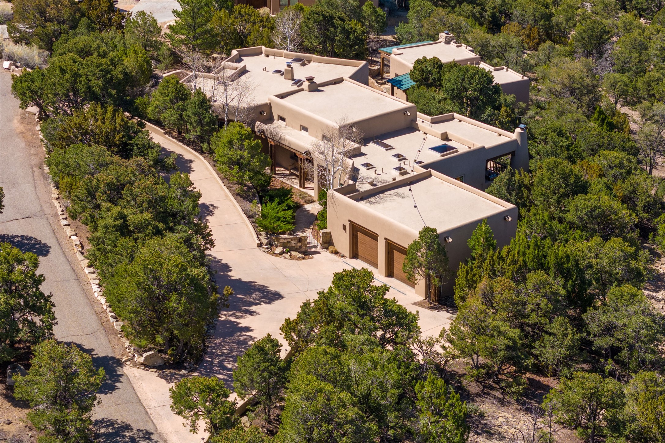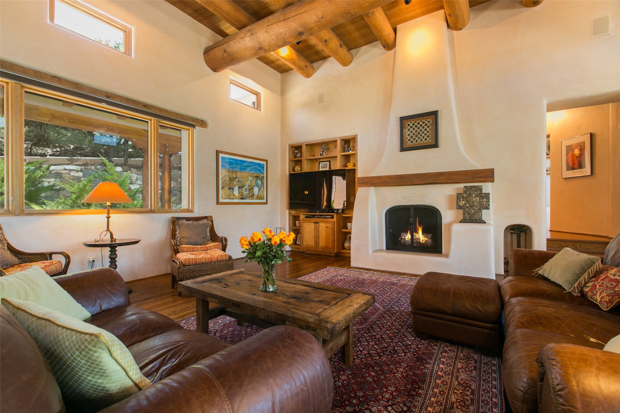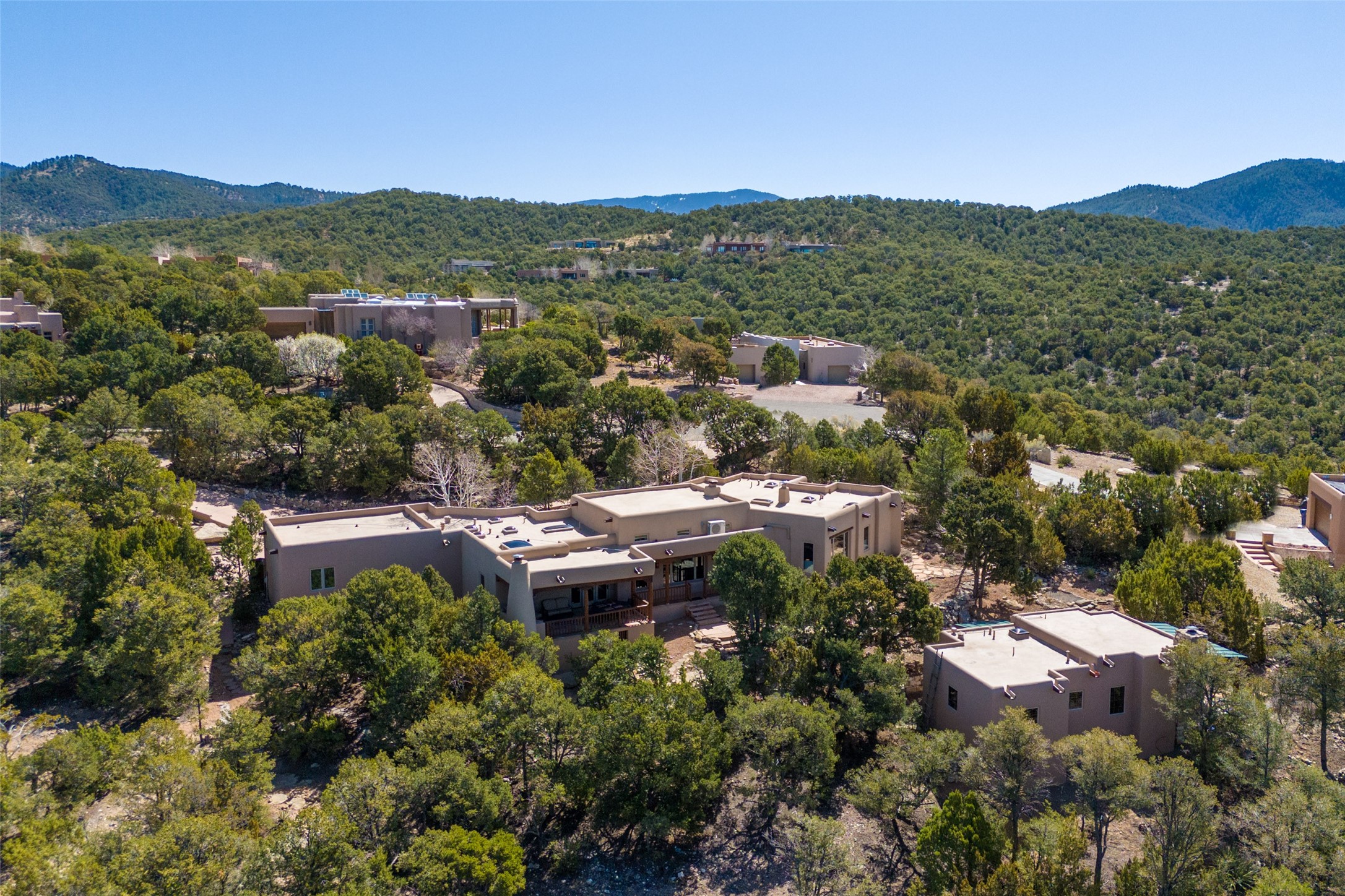 Exceptional Roger Hunter custom home with separate guest house nestled on an elevated, peaceful and picturesque .82-acre lot just five minutes from downtown Santa Fe. Located in the premier Los Cerros Colorados community, both homes are perfectly sited to provide privacy along with stunning mountain, sunset and city light views. The meticulously maintained three bedroom, four bath main house has a total of only five, low, wide, user-friendly steps designed to ensure easy, seamless movement throughout the space, leading from the open concept living area to the bedrooms and the private courtyard off of the primary suite. Just a few of the features include soaring ceilings, massive vigas, beautiful hardwood floors, custom cabinetry and doors, gorgeous plaster walls, radiant heat, ductless a/c, security system, oversized two car garage with lots of storage, and large windows and skylights to capture the light and views. The enchanting one-bedroom guest house is truly special! This property is just steps away from the extensive Dale Ball Trail system with over 20 miles of hiking, biking, running, cross country skiing and snowshoeing trails, along with its close proximity to the Santa Fe National Forest and Santa Fe Ski Basin, this property offers endless recreational opportunities! Extensive stonework throughout the property, mature landscaping, in addition to its fabulous portal with built-in grill and kiva fireplace, provide a serene, mountain retreat perfect for entertaining! All underground city and public utilities, 15 yr. transferable roof warranty and 7 yr. stucco warranty. Furnishings package available. Guest house sleeps 4.