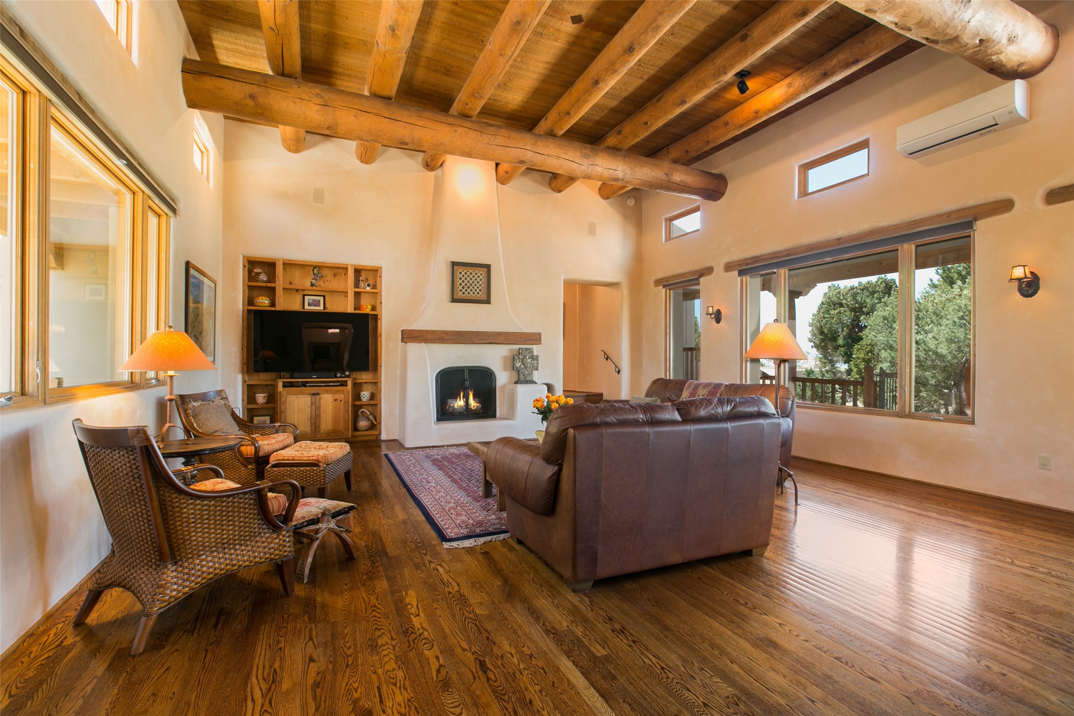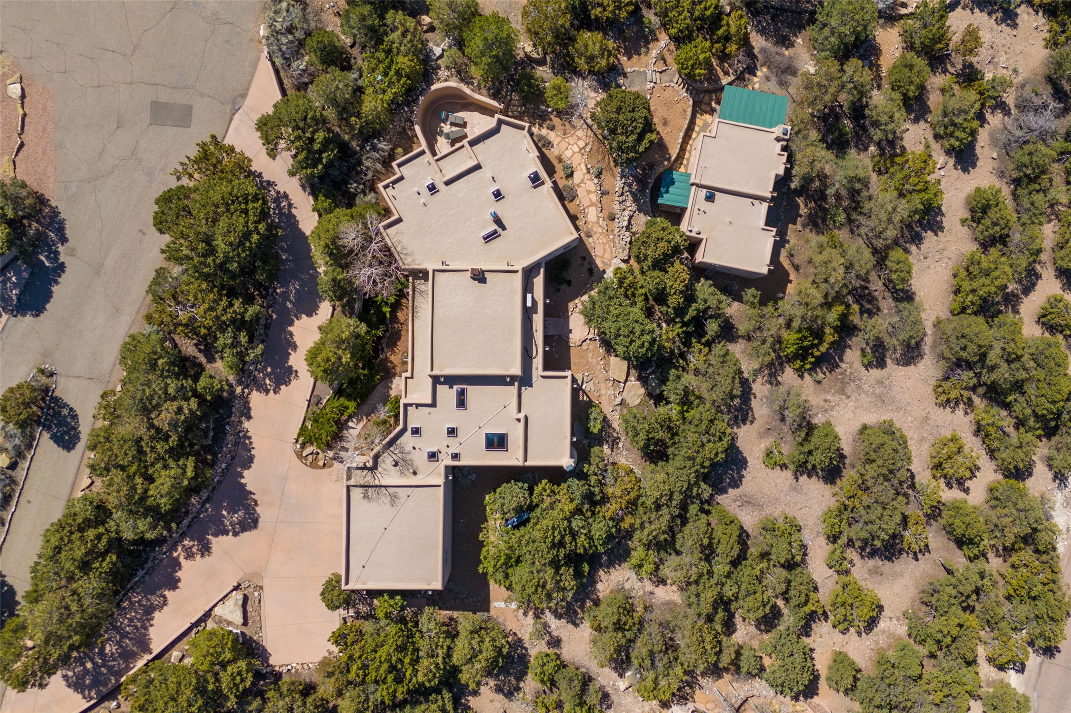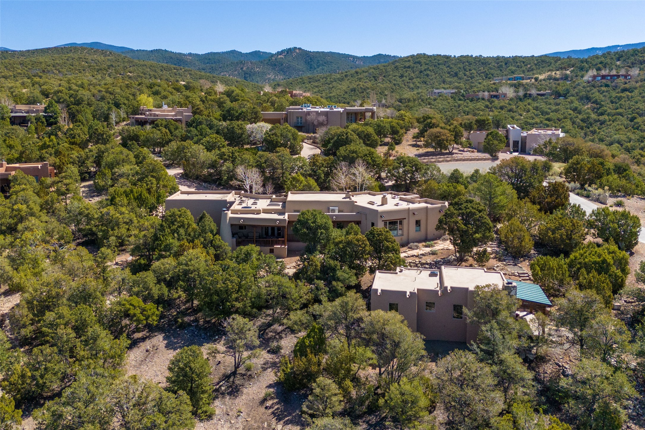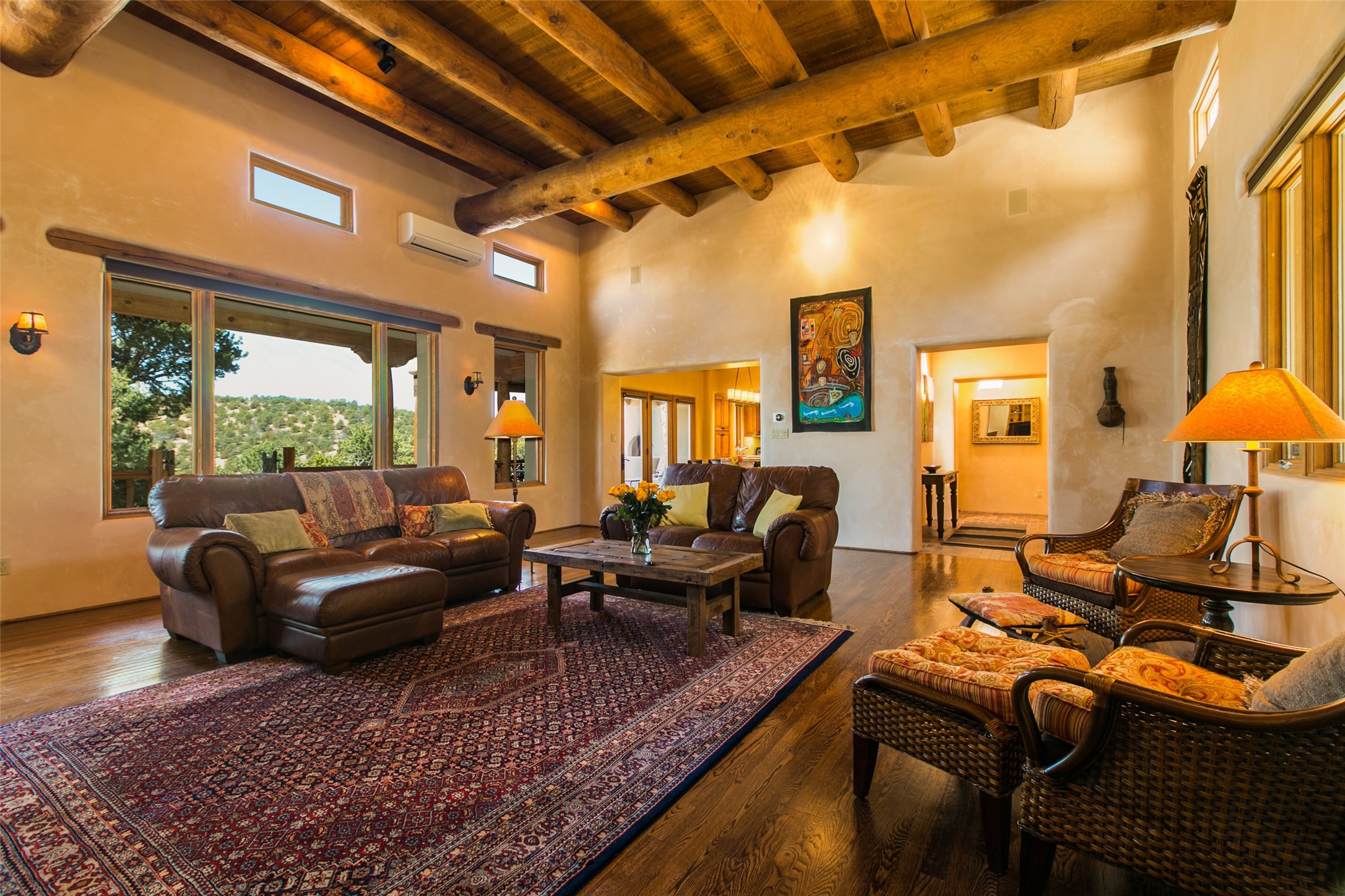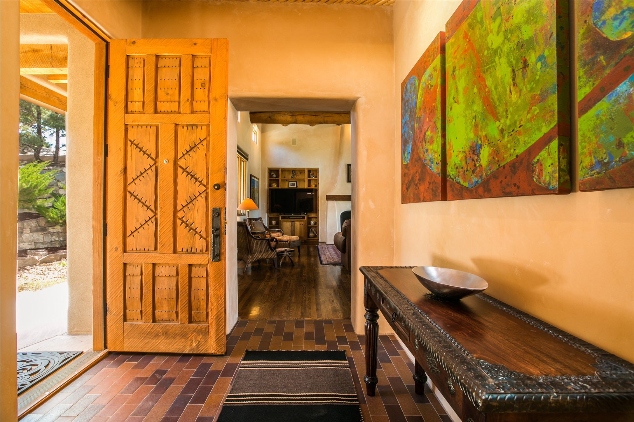 Exceptional Roger Hunter custom home with separate guest house nestled on an elevated, peaceful and picturesque .82-acre lot just five minutes from downtown Santa Fe. Located in the premier Los Cerros Colorados community, both homes are perfectly sited to provide privacy along with stunning mountain, sunset and city light views. The meticulously maintained three bedroom, four bath main house has a total of only five, low, wide, user-friendly steps designed to ensure easy, seamless movement throughout the space, leading from the open concept living area to the bedrooms and the private courtyard off of the primary suite. Just a few of the features include soaring ceilings, massive vigas, beautiful hardwood floors, custom cabinetry and doors, gorgeous plaster walls, radiant heat, ductless a/c, security system, oversized two car garage with lots of storage, and large windows and skylights to capture the light and views. The enchanting one-bedroom guest house is truly special! This property is just steps away from the extensive Dale Ball Trail system with over 20 miles of hiking, biking, running, cross country skiing and snowshoeing trails, along with its close proximity to the Santa Fe National Forest and Santa Fe Ski Basin, this property offers endless recreational opportunities! Extensive stonework throughout the property, mature landscaping, in addition to its fabulous portal with built-in grill and kiva fireplace, provide a serene, mountain retreat perfect for entertaining! All underground city and public utilities, 15 yr. transferable roof warranty and 7 yr. stucco warranty. Furnishings package available. Guest house sleeps 4.