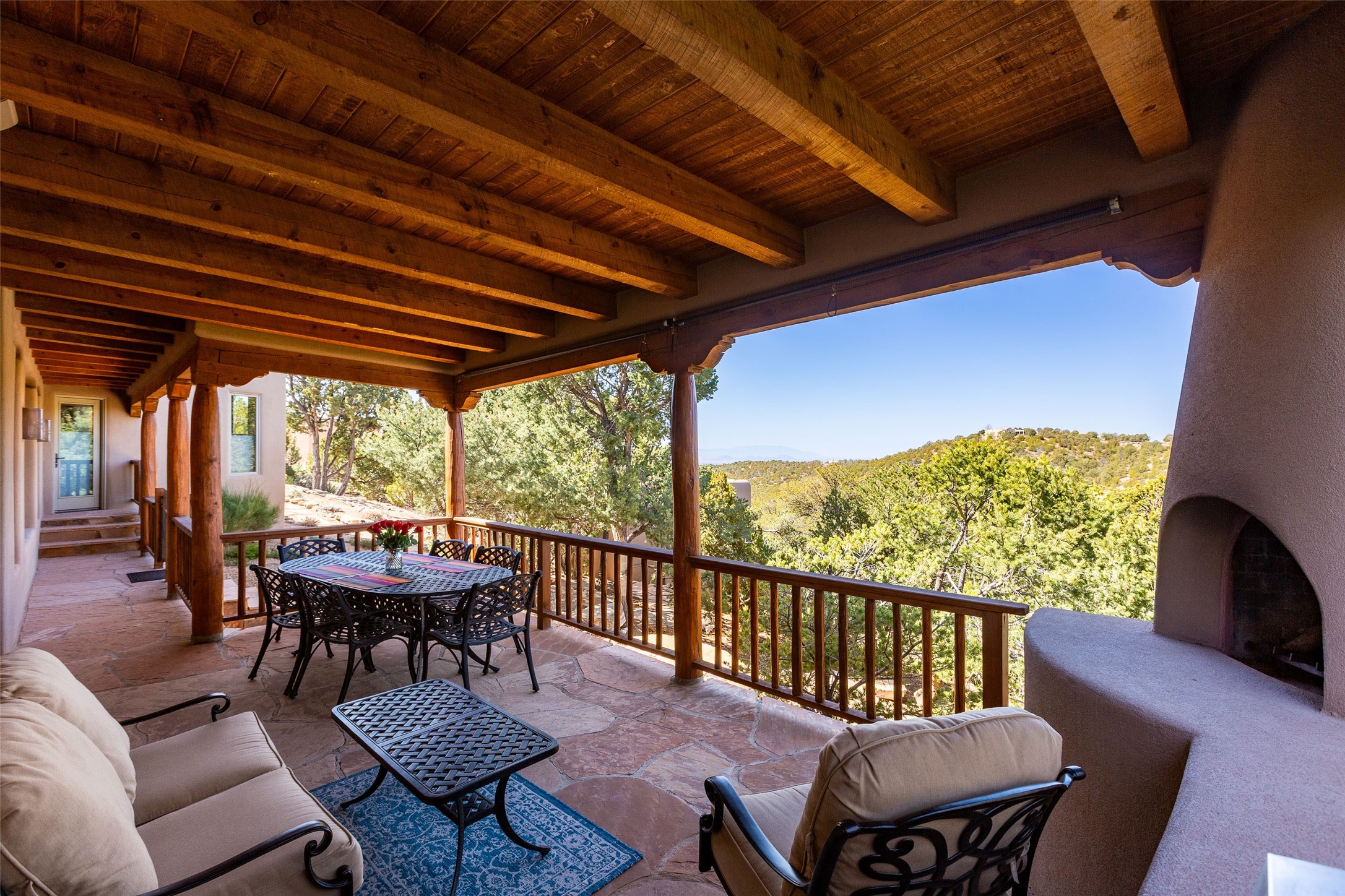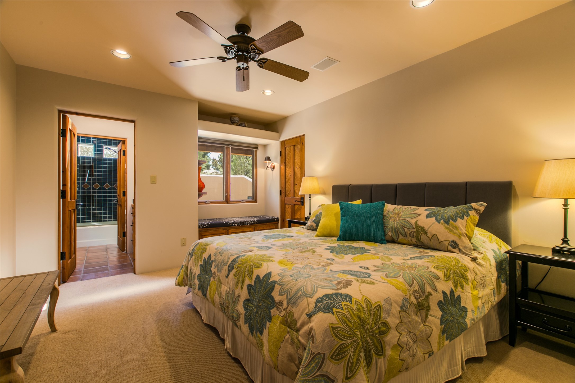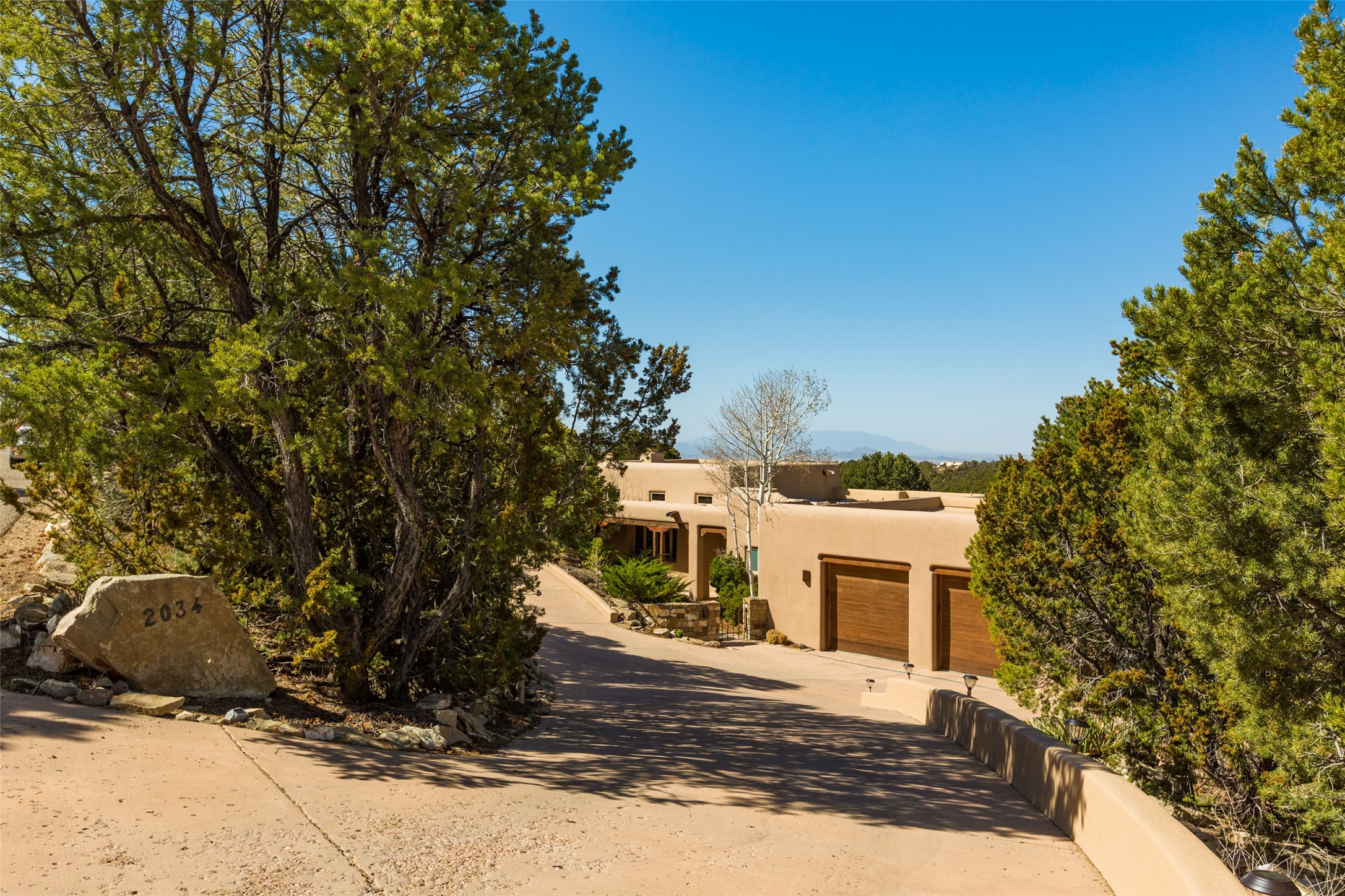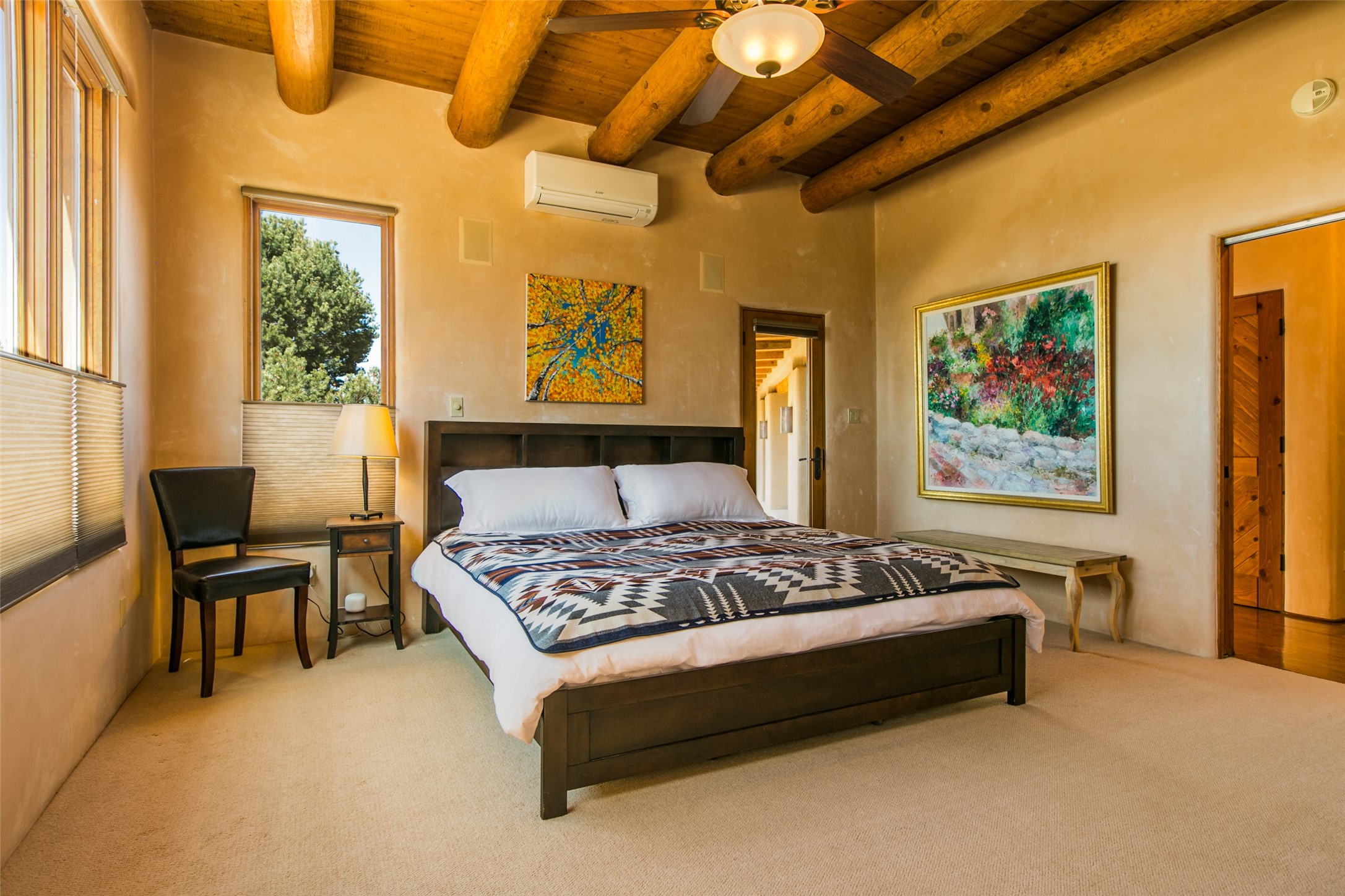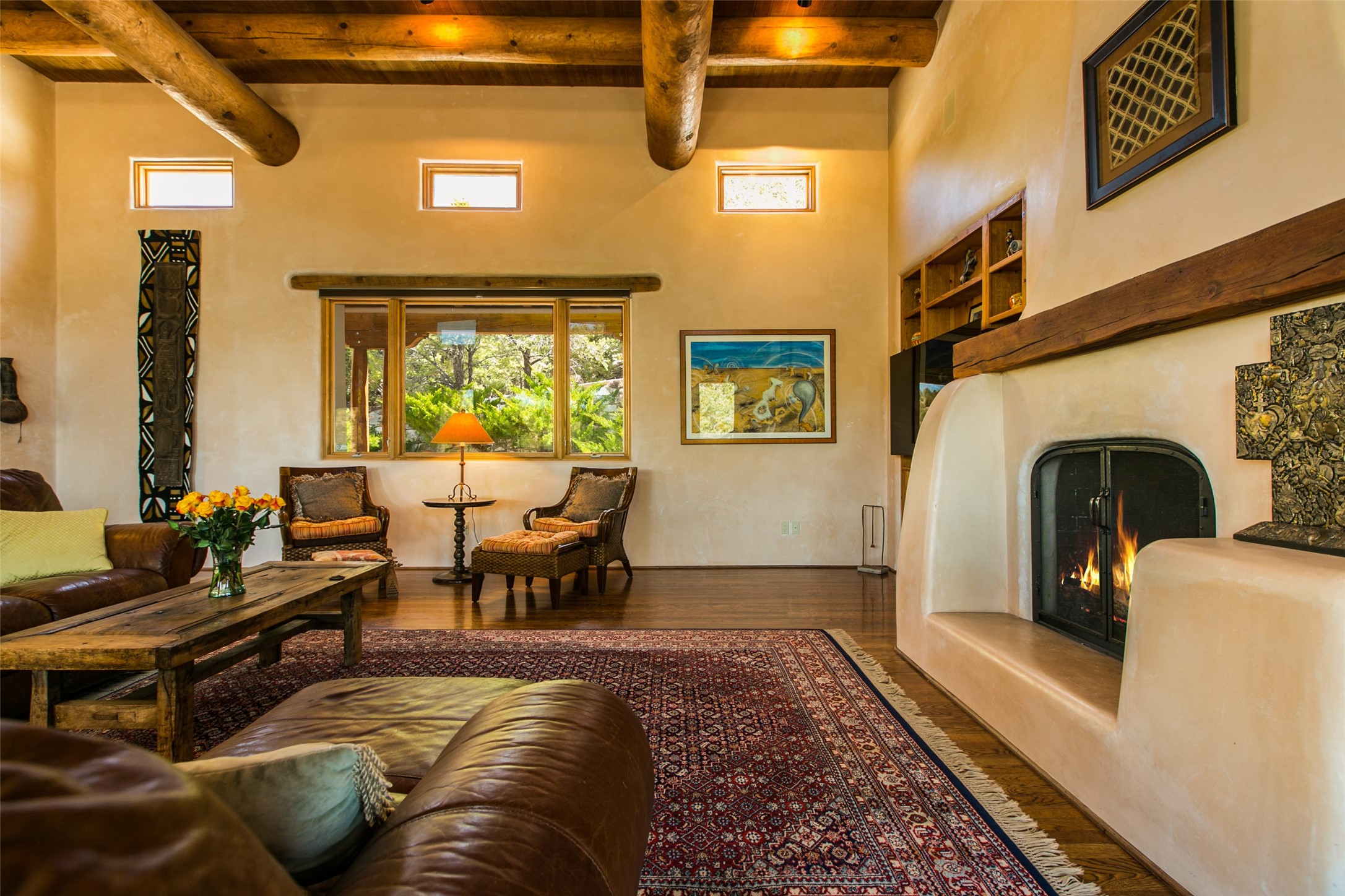 Exceptional Roger Hunter custom home with separate guest house nestled on an elevated, peaceful and picturesque .82-acre lot just five minutes from downtown Santa Fe. Located in the premier Los Cerros Colorados community, both homes are perfectly sited to provide privacy along with stunning mountain, sunset and city light views. The meticulously maintained three bedroom, four bath main house has a total of only five, low, wide, user-friendly steps designed to ensure easy, seamless movement throughout the space, leading from the open concept living area to the bedrooms and the private courtyard off of the primary suite. Just a few of the features include soaring ceilings, massive vigas, beautiful hardwood floors, custom cabinetry and doors, gorgeous plaster walls, radiant heat, ductless a/c, security system, oversized two car garage with lots of storage, and large windows and skylights to capture the light and views. The enchanting one-bedroom guest house is truly special! This property is just steps away from the extensive Dale Ball Trail system with over 20 miles of hiking, biking, running, cross country skiing and snowshoeing trails, along with its close proximity to the Santa Fe National Forest and Santa Fe Ski Basin, this property offers endless recreational opportunities! Extensive stonework throughout the property, mature landscaping, in addition to its fabulous portal with built-in grill and kiva fireplace, provide a serene, mountain retreat perfect for entertaining! All underground city and public utilities, 15 yr. transferable roof warranty and 7 yr. stucco warranty. Furnishings package available. Guest house sleeps 4.