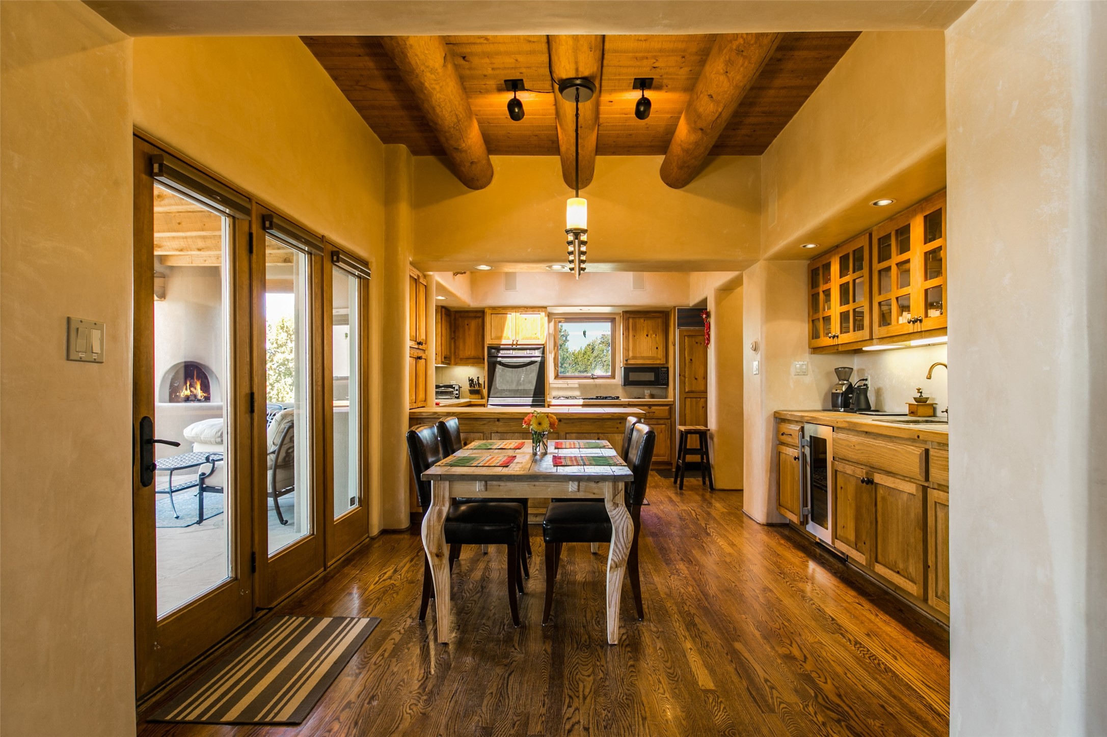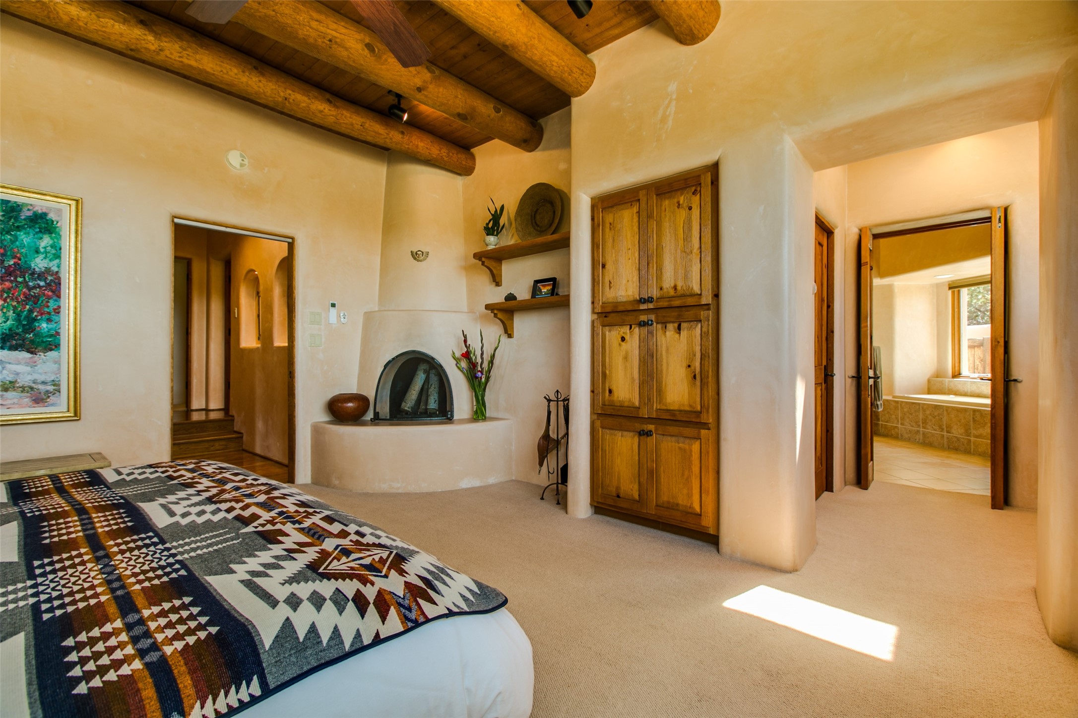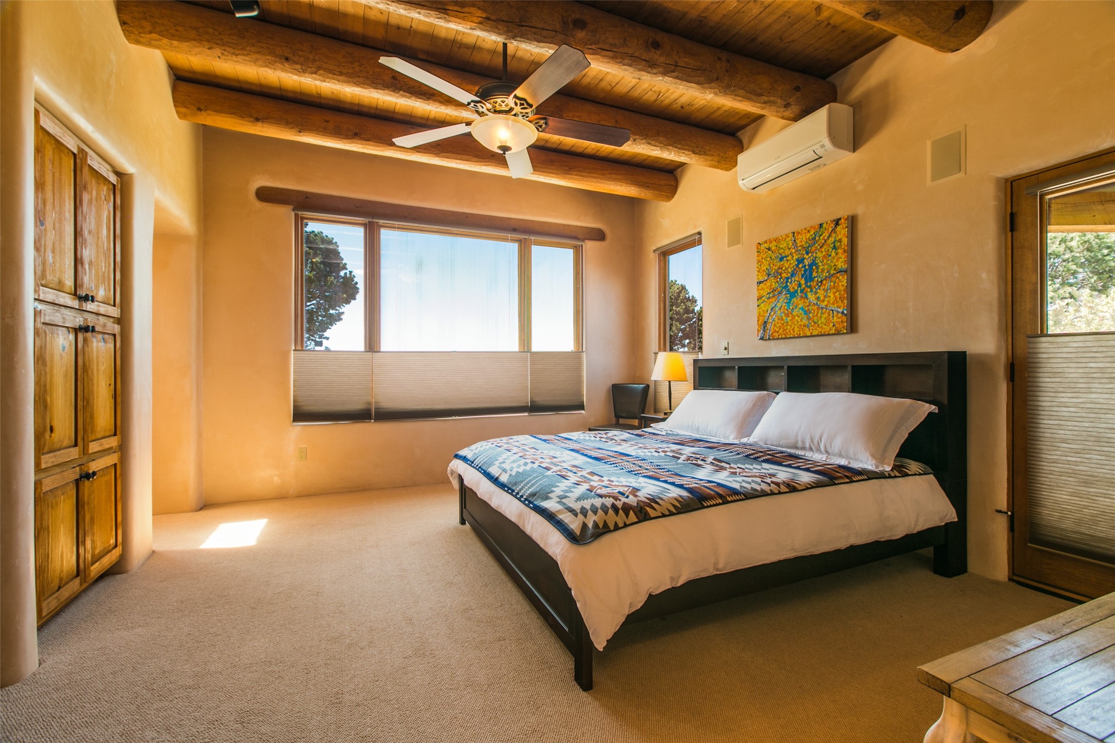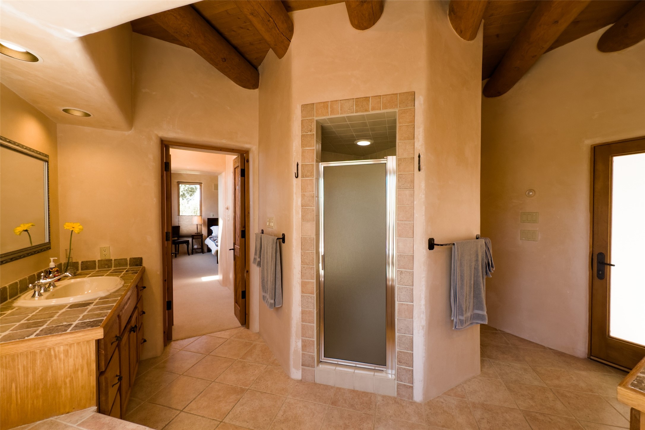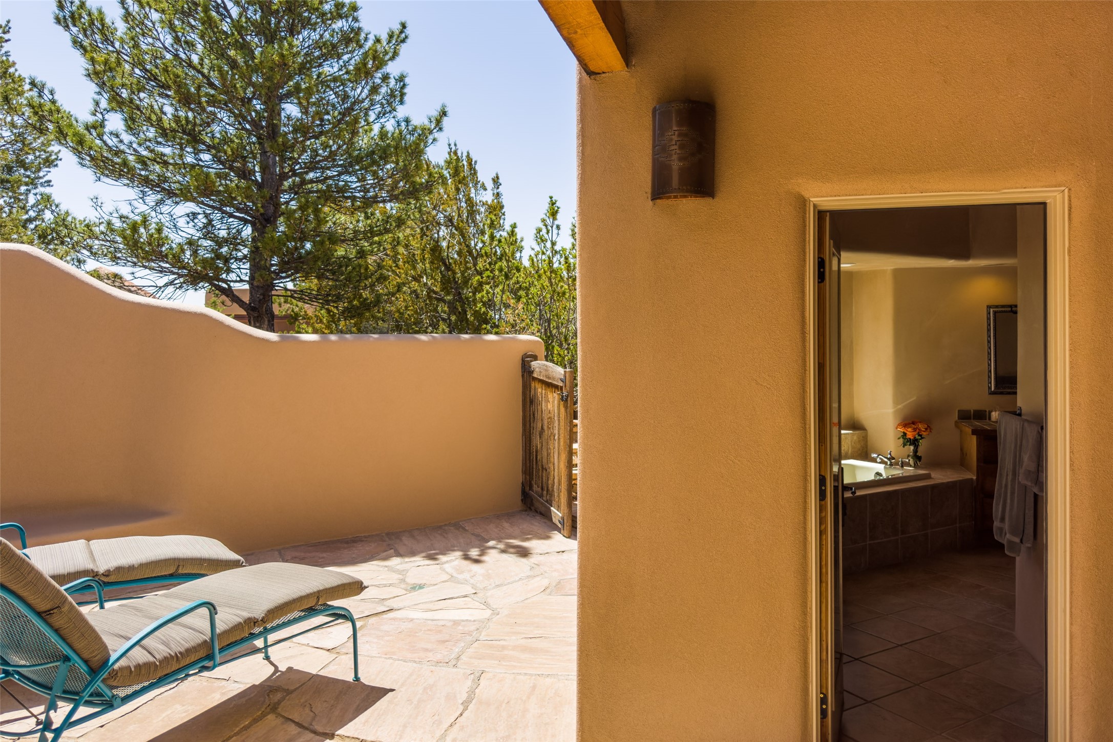 Exceptional Roger Hunter custom home with separate guest house nestled on an elevated, peaceful and picturesque .82-acre lot just five minutes from downtown Santa Fe. Located in the premier Los Cerros Colorados community, both homes are perfectly sited to provide privacy along with stunning mountain, sunset and city light views. The meticulously maintained three bedroom, four bath main house has a total of only five, low, wide, user-friendly steps designed to ensure easy, seamless movement throughout the space, leading from the open concept living area to the bedrooms and the private courtyard off of the primary suite. Just a few of the features include soaring ceilings, massive vigas, beautiful hardwood floors, custom cabinetry and doors, gorgeous plaster walls, radiant heat, ductless a/c, security system, oversized two car garage with lots of storage, and large windows and skylights to capture the light and views. The enchanting one-bedroom guest house is truly special! This property is just steps away from the extensive Dale Ball Trail system with over 20 miles of hiking, biking, running, cross country skiing and snowshoeing trails, along with its close proximity to the Santa Fe National Forest and Santa Fe Ski Basin, this property offers endless recreational opportunities! Extensive stonework throughout the property, mature landscaping, in addition to its fabulous portal with built-in grill and kiva fireplace, provide a serene, mountain retreat perfect for entertaining! All underground city and public utilities, 15 yr. transferable roof warranty and 7 yr. stucco warranty. Furnishings package available. Guest house sleeps 4.