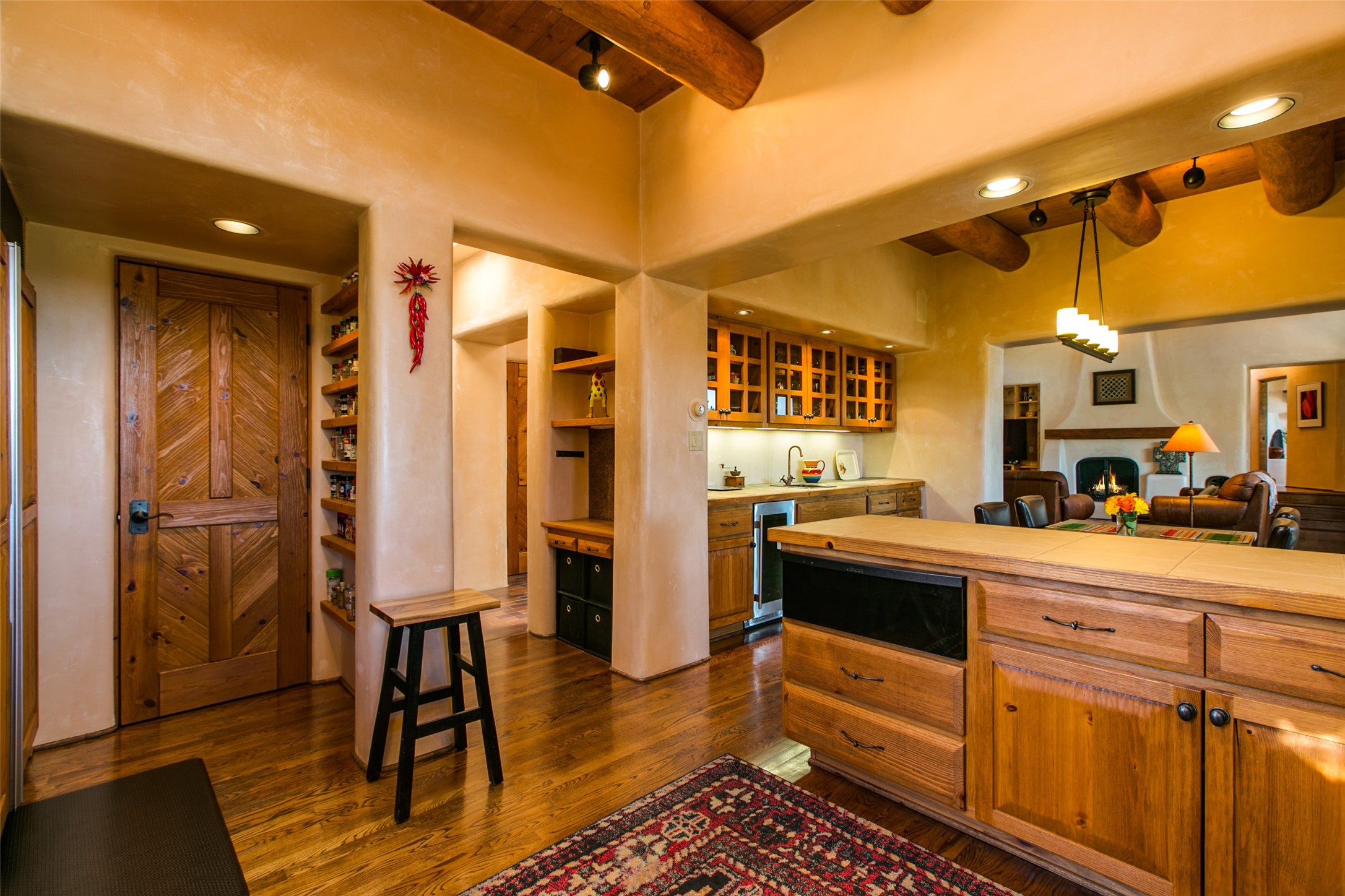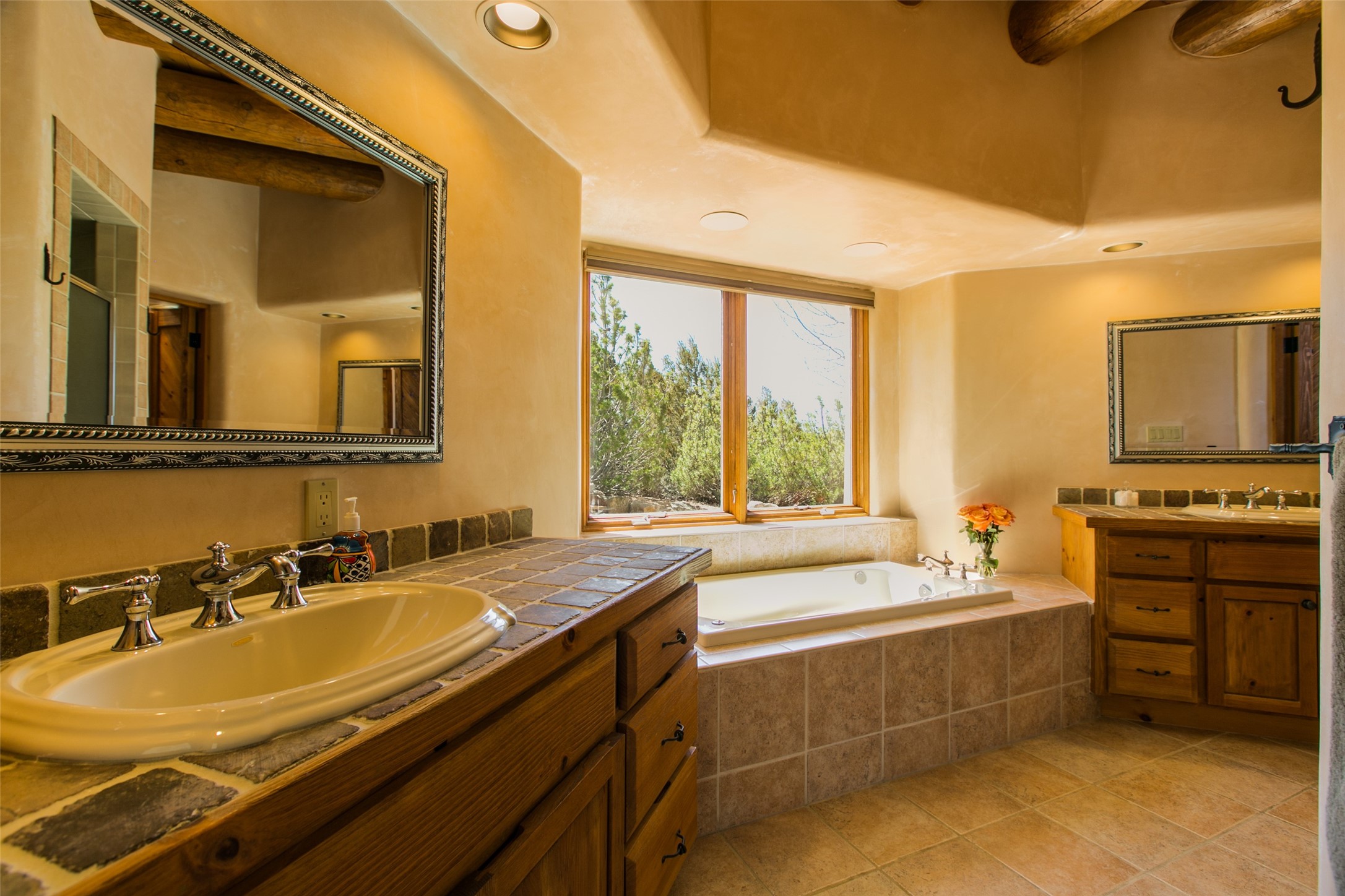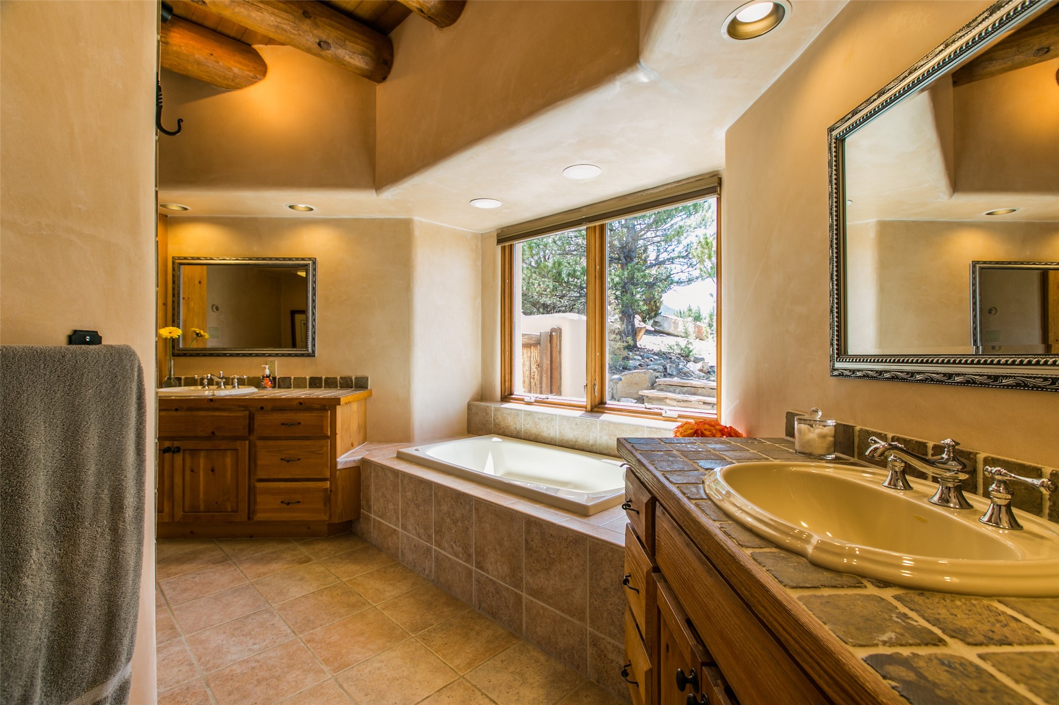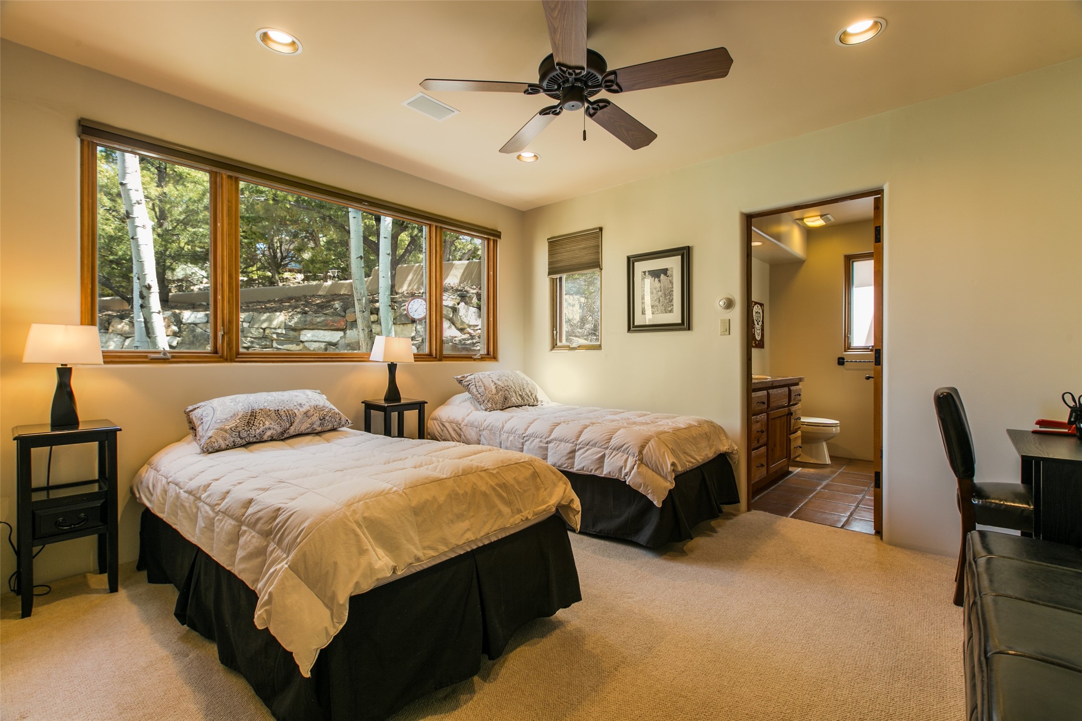 Exceptional Roger Hunter custom home with separate guest house nestled on an elevated, peaceful and picturesque .82-acre lot just five minutes from downtown Santa Fe. Located in the premier Los Cerros Colorados community, both homes are perfectly sited to provide privacy along with stunning mountain, sunset and city light views. The meticulously maintained three bedroom, four bath main house has a total of only five, low, wide, user-friendly steps designed to ensure easy, seamless movement throughout the space, leading from the open concept living area to the bedrooms and the private courtyard off of the primary suite. Just a few of the features include soaring ceilings, massive vigas, beautiful hardwood floors, custom cabinetry and doors, gorgeous plaster walls, radiant heat, ductless a/c, security system, oversized two car garage with lots of storage, and large windows and skylights to capture the light and views. The enchanting one-bedroom guest house is truly special! This property is just steps away from the extensive Dale Ball Trail system with over 20 miles of hiking, biking, running, cross country skiing and snowshoeing trails, along with its close proximity to the Santa Fe National Forest and Santa Fe Ski Basin, this property offers endless recreational opportunities! Extensive stonework throughout the property, mature landscaping, in addition to its fabulous portal with built-in grill and kiva fireplace, provide a serene, mountain retreat perfect for entertaining! All underground city and public utilities, 15 yr. transferable roof warranty and 7 yr. stucco warranty. Furnishings package available. Guest house sleeps 4.