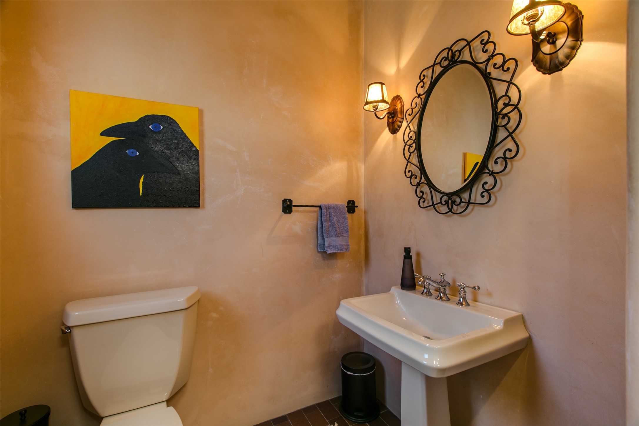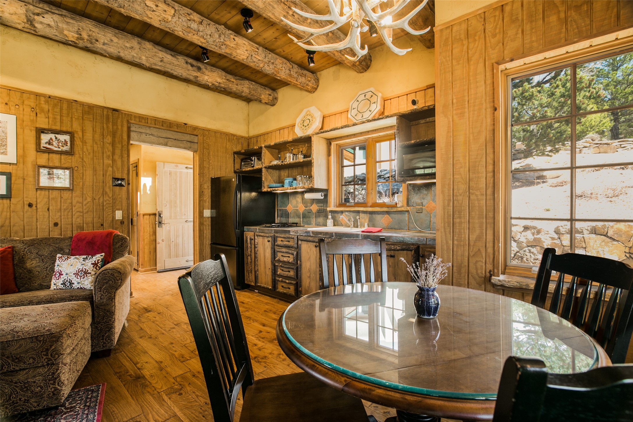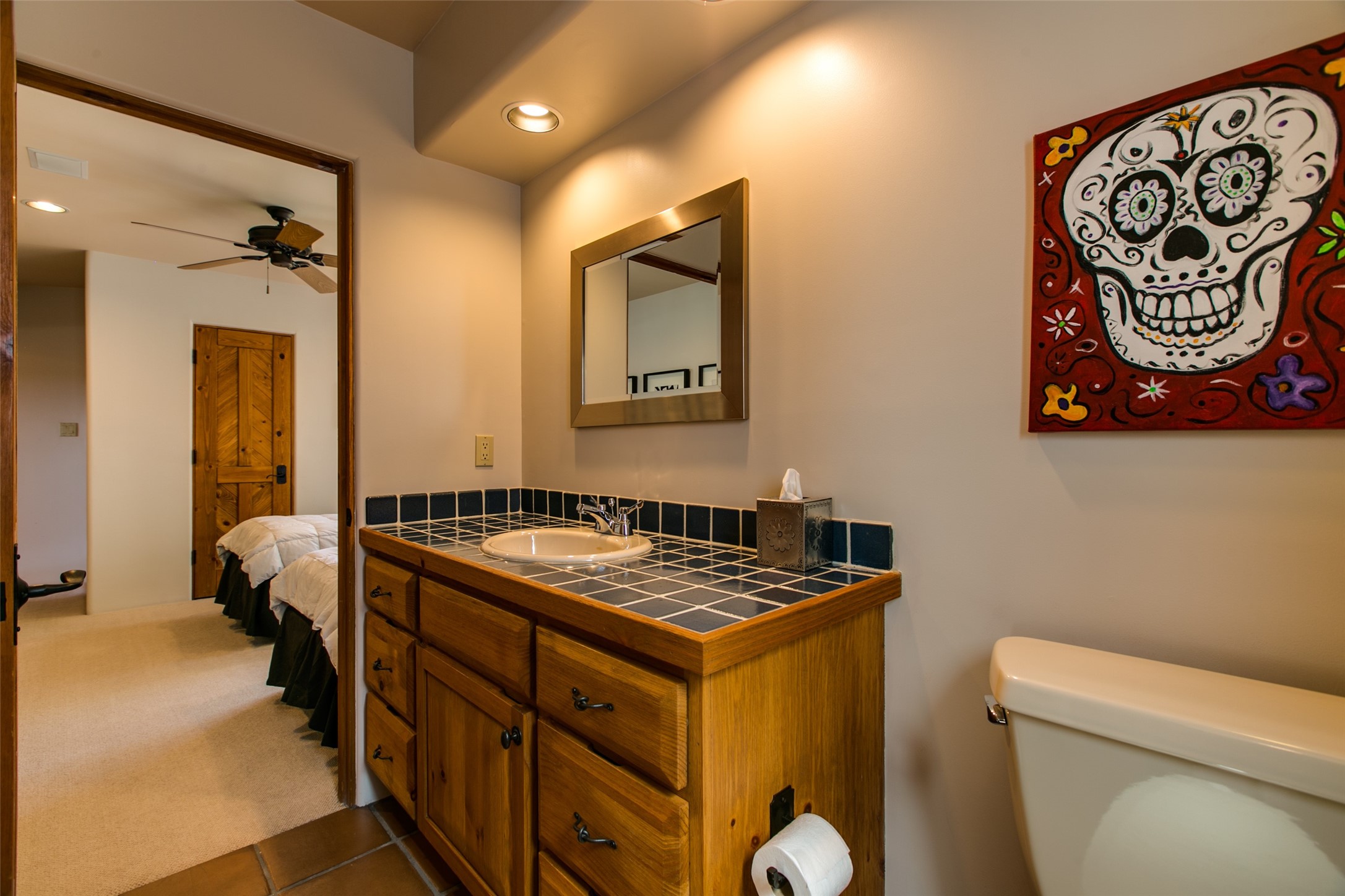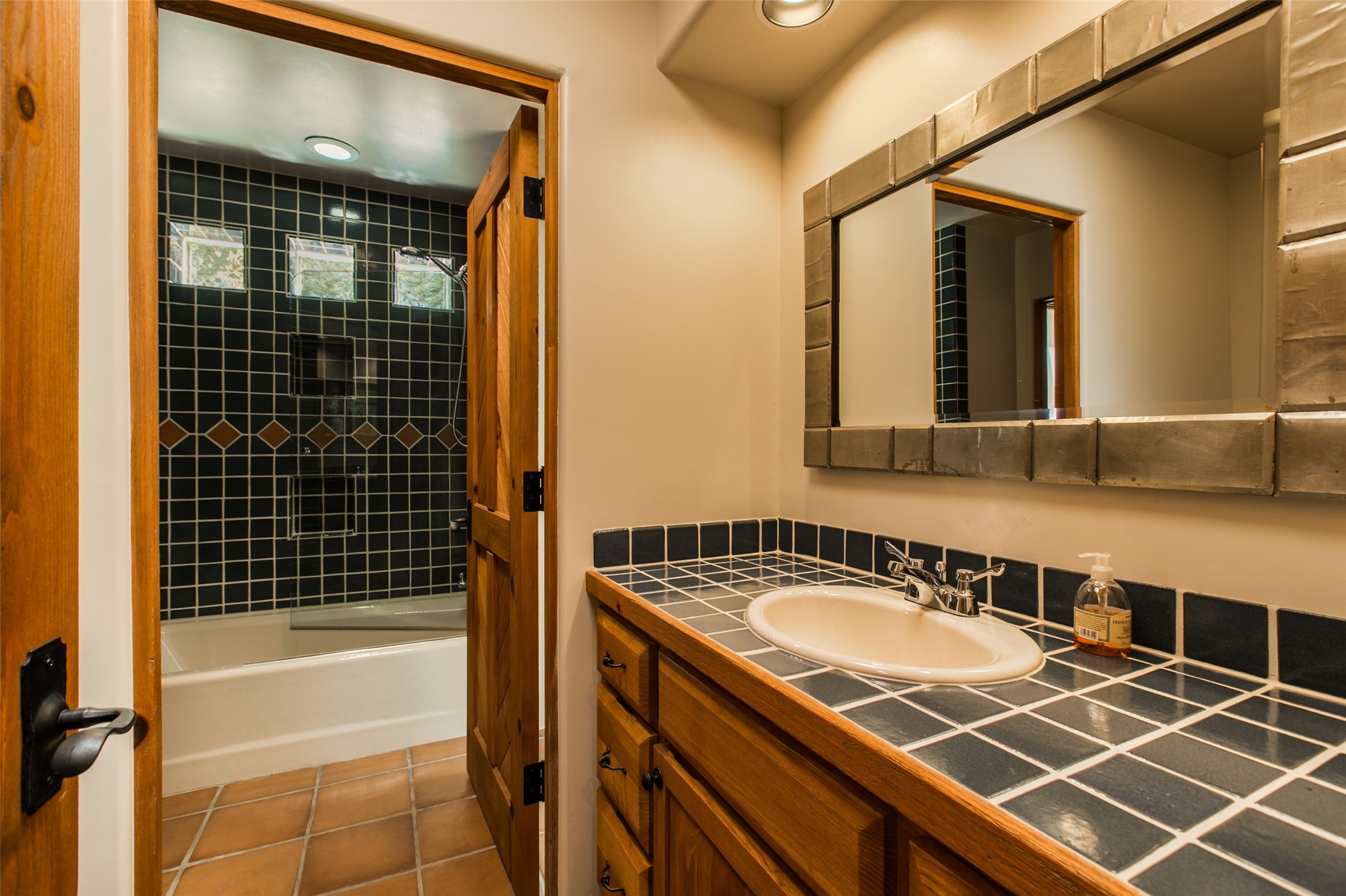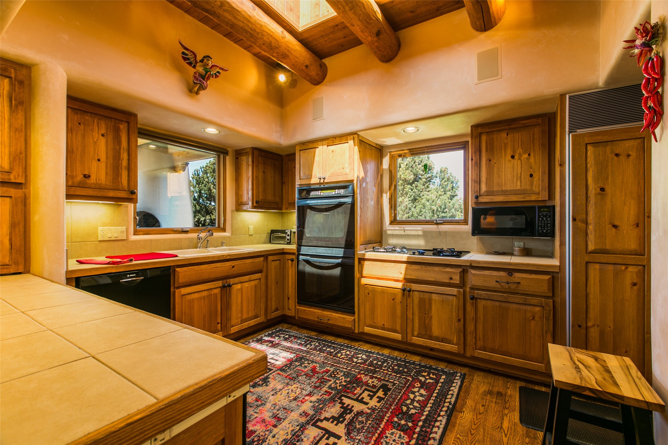Exceptional Roger Hunter custom home with separate guest house nestled on an elevated, peaceful and picturesque .82-acre lot just five minutes from downtown Santa Fe. Located in the premier Los Cerros Colorados community, both homes are perfectly sited to provide privacy along with stunning mountain, sunset and city light views. The meticulously maintained three bedroom, four bath main house has a total of only five, low, wide, user-friendly steps designed to ensure easy, seamless movement throughout the space, leading from the open concept living area to the bedrooms and the private courtyard off of the primary suite. Just a few of the features include soaring ceilings, massive vigas, beautiful hardwood floors, custom cabinetry and doors, gorgeous plaster walls, radiant heat, ductless a/c, security system, oversized two car garage with lots of storage, and large windows and skylights to capture the light and views. The enchanting one-bedroom guest house is truly special! This property is just steps away from the extensive Dale Ball Trail system with over 20 miles of hiking, biking, running, cross country skiing and snowshoeing trails, along with its close proximity to the Santa Fe National Forest and Santa Fe Ski Basin, this property offers endless recreational opportunities! Extensive stonework throughout the property, mature landscaping, in addition to its fabulous portal with built-in grill and kiva fireplace, provide a serene, mountain retreat perfect for entertaining! All underground city and public utilities, 15 yr. transferable roof warranty and 7 yr. stucco warranty. Furnishings package available. Guest house sleeps 4.