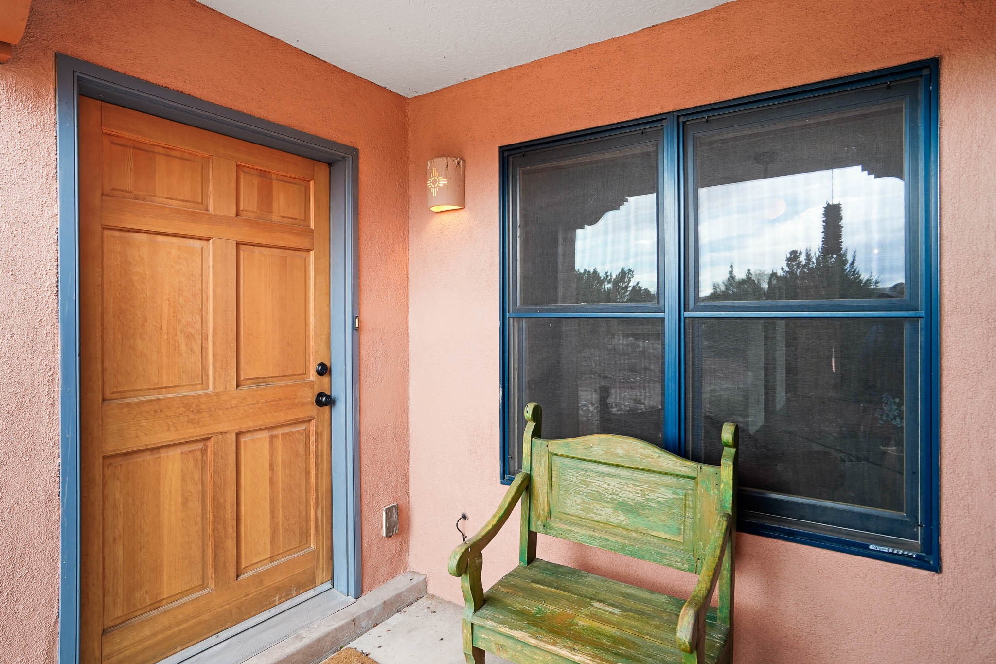 Perched near the top of Cochiti Lake, against the foothills of the Jemez Mountains, this two-story dwelling presents a fresh facade thanks to its recent exterior finish. The primary sleeping quarters reside on the entry level, offering ease of access. Inside, the lower level showcases sleek, modern surfaces underfoot. Gather around the warmth of the traditional hearth in the living space. The culinary area offers rich, cherry cabinetry complemented by gleaming stainless appliances. Experience comfortable warmth with the in-floor radiant heating system. Head upstairs to discover a versatile upper level with wood floors, perfect as a bedroom, creative workspace, or an additional private retreat. Step out onto the sheltered upper deck and be captivated by sweeping vistas encompassing the majestic Jemez range, the ancient landscape of Bandelier, and the iconic silhouette of St. Peter's Dome. A single-car garage provides sheltered parking. Enjoy the proximity to the recreational waters of Cochiti Lake, nearby links for the golf enthusiast, and trails system right out the front door. Call for your showing today!