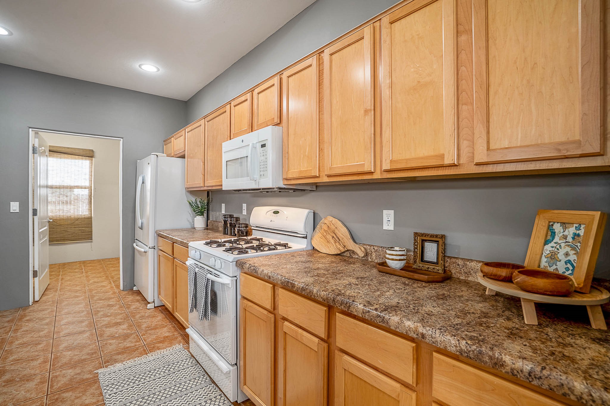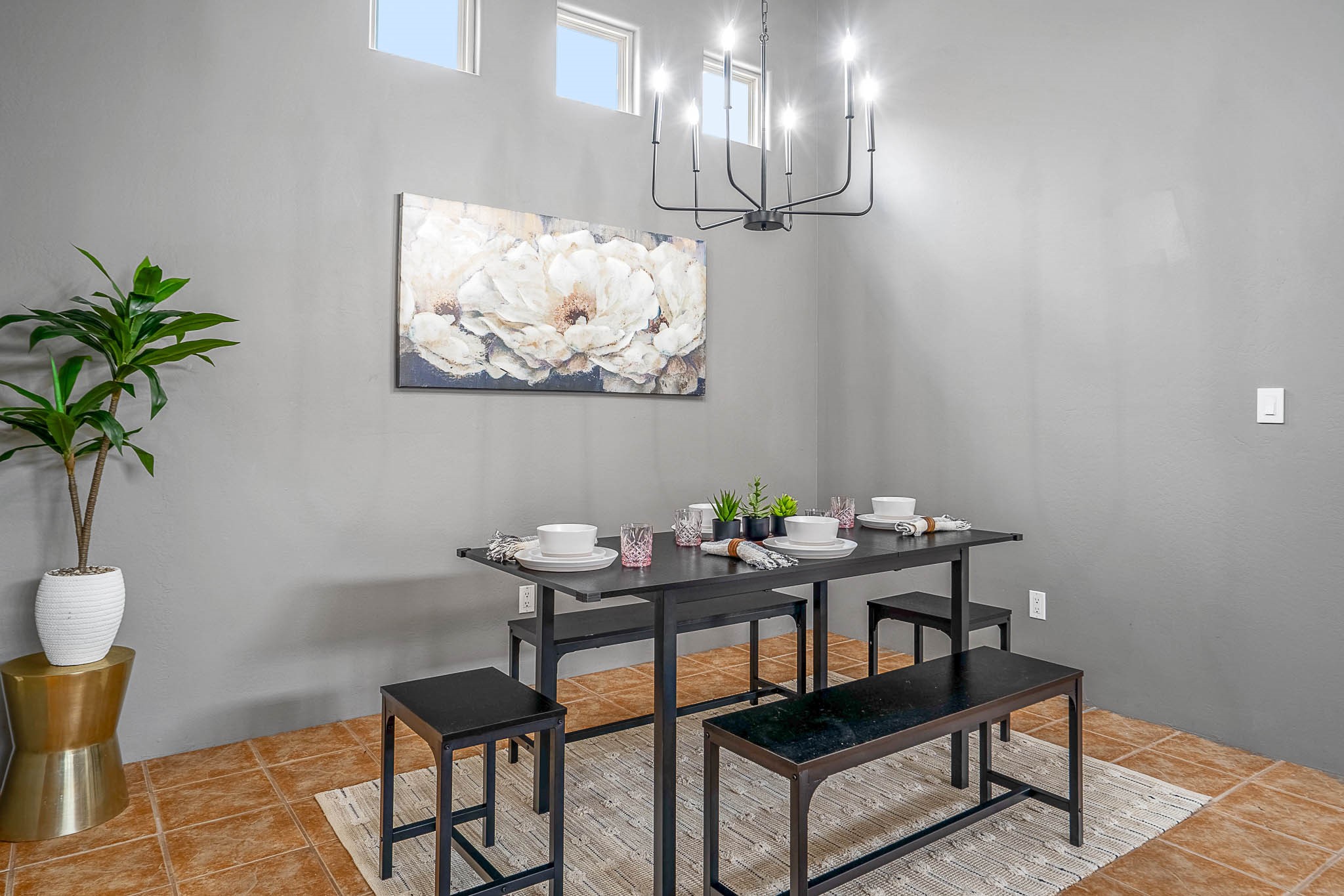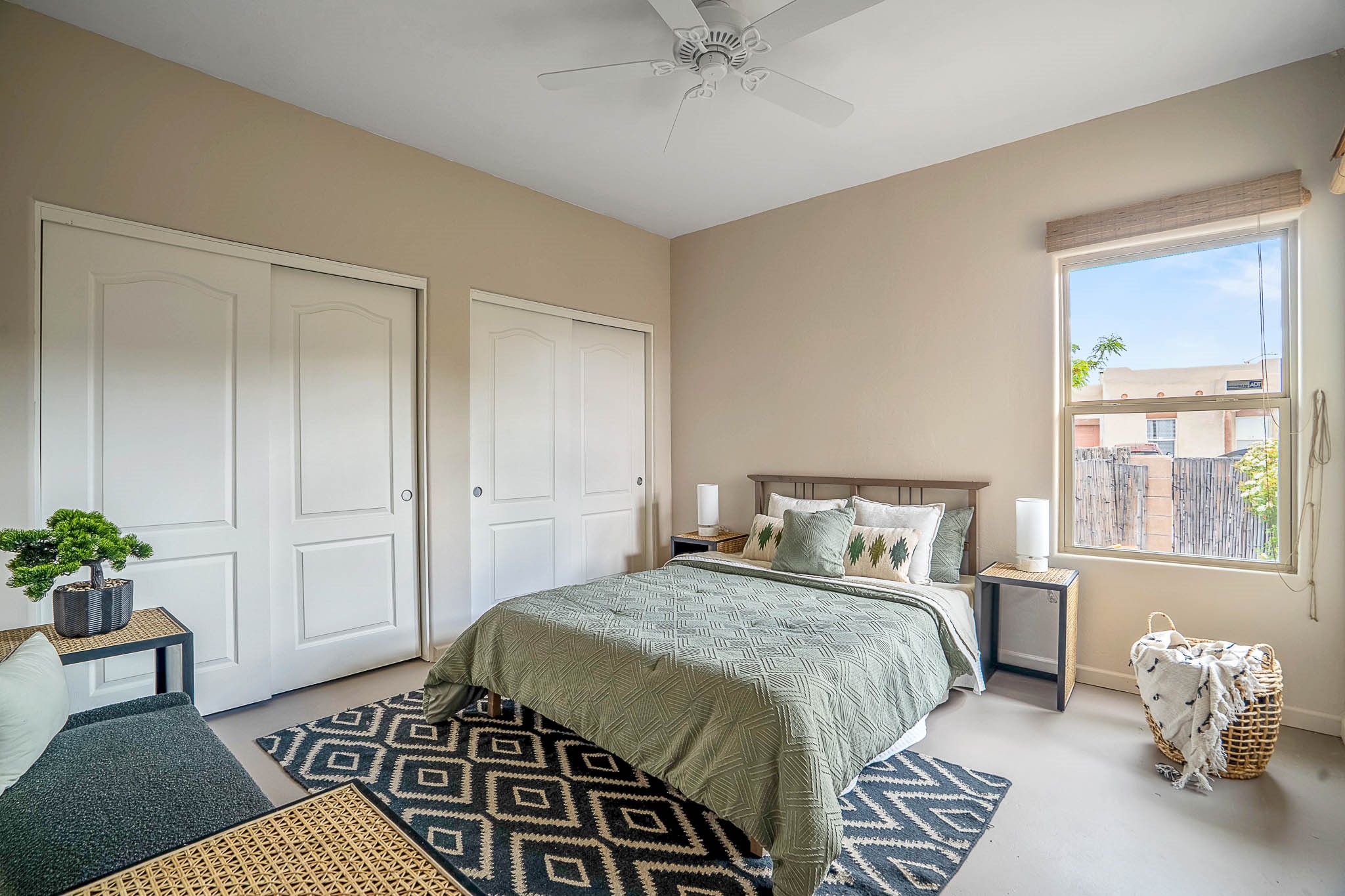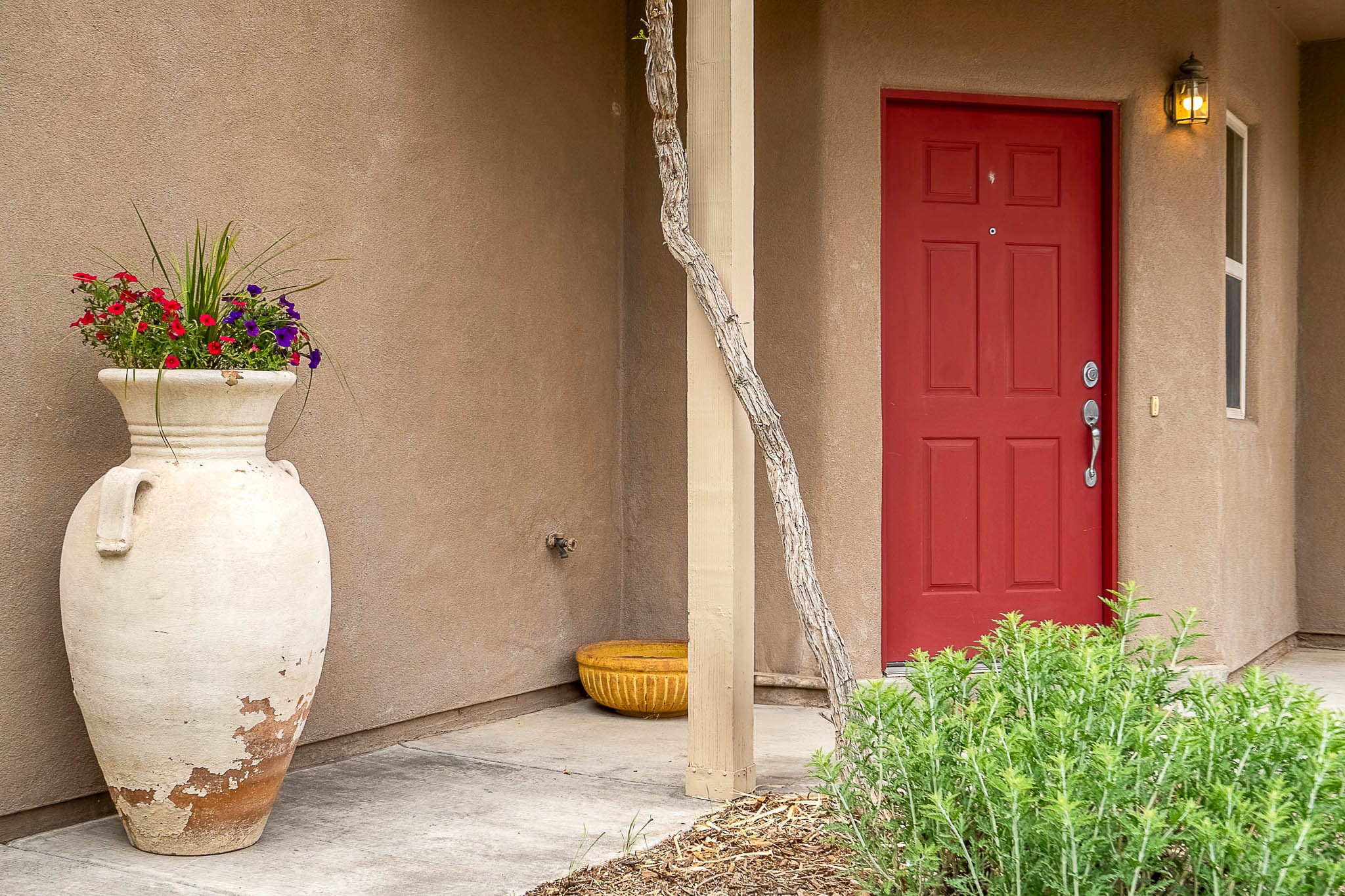 Sitting on a much desired corner lot in Santa Fe's Tierra Contenta neighborhood, this charming, single-level (no interior steps!), 3-bedroom, 2-bathroom home offers a unique blend of Northern New Mexico style and modern design elements. Step inside and you will be captivated by the soaring ceilings in the open-concept, light-filled living and dining space. Thoughtfully designed for both comfort and versatility is a bonus office or den--perfect for remote work or creative pursuits. The home's contemporary flare features exposed, painted, concrete floors in many rooms and is complemented by luxurious radiant in-floor heating throughout, creating a cozy retreat during Santa Fe's cooler seasons. Equally special, is the private, wrap-around backyard, adorned with flowers and several mature trees, that a corner lot provides. Enjoy sunny mornings and peaceful evenings from this outdoor retreat. The patio is completed with clever sun shades that provide comfort in the warmer months and are easy to stow away for the winter season.The spacious, attached, two-car garage offers ample storage, making this sweet property the complete package. Tierra Contenta features convenient access to Highway 599, shops and restaurants, and is ideally located for those commuting to Albuquerque or Los Alamos. This fabulous find in Tierra Contenta combines privacy, style, and functionality in one of Santa Fe's beloved communities.
