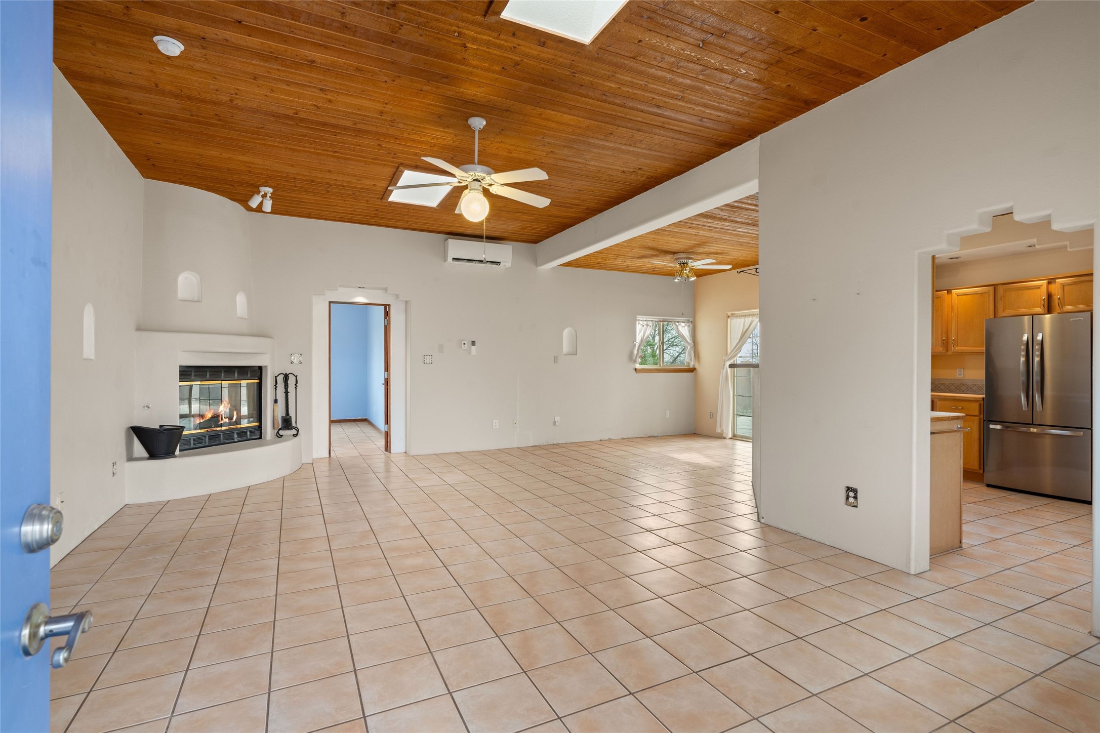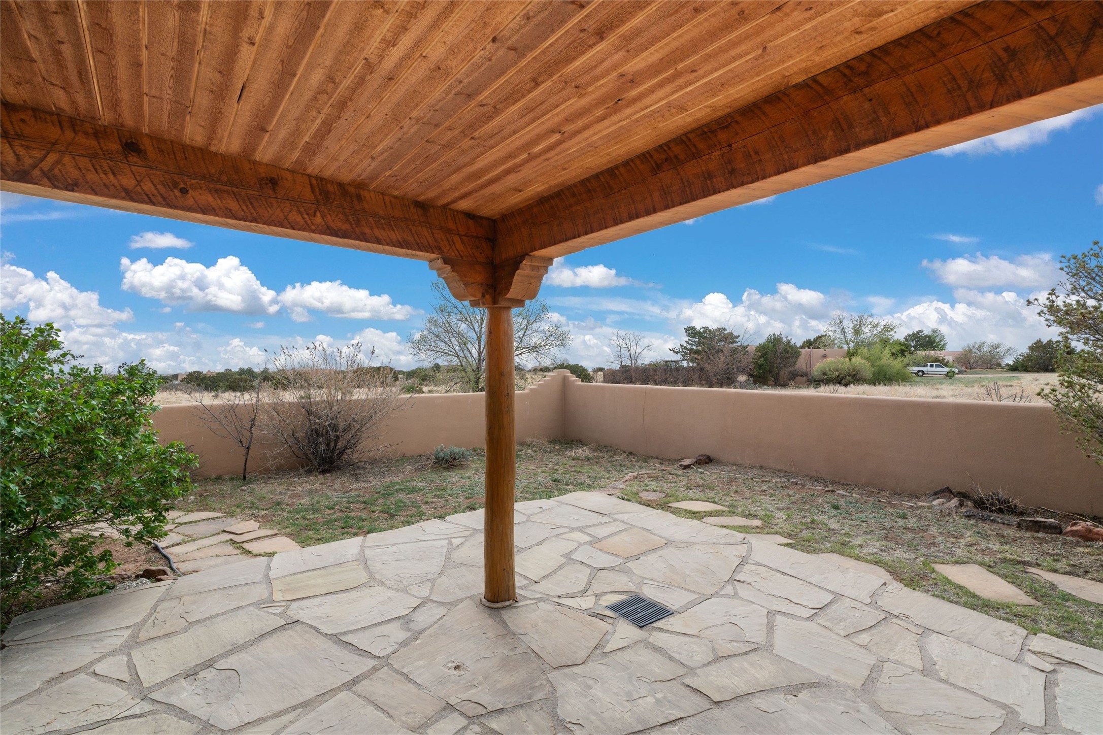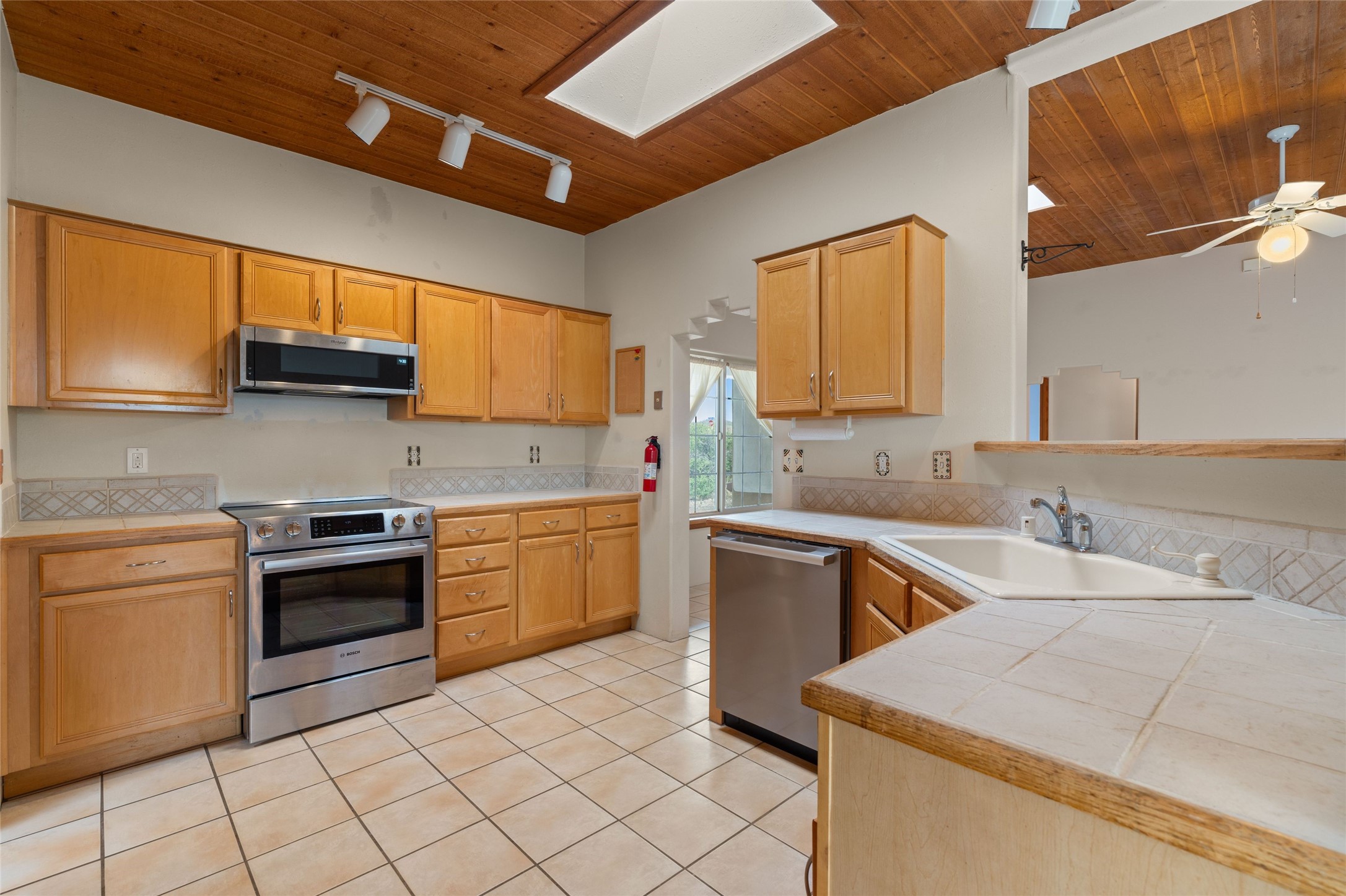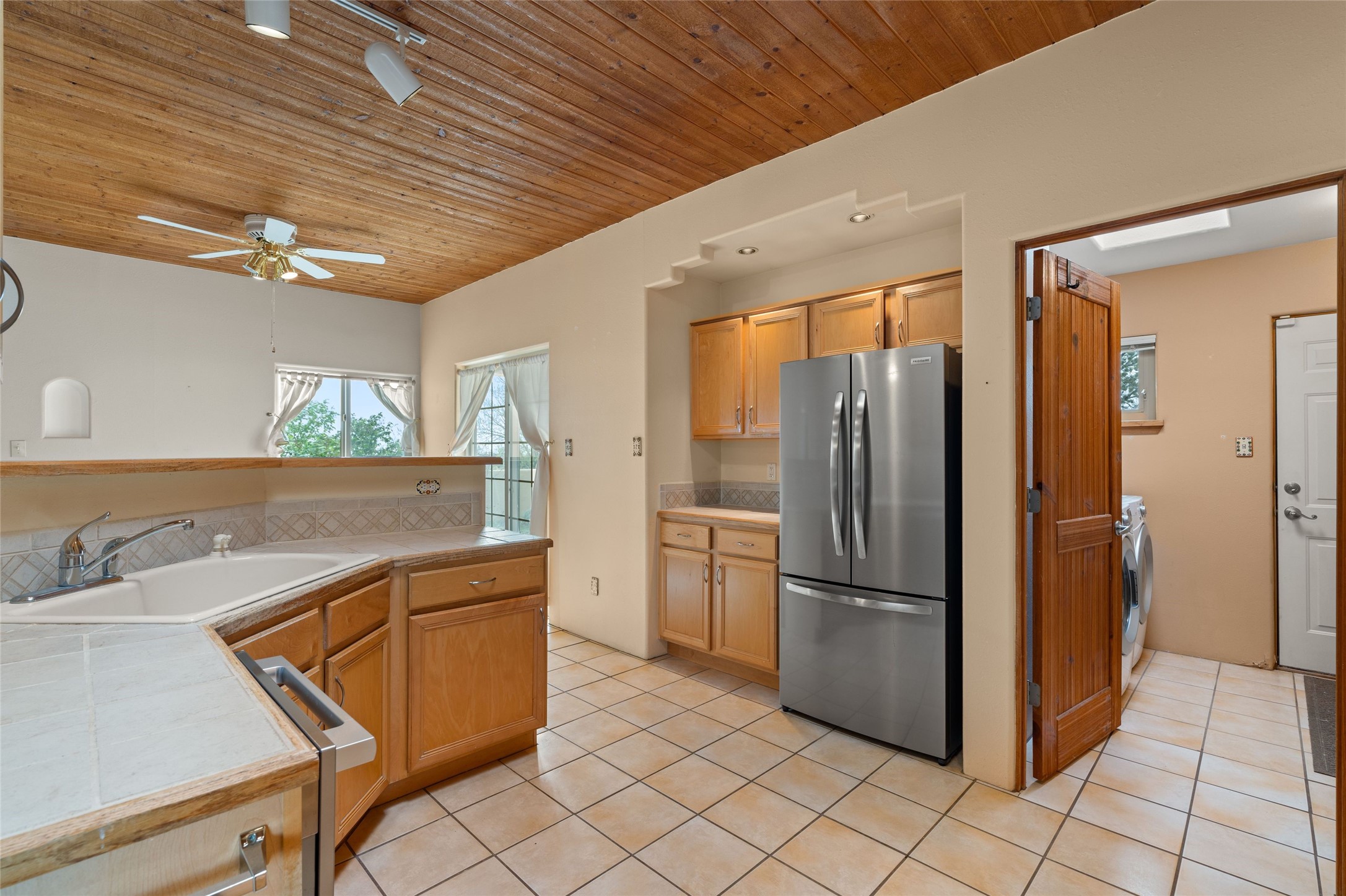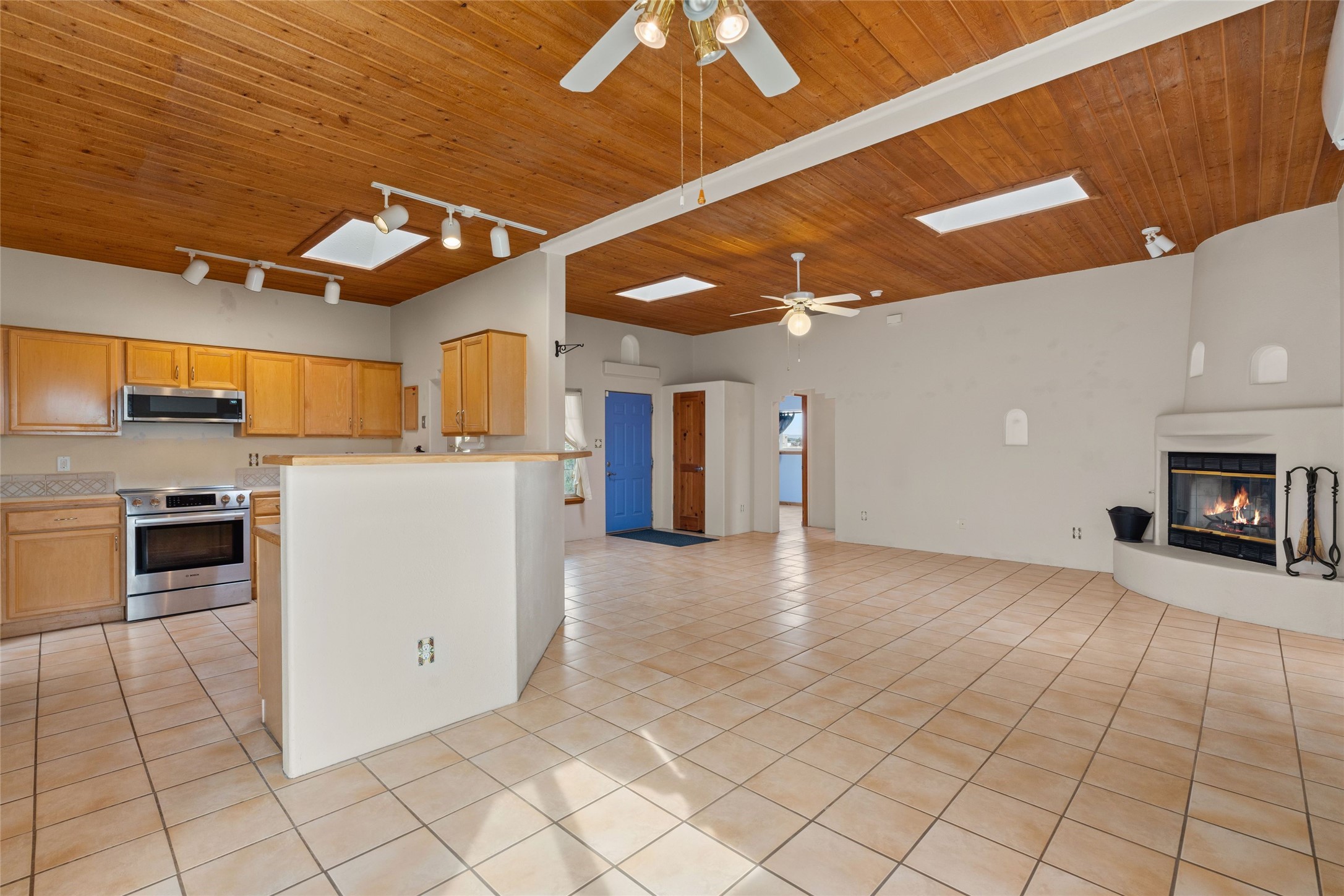 This light-filled, single-level 3-bedroom, 2-bath home sits on a prime 1.47-acre lot just blocks from The Agora in Eldorado. With no interior steps and an easy, flowing layout, the home is both accessible and inviting. The living room welcomes you with tongue-and-groove ceilings and a cozy wood-burning fireplace. Skylights throughout add warmth and natural light. The kitchen is well-appointed with a Bosch stove, new microwave, and new Miele dishwasher. Radiant tile floors provide gentle warmth underfoot, while ductless mini-splits offer efficient cooling in the summer. Step outside to a private, enclosed courtyard with mountain views--a perfect space for gardening, entertaining, or simply relaxing. Additional features include a finished two-car garage and water softener, plus a dedicated laundry room conveniently located off the kitchen. Residents of Eldorado enjoy a vibrant community with amenities for all lifestyles: a clubhouse, swimming pool, playground, tennis, basketball and pickleball courts, dog park, scenic walking trails, and even horse stables