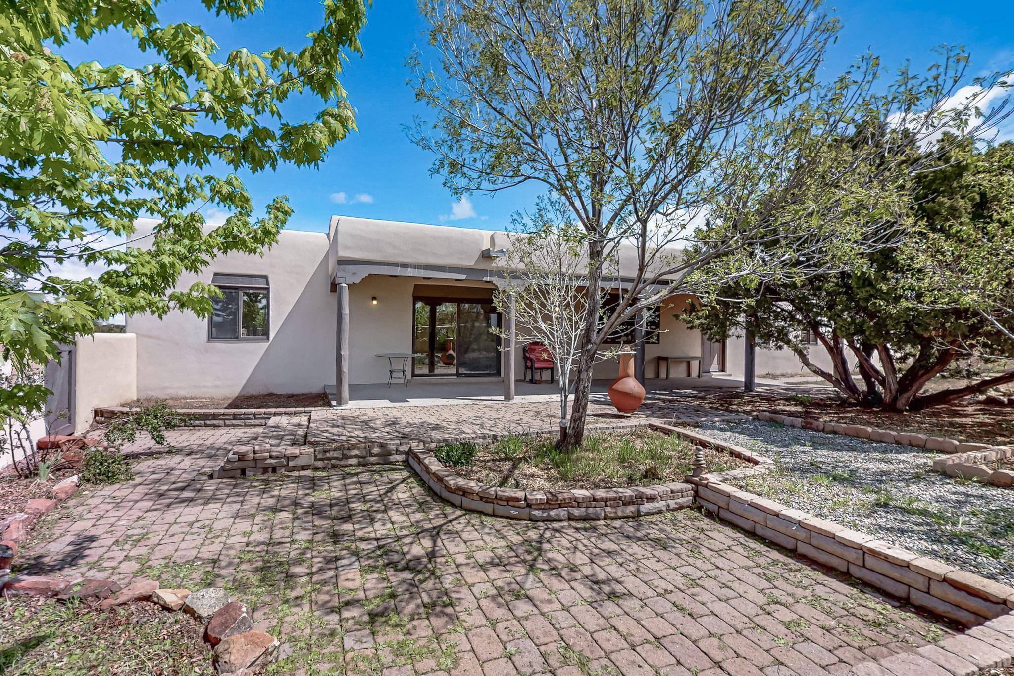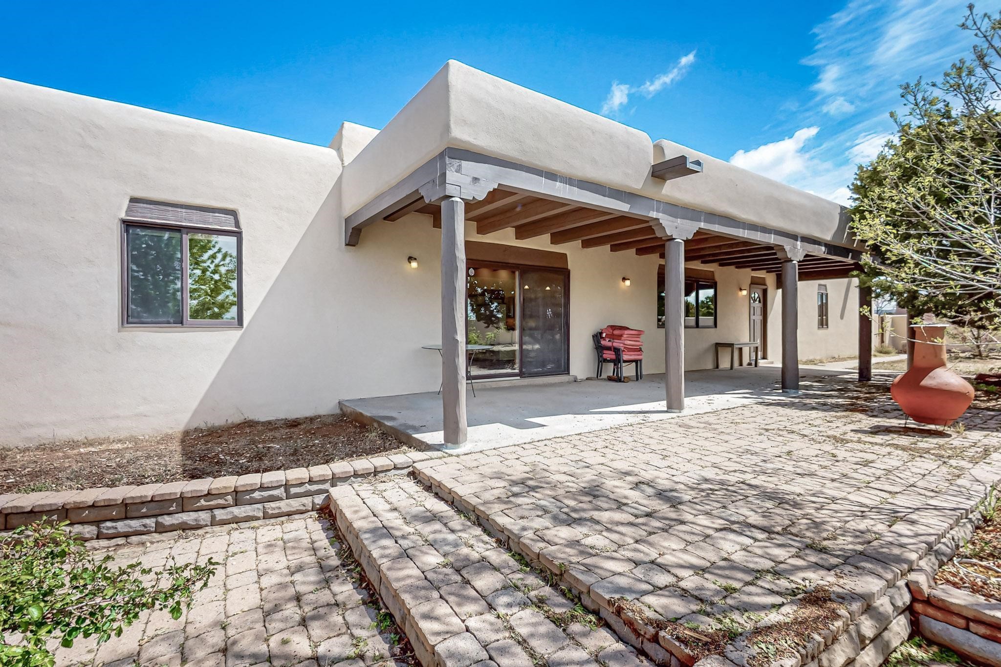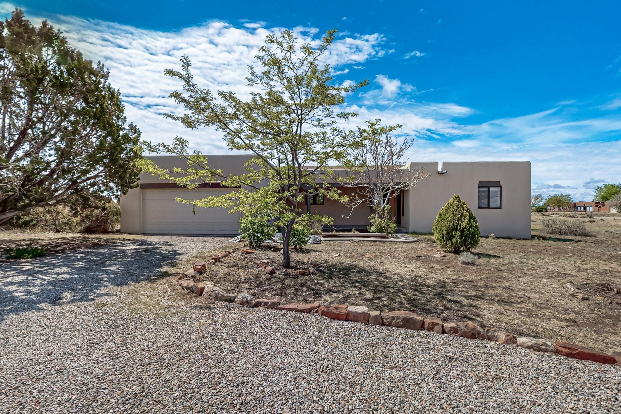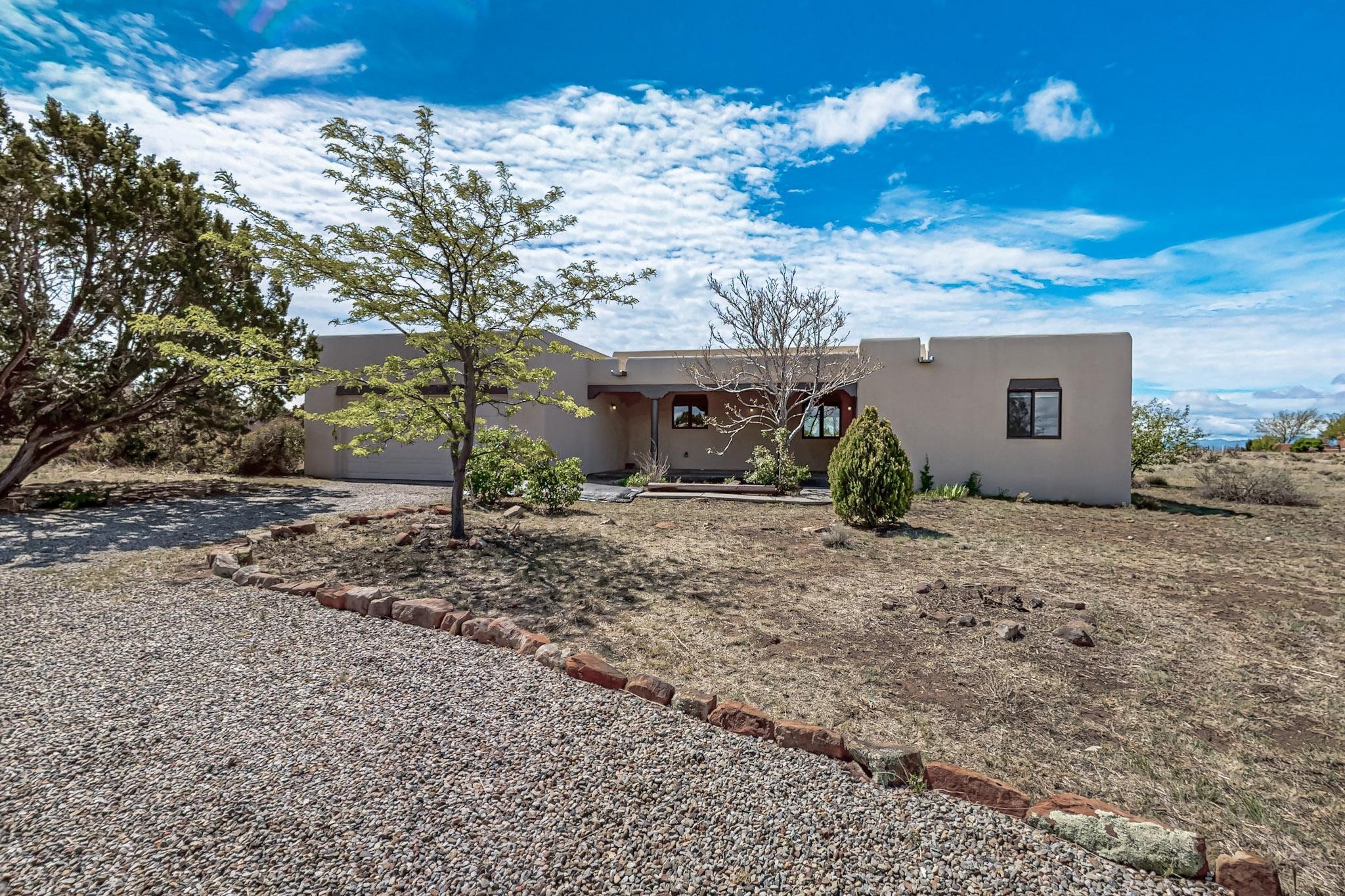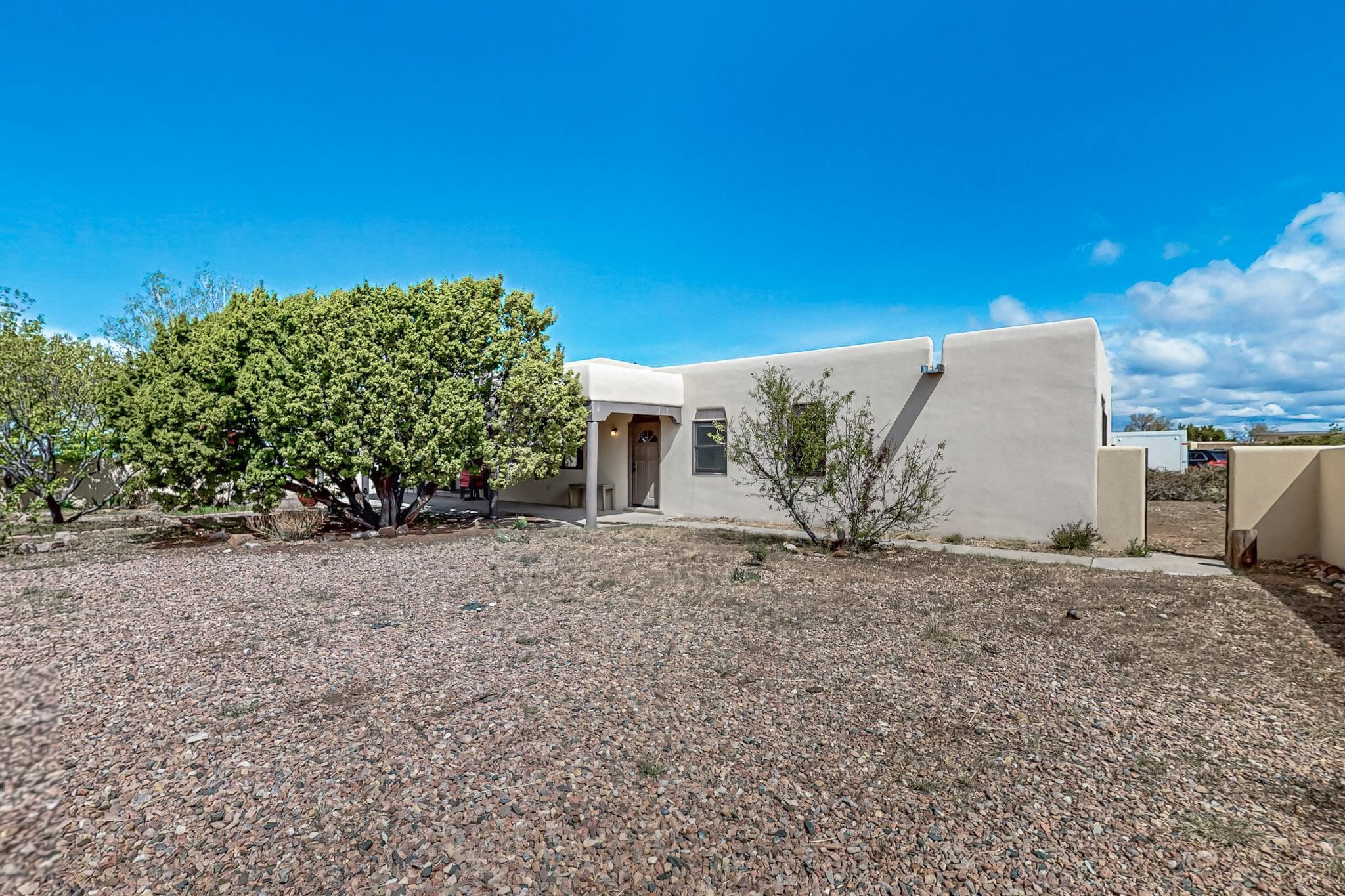 Contemporary pueblo custom built home in move in condition, extremely well maintained. High ceilings create a spaciousness in this 2115 sq.ft, split 3 bedroom plus small office, 2 full bath home. A new silicone roofing system was installed in 2019, new radiant boiler, new zones and new hot water heater in 2017, windows and stucco maintained, garden wall was re stuccoed in 2023, the private well was inspected and electrical upgraded in 2017. Both front and rear portal support beams and some woodwork have been replaced, and the front paved area replaced. Located on a large 1.8acre corner lot, there is a 2 car garage accessed by a circular driveway with plenty of parking, and big privately walled rear garden and portal for entertaining sunsets and the night sky. Just off a paved road, it is within easy reach of all Eldorado amenities, local shopping, schools, library, senior center and minutes into Santa Fe.