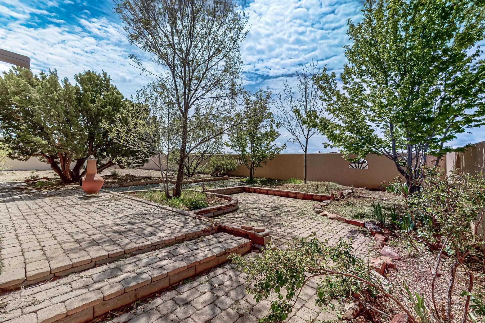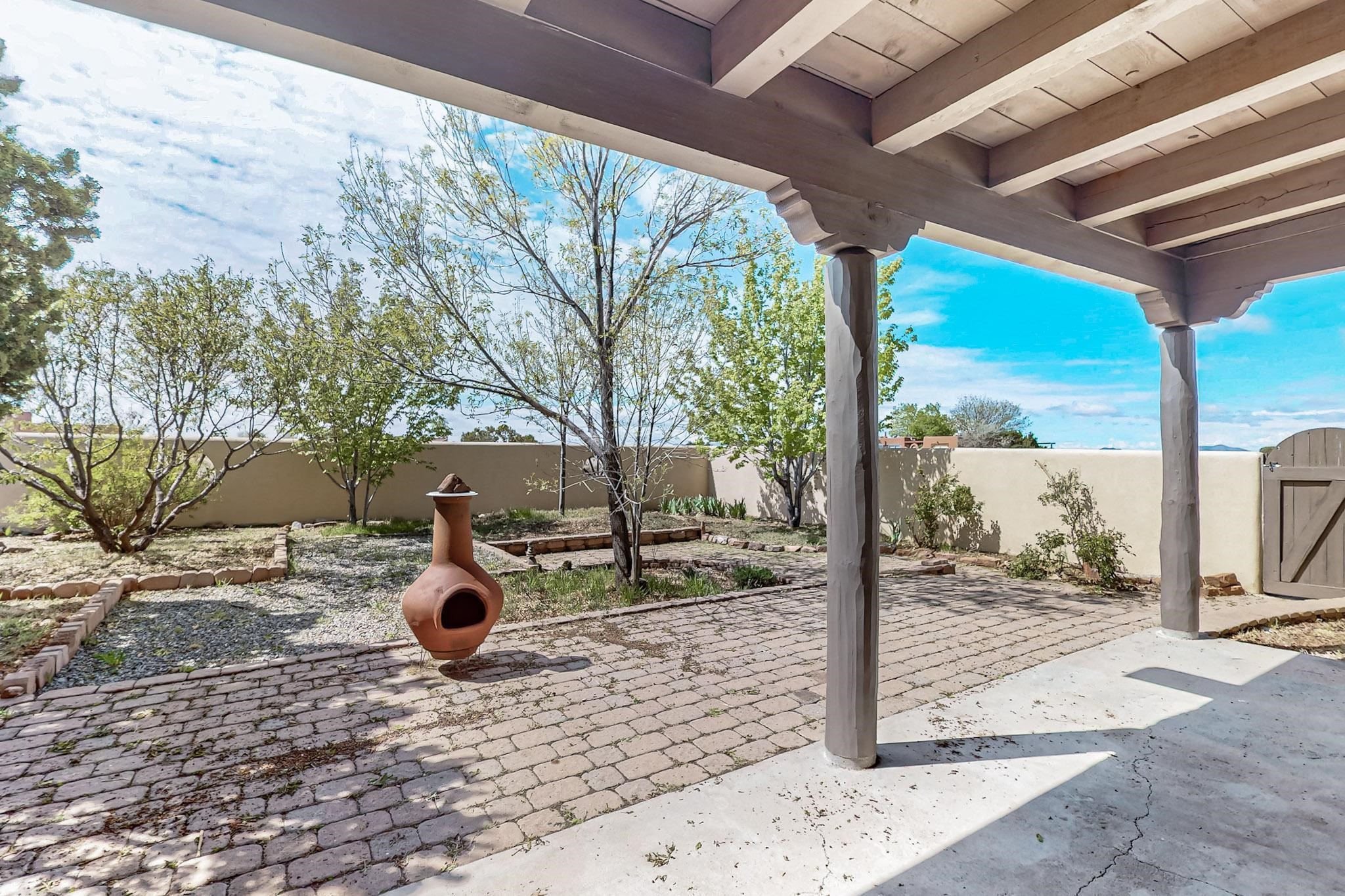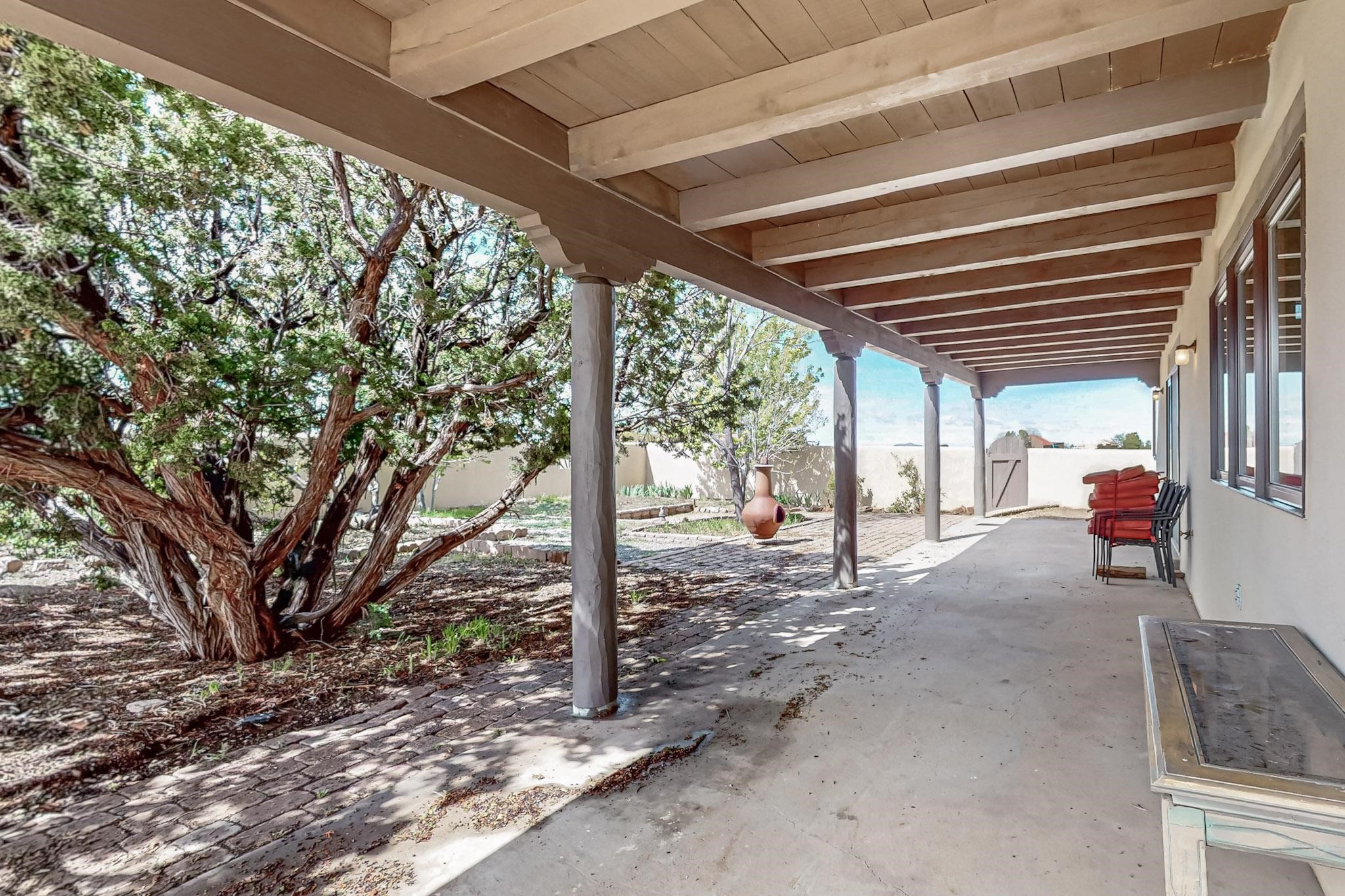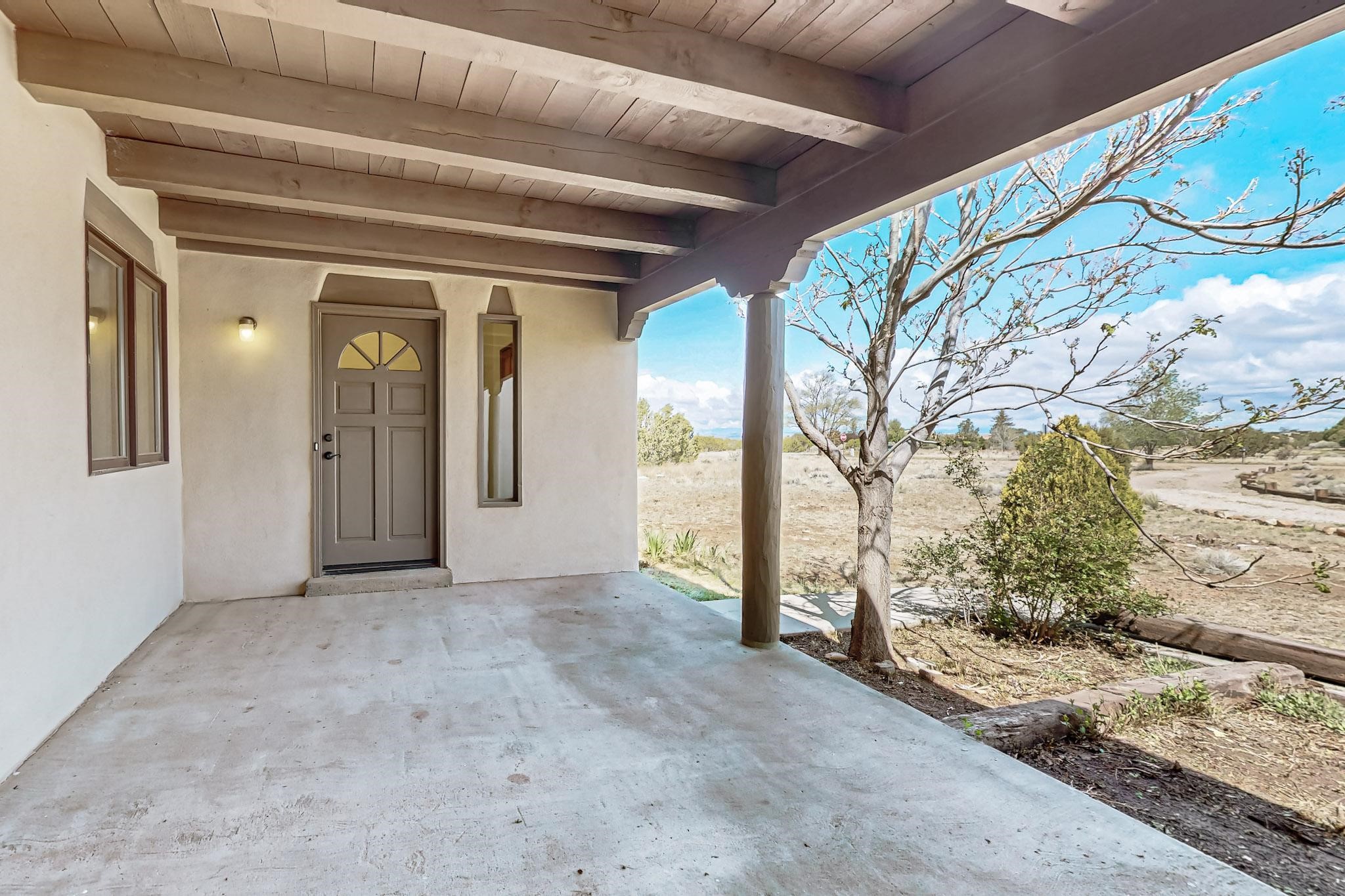 Contemporary pueblo custom built home in move in condition, extremely well maintained. High ceilings create a spaciousness in this 2115 sq.ft, split 3 bedroom plus small office, 2 full bath home. A new silicone roofing system was installed in 2019, new radiant boiler, new zones and new hot water heater in 2017, windows and stucco maintained, garden wall was re stuccoed in 2023, the private well was inspected and electrical upgraded in 2017. Both front and rear portal support beams and some woodwork have been replaced, and the front paved area replaced. Located on a large 1.8acre corner lot, there is a 2 car garage accessed by a circular driveway with plenty of parking, and big privately walled rear garden and portal for entertaining sunsets and the night sky. Just off a paved road, it is within easy reach of all Eldorado amenities, local shopping, schools, library, senior center and minutes into Santa Fe.