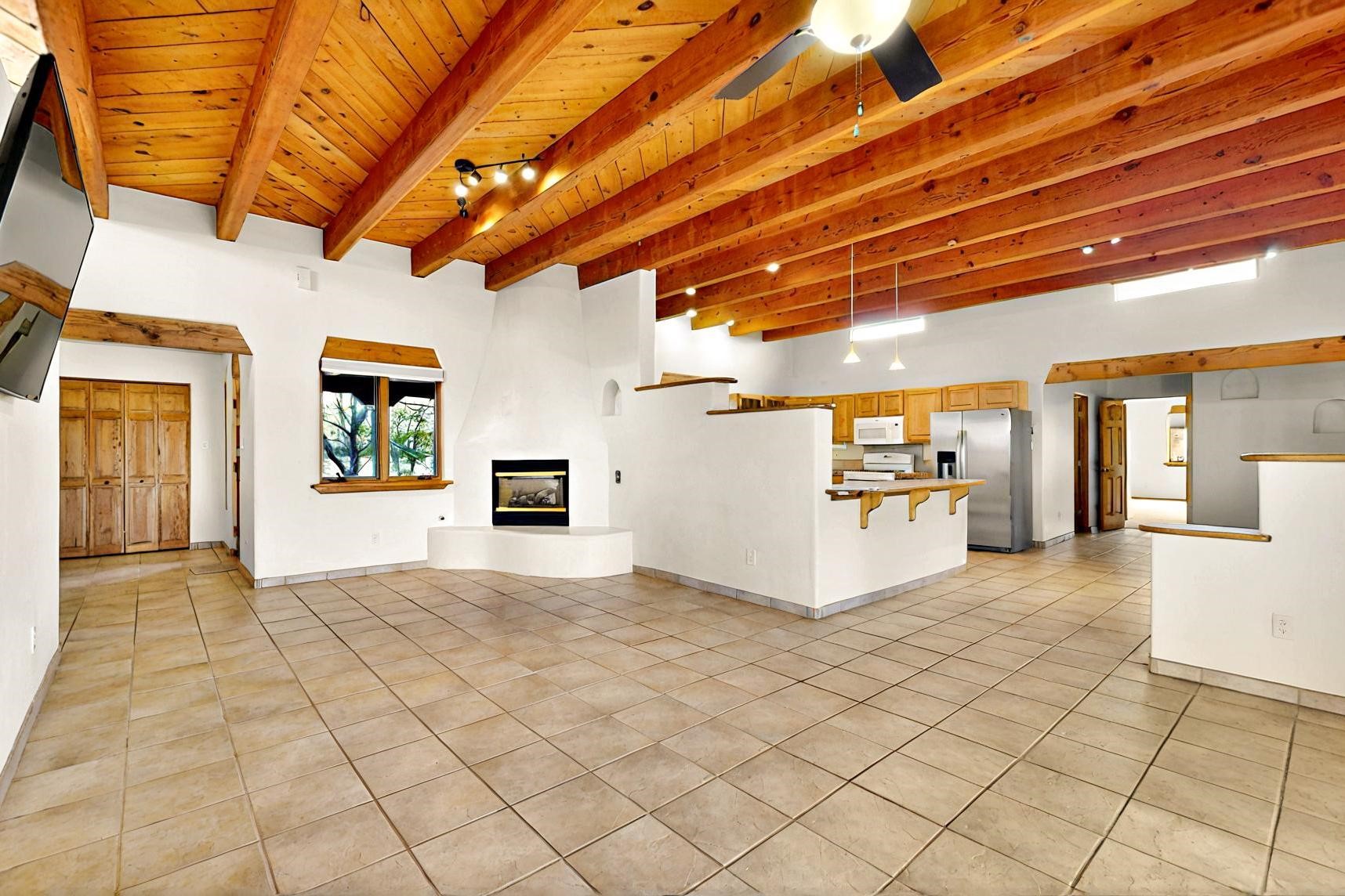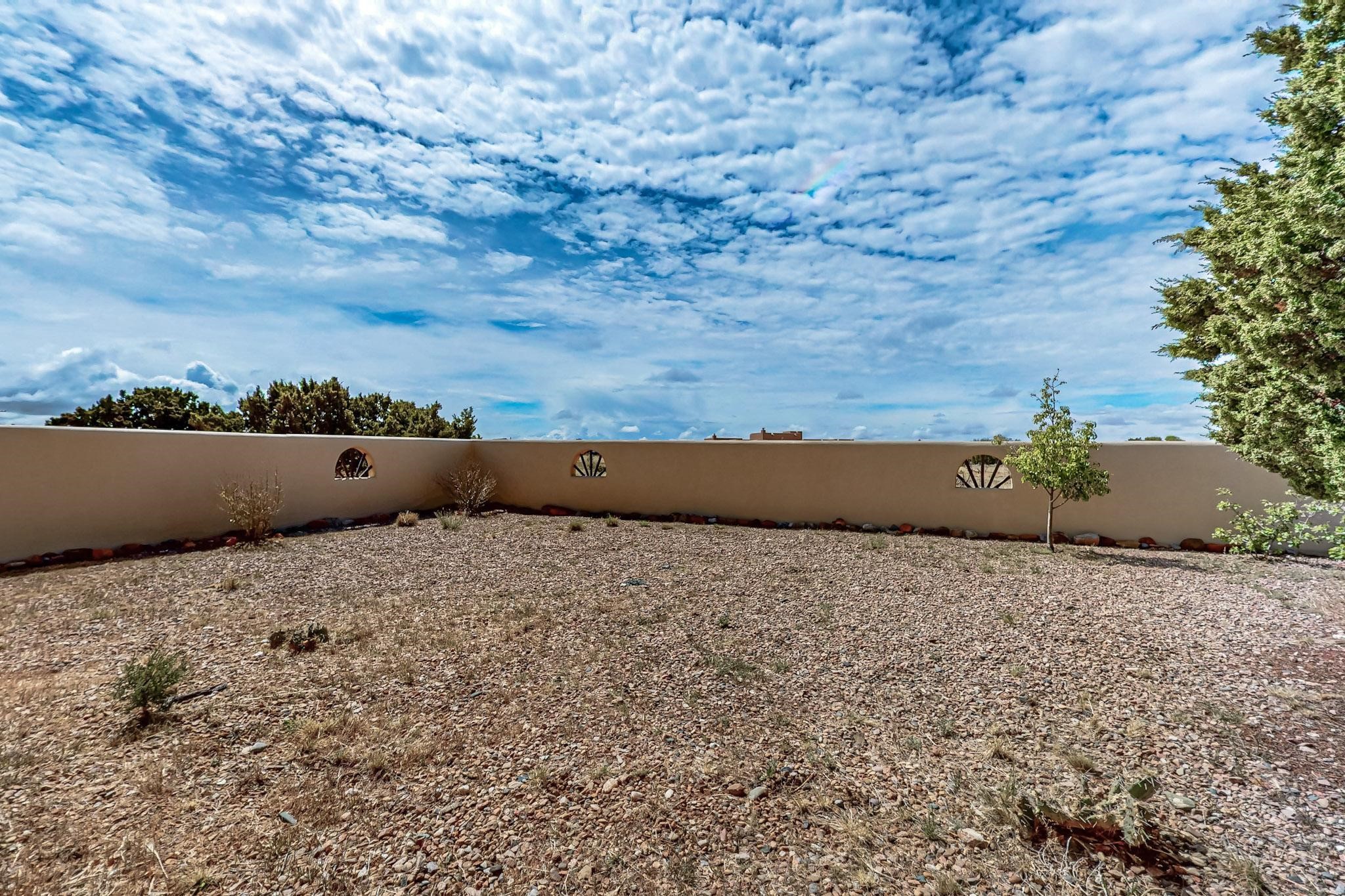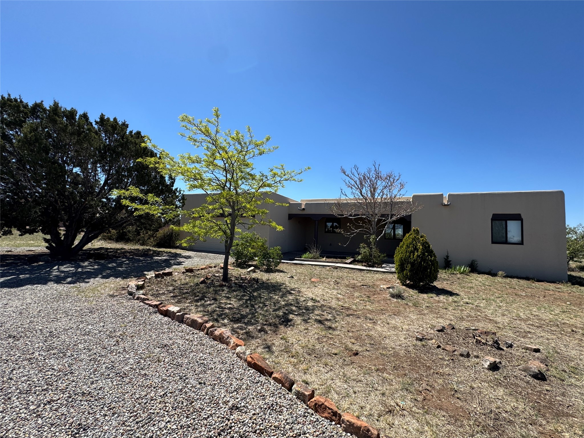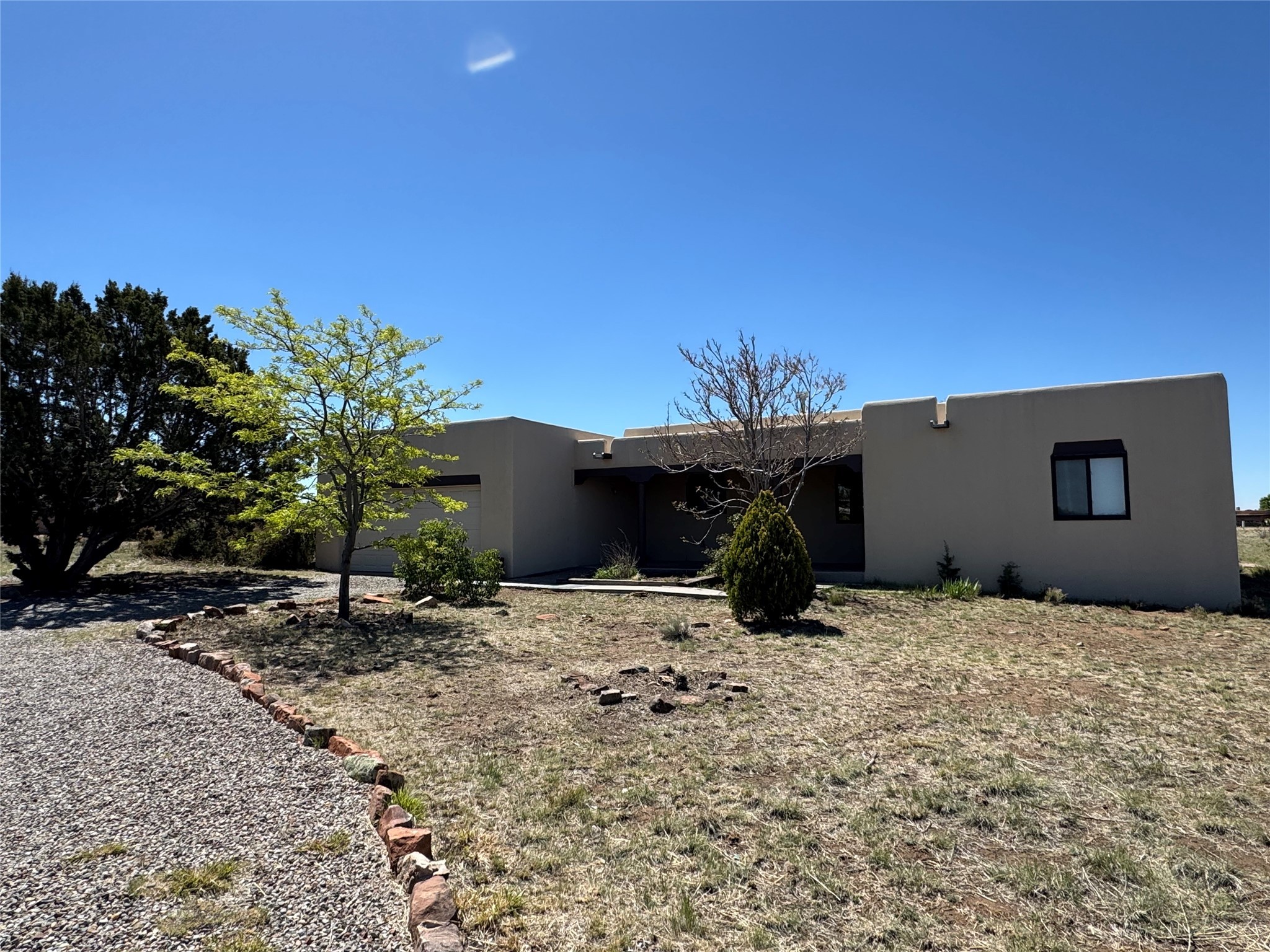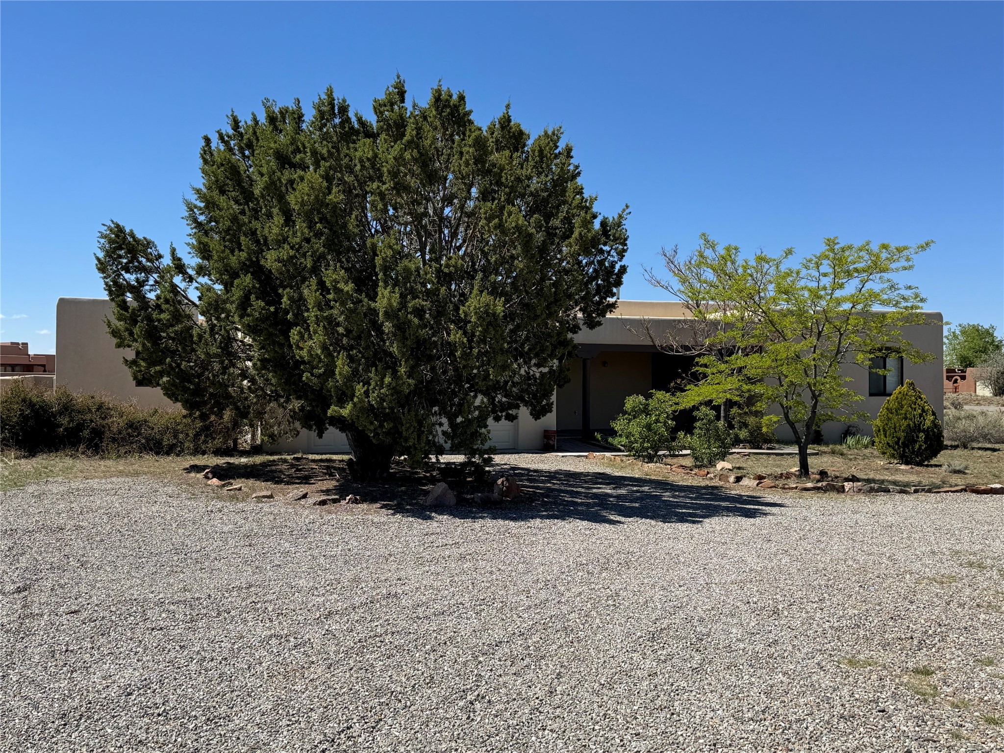 Contemporary pueblo custom built home in move in condition, extremely well maintained. High ceilings create a spaciousness in this 2115 sq.ft, split 3 bedroom plus small office, 2 full bath home. A new silicone roofing system was installed in 2019, new radiant boiler, new zones and new hot water heater in 2017, windows and stucco maintained, garden wall was re stuccoed in 2023, the private well was inspected and electrical upgraded in 2017. Both front and rear portal support beams and some woodwork have been replaced, and the front paved area replaced. Located on a large 1.8acre corner lot, there is a 2 car garage accessed by a circular driveway with plenty of parking, and big privately walled rear garden and portal for entertaining sunsets and the night sky. Just off a paved road, it is within easy reach of all Eldorado amenities, local shopping, schools, library, senior center and minutes into Santa Fe.