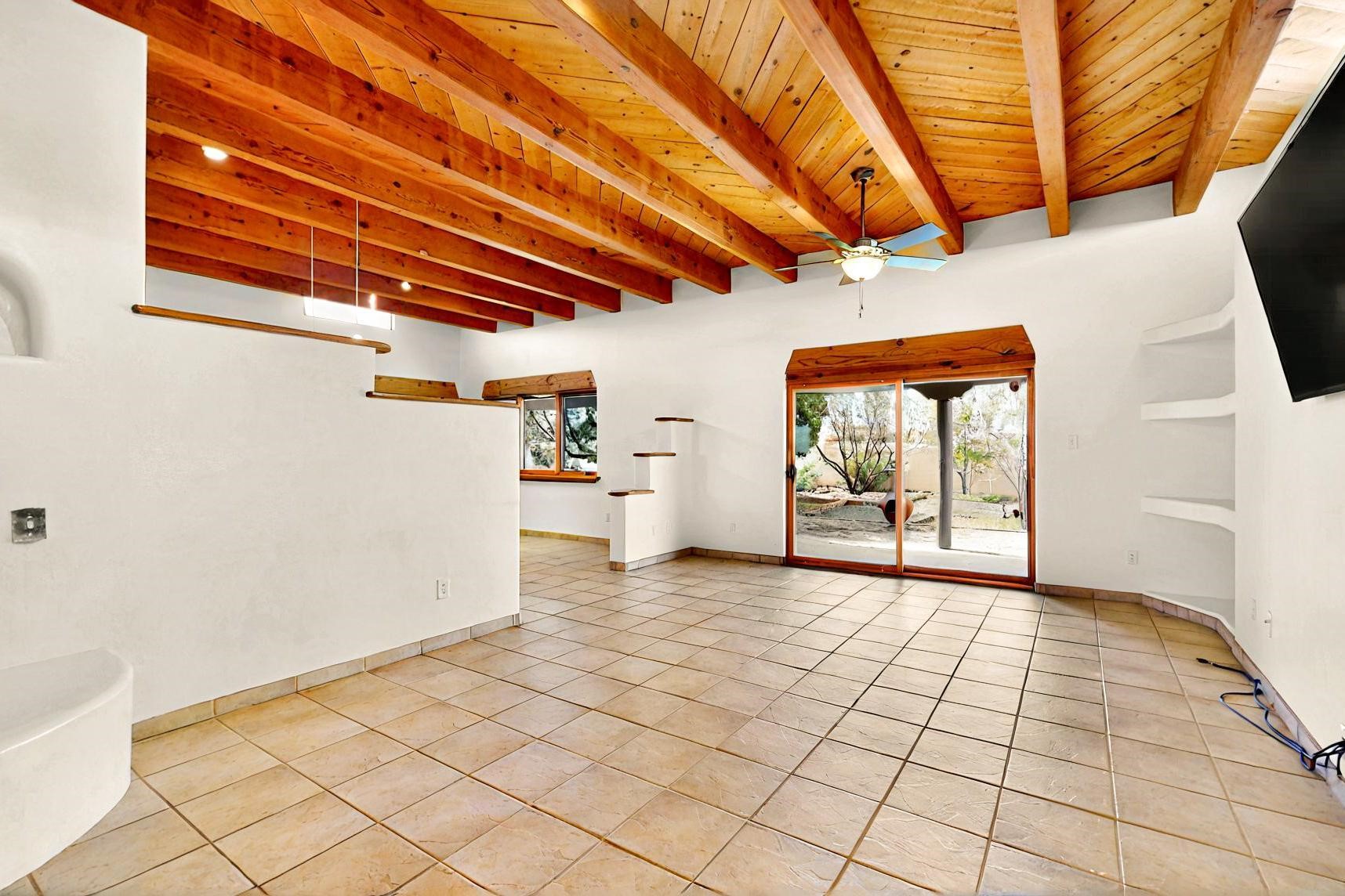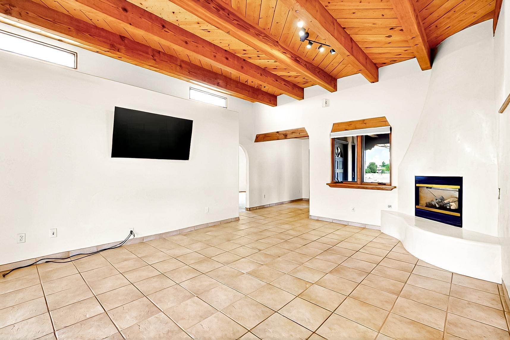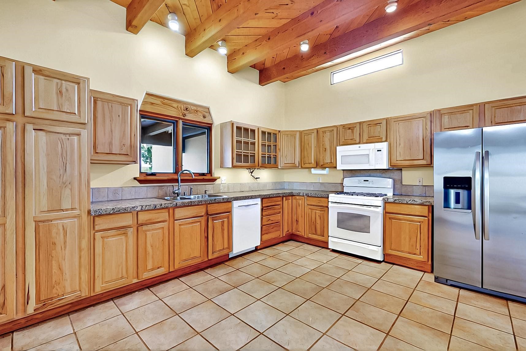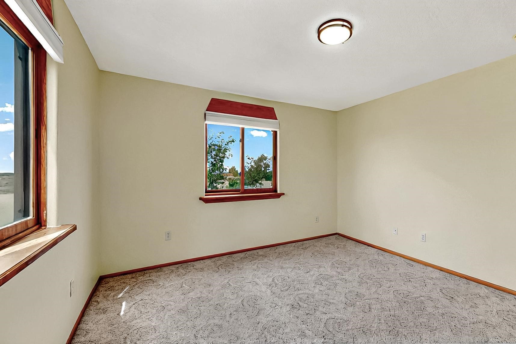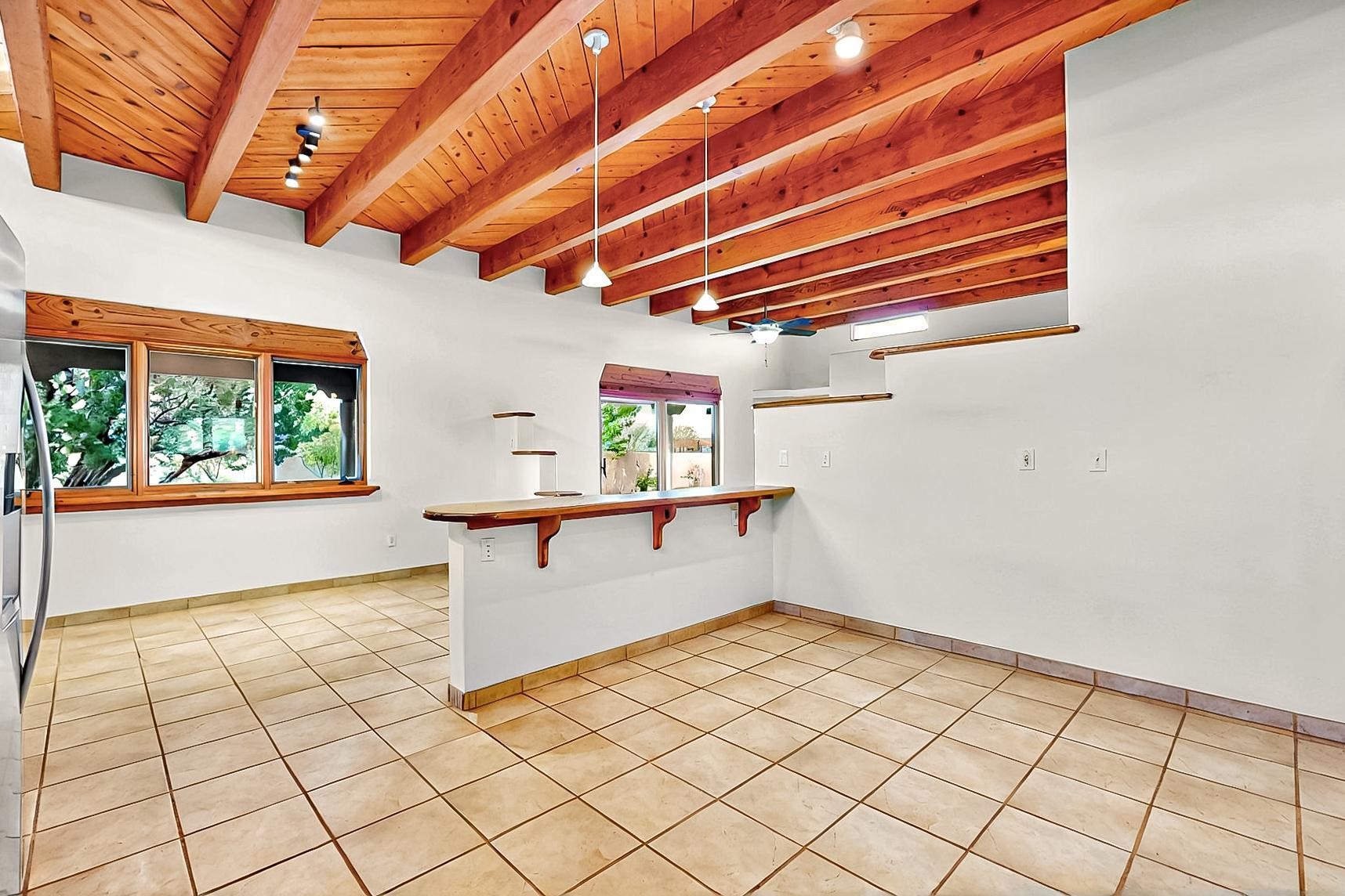 Contemporary pueblo custom built home in move in condition, extremely well maintained. High ceilings create a spaciousness in this 2115 sq.ft, split 3 bedroom plus small office, 2 full bath home. A new silicone roofing system was installed in 2019, new radiant boiler, new zones and new hot water heater in 2017, windows and stucco maintained, garden wall was re stuccoed in 2023, the private well was inspected and electrical upgraded in 2017. Both front and rear portal support beams and some woodwork have been replaced, and the front paved area replaced. Located on a large 1.8acre corner lot, there is a 2 car garage accessed by a circular driveway with plenty of parking, and big privately walled rear garden and portal for entertaining sunsets and the night sky. Just off a paved road, it is within easy reach of all Eldorado amenities, local shopping, schools, library, senior center and minutes into Santa Fe.