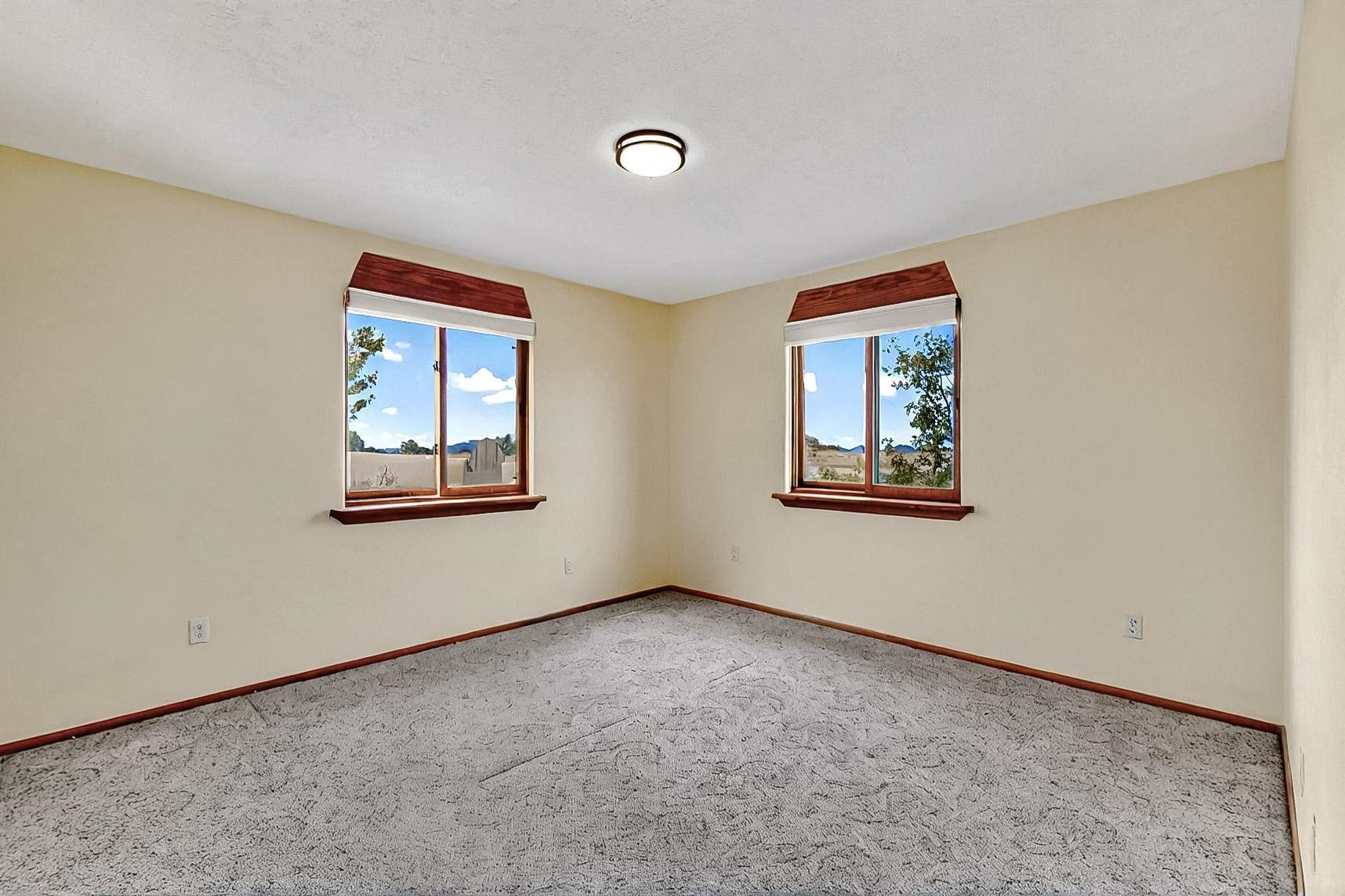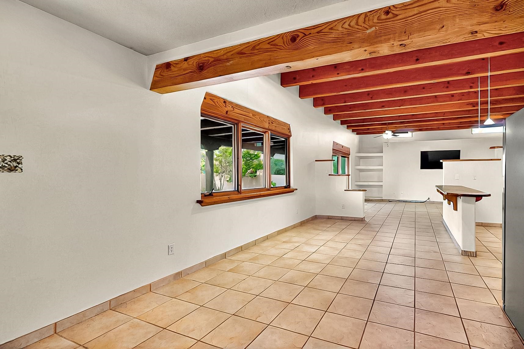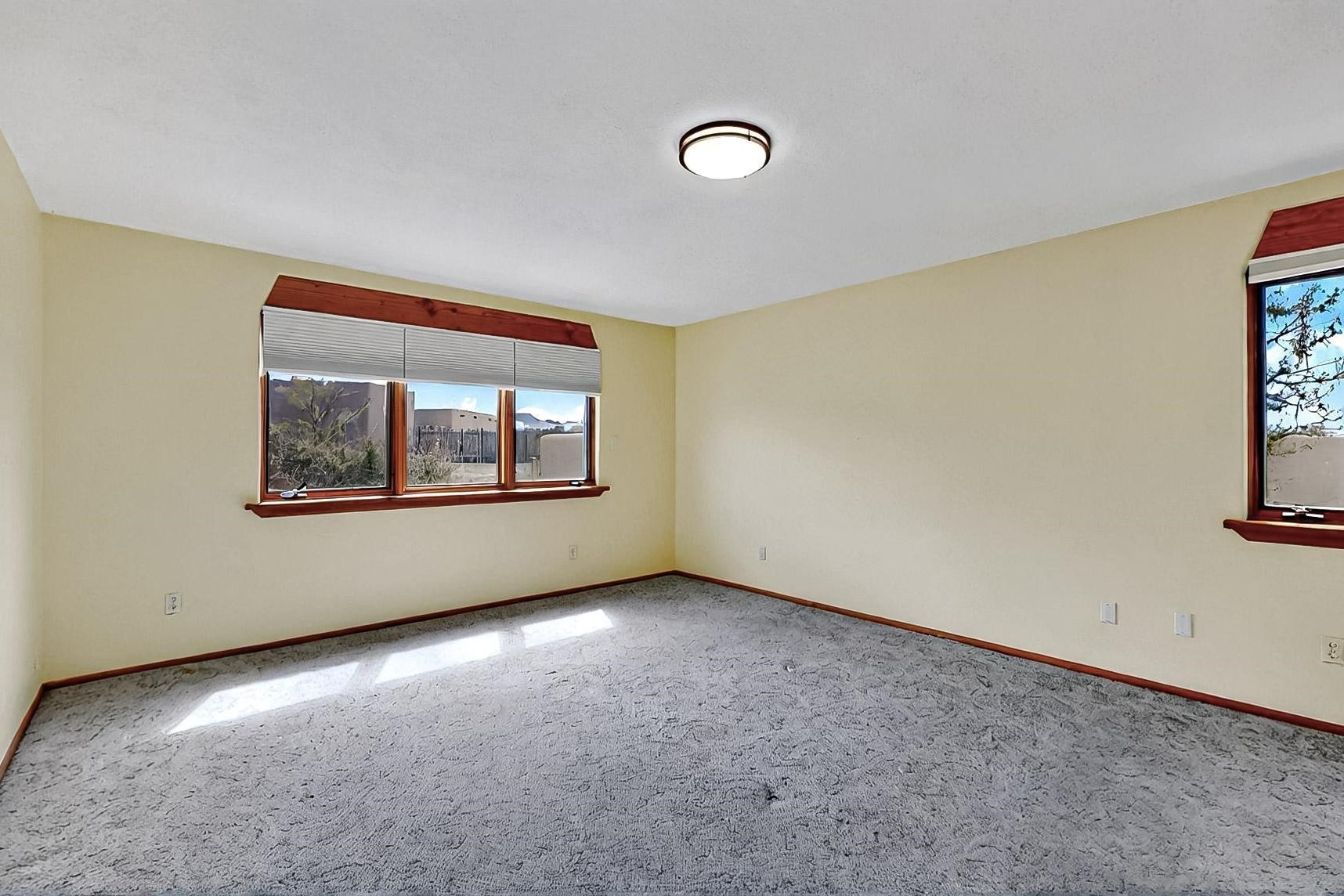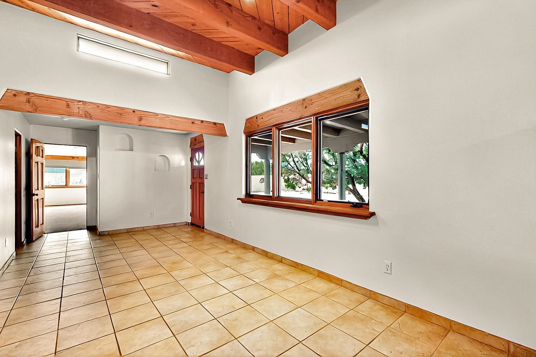 Contemporary pueblo custom built home in move in condition, extremely well maintained. High ceilings create a spaciousness in this 2115 sq.ft, split 3 bedroom plus small office, 2 full bath home. A new silicone roofing system was installed in 2019, new radiant boiler, new zones and new hot water heater in 2017, windows and stucco maintained, garden wall was re stuccoed in 2023, the private well was inspected and electrical upgraded in 2017. Both front and rear portal support beams and some woodwork have been replaced, and the front paved area replaced. Located on a large 1.8acre corner lot, there is a 2 car garage accessed by a circular driveway with plenty of parking, and big privately walled rear garden and portal for entertaining sunsets and the night sky. Just off a paved road, it is within easy reach of all Eldorado amenities, local shopping, schools, library, senior center and minutes into Santa Fe.