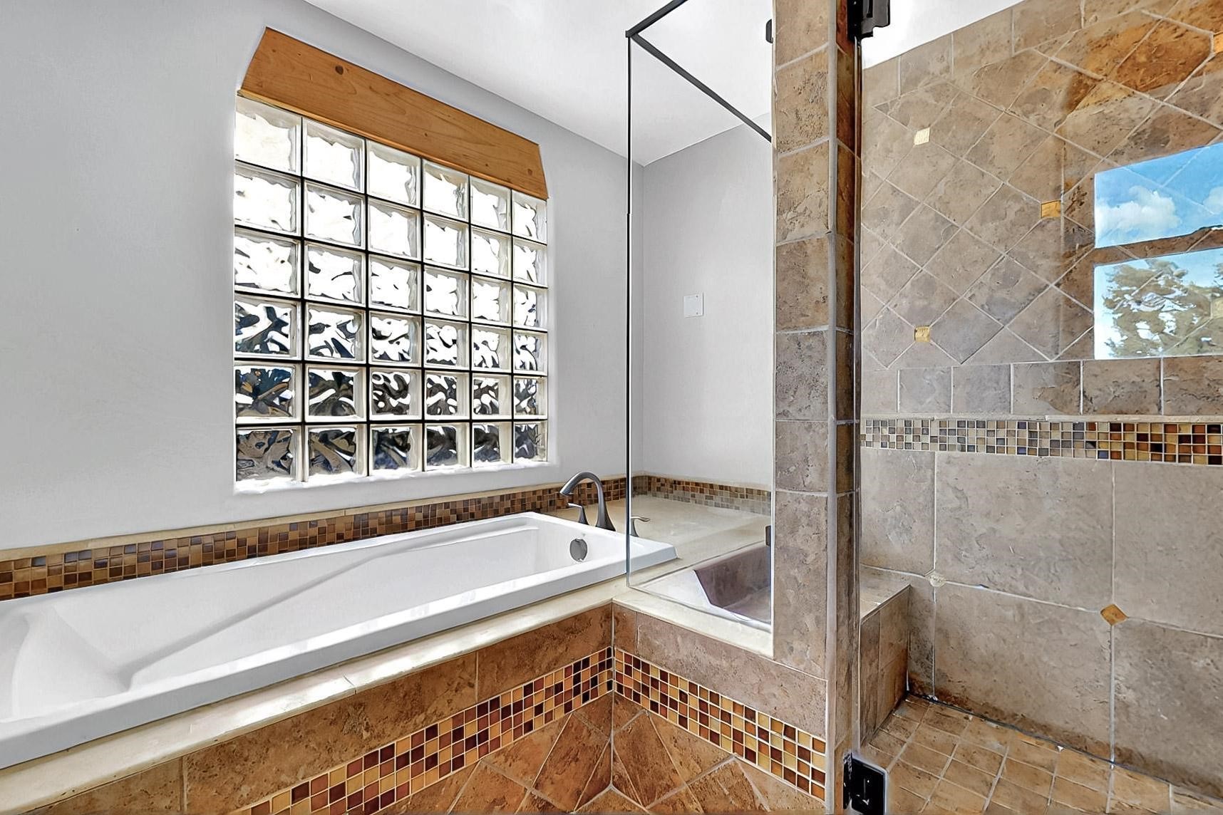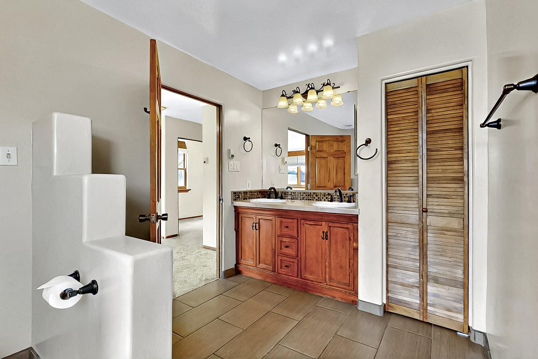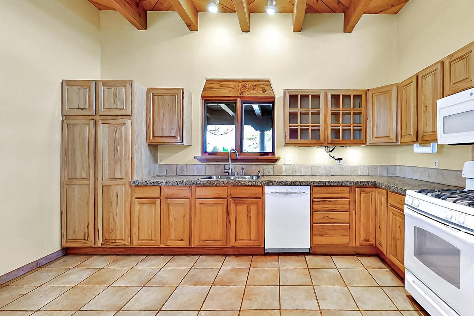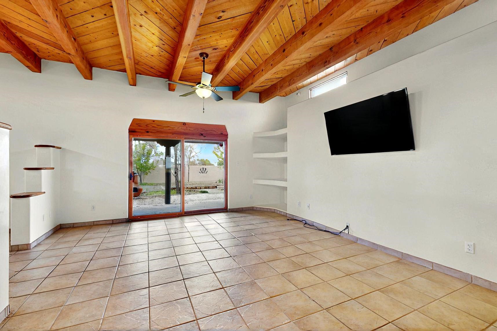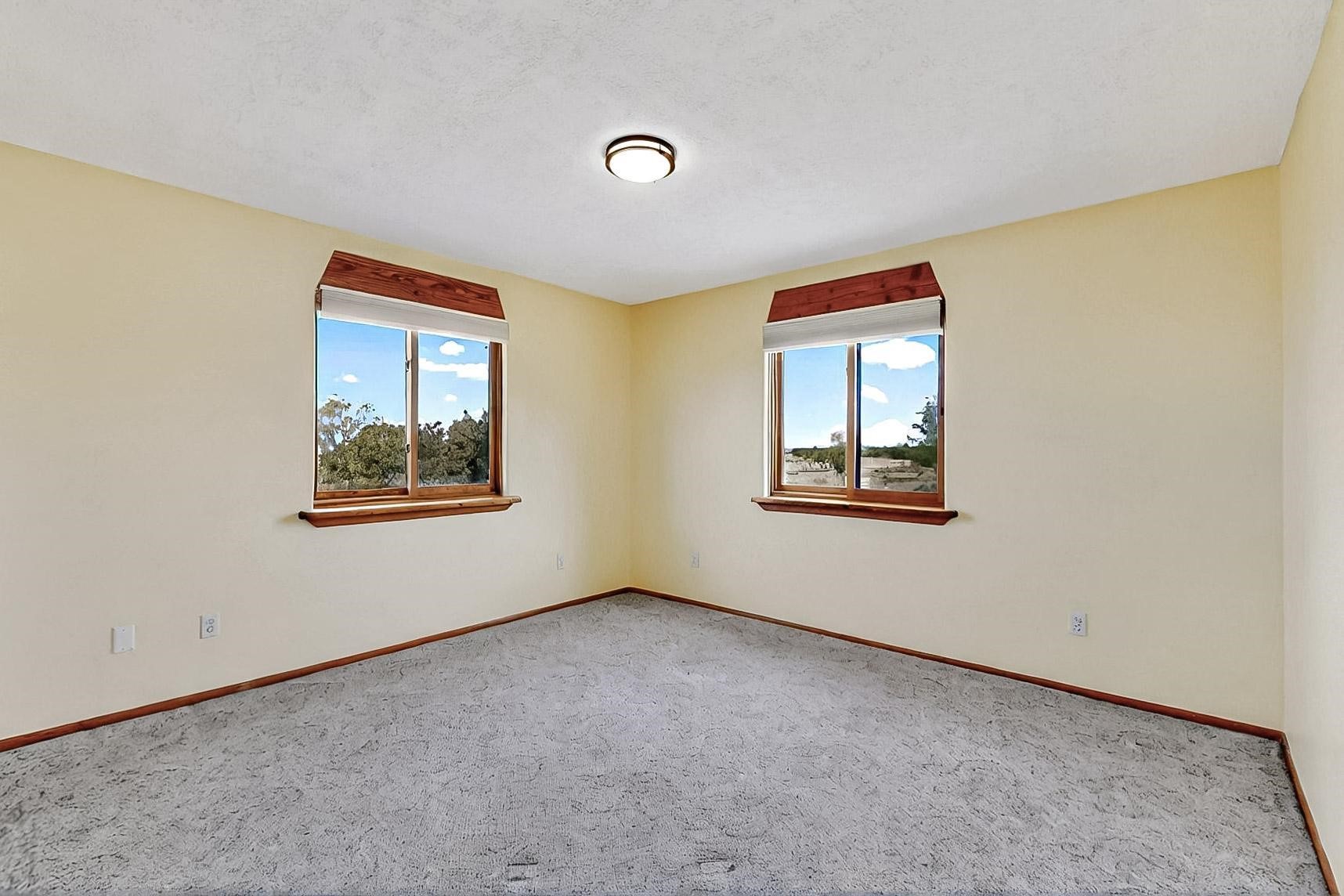 Contemporary pueblo custom built home in move in condition, extremely well maintained. High ceilings create a spaciousness in this 2115 sq.ft, split 3 bedroom plus small office, 2 full bath home. A new silicone roofing system was installed in 2019, new radiant boiler, new zones and new hot water heater in 2017, windows and stucco maintained, garden wall was re stuccoed in 2023, the private well was inspected and electrical upgraded in 2017. Both front and rear portal support beams and some woodwork have been replaced, and the front paved area replaced. Located on a large 1.8acre corner lot, there is a 2 car garage accessed by a circular driveway with plenty of parking, and big privately walled rear garden and portal for entertaining sunsets and the night sky. Just off a paved road, it is within easy reach of all Eldorado amenities, local shopping, schools, library, senior center and minutes into Santa Fe.