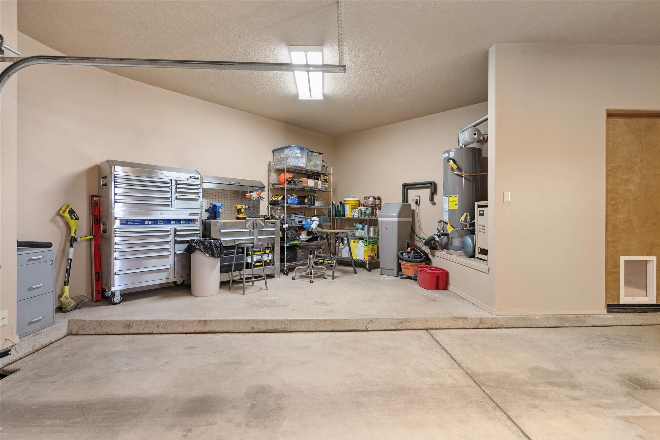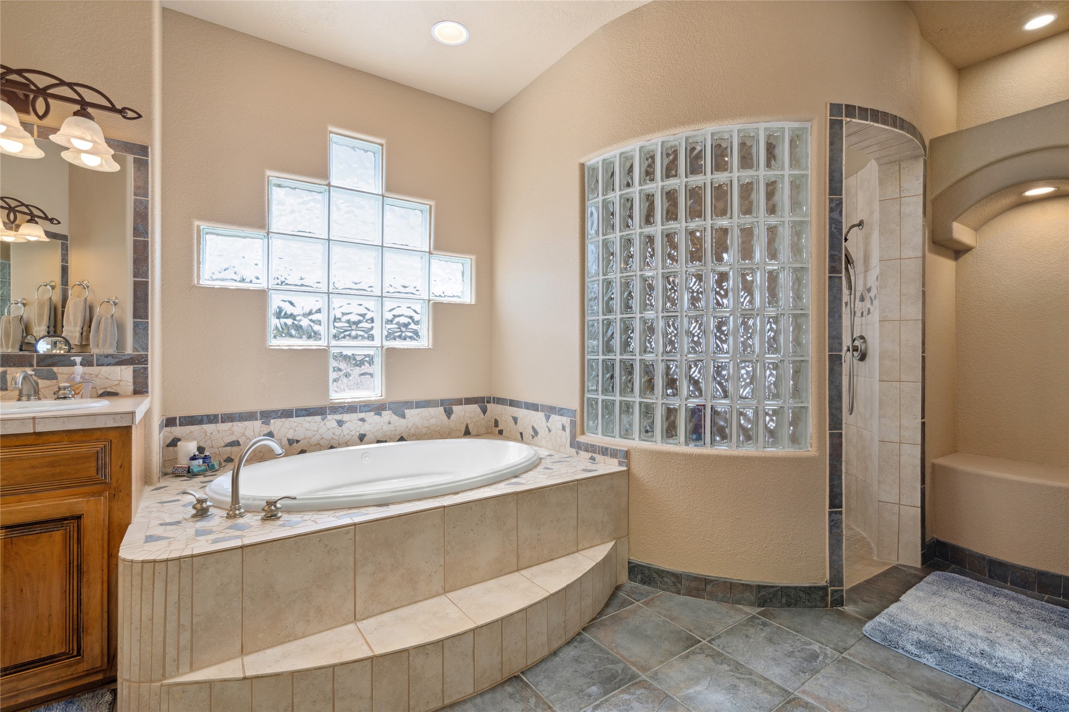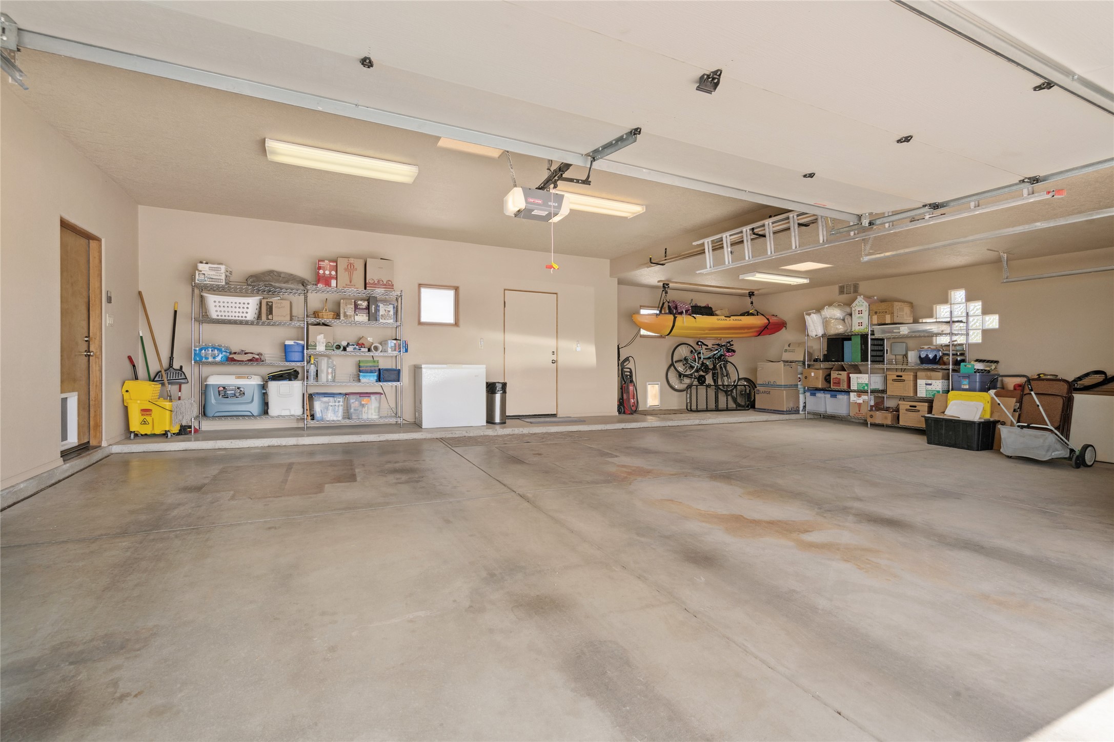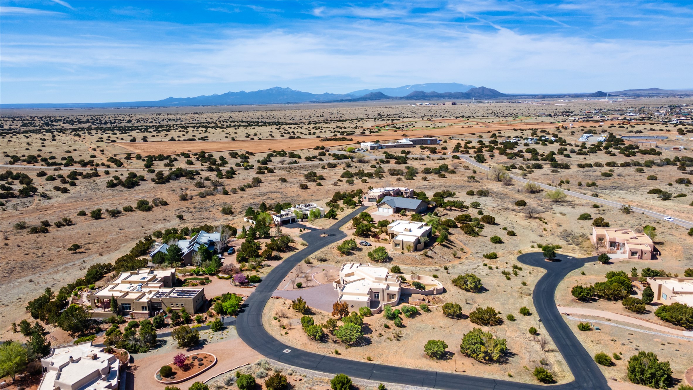 Welcome to this exceptional one-owner custom home, nestled in the coveted Estates section of Rancho Viejo. Set on a generous one-acre view lot, this thoughtfully designed single-level home offers 2,369 square feet of refined Southwest living. From the moment you enter, you'll be captivated by the stunning wood ceilings with vigas, artful nichos, and built-in shelving that blend function with authentic Santa Fe character. A dramatic two-sided gas fireplace anchors the living and dining areas, where a curved wall of windows frames breathtaking Jemez Mountain views. The well-appointed kitchen is a chef's delight, featuring custom wood cabinetry, luxurious granite counters, a stone tile backsplash, and premium appliances including a Dacor cooktop and wall oven, plus a Bosch dishwasher. The home's smart layout offers privacy and comfort, with a dedicated office and a spacious owner's suite in one wing. Enjoy a spa-like bathroom with dual vanities and a large, distinctive walk-in shower plus soaking tub, an oversized walk-in closet with safe cubby, and direct access to the rear portal from the serene primary bedroom. The opposite wing includes three additional bedrooms (one used as a hobby room), a stylish guest bath, a powder room, and a well-equipped laundry area. Outside, the landscaped backyard is a true retreat, complete with artistic custom flagstone patios, a soothing water feature, dramatic natural boulders, and a hot tub--perfect for relaxing under the stars. The oversized three-car garage includes space for a workshop or extra storage. Lovingly maintained and rich in Southwest charm, this home offers privacy, views, and elegant livability in one of Santa Fe's most desirable neighborhoods.