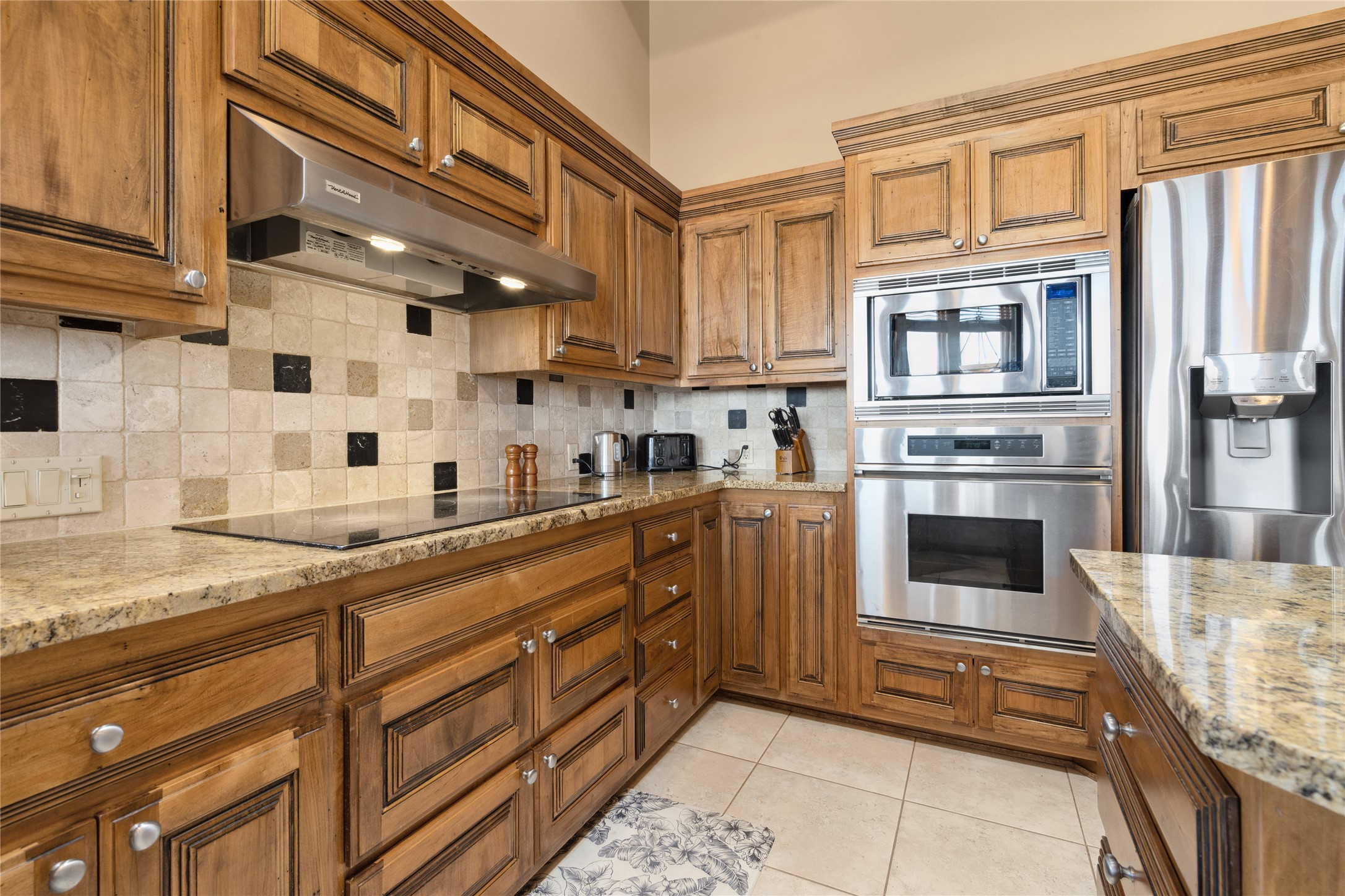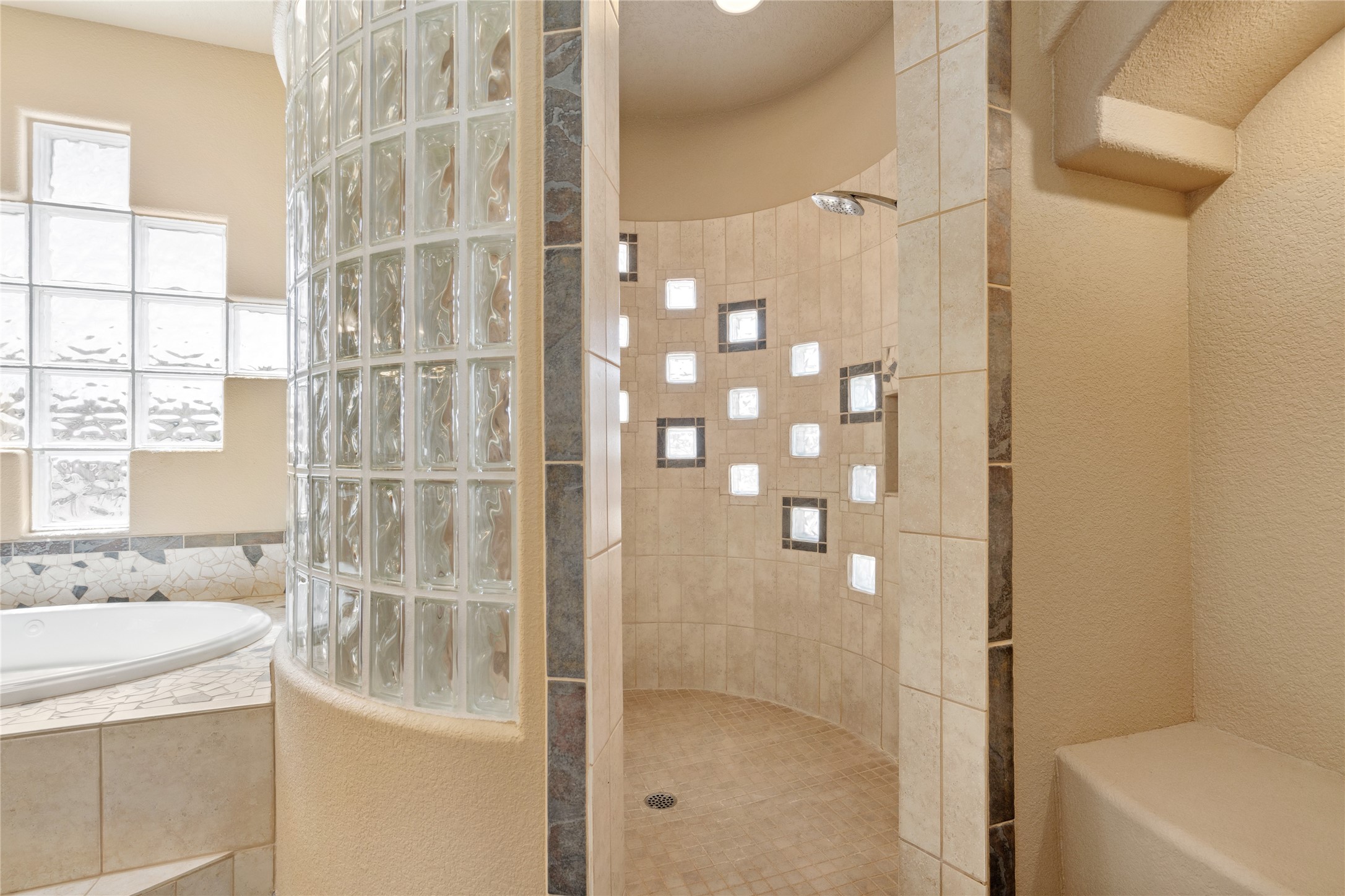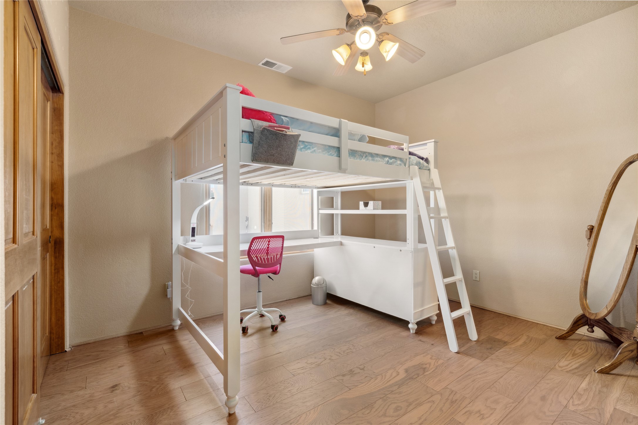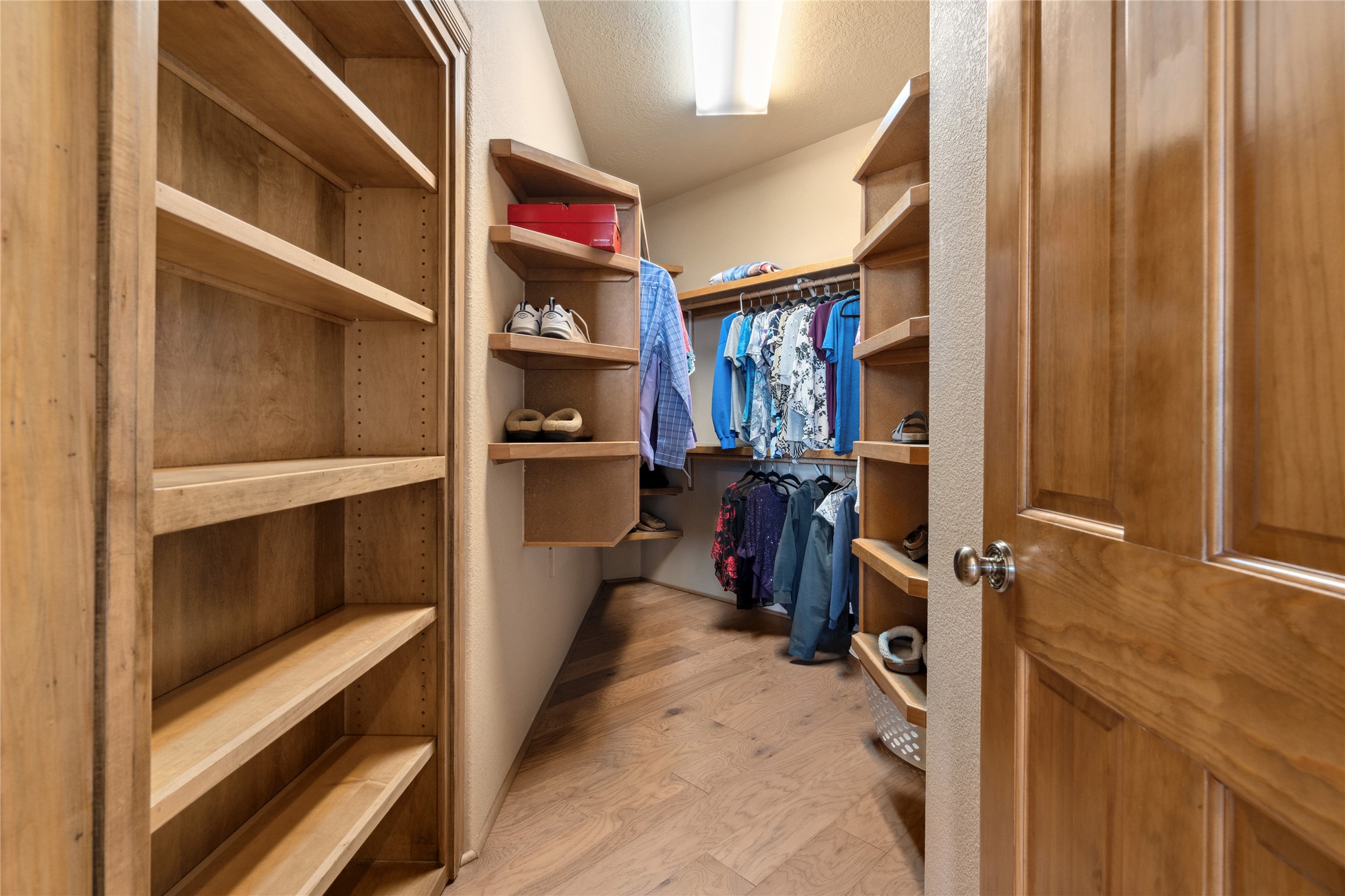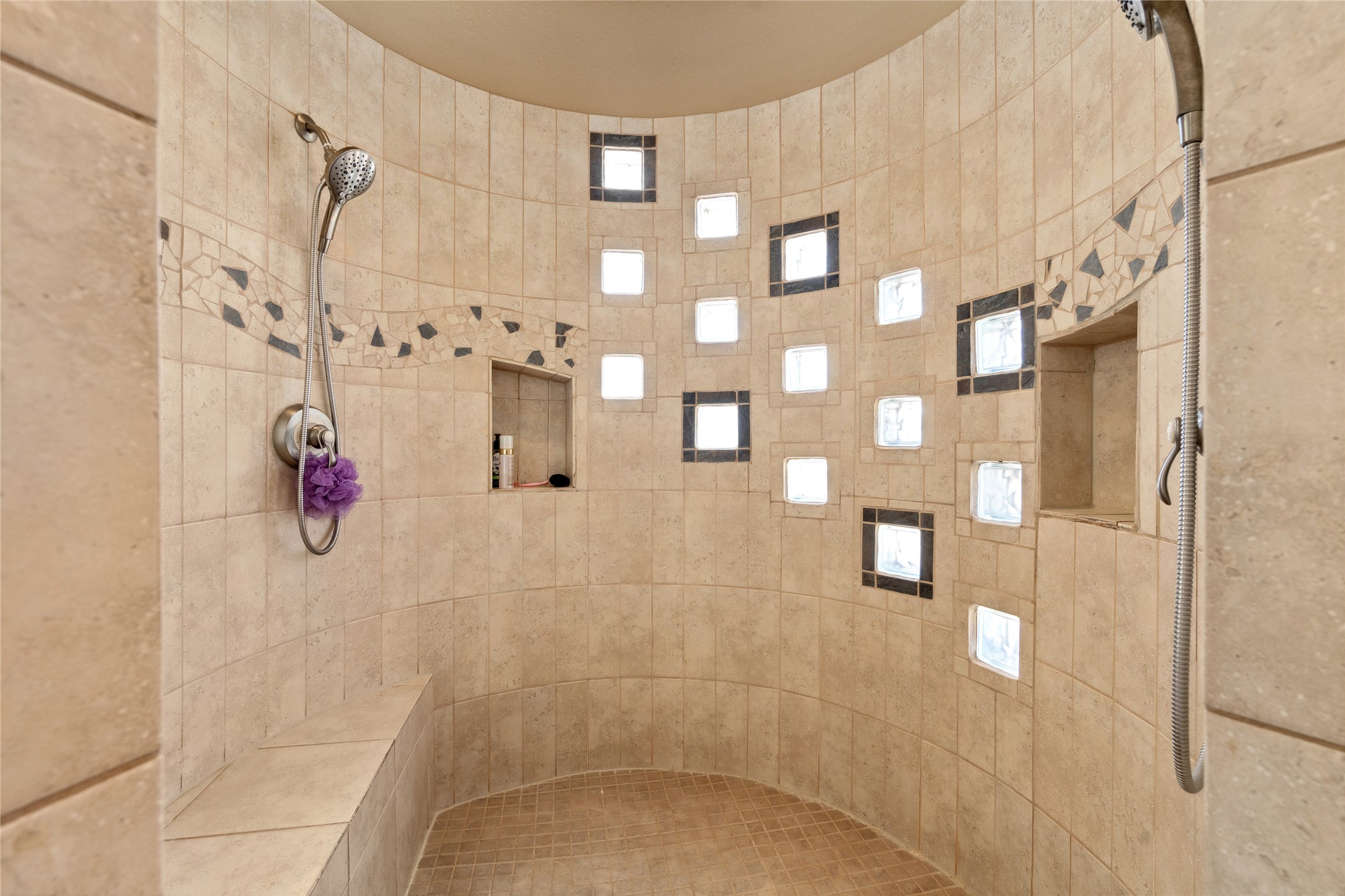 Welcome to this exceptional one-owner custom home, nestled in the coveted Estates section of Rancho Viejo. Set on a generous one-acre view lot, this thoughtfully designed single-level home offers 2,369 square feet of refined Southwest living. From the moment you enter, you'll be captivated by the stunning wood ceilings with vigas, artful nichos, and built-in shelving that blend function with authentic Santa Fe character. A dramatic two-sided gas fireplace anchors the living and dining areas, where a curved wall of windows frames breathtaking Jemez Mountain views. The well-appointed kitchen is a chef's delight, featuring custom wood cabinetry, luxurious granite counters, a stone tile backsplash, and premium appliances including a Dacor cooktop and wall oven, plus a Bosch dishwasher. The home's smart layout offers privacy and comfort, with a dedicated office and a spacious owner's suite in one wing. Enjoy a spa-like bathroom with dual vanities and a large, distinctive walk-in shower plus soaking tub, an oversized walk-in closet with safe cubby, and direct access to the rear portal from the serene primary bedroom. The opposite wing includes three additional bedrooms (one used as a hobby room), a stylish guest bath, a powder room, and a well-equipped laundry area. Outside, the landscaped backyard is a true retreat, complete with artistic custom flagstone patios, a soothing water feature, dramatic natural boulders, and a hot tub--perfect for relaxing under the stars. The oversized three-car garage includes space for a workshop or extra storage. Lovingly maintained and rich in Southwest charm, this home offers privacy, views, and elegant livability in one of Santa Fe's most desirable neighborhoods.
