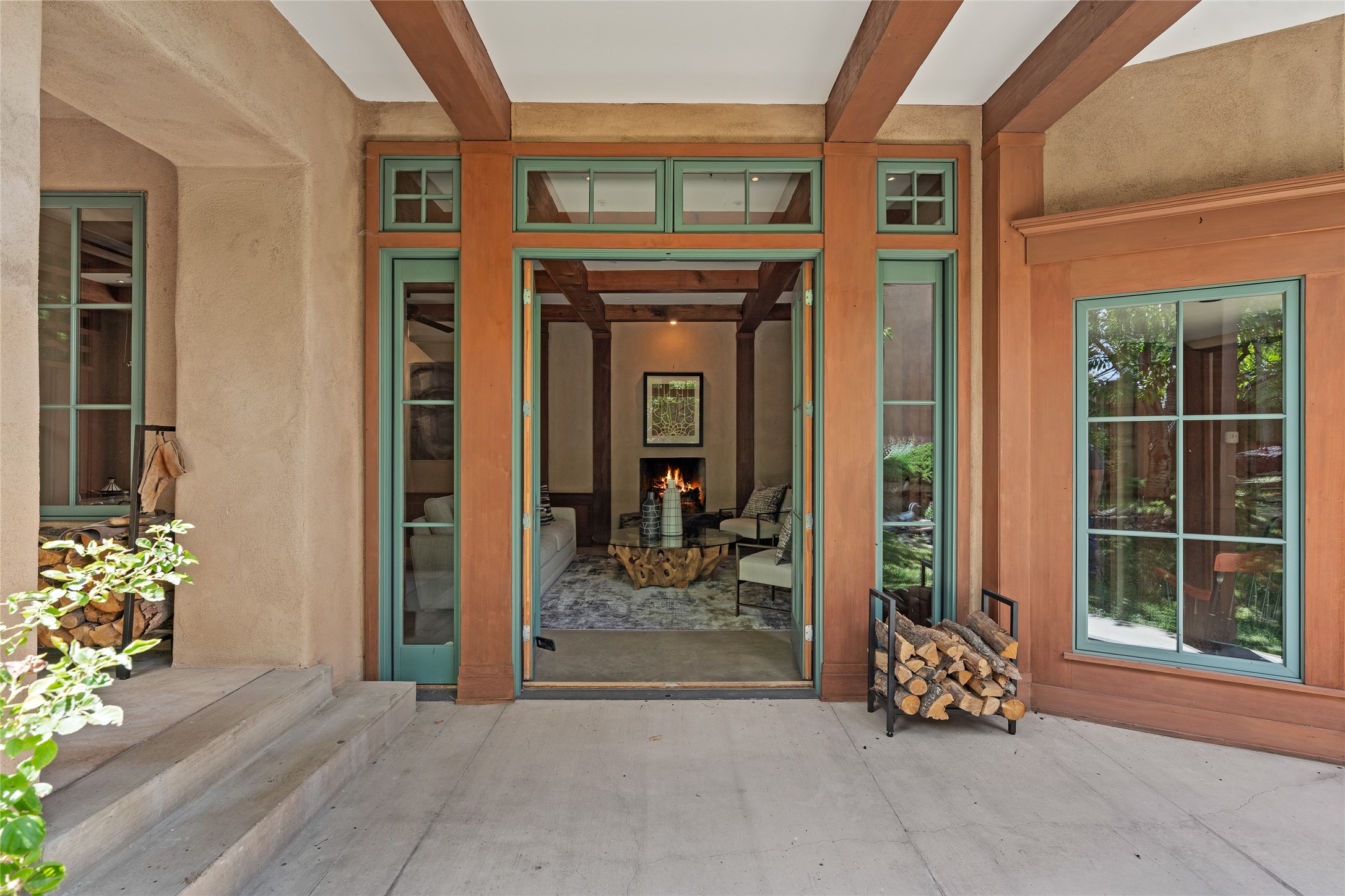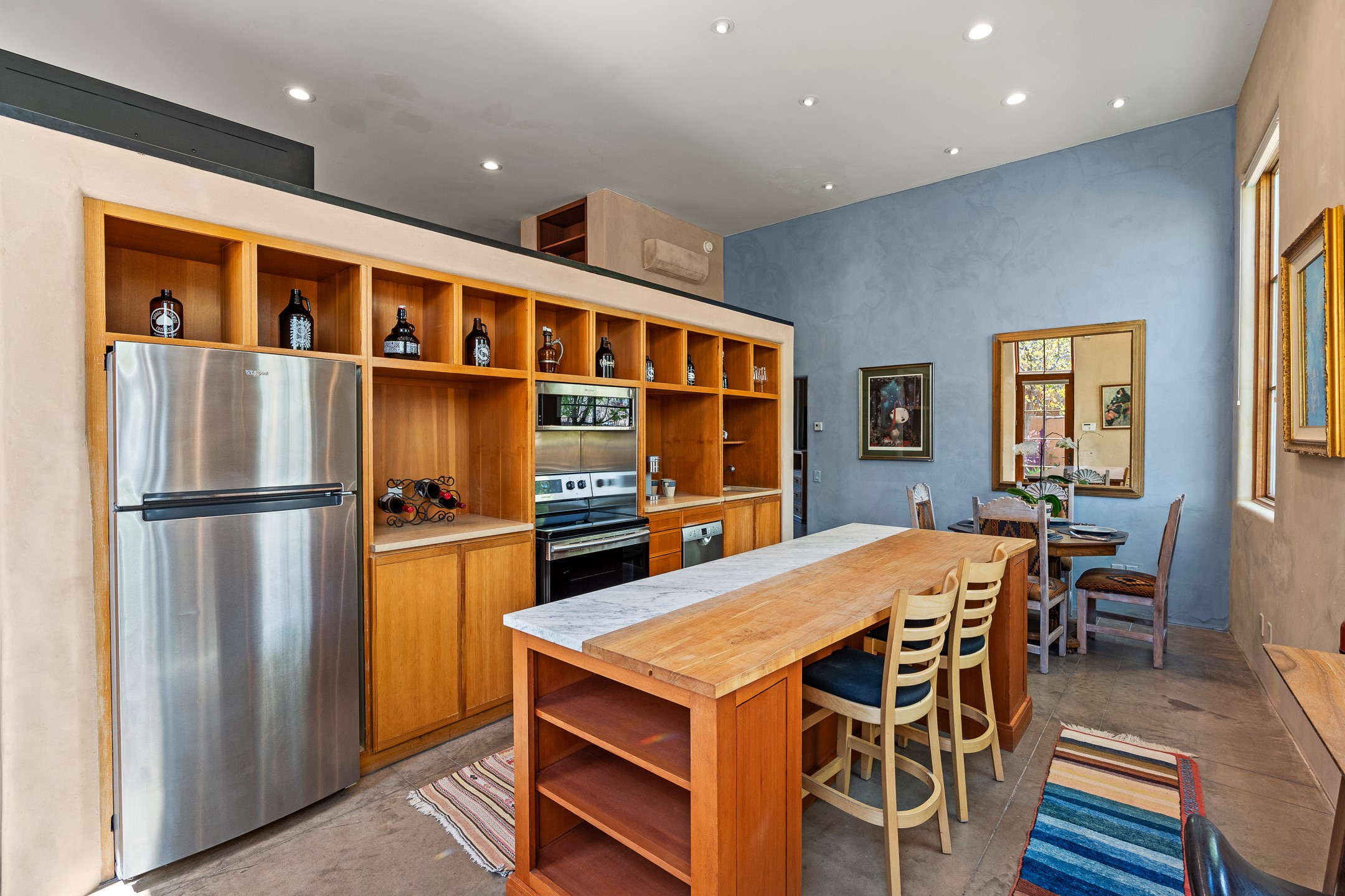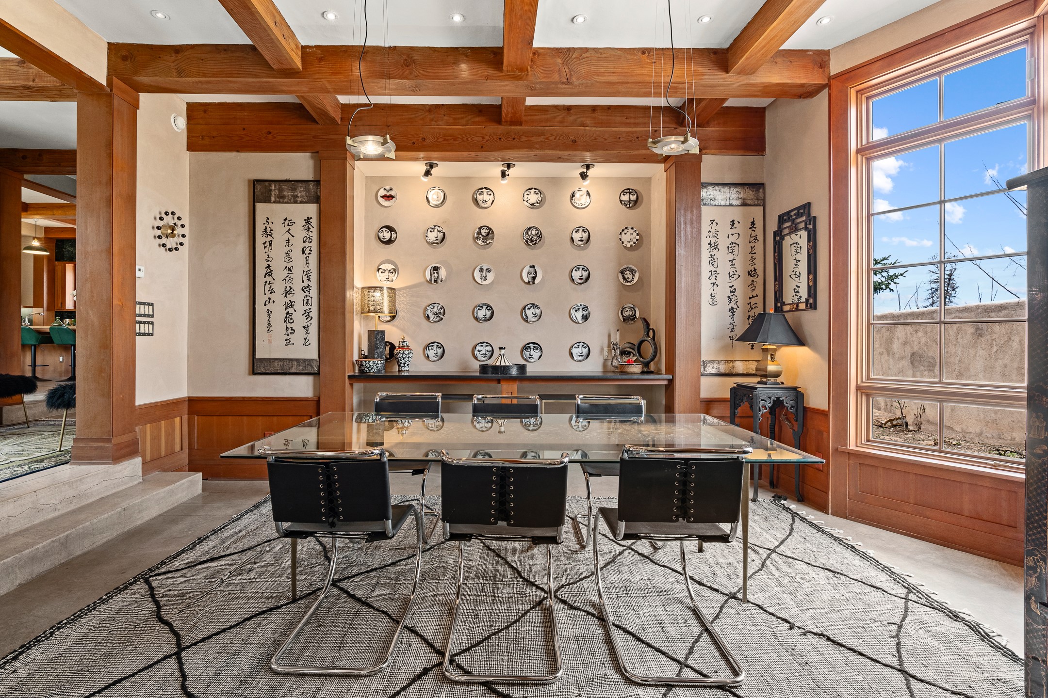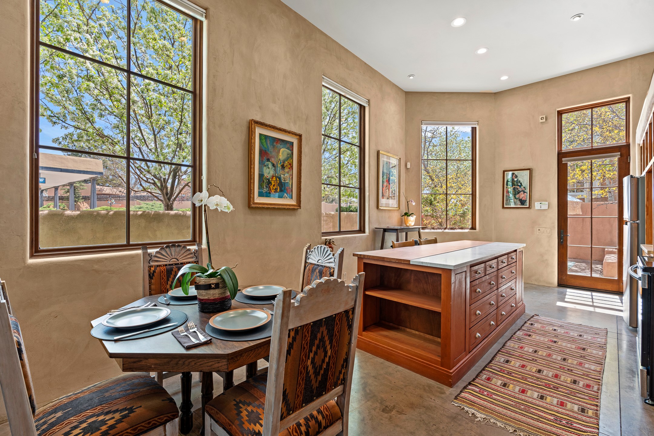 A rare and refined offering in the heart of Santa Fe, this extraordinary 6-bedroom, 6-bath gated compound is a seamless blend of architectural brilliance, design sophistication, and functional versatility. Encompassing two distinctive yet complementary residences, this private estate is nestled in the coveted South Capitol and Eastside neighborhoods--just moments from the Plaza, Canyon Road, museums, and Santa Fe's world-class dining and shopping.The main residence is a serene 4-bedroom, 4-bath sanctuary where timeless elegance meets exceptional craftsmanship. Soaring ceilings, natural American Clay plaster walls, and Douglas Fir coffered wood beam ceilings enhance the grand interiors, while floor-to-ceiling transom windows invite in abundant light. The stunning chef's kitchen--complete with Subzero refrigerator and new Viking appliances--opens to a beautifully landscaped central courtyard with a tranquil waterfall fountain, lush gardens, alfresco dining areas, and multiple verandas perfect for entertaining.The gracious living and dining rooms are anchored by a natural stone fireplace and expansive glass doors overlooking a verdant courtyard adorned with mature Wisteria, Aspen, and Cherry trees. Upstairs, the luxurious primary suite features breathtaking views of Picacho Peak, a spa-like bathroom with Jacuzzi tub, steam shower, and private rooftop terrace with fireplace, cedar hot tub, sauna, and wrap-around deck.The adjacent property, designed by an architect for both residential and commercial use, adds a flexible 2-3 bedroom, 2-bath layout ideal for live/work functionality, a creative studio, or income-generating rental. It features 12-foot ceilings, expansive windows, radiant in-floor heating, mini split A/C systems, a modern kitchen with polished granite countertops, and a spacious open-concept living area.Together, these two properties form a unique and cohesive compound with separate utility metering, multiple private entrances, 2.5-car garage plus two additional parking spaces, and the rare opportunity to live, work, and entertain in one of Santa Fe's most desirable locations. Whether as a private estate, multi-generational retreat, or mixed-use investment, this compound is a true Santa Fe masterpiece.These properties may be purchased together as a compound or separately. For individual details, please see listing MLS# 202501407 and MLS# 202501401.