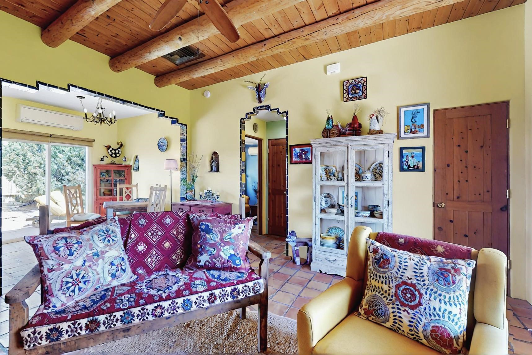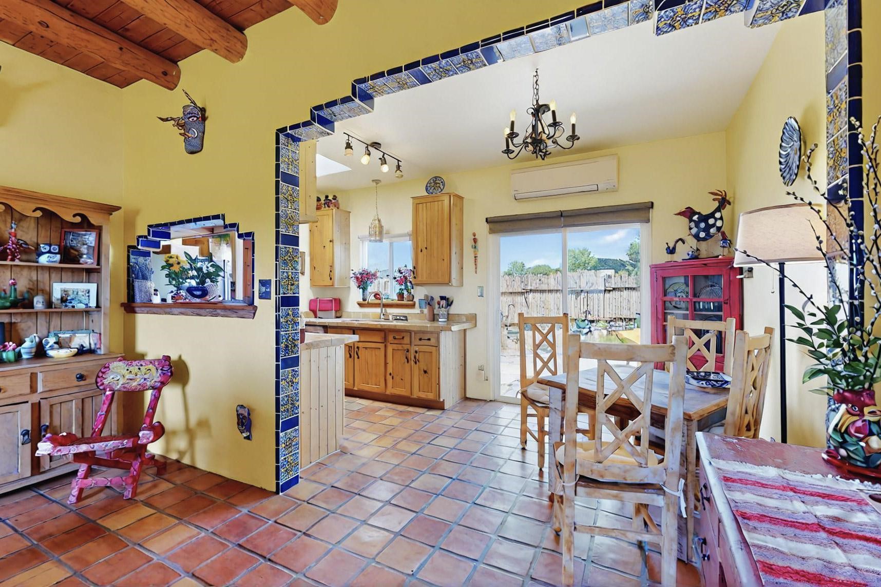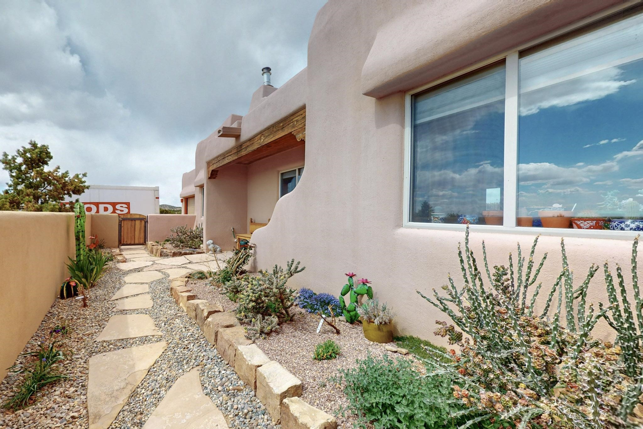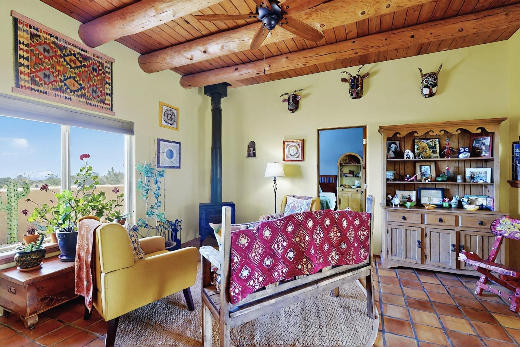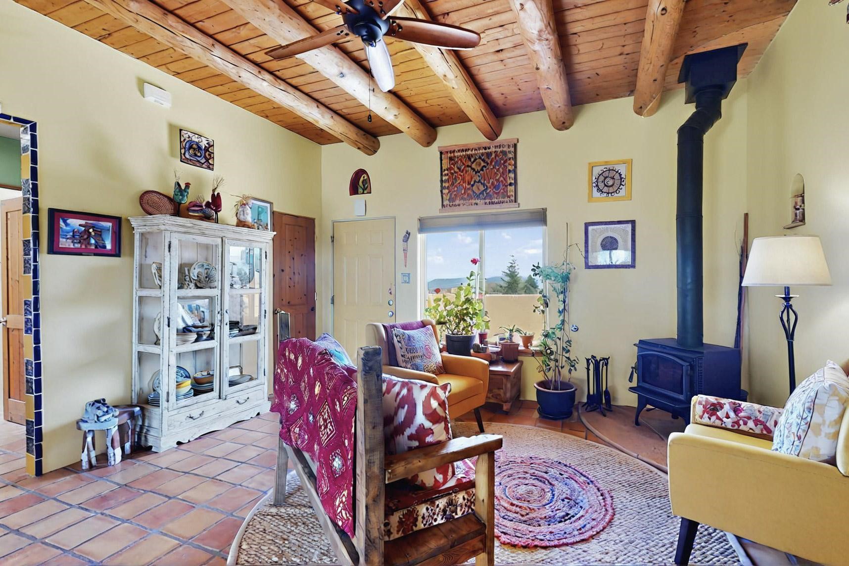 Absolutely delightful blend of Santa Fe charm and Mexico spice inside and out. Popular split bedroom design oozing with character, this home is like new. Gleaming Saltillo tile floors, re stuccoed, a synthetic roof with a 10 year warranty, plus re plumbed pex domestic piping all done in 2023. 4 Daikin mini splits were installed with 2 condensers to replace the radiant heating and add air-conditioning, plus a wood burning stove in the living room for cosy winters. The kitchen and both bathrooms were also delightfully remodeled. Outside the coyote fence was upgraded, landscape added and a second dog coyote fenced area built plus a storage shed added. The driveway, front wall and fencing added to create an ambient entry. Wow! This home is sparkling and move in ready close to local shopping, Eldorado amenities, library, school, senior center and only minutes into Santa Fe.
