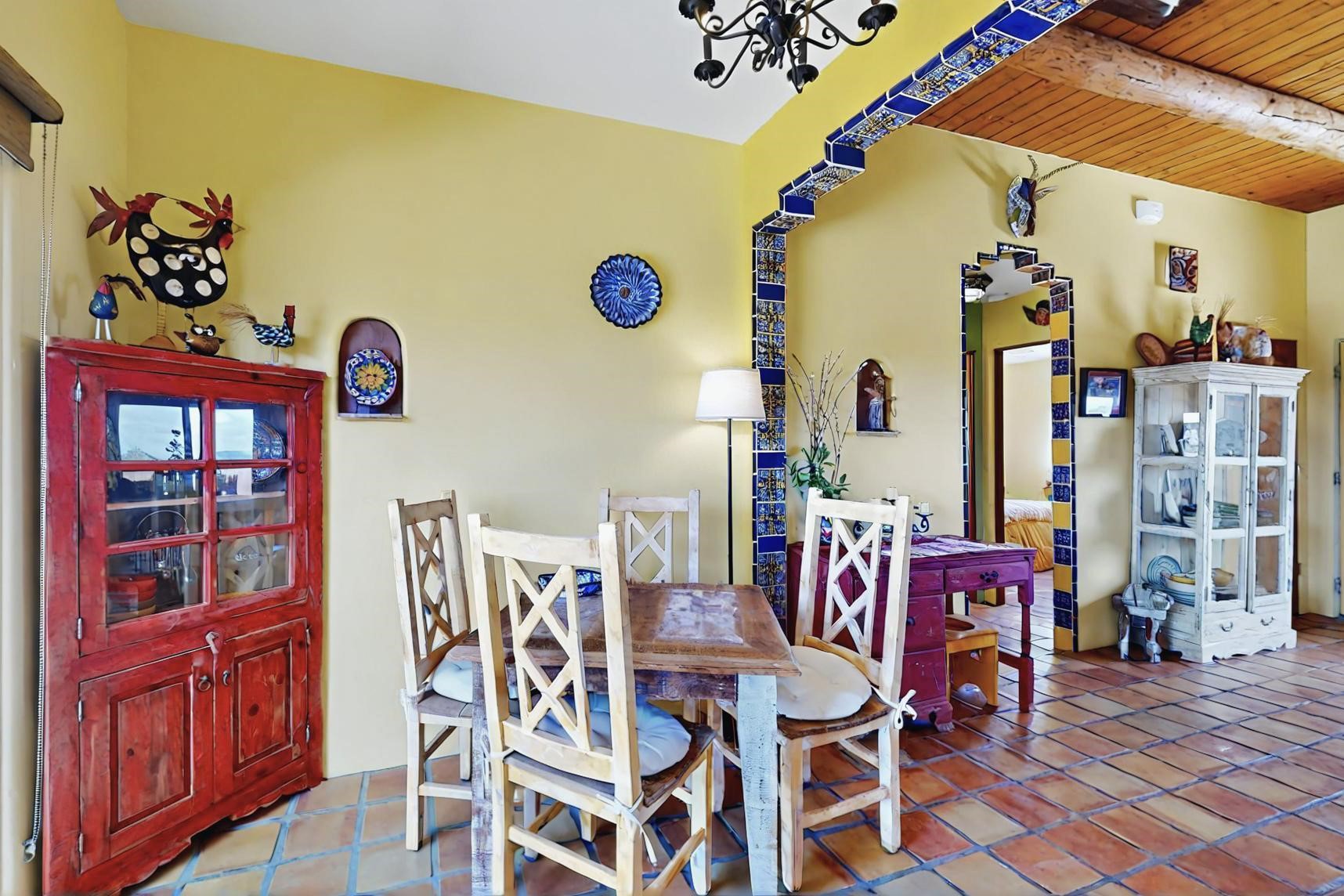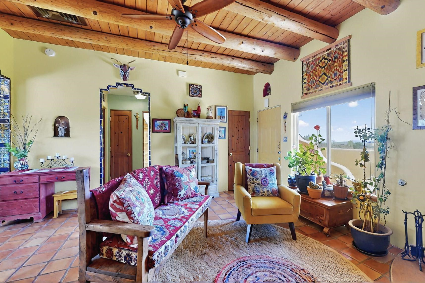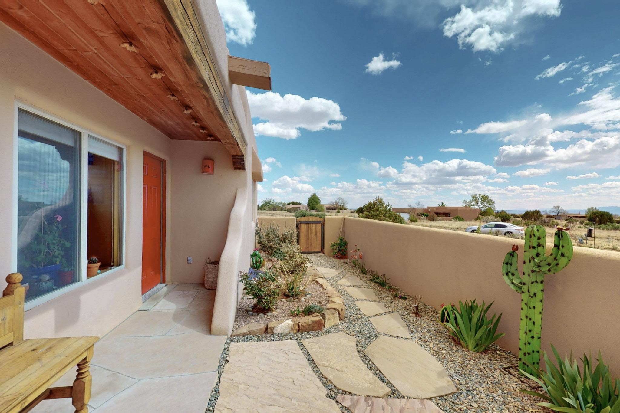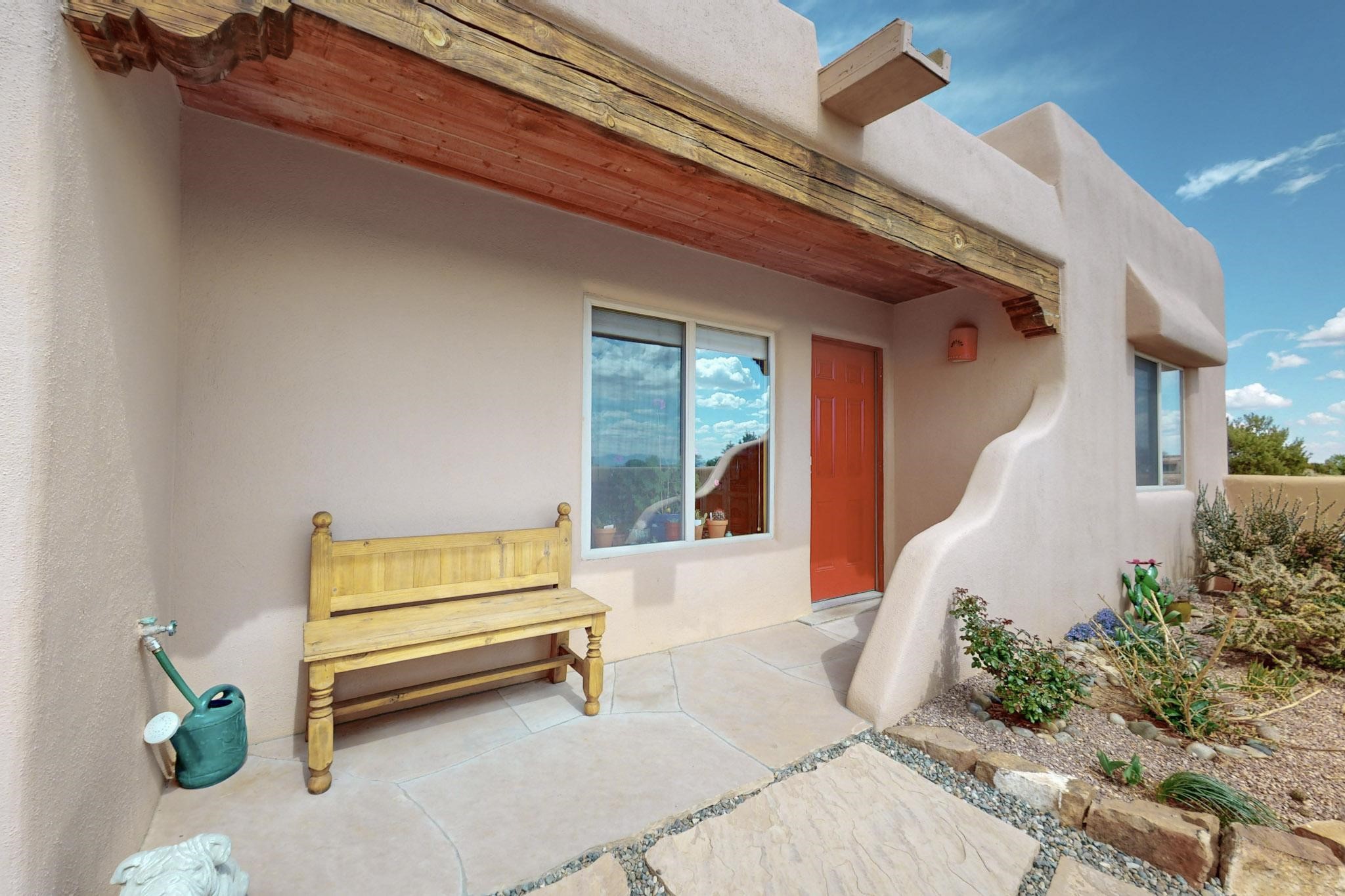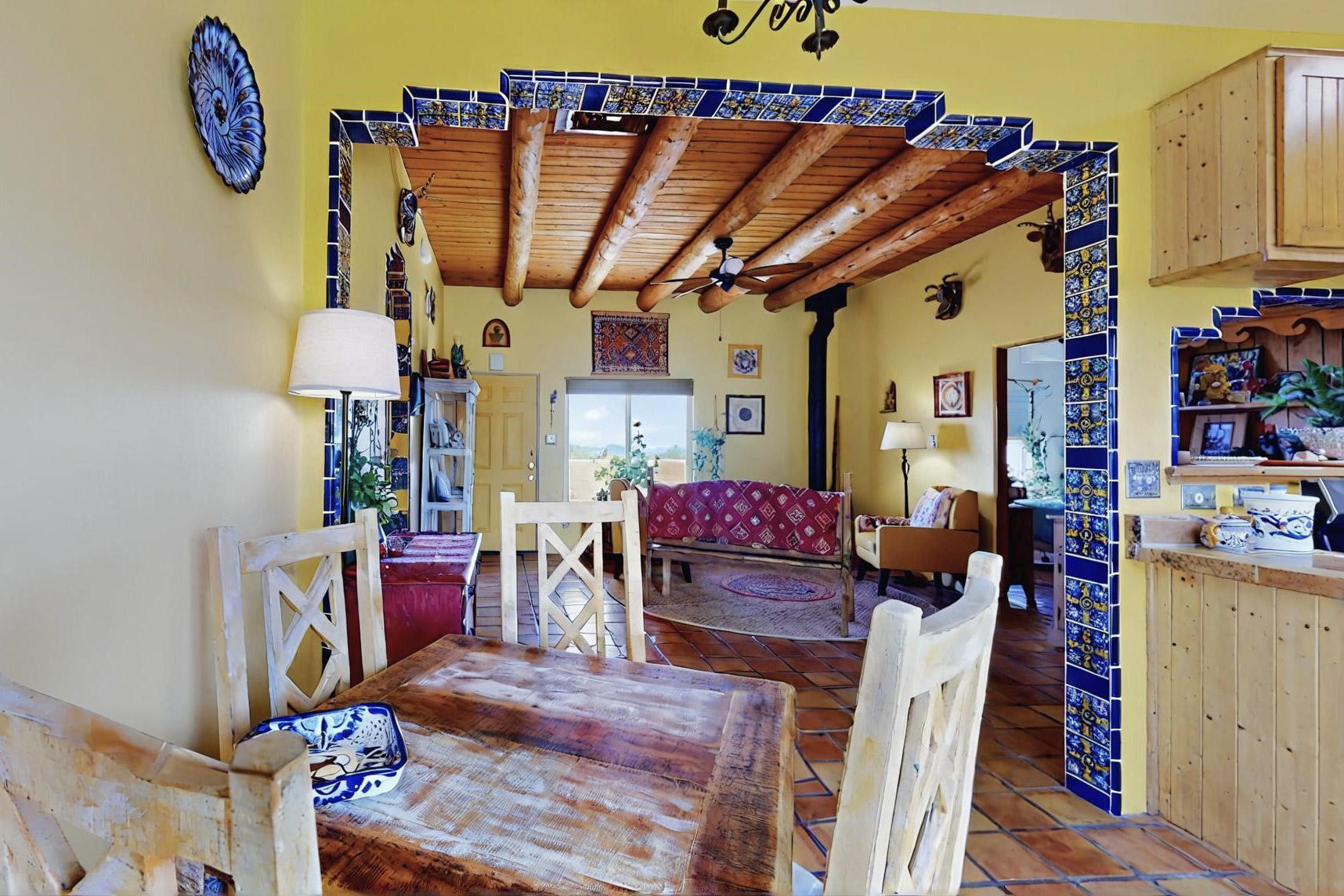 Absolutely delightful blend of Santa Fe charm and Mexico spice inside and out. Popular split bedroom design oozing with character, this home is like new. Gleaming Saltillo tile floors, re stuccoed, a synthetic roof with a 10 year warranty, plus re plumbed pex domestic piping all done in 2023. 4 Daikin mini splits were installed with 2 condensers to replace the radiant heating and add air-conditioning, plus a wood burning stove in the living room for cosy winters. The kitchen and both bathrooms were also delightfully remodeled. Outside the coyote fence was upgraded, landscape added and a second dog coyote fenced area built plus a storage shed added. The driveway, front wall and fencing added to create an ambient entry. Wow! This home is sparkling and move in ready close to local shopping, Eldorado amenities, library, school, senior center and only minutes into Santa Fe.