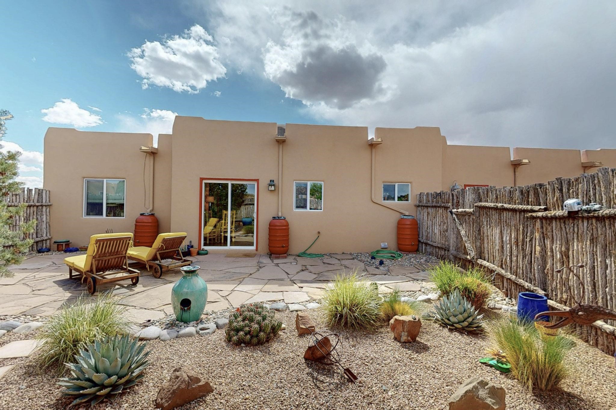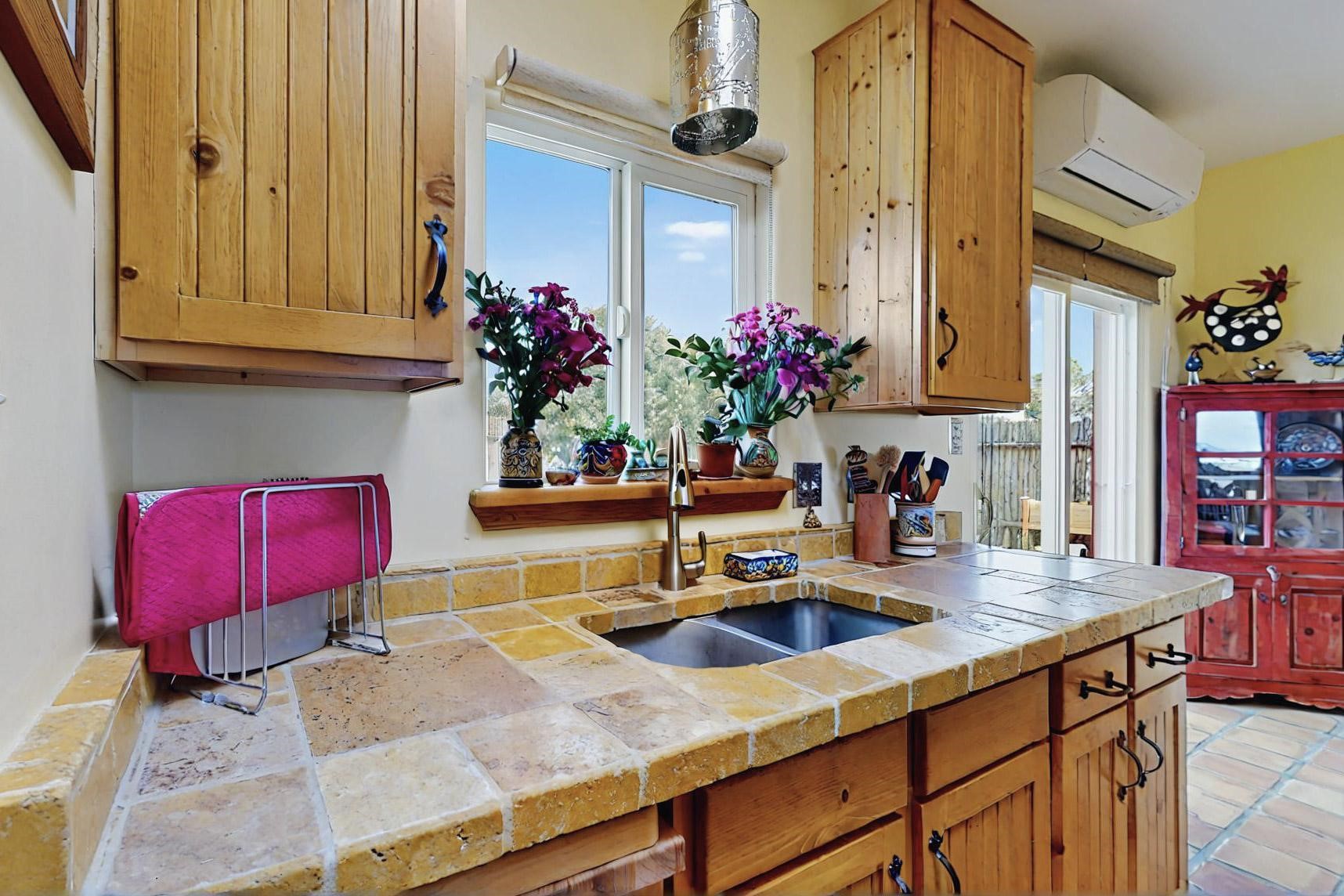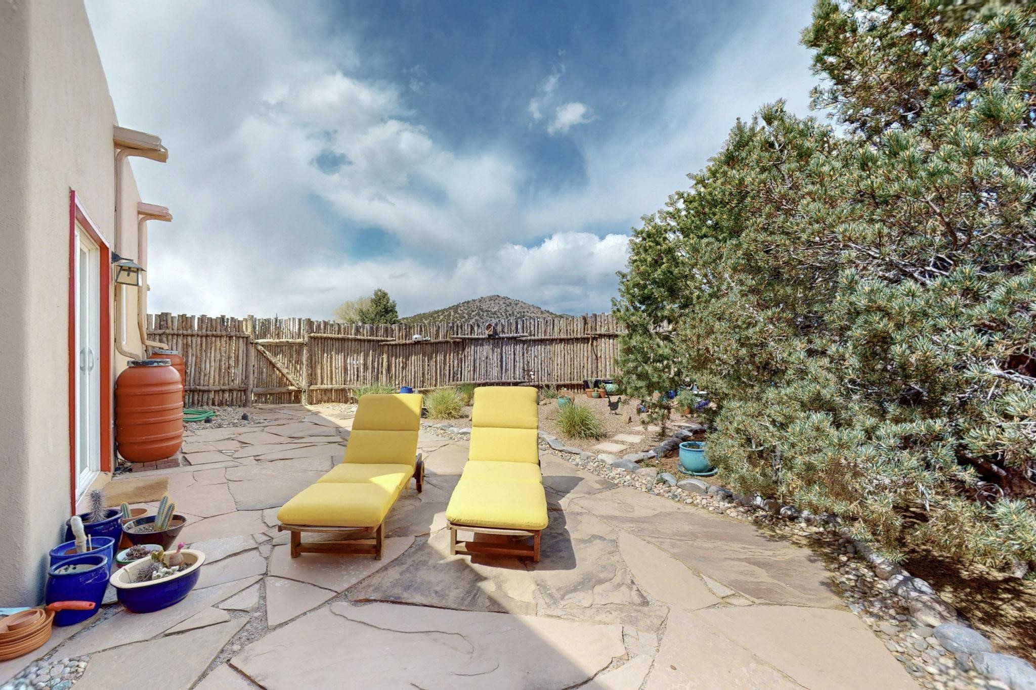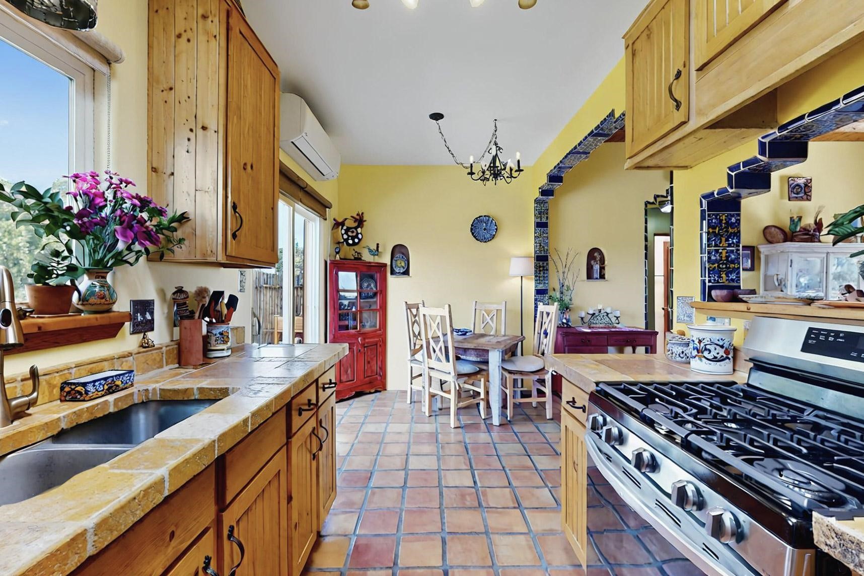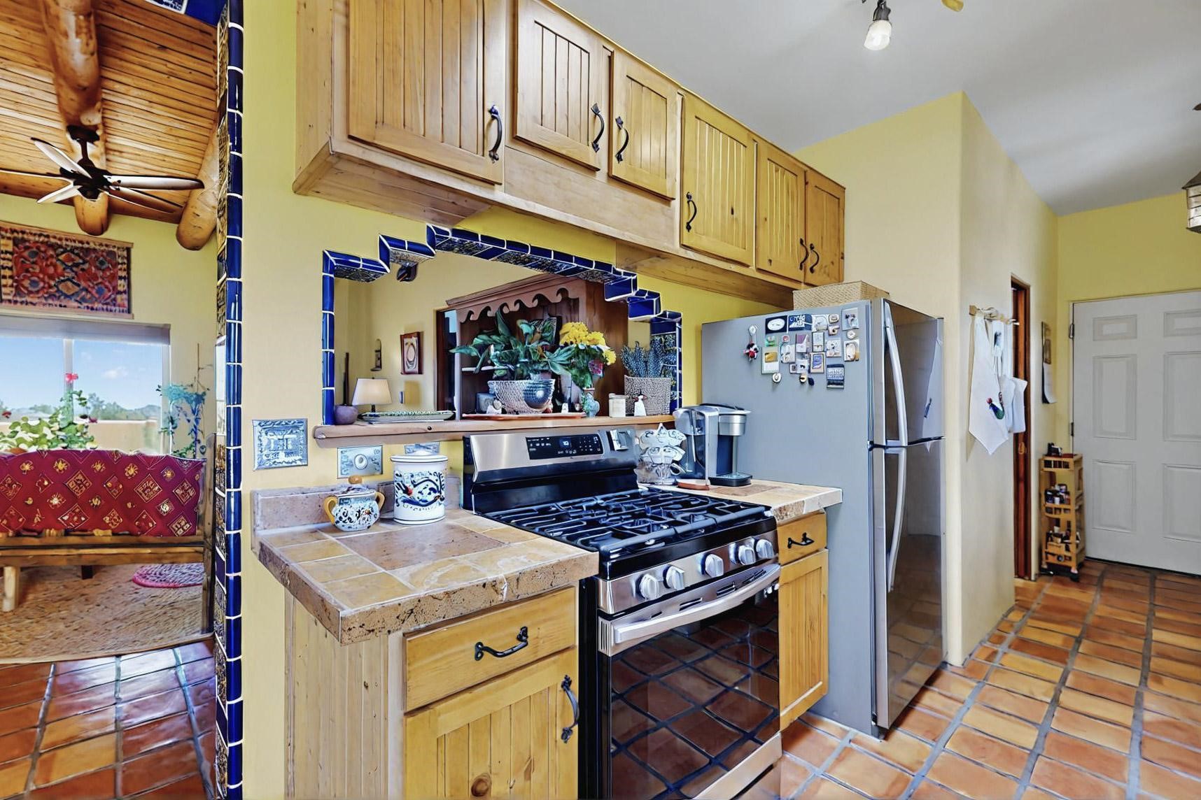 Absolutely delightful blend of Santa Fe charm and Mexico spice inside and out. Popular split bedroom design oozing with character, this home is like new. Gleaming Saltillo tile floors, re stuccoed, a synthetic roof with a 10 year warranty, plus re plumbed pex domestic piping all done in 2023. 4 Daikin mini splits were installed with 2 condensers to replace the radiant heating and add air-conditioning, plus a wood burning stove in the living room for cosy winters. The kitchen and both bathrooms were also delightfully remodeled. Outside the coyote fence was upgraded, landscape added and a second dog coyote fenced area built plus a storage shed added. The driveway, front wall and fencing added to create an ambient entry. Wow! This home is sparkling and move in ready close to local shopping, Eldorado amenities, library, school, senior center and only minutes into Santa Fe.