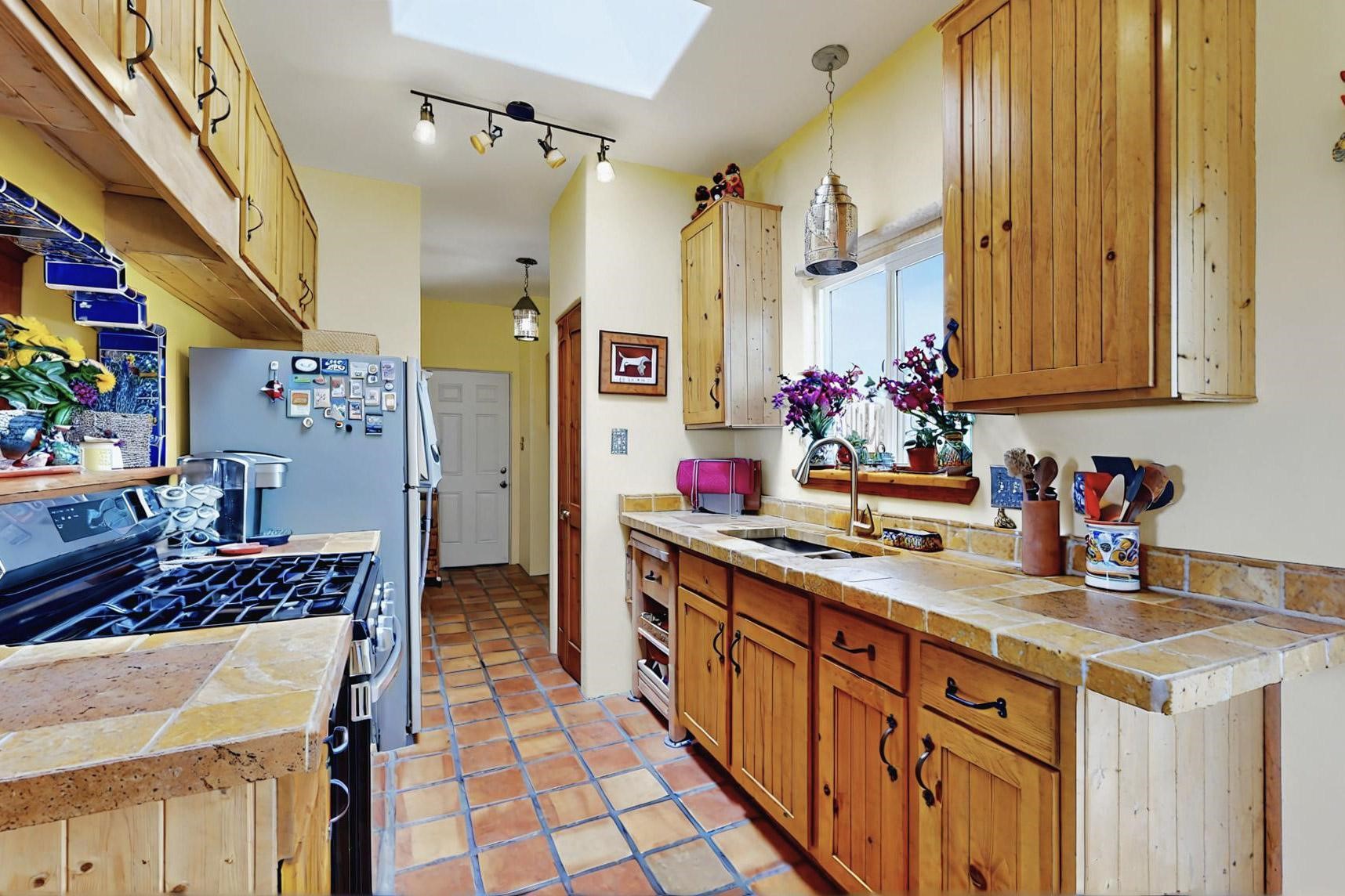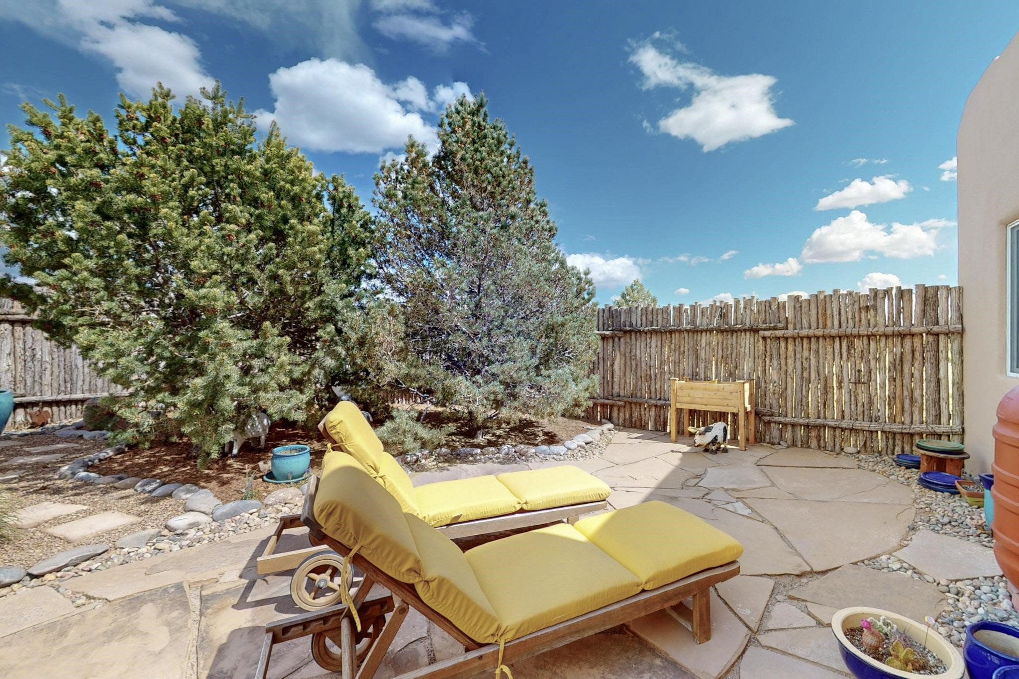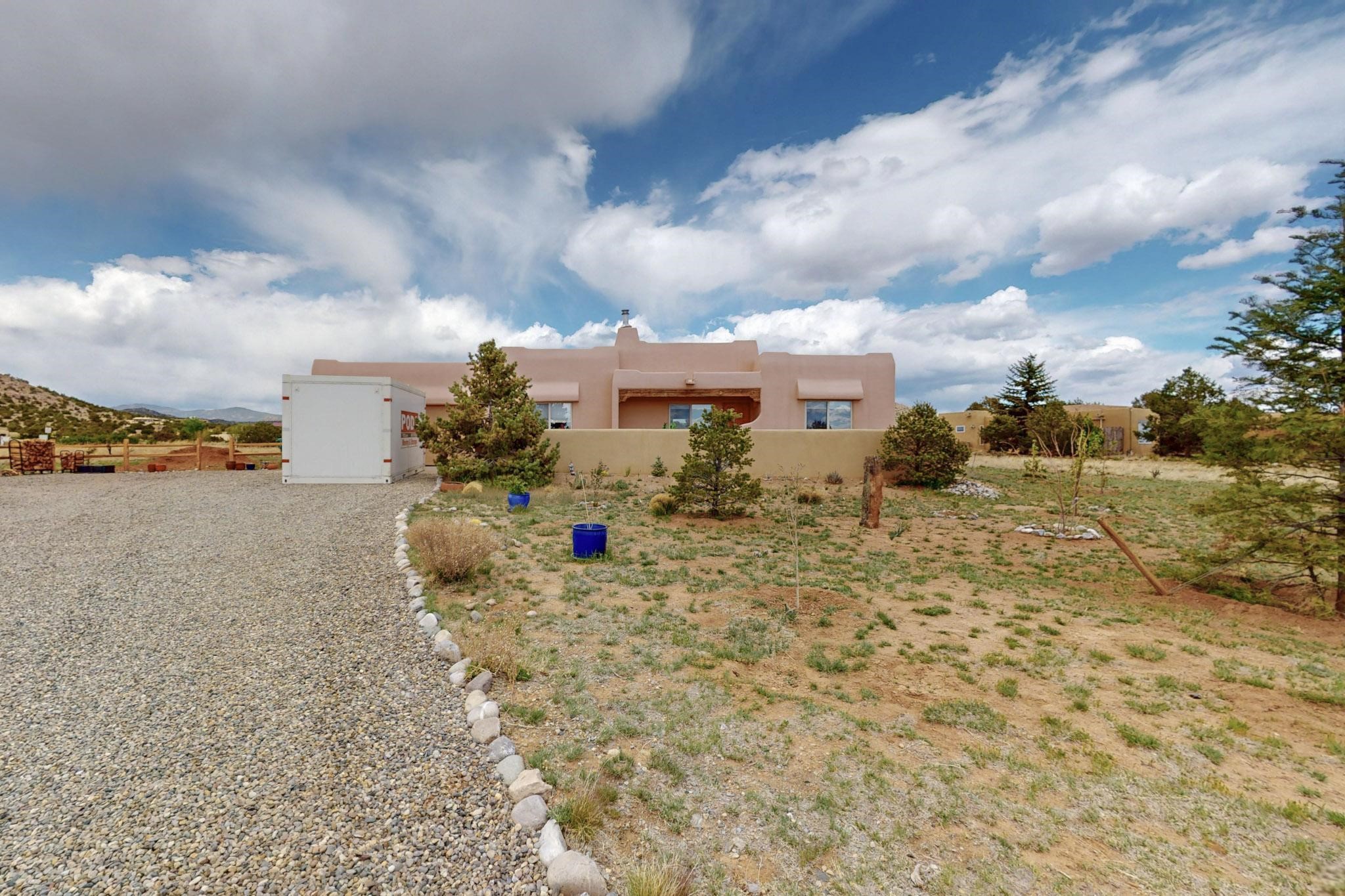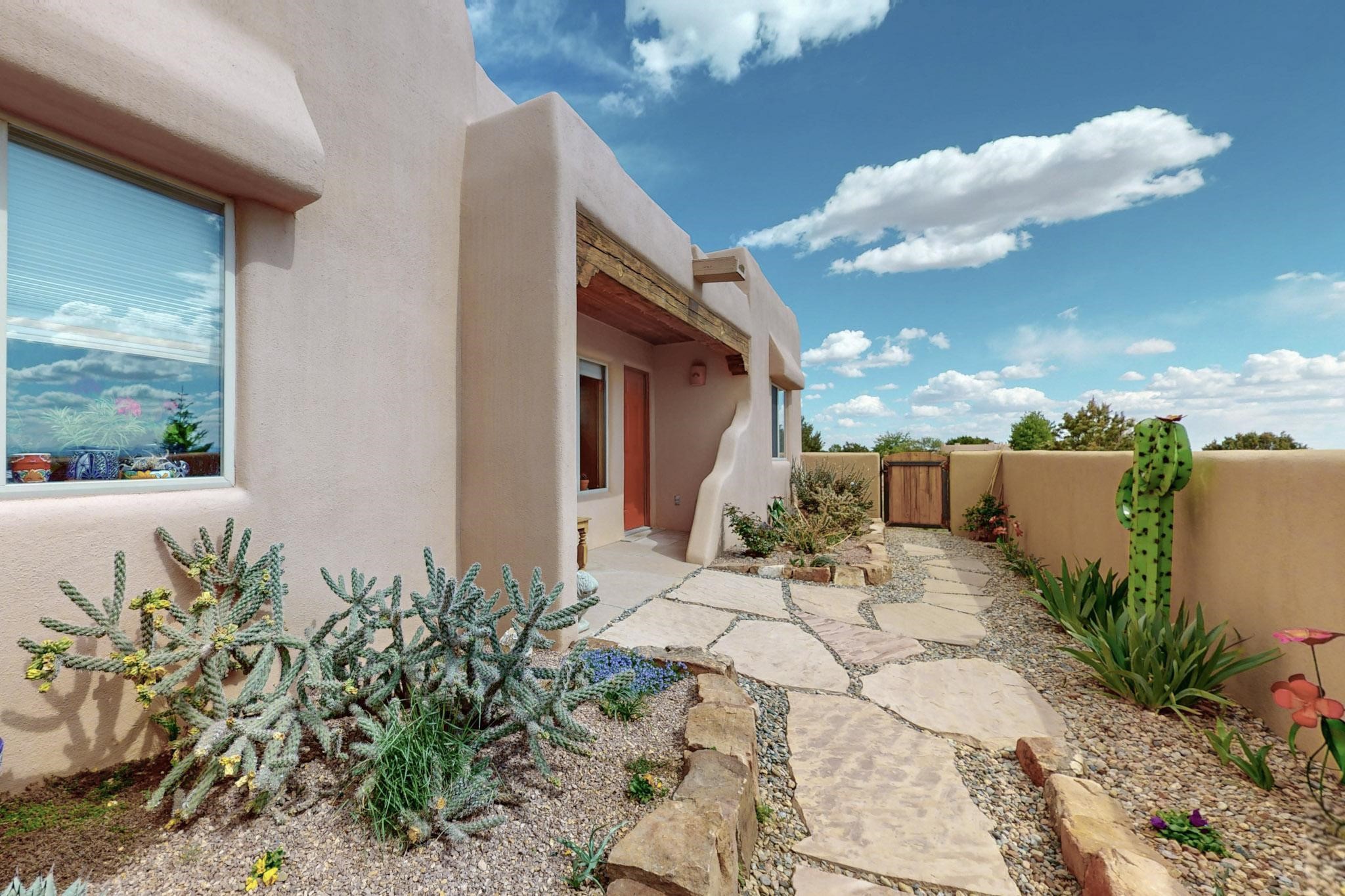 Absolutely delightful blend of Santa Fe charm and Mexico spice inside and out. Popular split bedroom design oozing with character, this home is like new. Gleaming Saltillo tile floors, re stuccoed, a synthetic roof with a 10 year warranty, plus re plumbed pex domestic piping all done in 2023. 4 Daikin mini splits were installed with 2 condensers to replace the radiant heating and add air-conditioning, plus a wood burning stove in the living room for cosy winters. The kitchen and both bathrooms were also delightfully remodeled. Outside the coyote fence was upgraded, landscape added and a second dog coyote fenced area built plus a storage shed added. The driveway, front wall and fencing added to create an ambient entry. Wow! This home is sparkling and move in ready close to local shopping, Eldorado amenities, library, school, senior center and only minutes into Santa Fe.