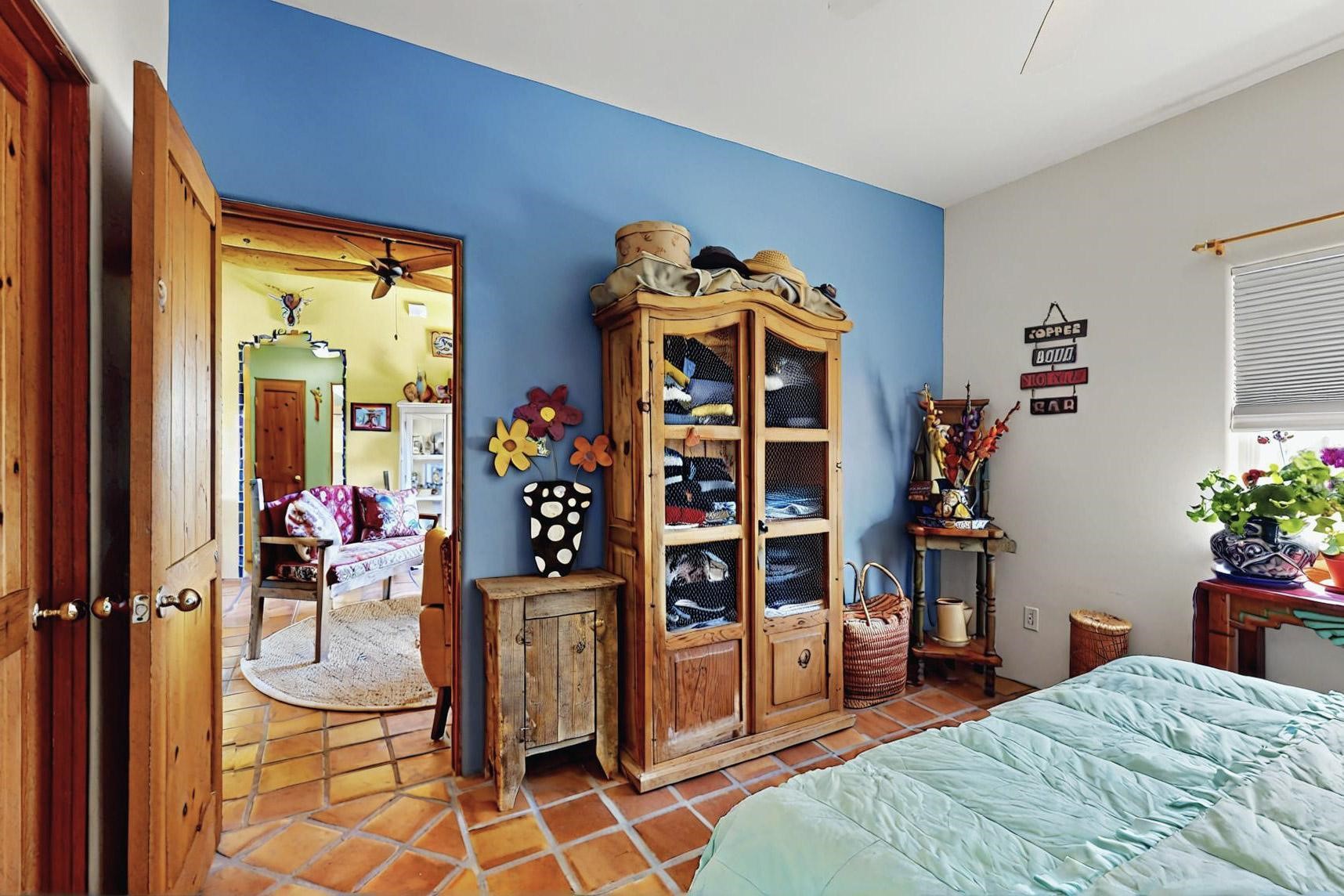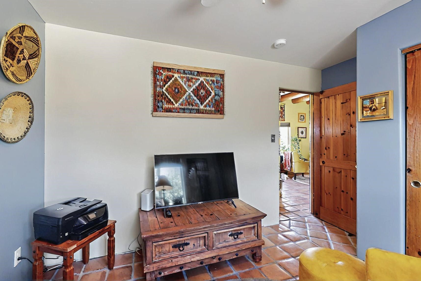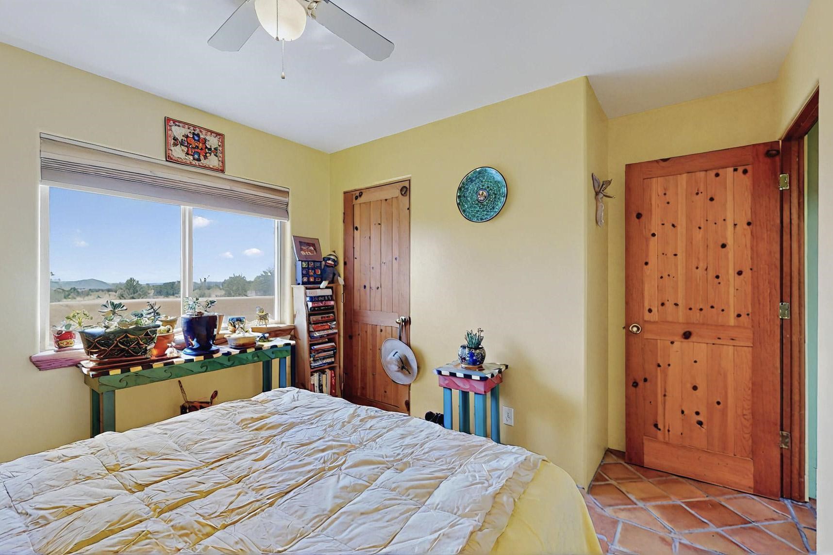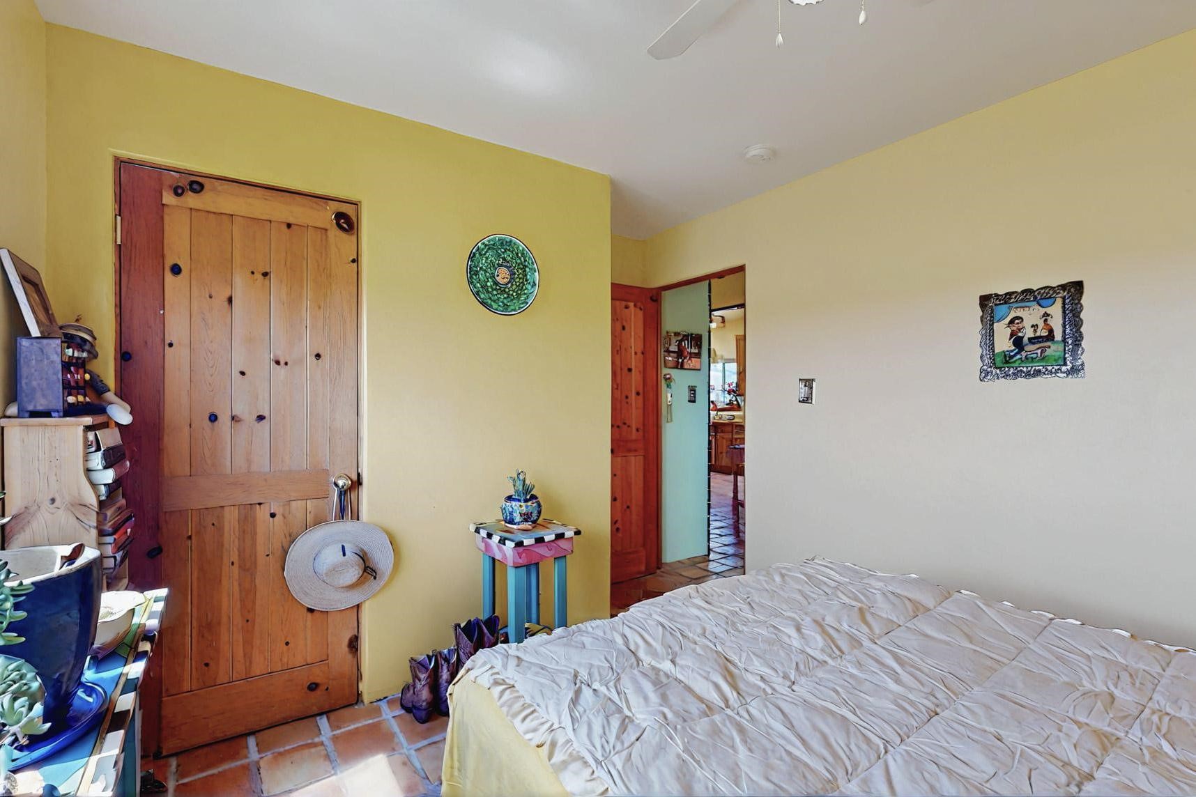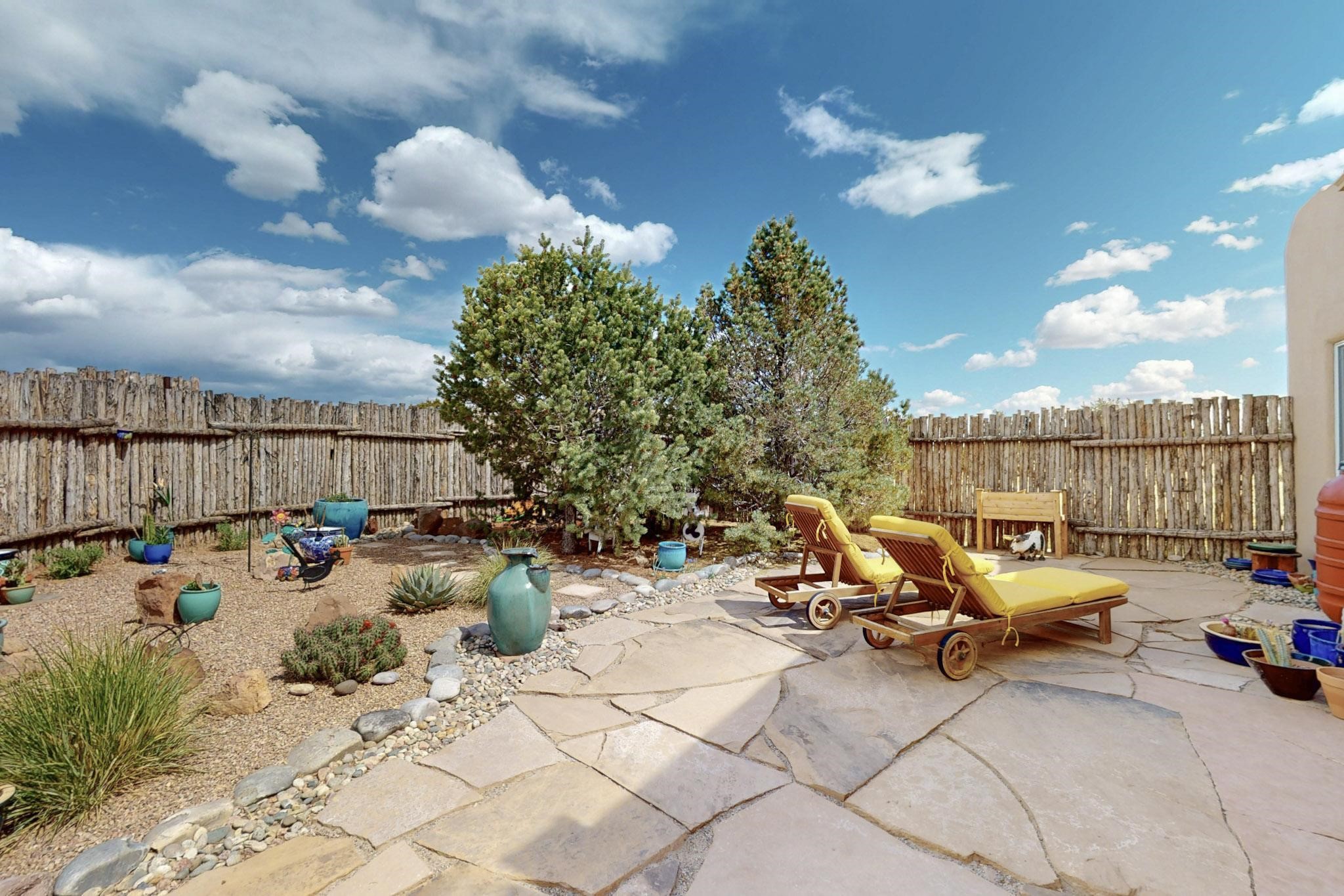 Absolutely delightful blend of Santa Fe charm and Mexico spice inside and out. Popular split bedroom design oozing with character, this home is like new. Gleaming Saltillo tile floors, re stuccoed, a synthetic roof with a 10 year warranty, plus re plumbed pex domestic piping all done in 2023. 4 Daikin mini splits were installed with 2 condensers to replace the radiant heating and add air-conditioning, plus a wood burning stove in the living room for cosy winters. The kitchen and both bathrooms were also delightfully remodeled. Outside the coyote fence was upgraded, landscape added and a second dog coyote fenced area built plus a storage shed added. The driveway, front wall and fencing added to create an ambient entry. Wow! This home is sparkling and move in ready close to local shopping, Eldorado amenities, library, school, senior center and only minutes into Santa Fe.