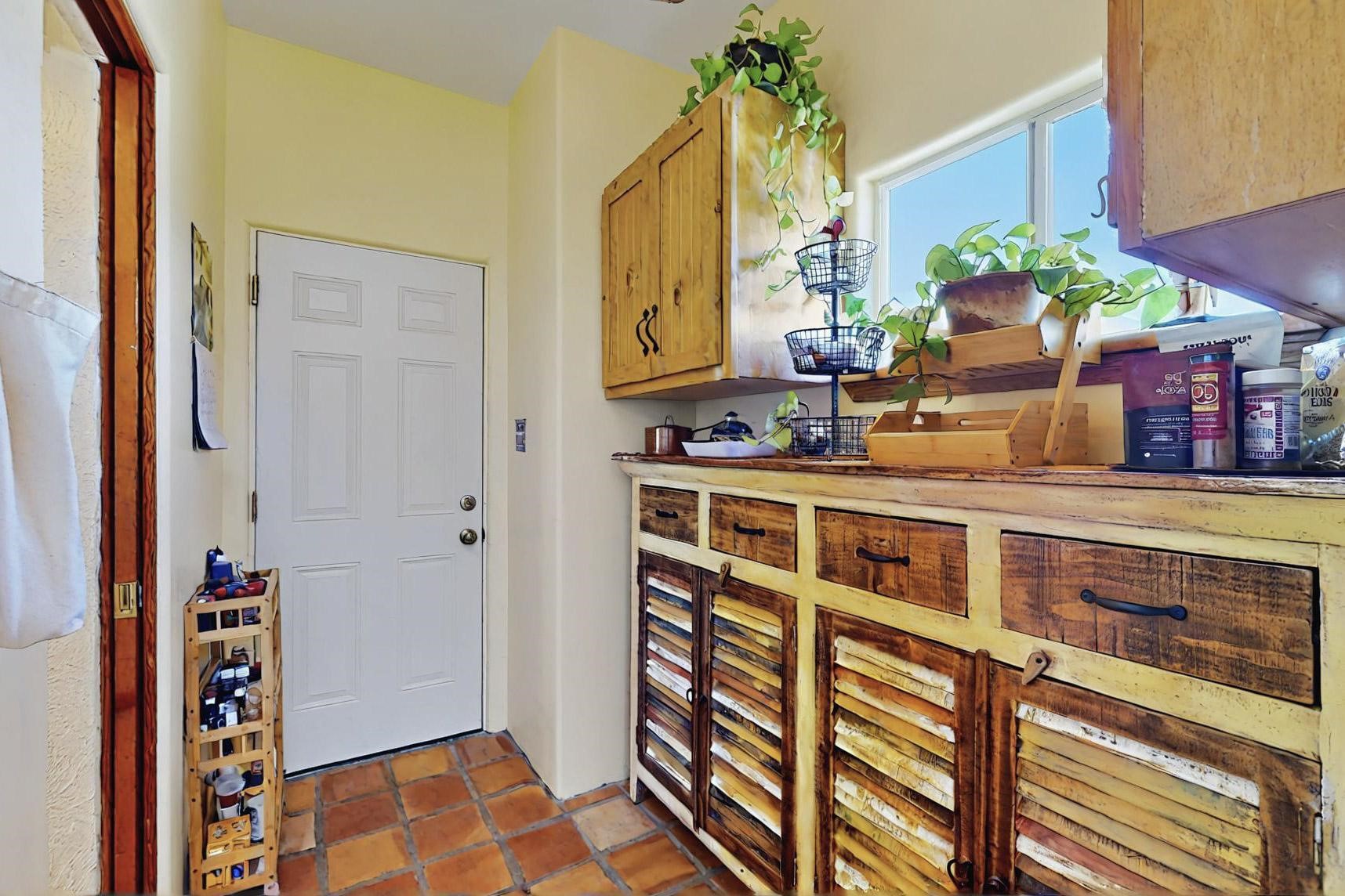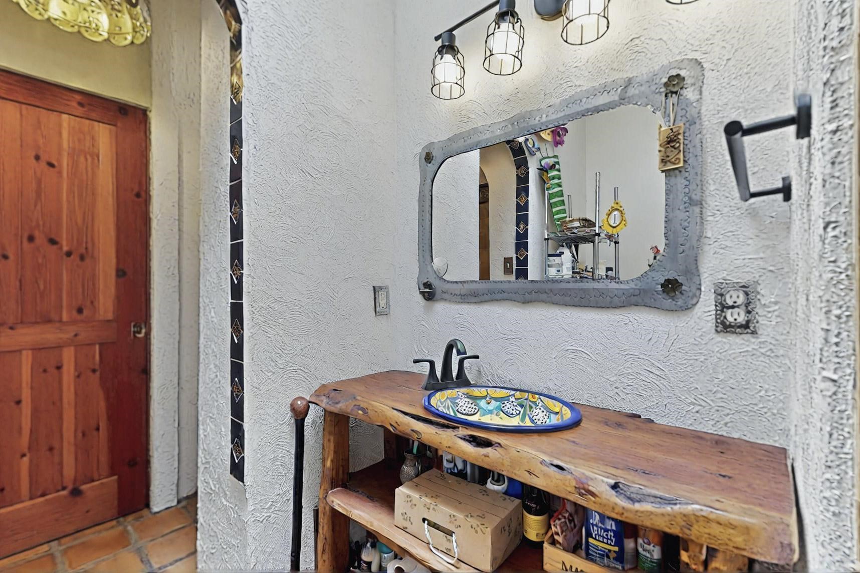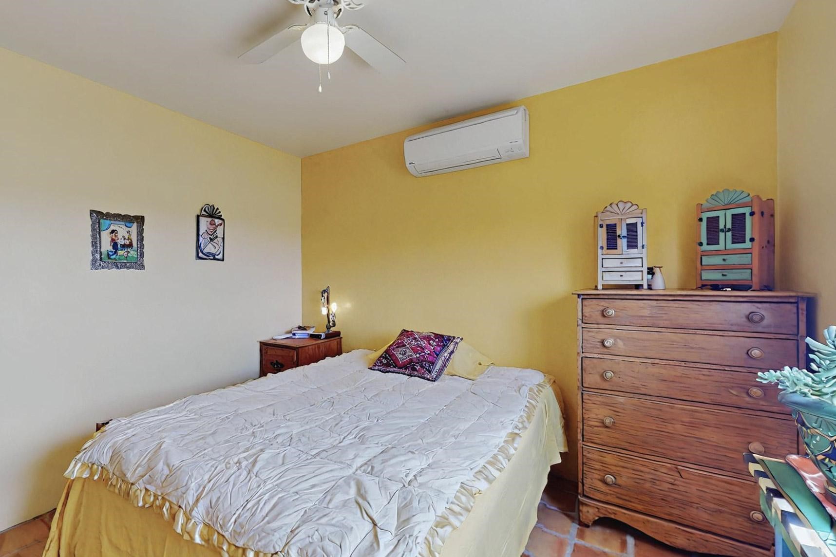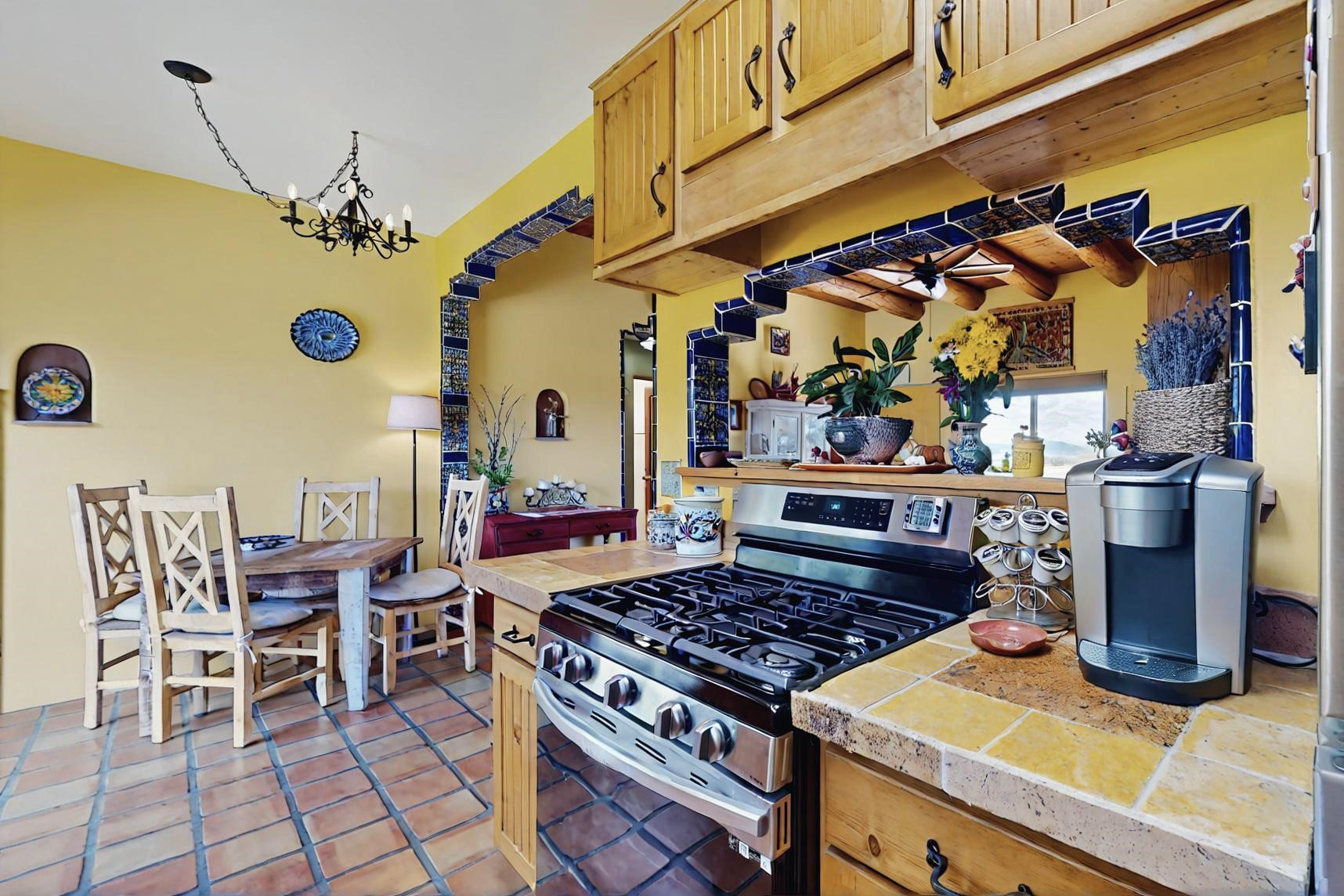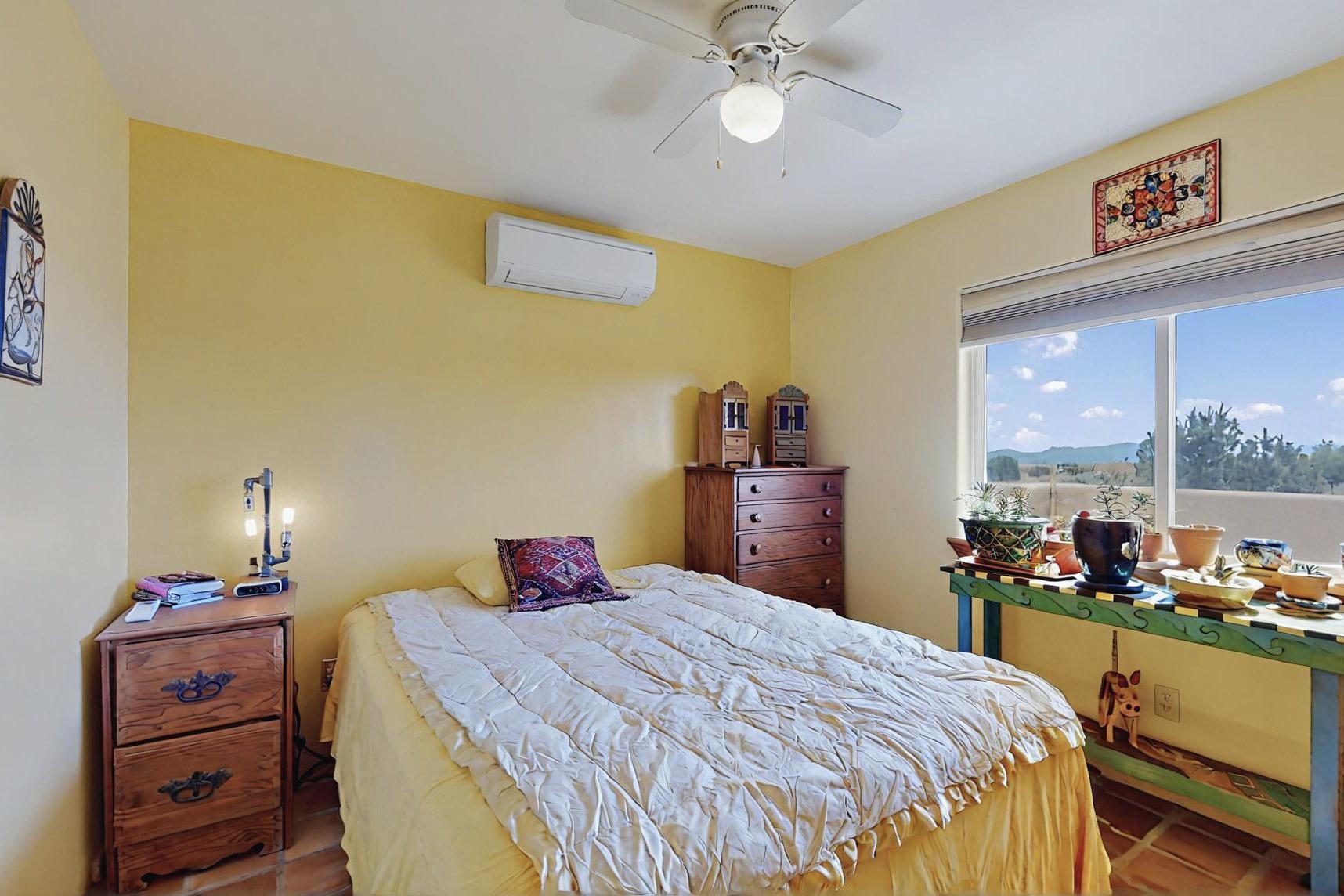 Absolutely delightful blend of Santa Fe charm and Mexico spice inside and out. Popular split bedroom design oozing with character, this home is like new. Gleaming Saltillo tile floors, re stuccoed, a synthetic roof with a 10 year warranty, plus re plumbed pex domestic piping all done in 2023. 4 Daikin mini splits were installed with 2 condensers to replace the radiant heating and add air-conditioning, plus a wood burning stove in the living room for cosy winters. The kitchen and both bathrooms were also delightfully remodeled. Outside the coyote fence was upgraded, landscape added and a second dog coyote fenced area built plus a storage shed added. The driveway, front wall and fencing added to create an ambient entry. Wow! This home is sparkling and move in ready close to local shopping, Eldorado amenities, library, school, senior center and only minutes into Santa Fe.