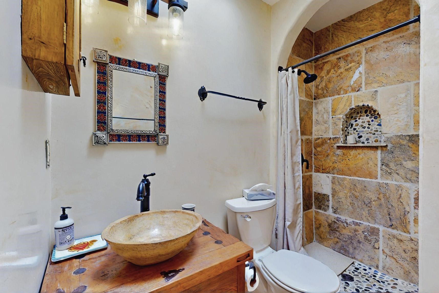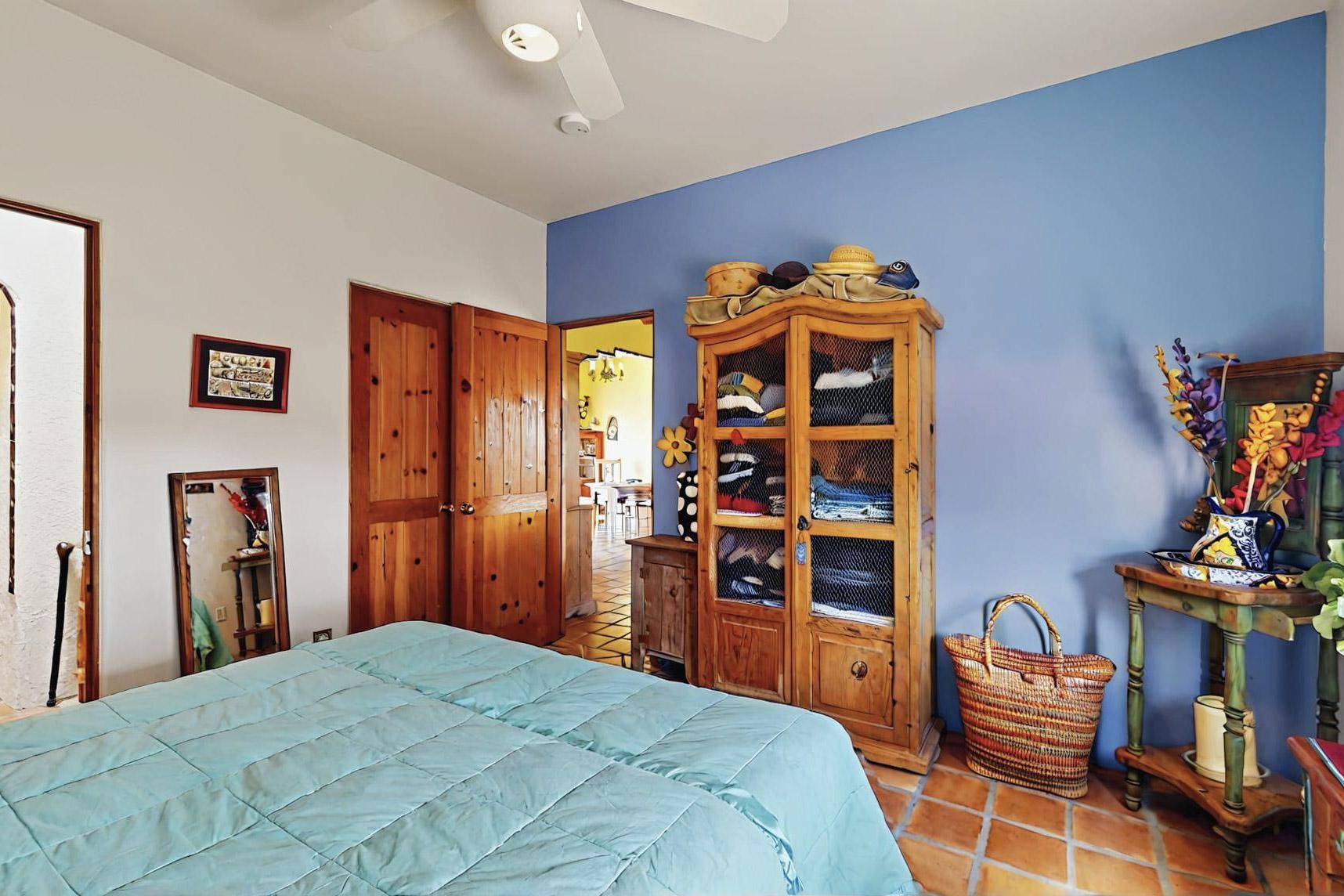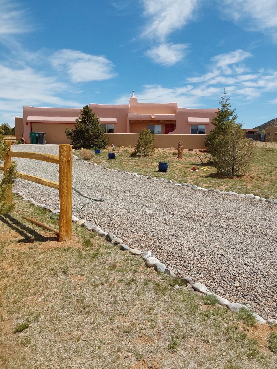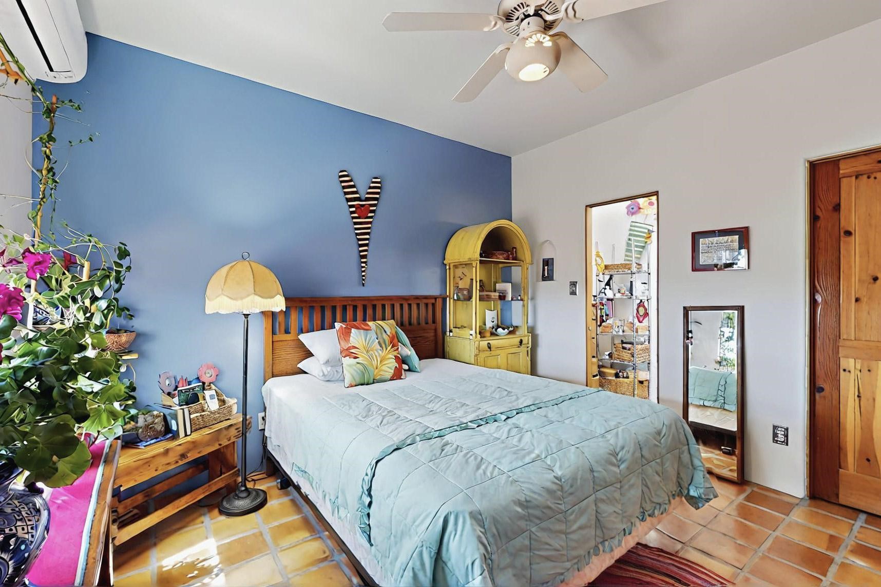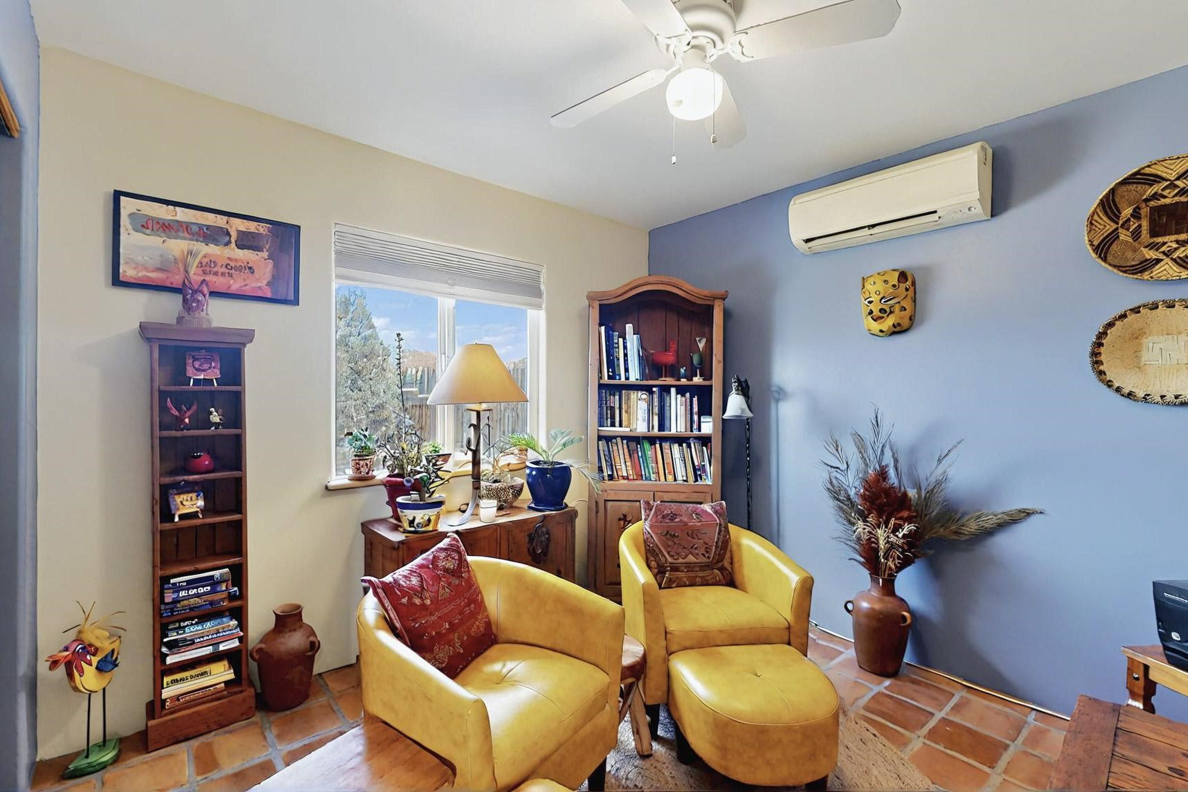 Absolutely delightful blend of Santa Fe charm and Mexico spice inside and out. Popular split bedroom design oozing with character, this home is like new. Gleaming Saltillo tile floors, re stuccoed, a synthetic roof with a 10 year warranty, plus re plumbed pex domestic piping all done in 2023. 4 Daikin mini splits were installed with 2 condensers to replace the radiant heating and add air-conditioning, plus a wood burning stove in the living room for cosy winters. The kitchen and both bathrooms were also delightfully remodeled. Outside the coyote fence was upgraded, landscape added and a second dog coyote fenced area built plus a storage shed added. The driveway, front wall and fencing added to create an ambient entry. Wow! This home is sparkling and move in ready close to local shopping, Eldorado amenities, library, school, senior center and only minutes into Santa Fe.