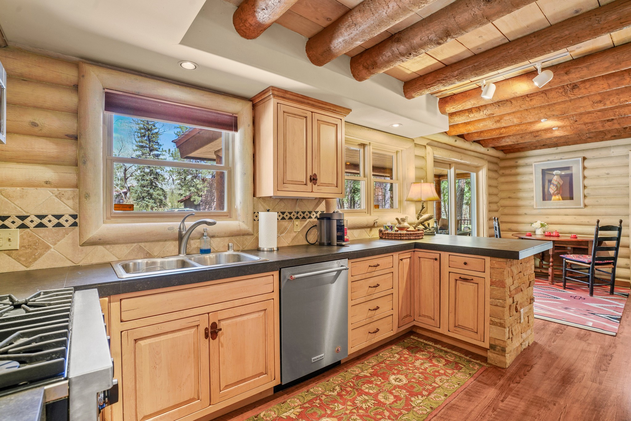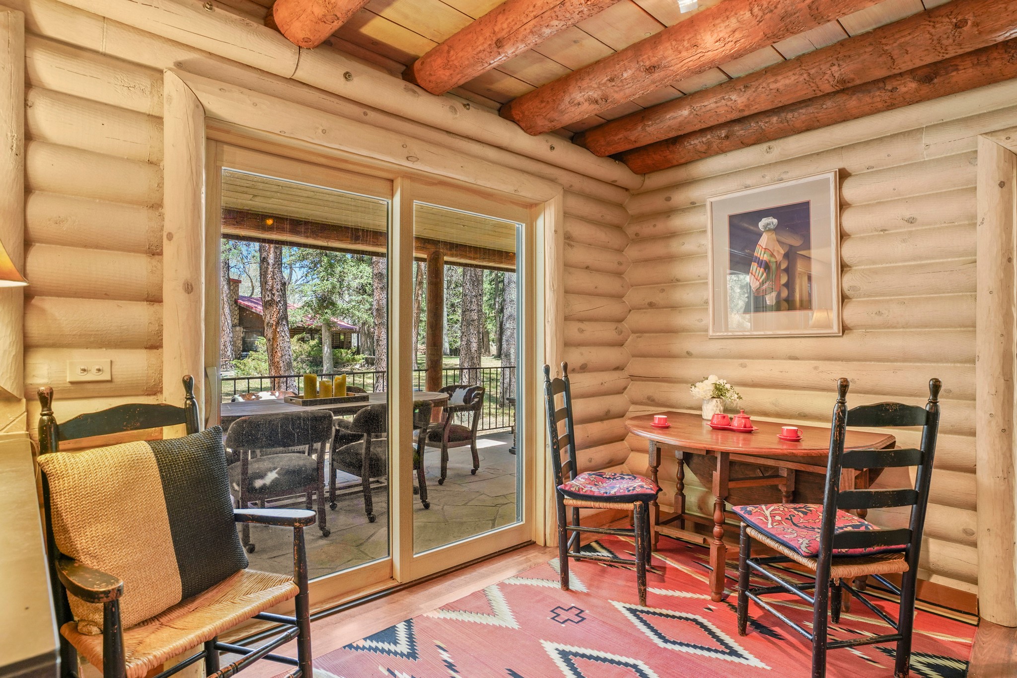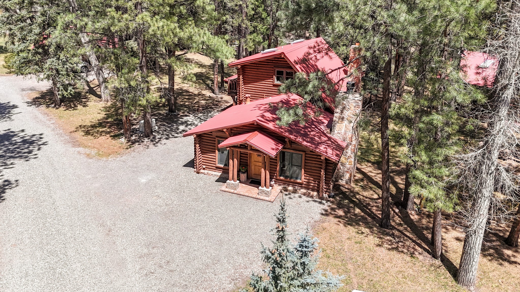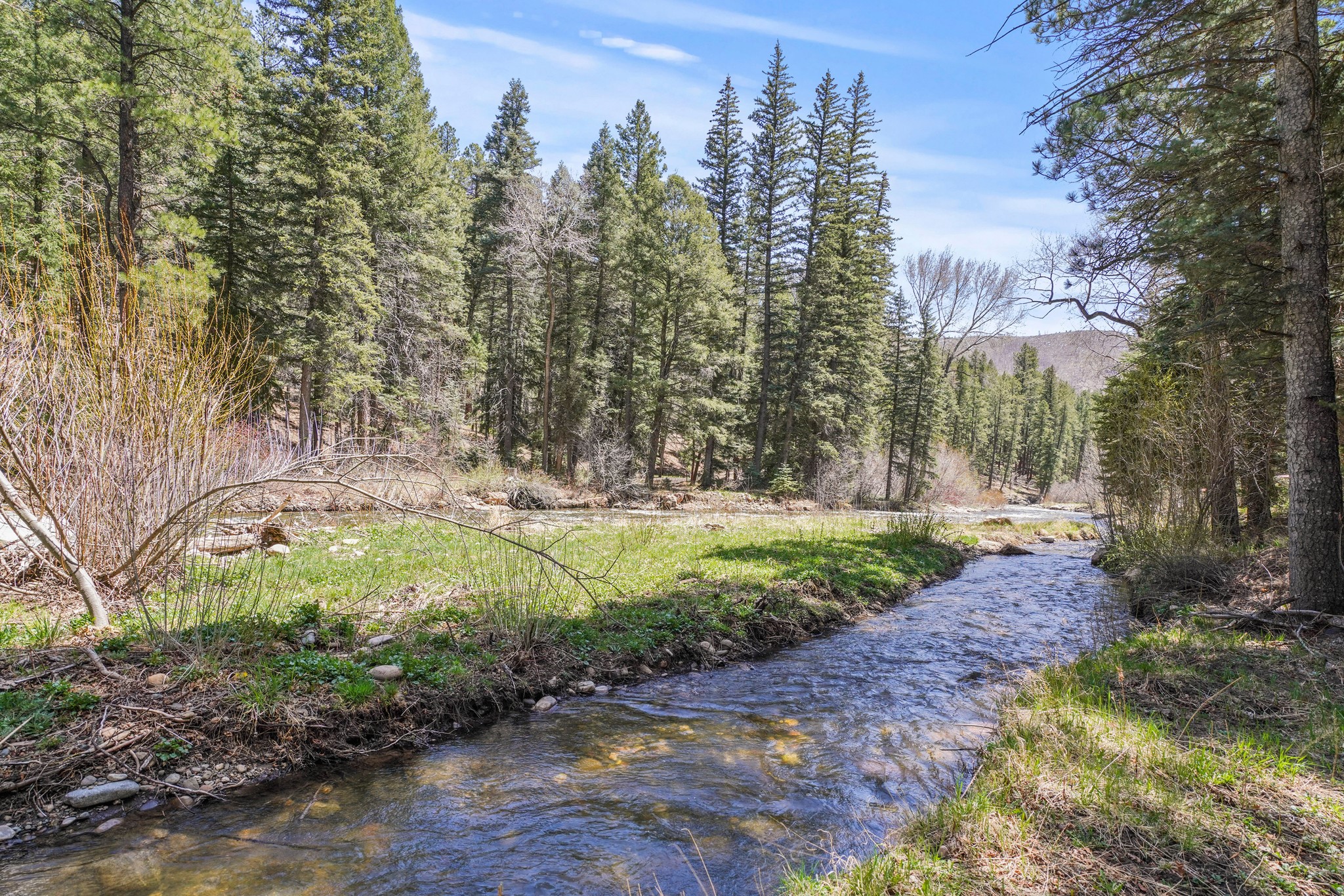 This exceptional log cabin offers rare riverfront living in a gated log home community, less than an hour from Santa Fe. With 1,700 feet of shared river frontage, three serene ponds, and an on-site caretaker, the property blends natural beauty with privacy, security, and ease of ownership.Crafted with authenticity and warmth, the 3-bedroom, 2-bath cabin features two inviting living areas, each with its own stone fireplace. The spacious main living room boasts high beamed ceilings and a charming office nook, while a cozy den off the eat-in kitchen showcases traditional vigas that echo the spirit of the Southwest.The main floor includes a comfortable bedroom and bath, while upstairs, two generous bedrooms and an additional full bath offer treetop views and peaceful retreats. Just off the kitchen and den, a wrap-around covered deck with skylights and flagstone floors creates a seamless indoor-outdoor living space--ideal for entertaining or simply enjoying the sights and sounds of the river. The property is being offered furnished as shown.A rare opportunity to own a legacy mountain retreat that combines natural splendor, thoughtful design, and convenient access to Santa Fe.