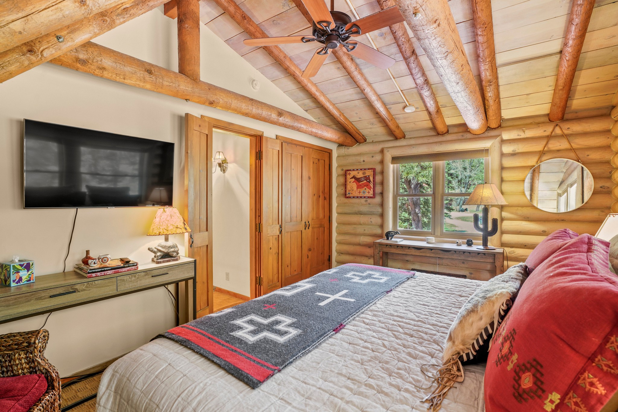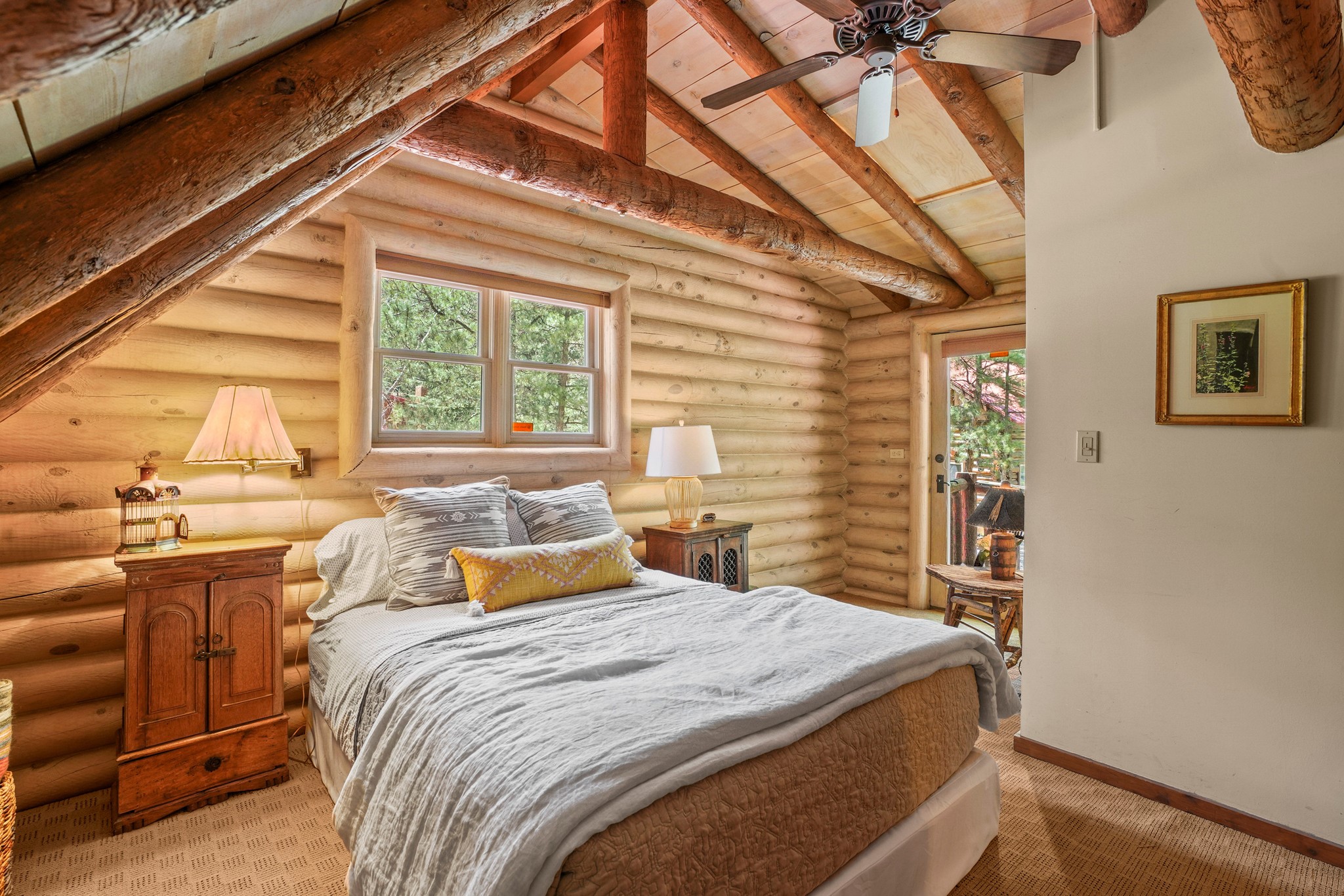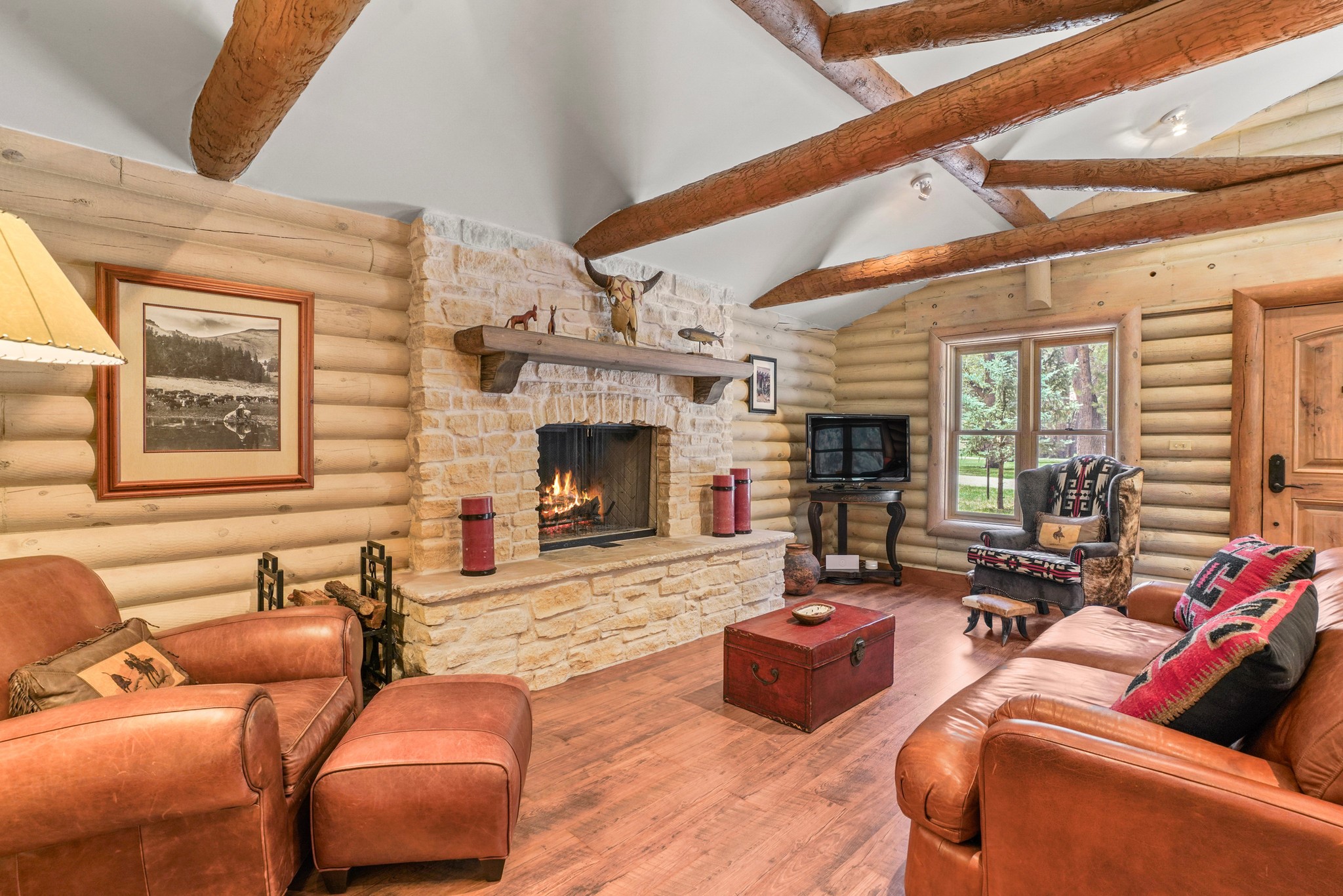 This exceptional log cabin offers rare riverfront living in a gated log home community, less than an hour from Santa Fe. With 1,700 feet of shared river frontage, three serene ponds, and an on-site caretaker, the property blends natural beauty with privacy, security, and ease of ownership.Crafted with authenticity and warmth, the 3-bedroom, 2-bath cabin features two inviting living areas, each with its own stone fireplace. The spacious main living room boasts high beamed ceilings and a charming office nook, while a cozy den off the eat-in kitchen showcases traditional vigas that echo the spirit of the Southwest.The main floor includes a comfortable bedroom and bath, while upstairs, two generous bedrooms and an additional full bath offer treetop views and peaceful retreats. Just off the kitchen and den, a wrap-around covered deck with skylights and flagstone floors creates a seamless indoor-outdoor living space--ideal for entertaining or simply enjoying the sights and sounds of the river. The property is being offered furnished as shown.A rare opportunity to own a legacy mountain retreat that combines natural splendor, thoughtful design, and convenient access to Santa Fe.