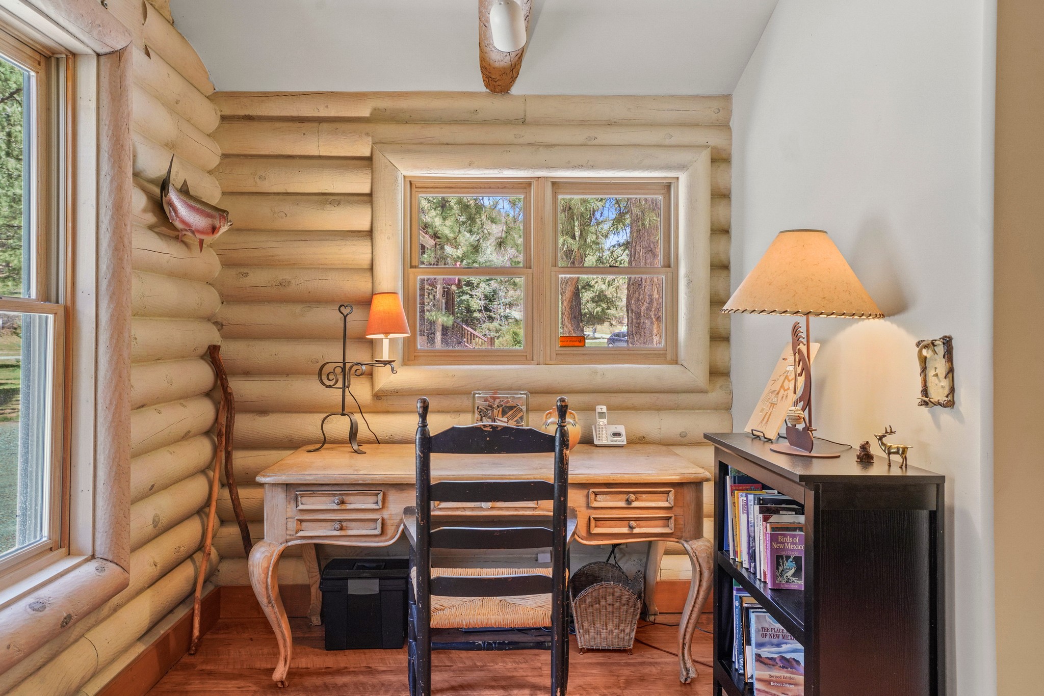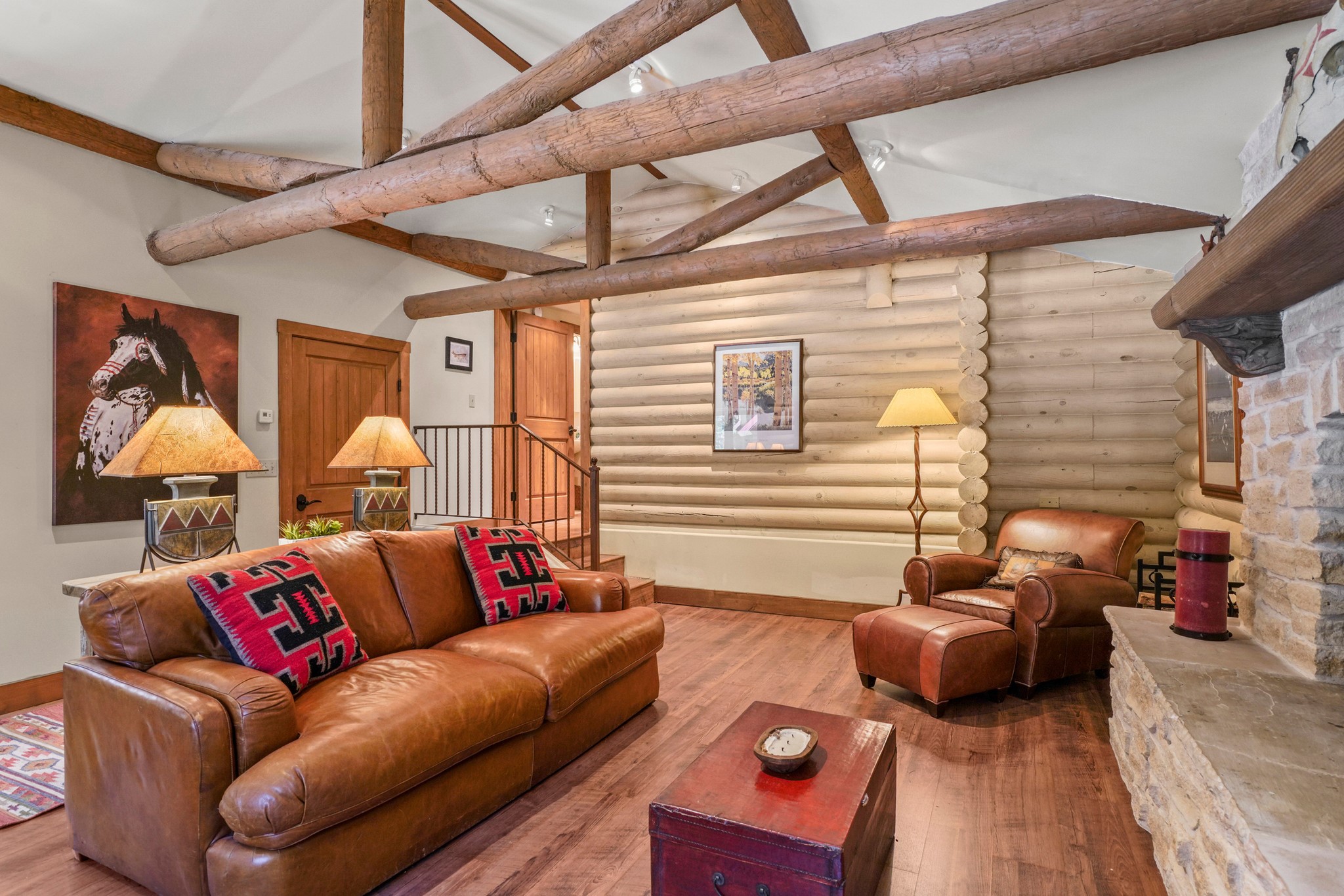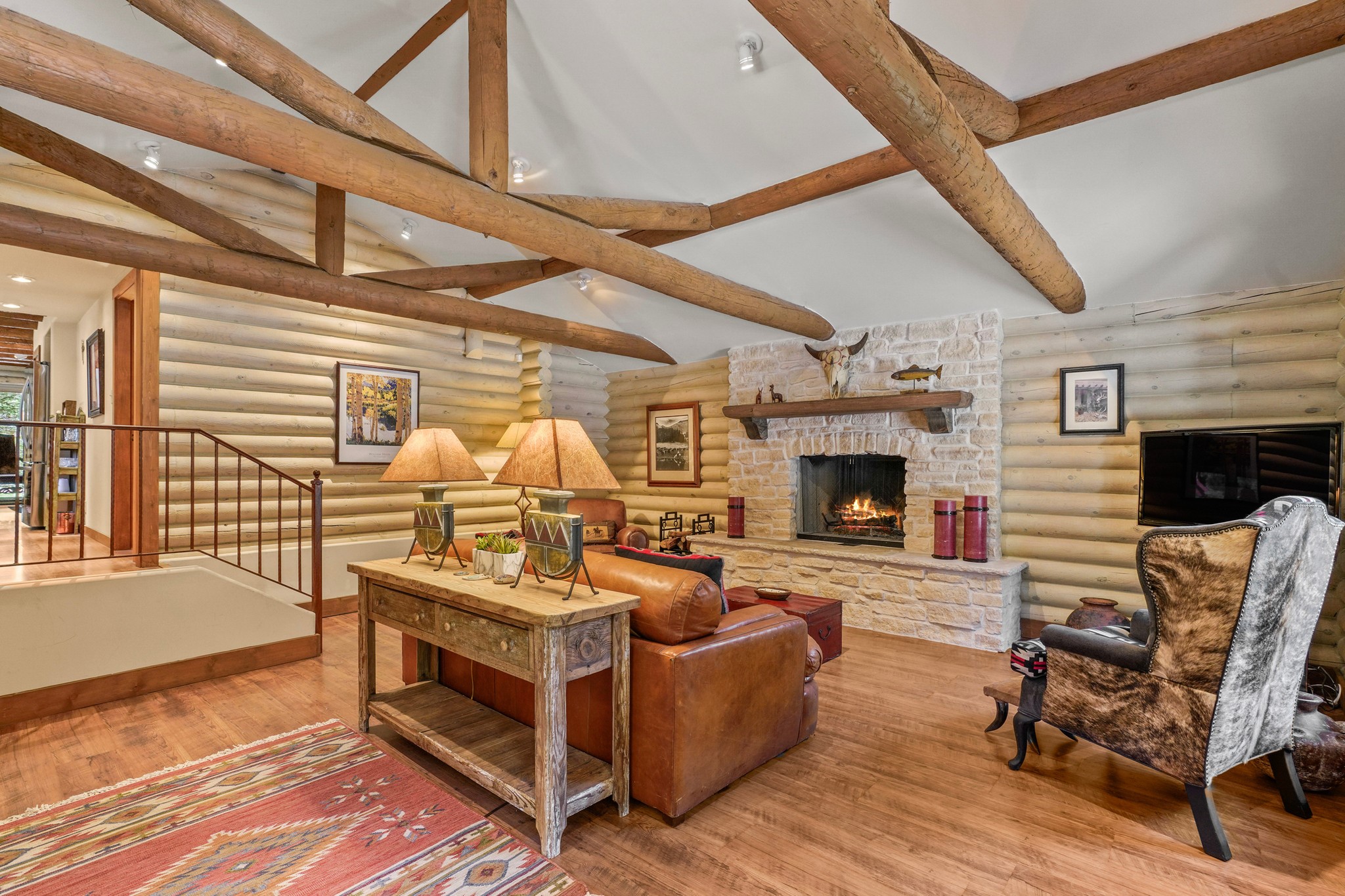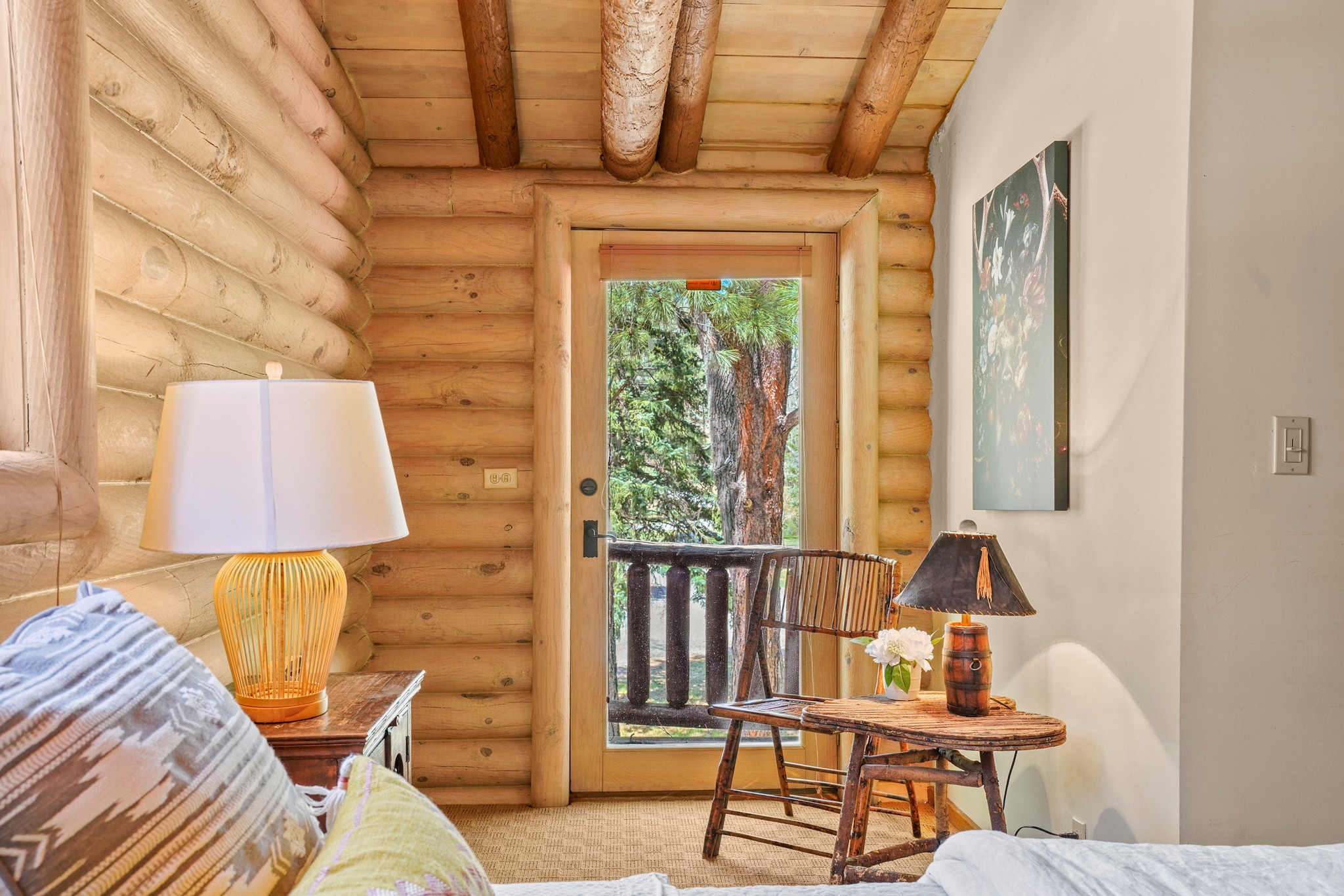 This exceptional log cabin offers rare riverfront living in a gated log home community, less than an hour from Santa Fe. With 1,700 feet of shared river frontage, three serene ponds, and an on-site caretaker, the property blends natural beauty with privacy, security, and ease of ownership.Crafted with authenticity and warmth, the 3-bedroom, 2-bath cabin features two inviting living areas, each with its own stone fireplace. The spacious main living room boasts high beamed ceilings and a charming office nook, while a cozy den off the eat-in kitchen showcases traditional vigas that echo the spirit of the Southwest.The main floor includes a comfortable bedroom and bath, while upstairs, two generous bedrooms and an additional full bath offer treetop views and peaceful retreats. Just off the kitchen and den, a wrap-around covered deck with skylights and flagstone floors creates a seamless indoor-outdoor living space--ideal for entertaining or simply enjoying the sights and sounds of the river. The property is being offered furnished as shown.A rare opportunity to own a legacy mountain retreat that combines natural splendor, thoughtful design, and convenient access to Santa Fe.