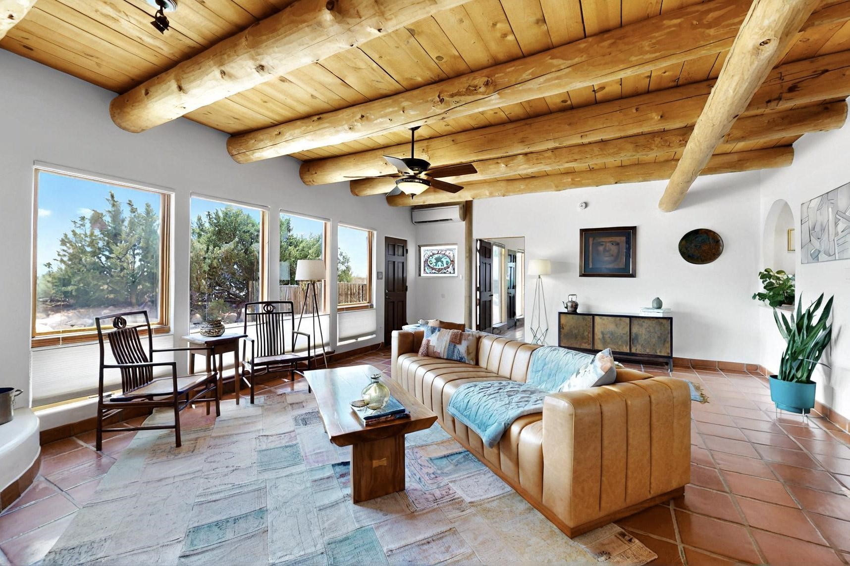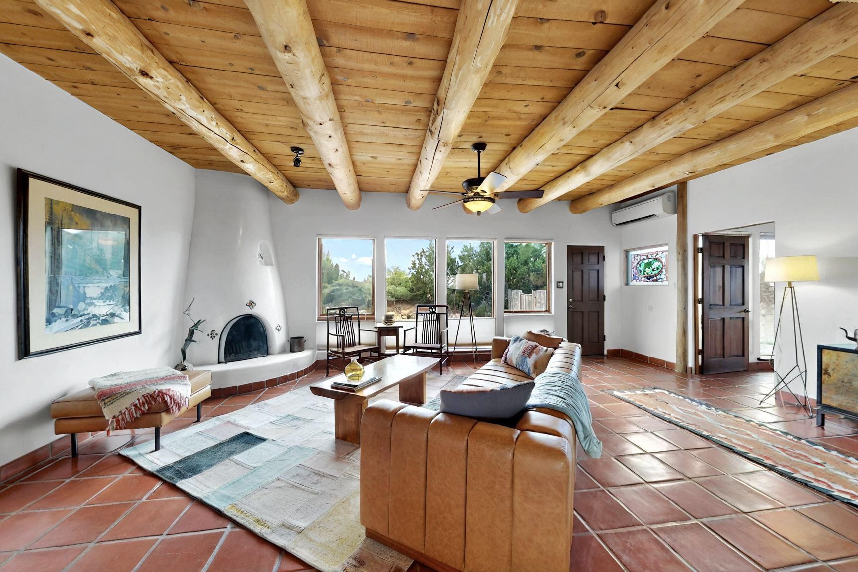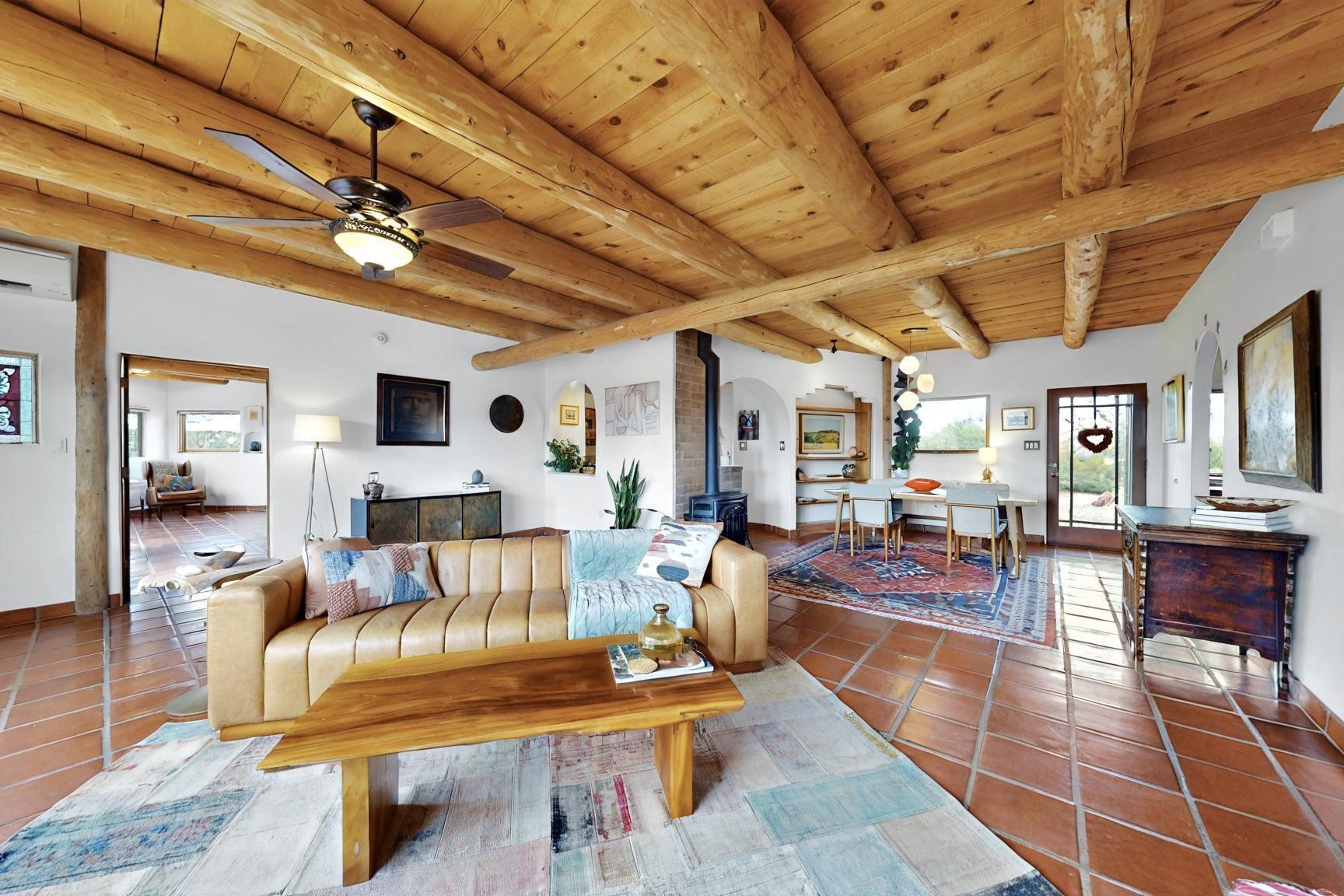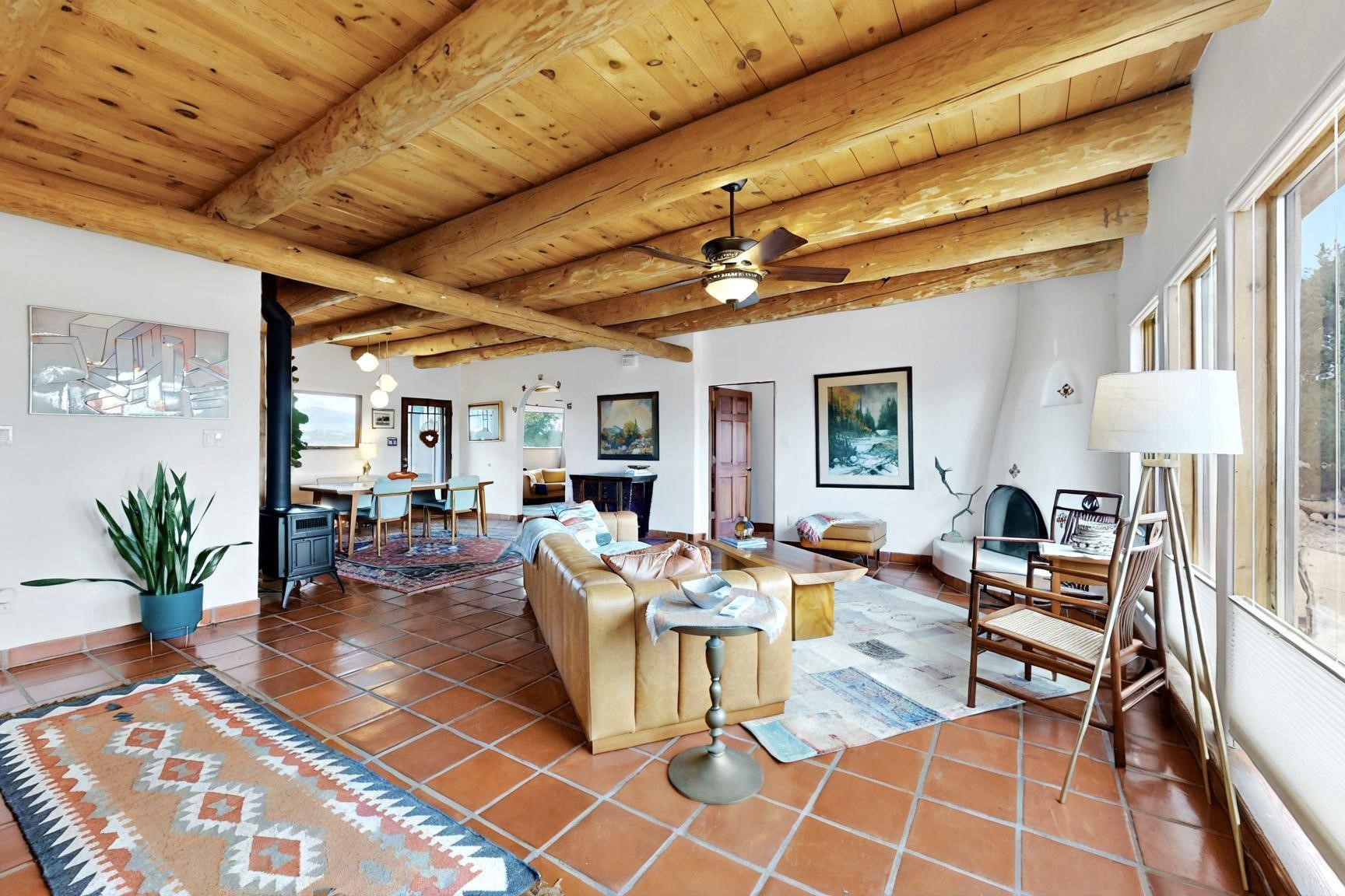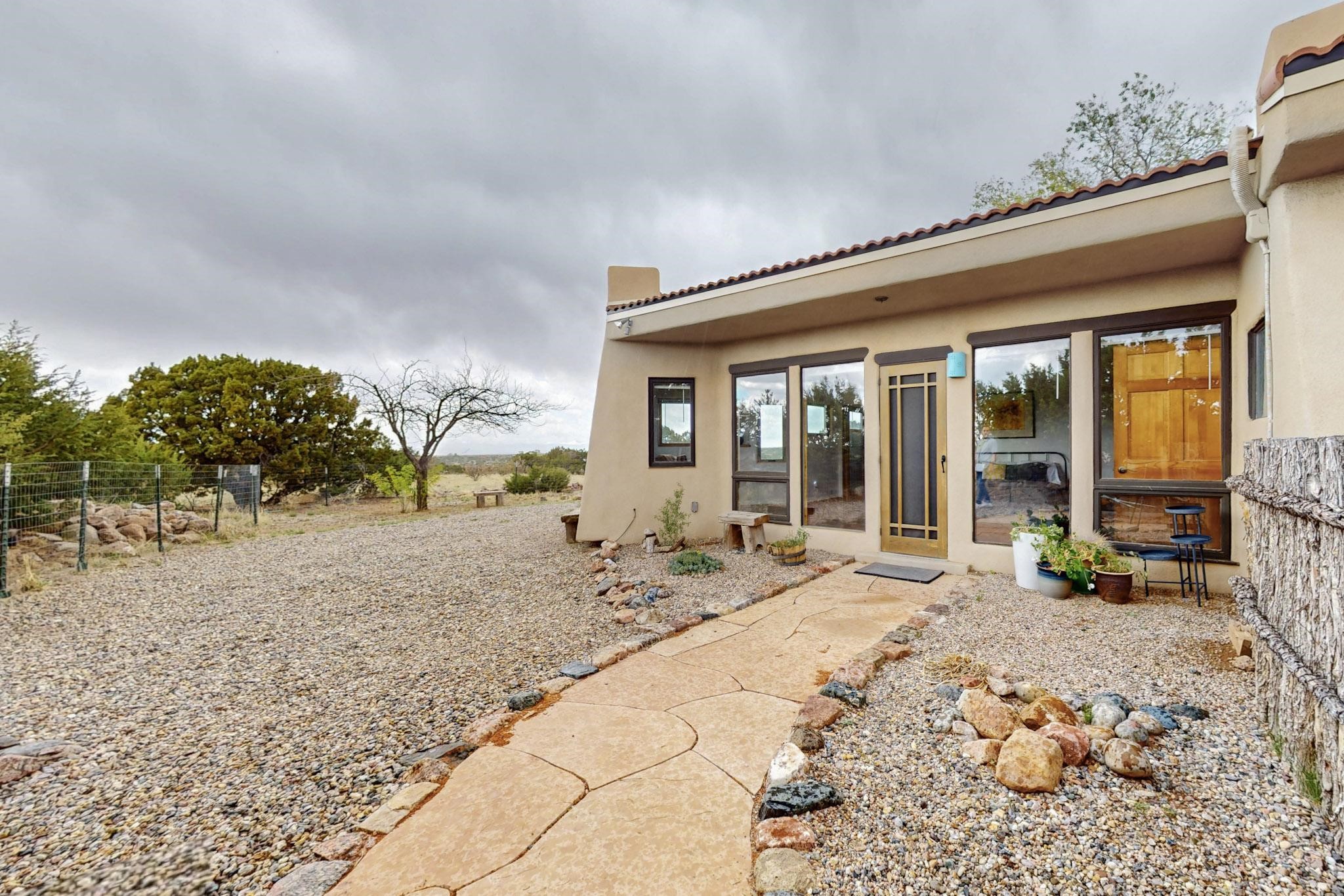 Stunning custom passive solar creation by Leif Backe nestled back from the road for ultimate privacy and mountain views. This split 3 bedroom design oozing with Santa Fe charm and ambience, is loaded with extra spaces for hobbies or meditation. Built to access light and lovely views from large windows in every room, gleaming Saltillo tile floors, rustic rough hewn vigas and beams, a traditional kiva fireplaces and 2 cosy natural gas stoves. 5 minisplits have been added for summer cool and winter heat. The totally remodeled kitchen is a perfect blend of pueblo and contemporary design. Enjoy the lovely view breakfast nook, large den and heated studio/workshop or simply relax in the naturally landscaped private gardens. The membrane roof is only 5 years old. This fabulous home accesses all of Eldorado amenities, close to local services and shopping plus only minutes into Santa Fe.