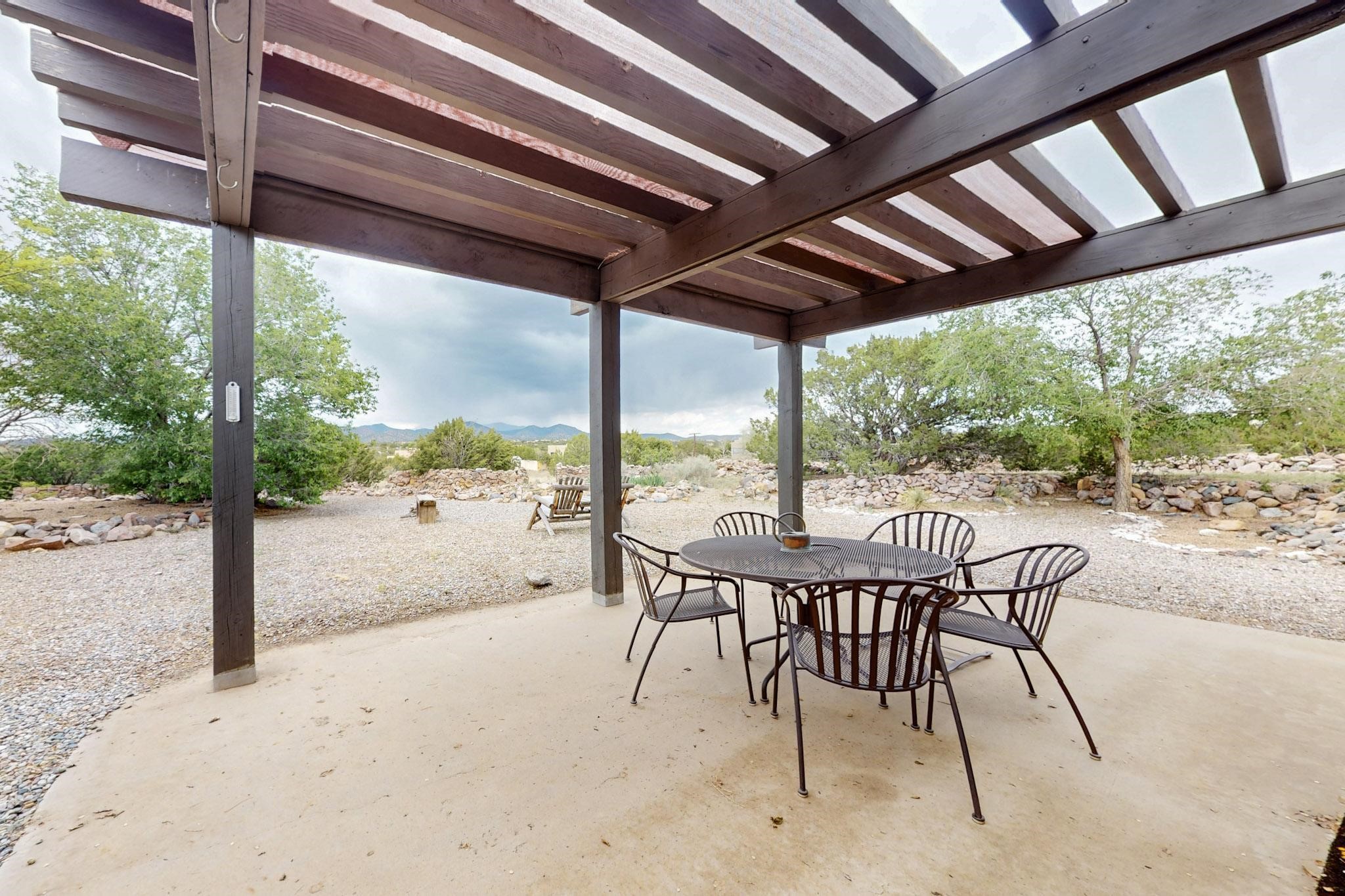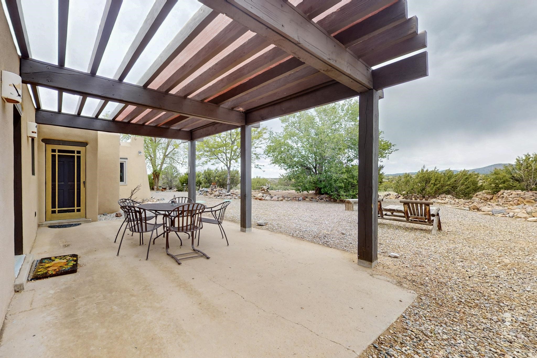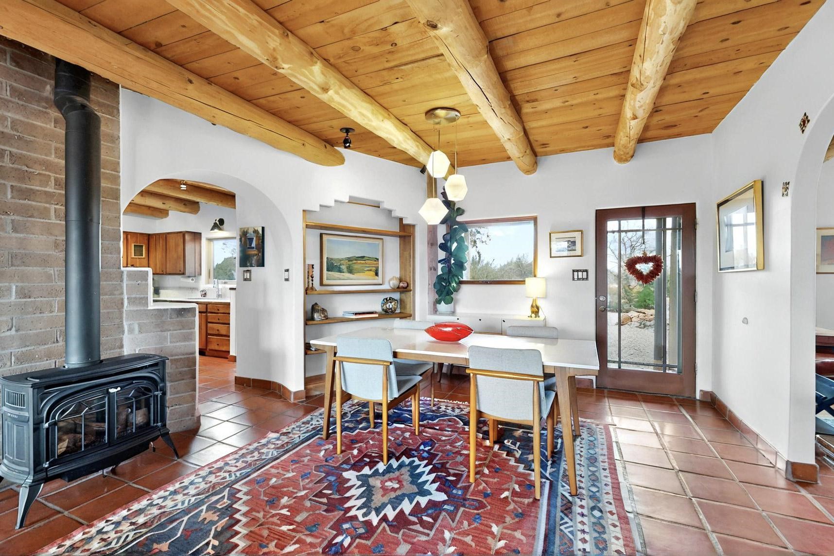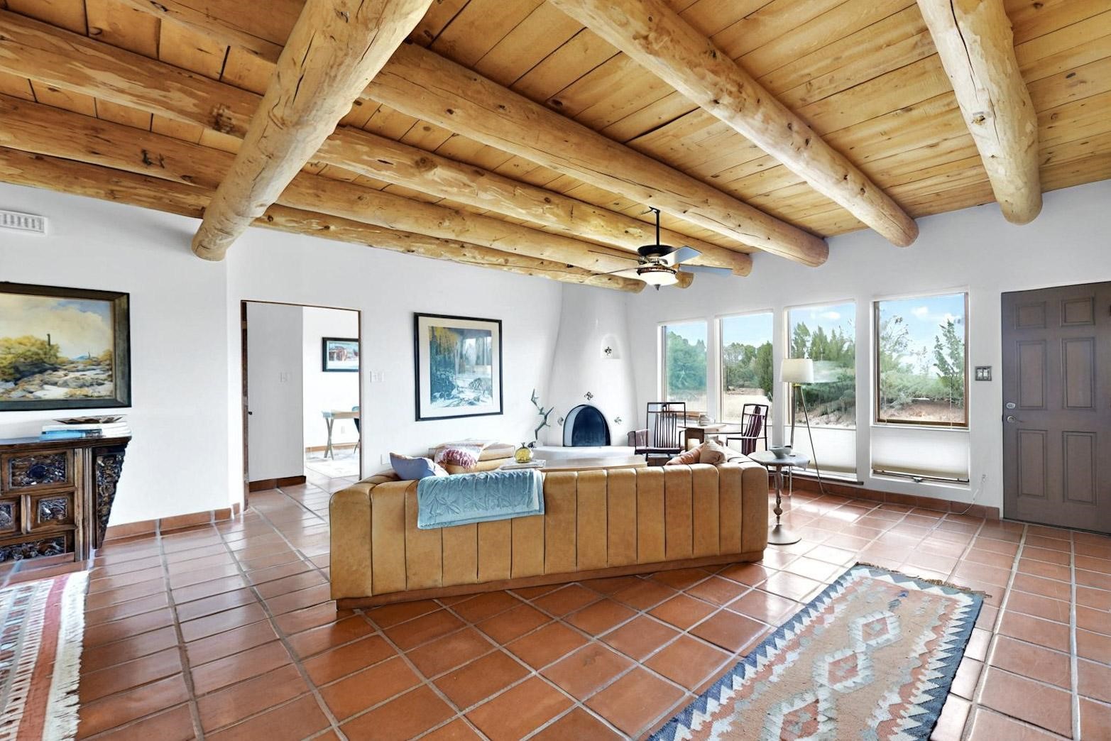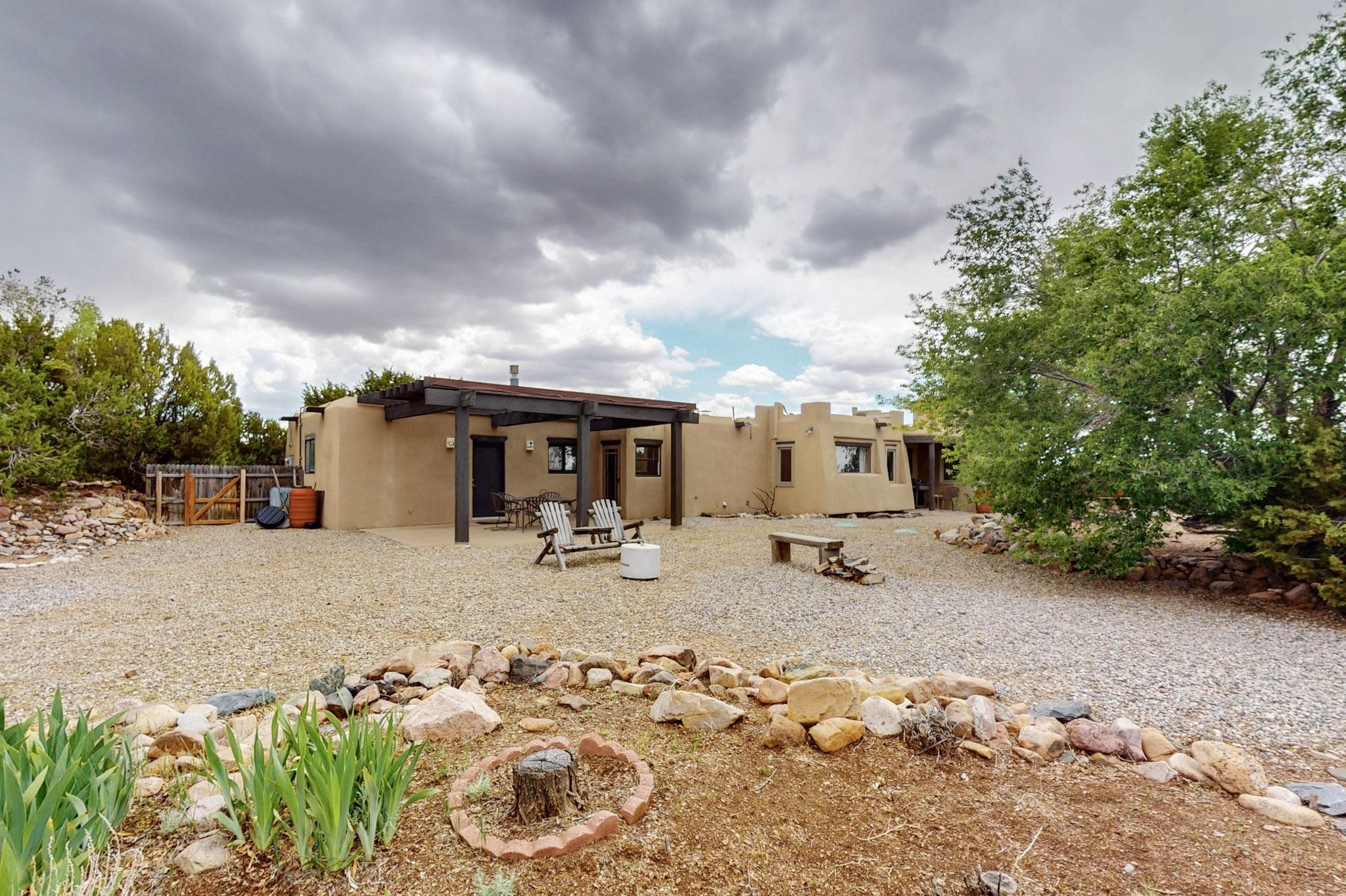 Stunning custom passive solar creation by Leif Backe nestled back from the road for ultimate privacy and mountain views. This split 3 bedroom design oozing with Santa Fe charm and ambience, is loaded with extra spaces for hobbies or meditation. Built to access light and lovely views from large windows in every room, gleaming Saltillo tile floors, rustic rough hewn vigas and beams, a traditional kiva fireplaces and 2 cosy natural gas stoves. 5 minisplits have been added for summer cool and winter heat. The totally remodeled kitchen is a perfect blend of pueblo and contemporary design. Enjoy the lovely view breakfast nook, large den and heated studio/workshop or simply relax in the naturally landscaped private gardens. The membrane roof is only 5 years old. This fabulous home accesses all of Eldorado amenities, close to local services and shopping plus only minutes into Santa Fe.