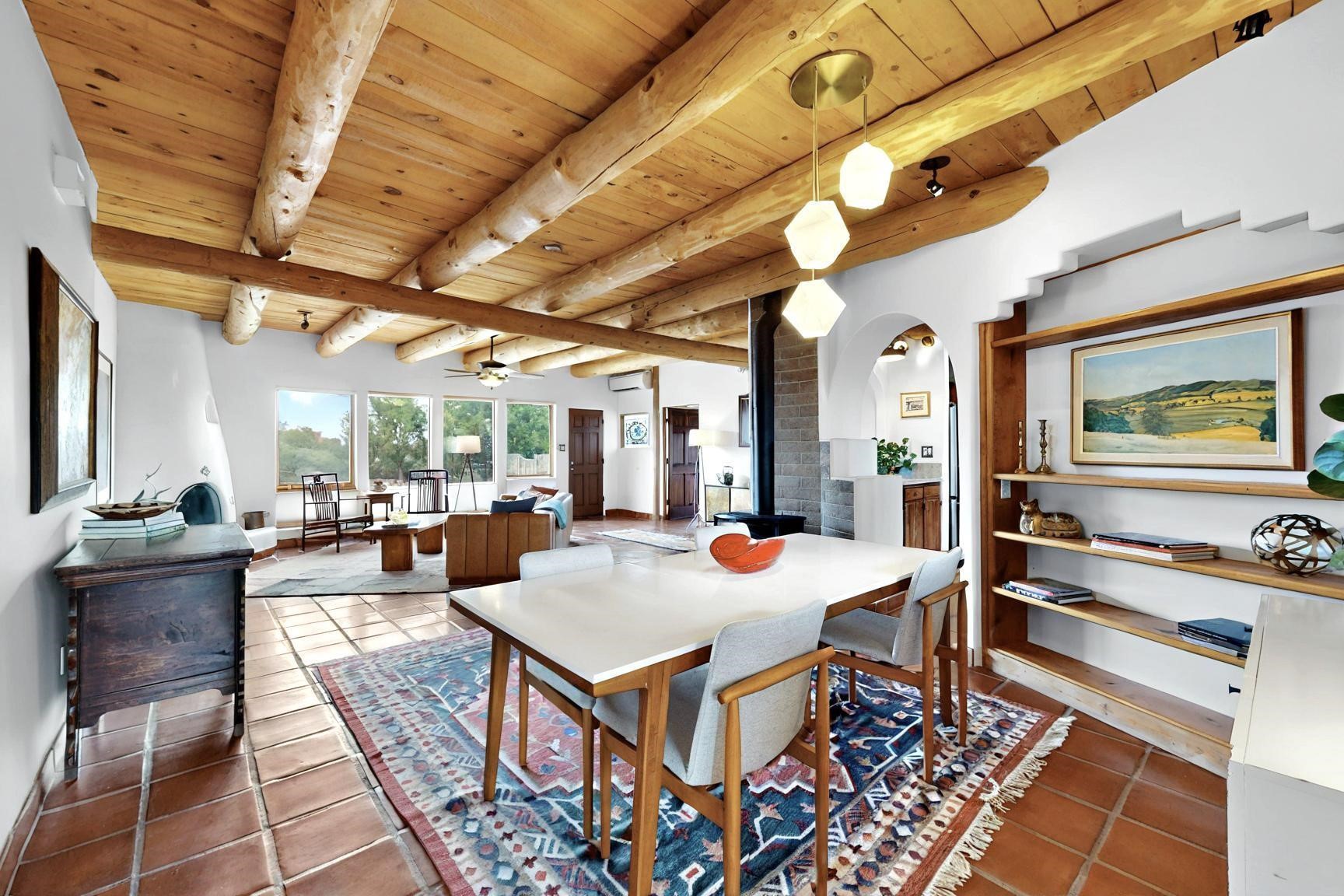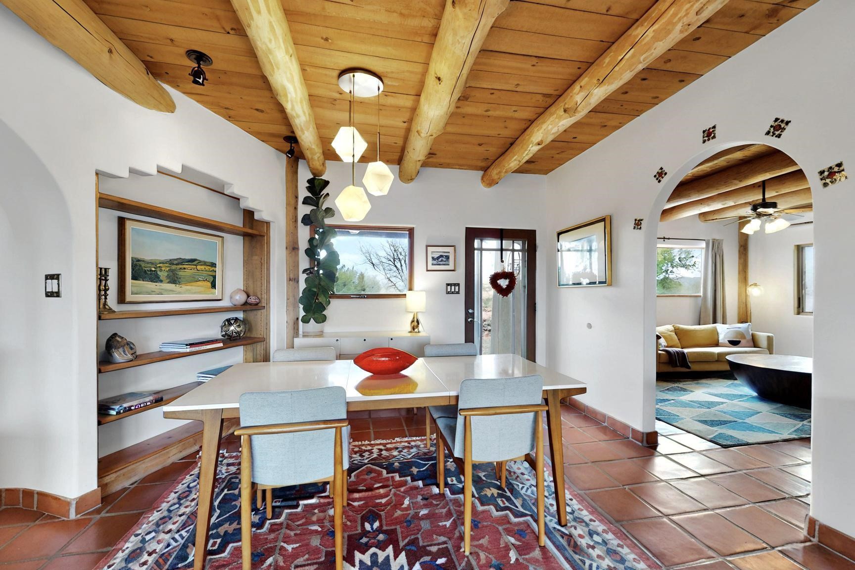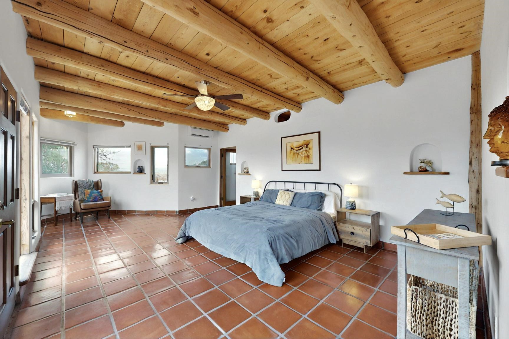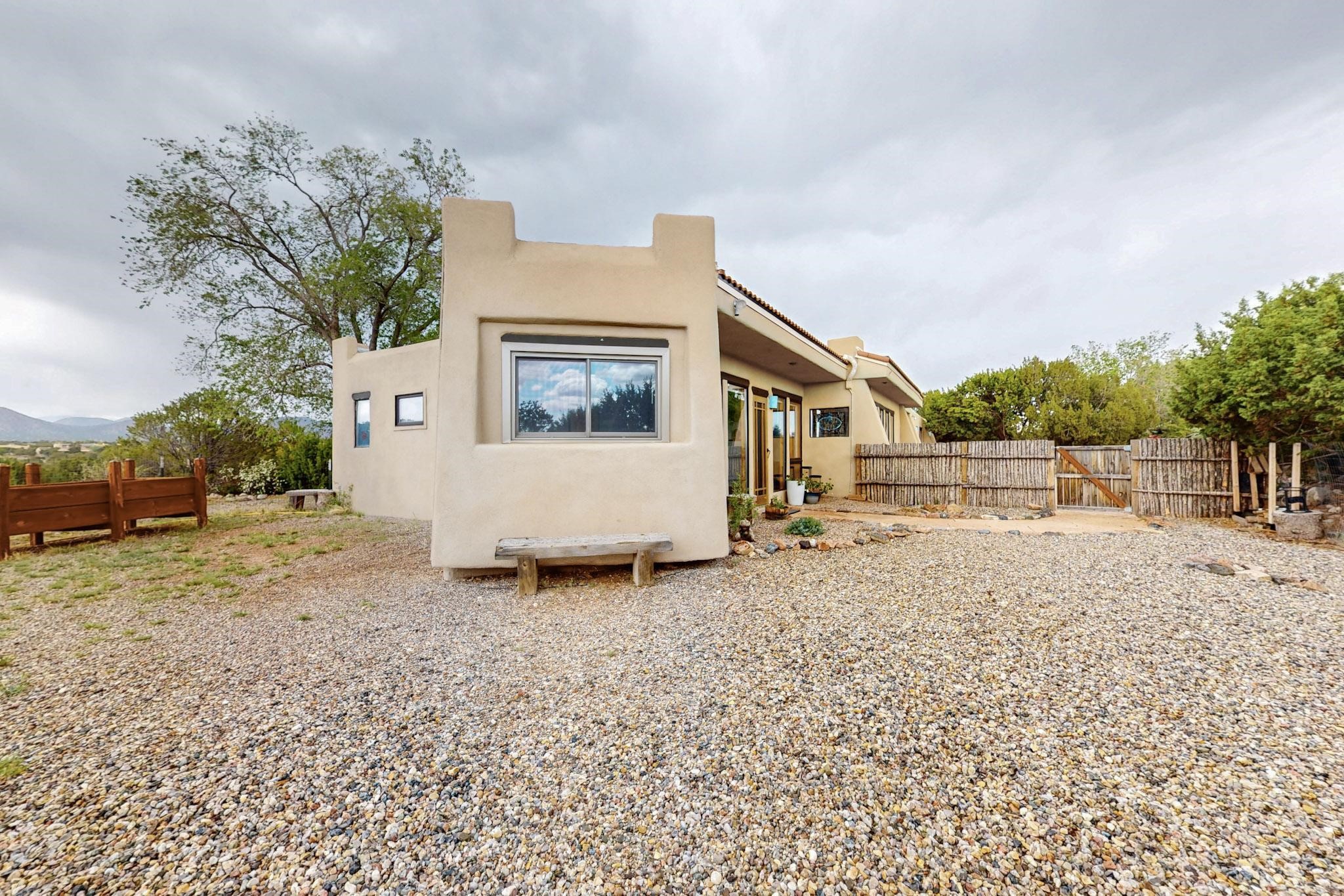 Stunning custom passive solar creation by Leif Backe nestled back from the road for ultimate privacy and mountain views. This split 3 bedroom design oozing with Santa Fe charm and ambience, is loaded with extra spaces for hobbies or meditation. Built to access light and lovely views from large windows in every room, gleaming Saltillo tile floors, rustic rough hewn vigas and beams, a traditional kiva fireplaces and 2 cosy natural gas stoves. 5 minisplits have been added for summer cool and winter heat. The totally remodeled kitchen is a perfect blend of pueblo and contemporary design. Enjoy the lovely view breakfast nook, large den and heated studio/workshop or simply relax in the naturally landscaped private gardens. The membrane roof is only 5 years old. This fabulous home accesses all of Eldorado amenities, close to local services and shopping plus only minutes into Santa Fe.