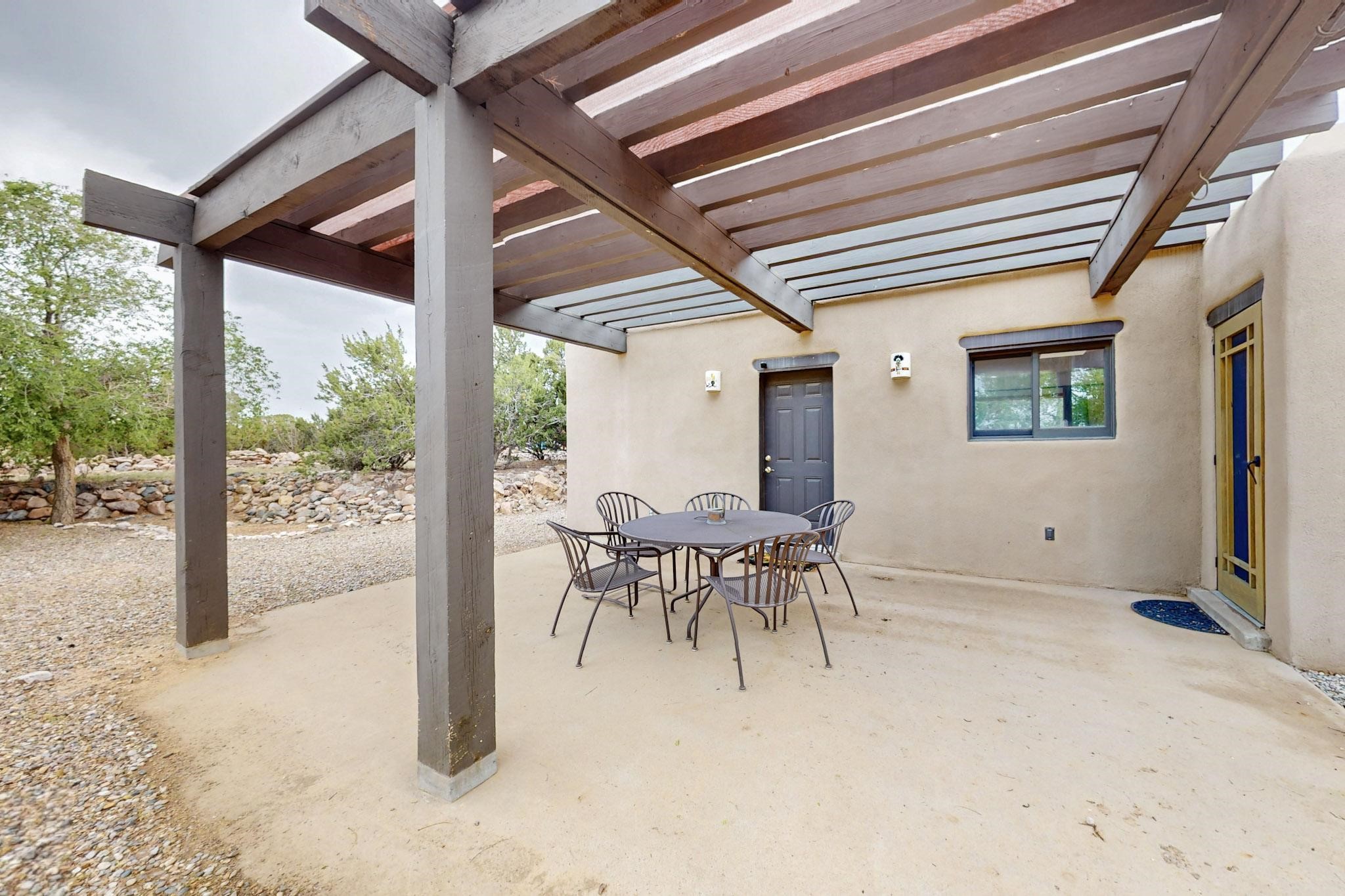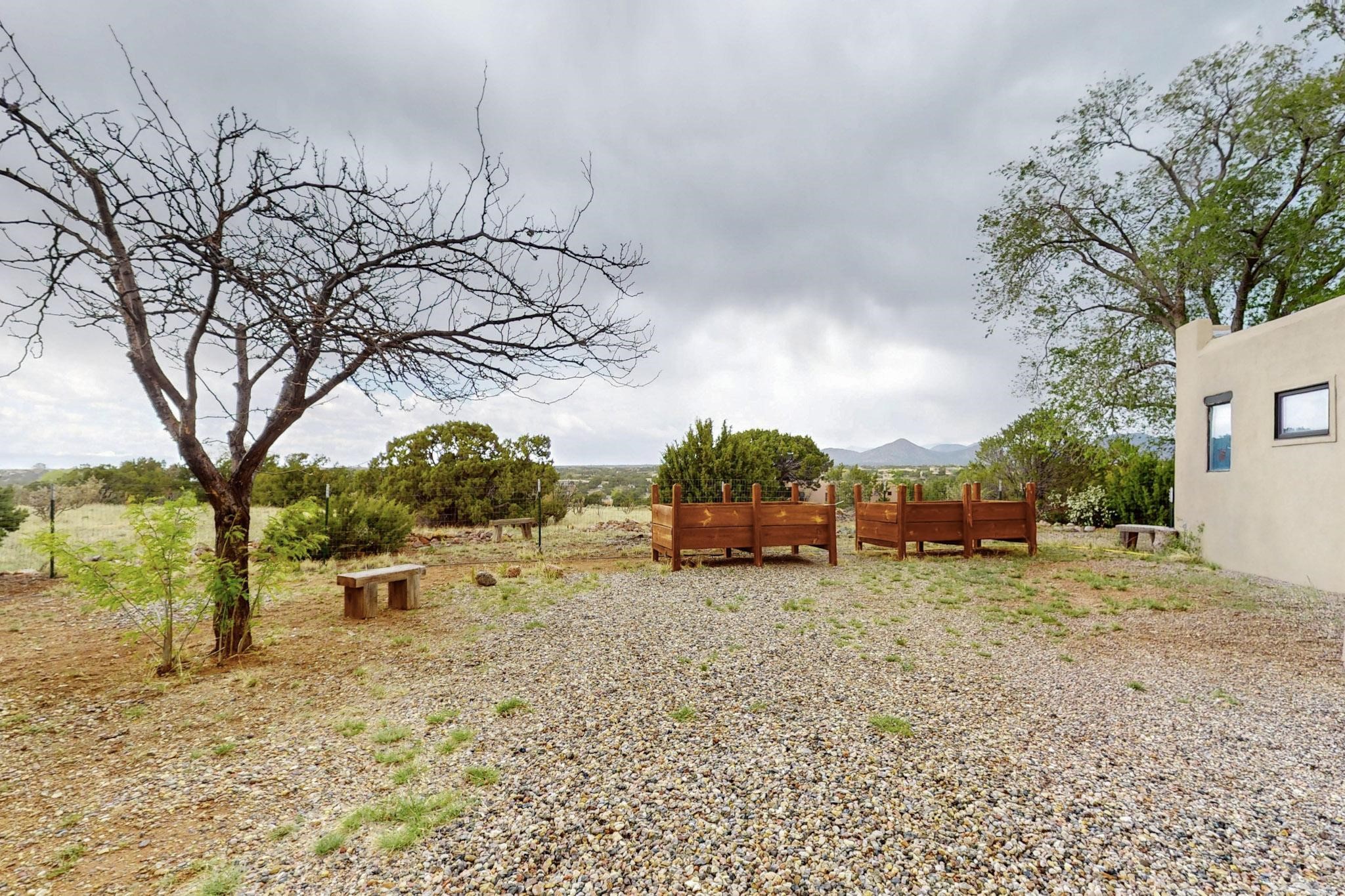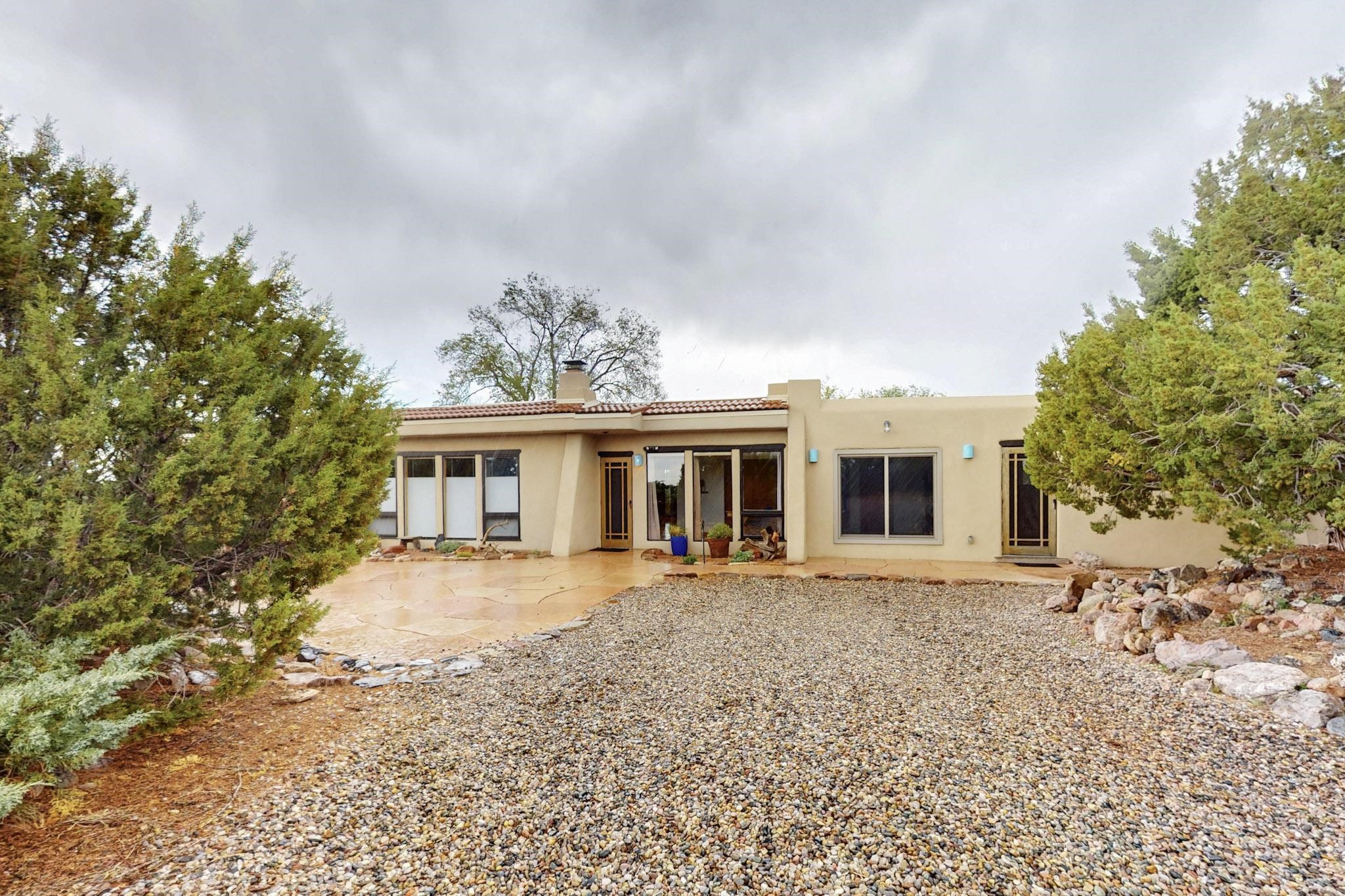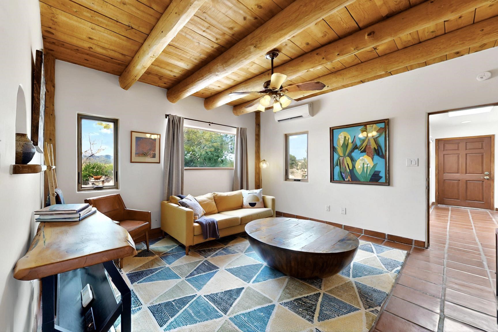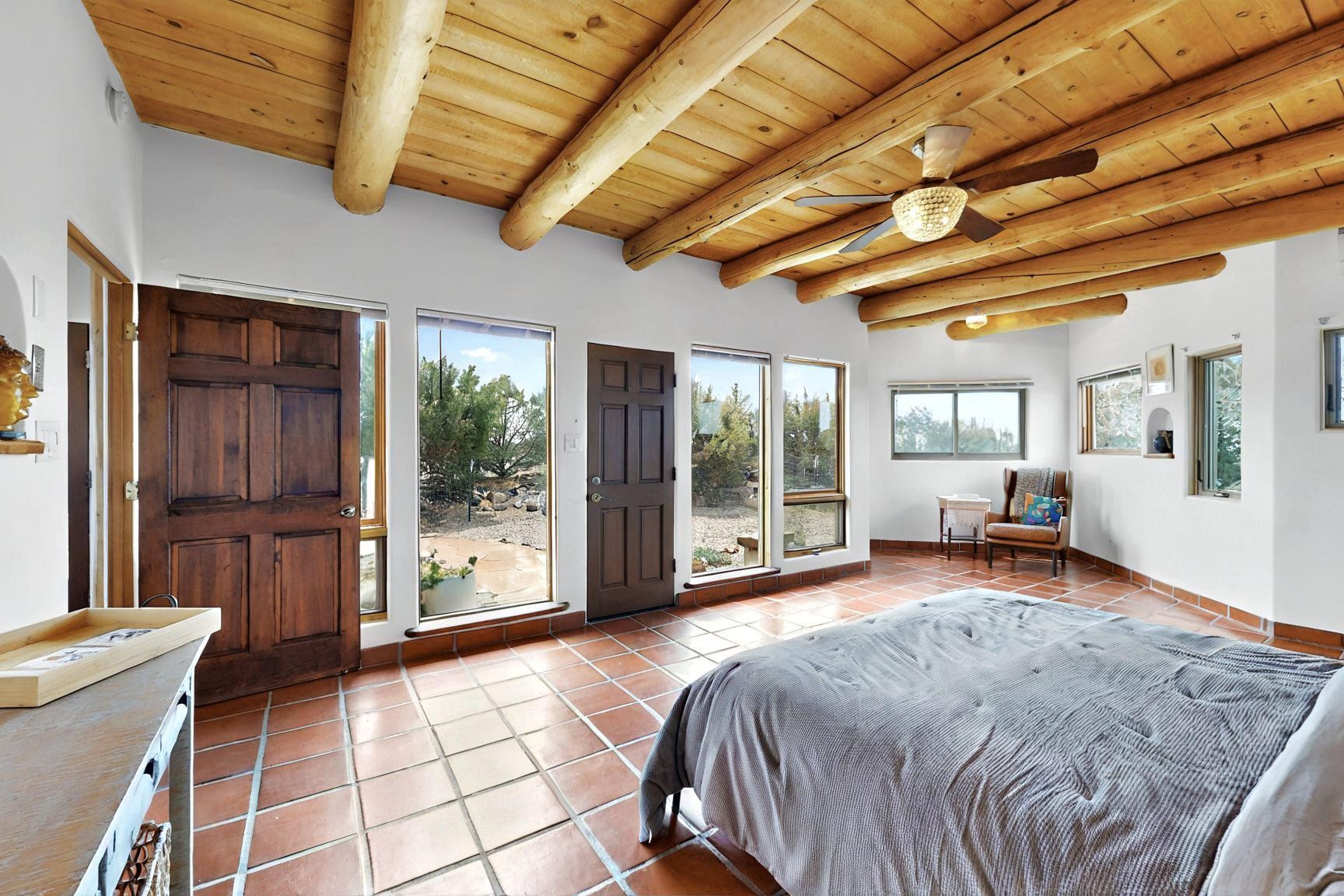 Stunning custom passive solar creation by Leif Backe nestled back from the road for ultimate privacy and mountain views. This split 3 bedroom design oozing with Santa Fe charm and ambience, is loaded with extra spaces for hobbies or meditation. Built to access light and lovely views from large windows in every room, gleaming Saltillo tile floors, rustic rough hewn vigas and beams, a traditional kiva fireplaces and 2 cosy natural gas stoves. 5 minisplits have been added for summer cool and winter heat. The totally remodeled kitchen is a perfect blend of pueblo and contemporary design. Enjoy the lovely view breakfast nook, large den and heated studio/workshop or simply relax in the naturally landscaped private gardens. The membrane roof is only 5 years old. This fabulous home accesses all of Eldorado amenities, close to local services and shopping plus only minutes into Santa Fe.
