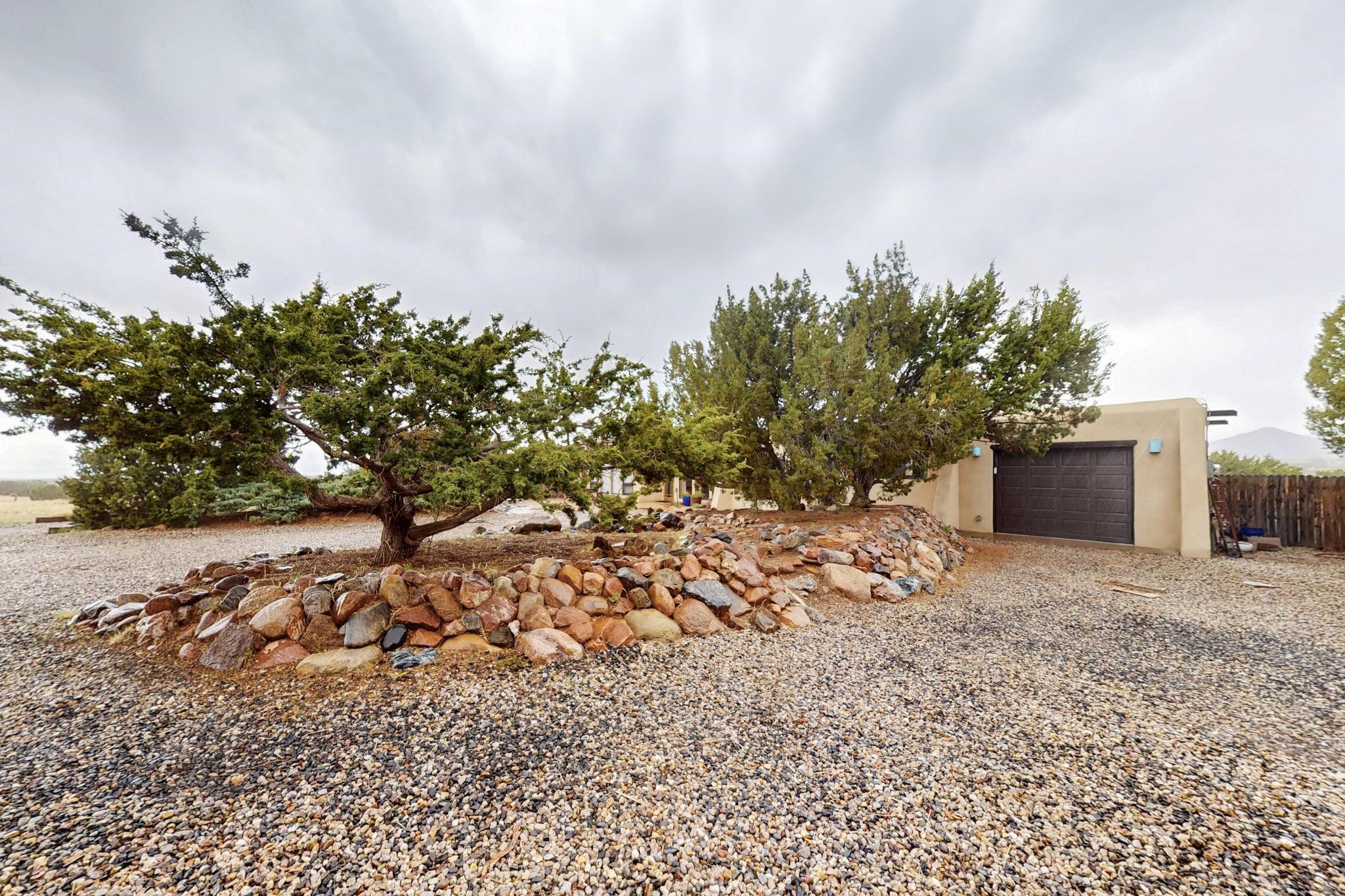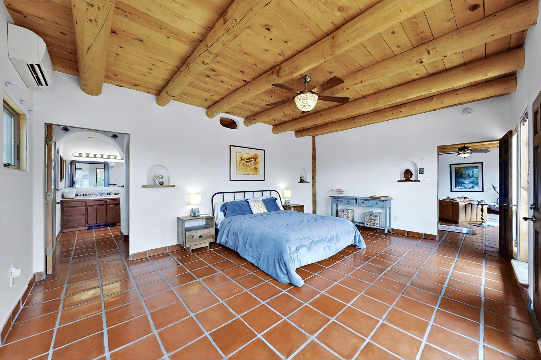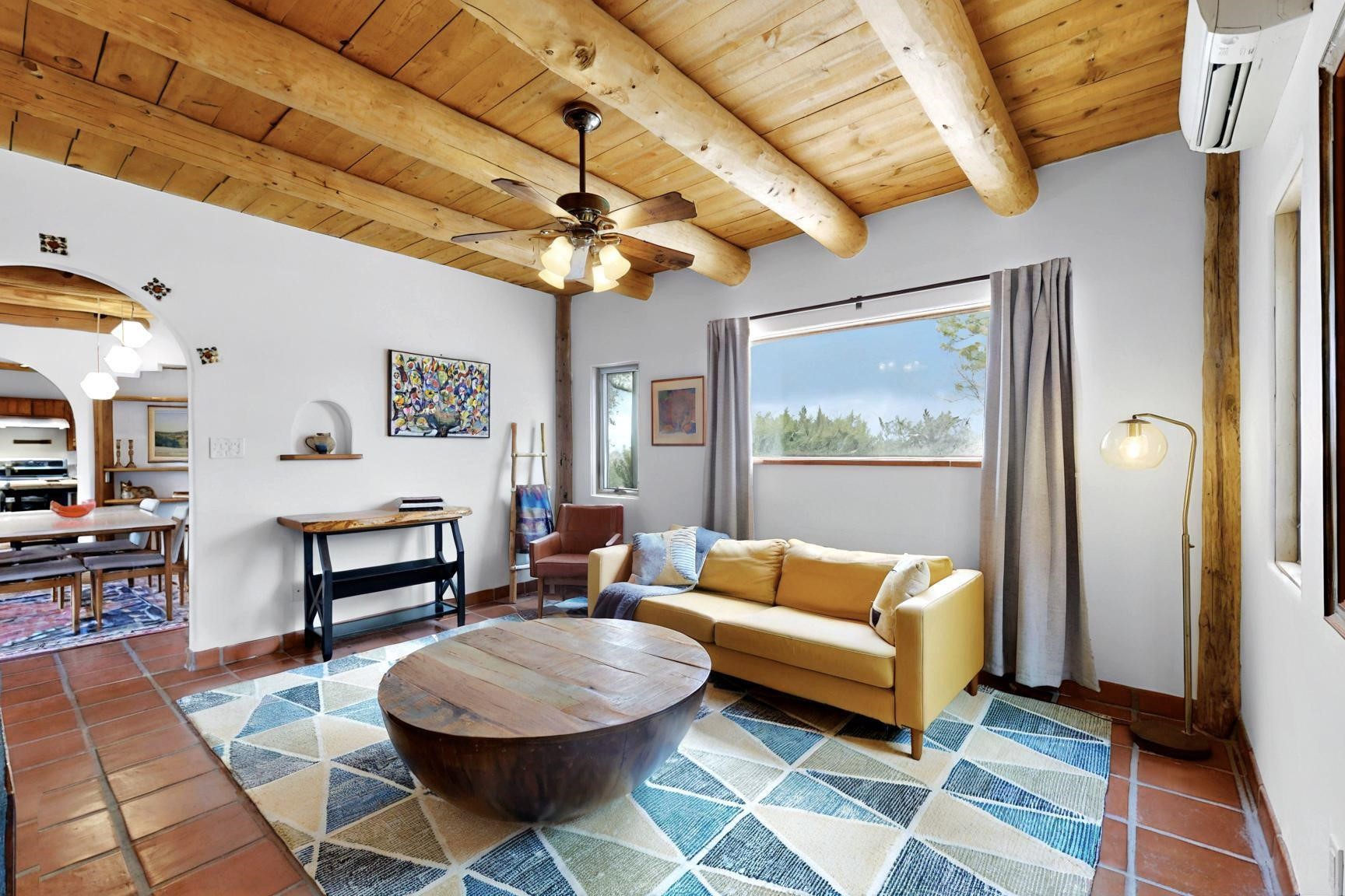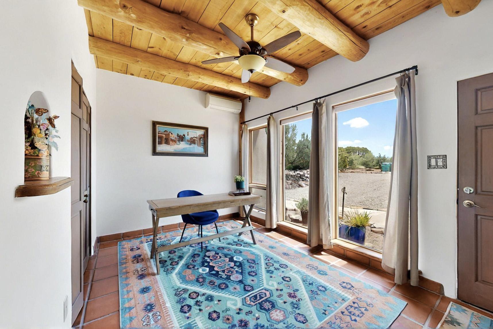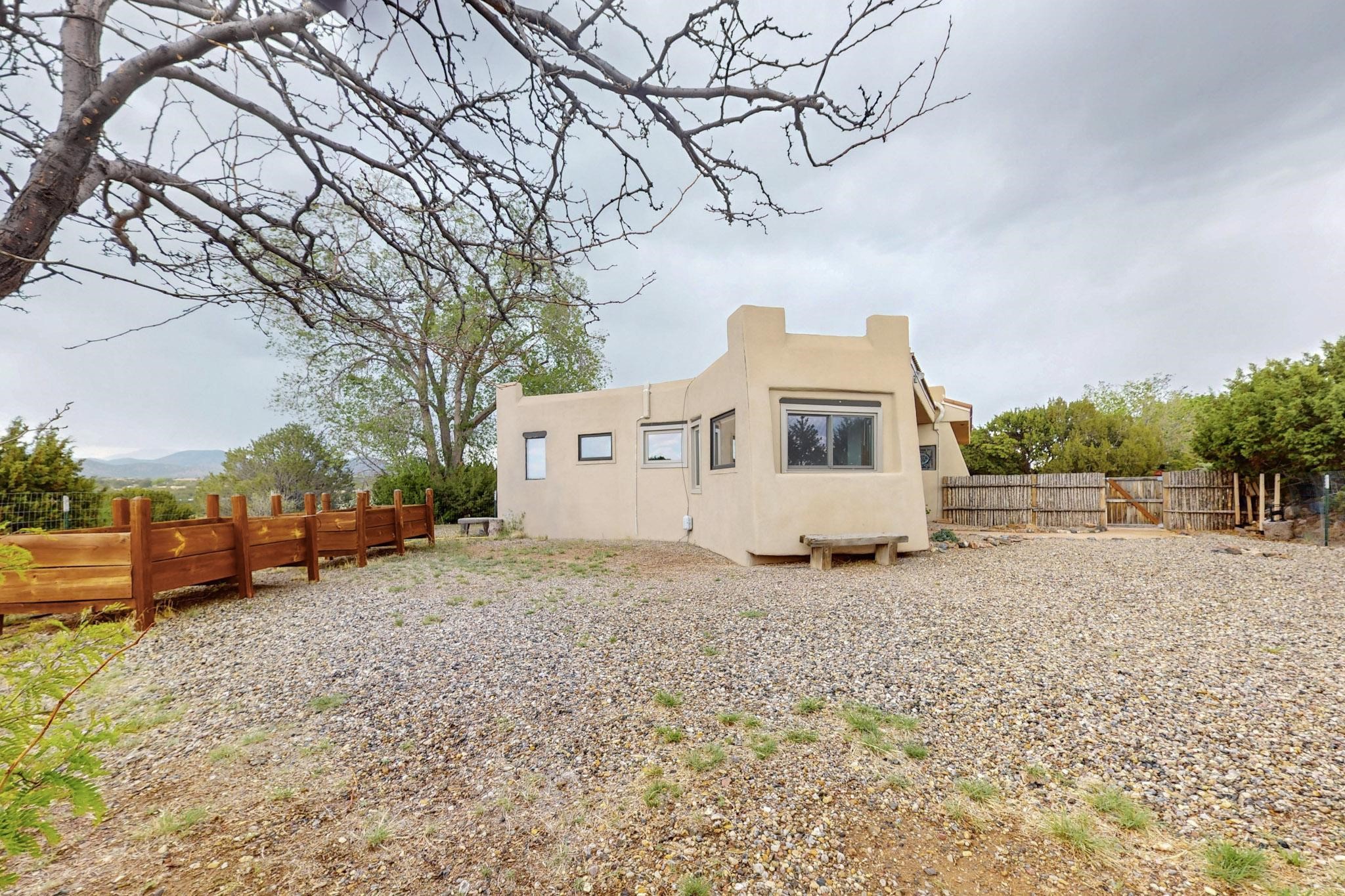 Stunning custom passive solar creation by Leif Backe nestled back from the road for ultimate privacy and mountain views. This split 3 bedroom design oozing with Santa Fe charm and ambience, is loaded with extra spaces for hobbies or meditation. Built to access light and lovely views from large windows in every room, gleaming Saltillo tile floors, rustic rough hewn vigas and beams, a traditional kiva fireplaces and 2 cosy natural gas stoves. 5 minisplits have been added for summer cool and winter heat. The totally remodeled kitchen is a perfect blend of pueblo and contemporary design. Enjoy the lovely view breakfast nook, large den and heated studio/workshop or simply relax in the naturally landscaped private gardens. The membrane roof is only 5 years old. This fabulous home accesses all of Eldorado amenities, close to local services and shopping plus only minutes into Santa Fe.